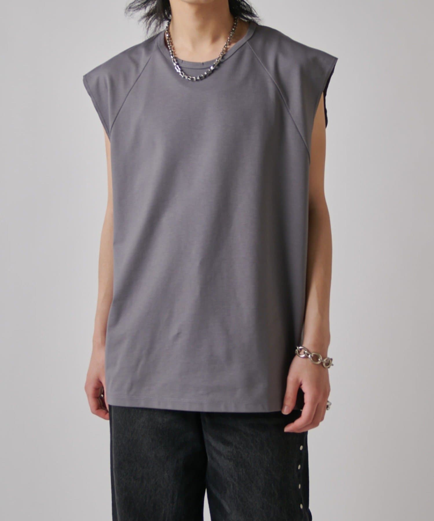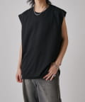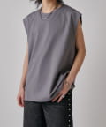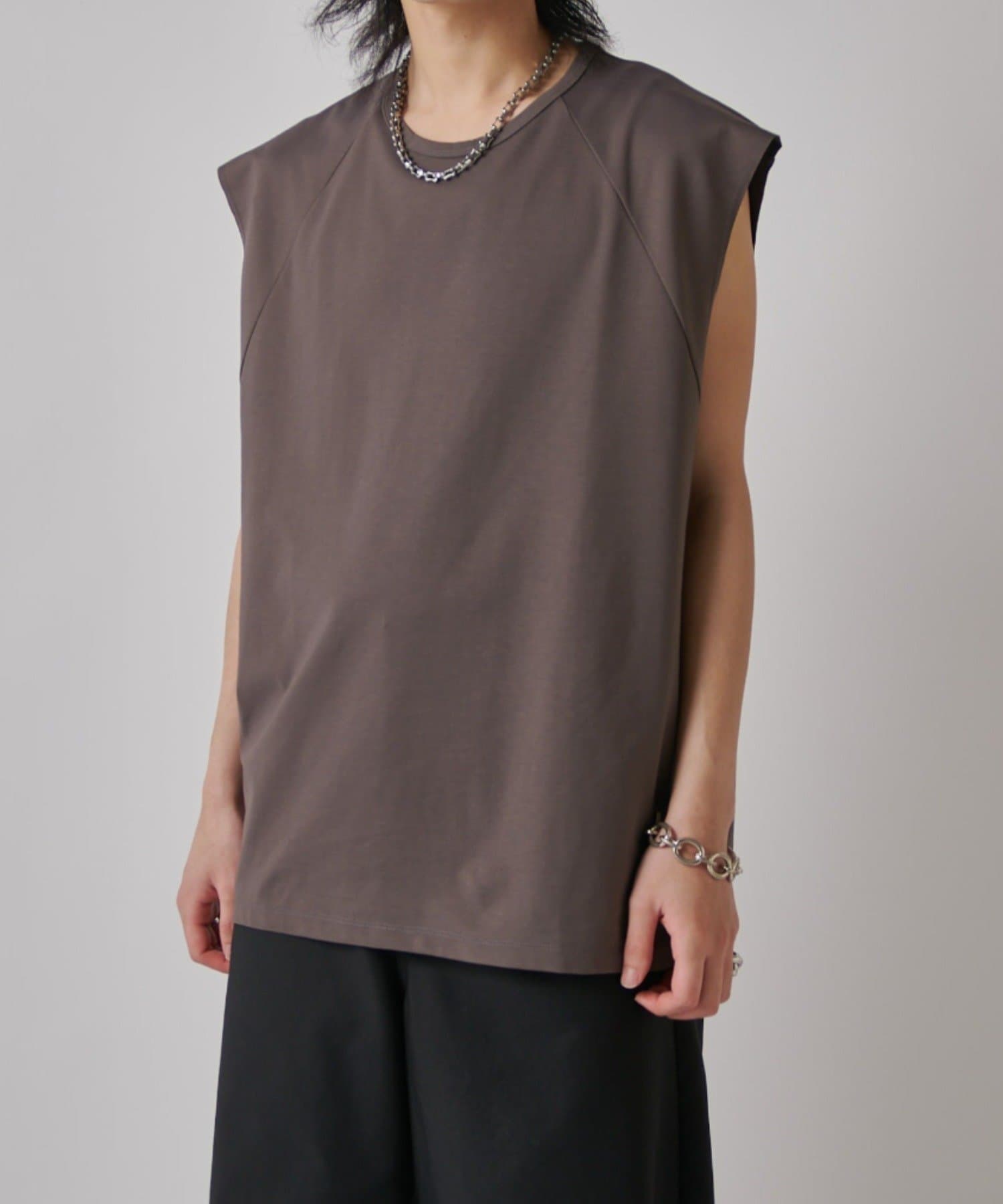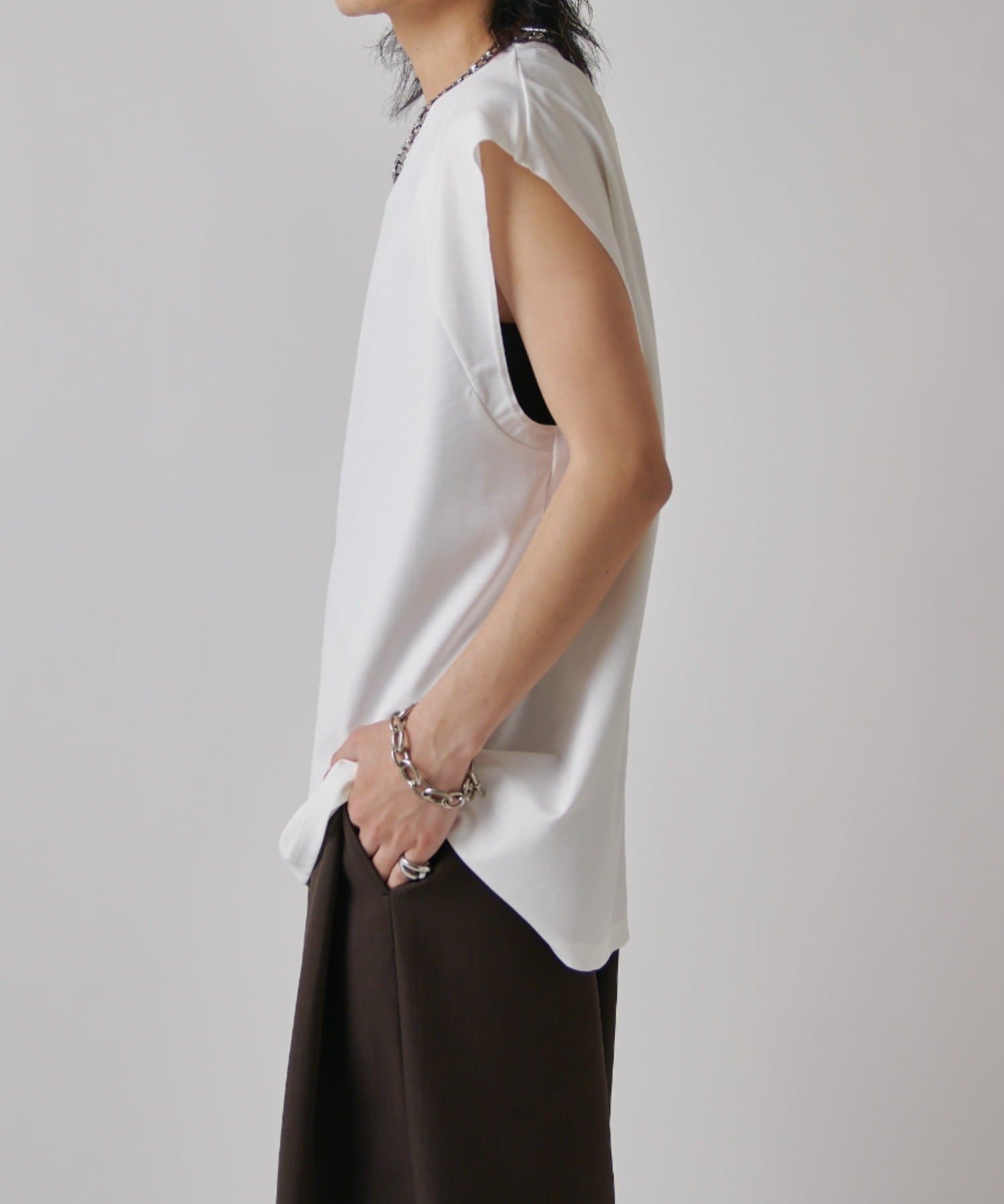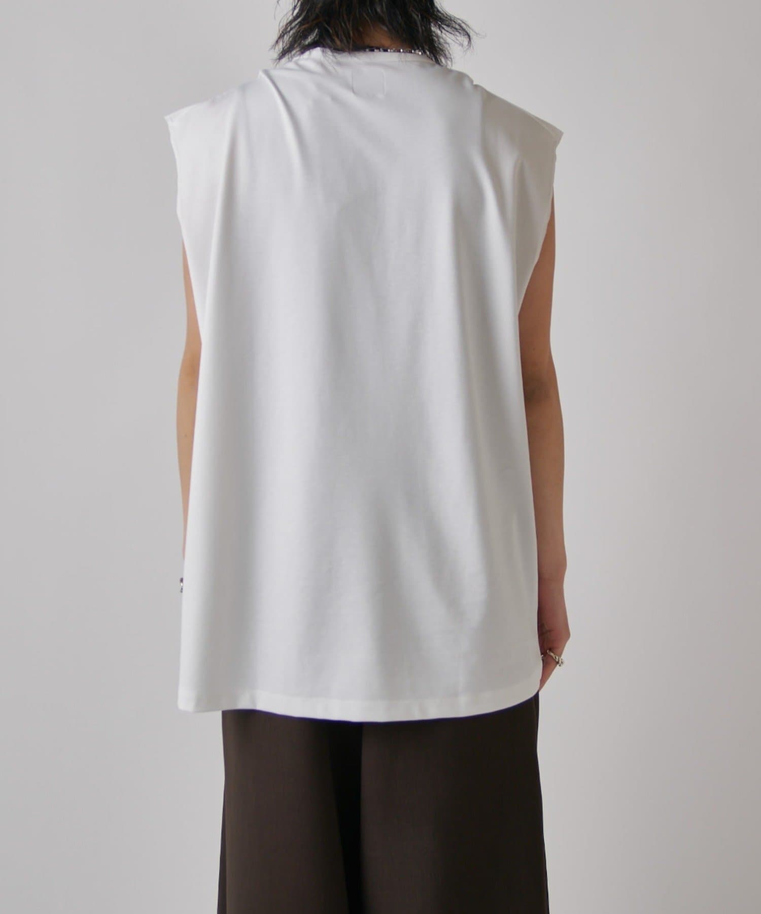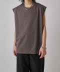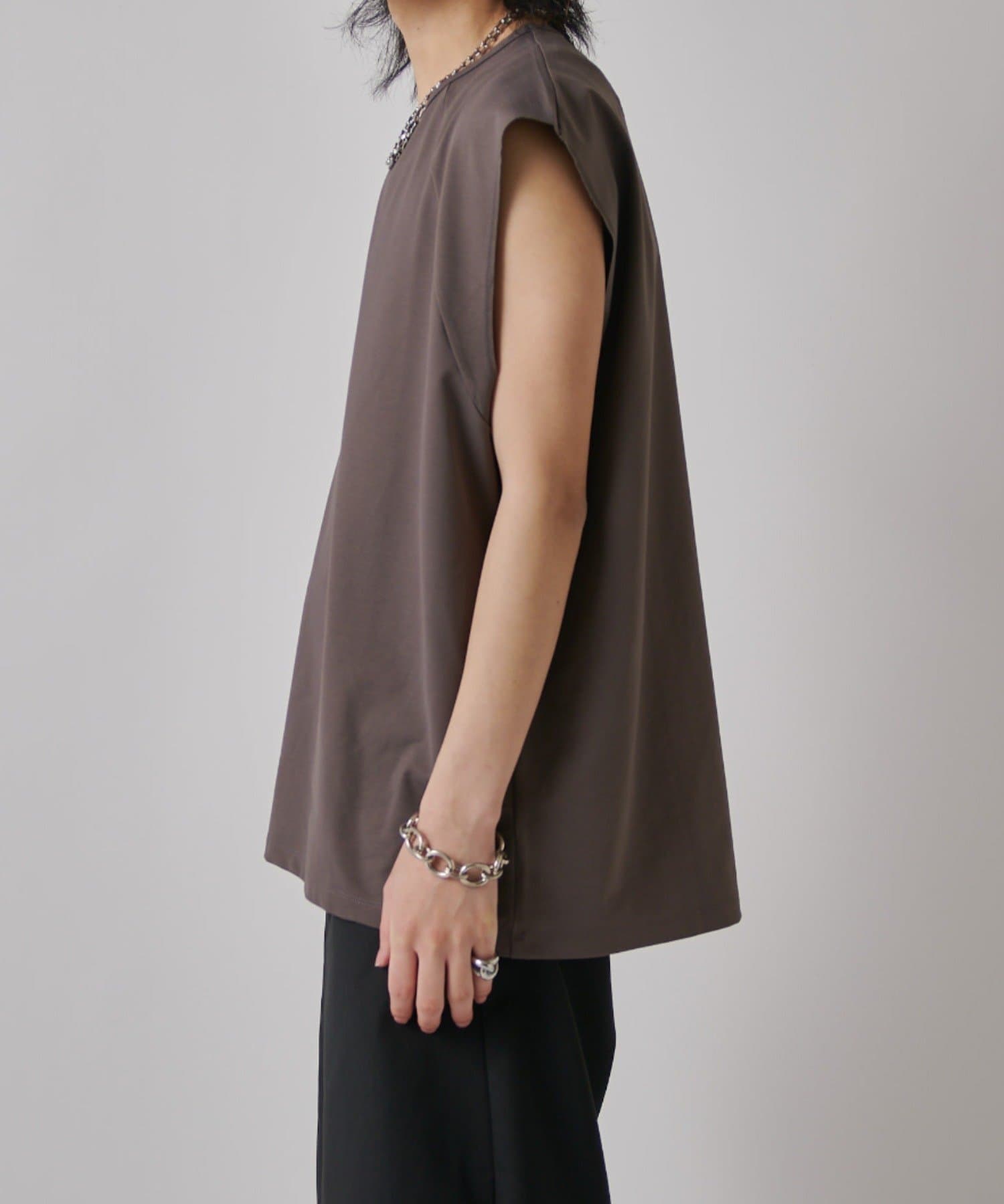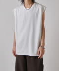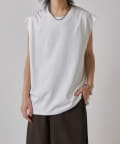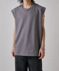 肩線が落ちるドロップショルダー仕様で、袖を無くしたノースリーブ仕様のカットソー。