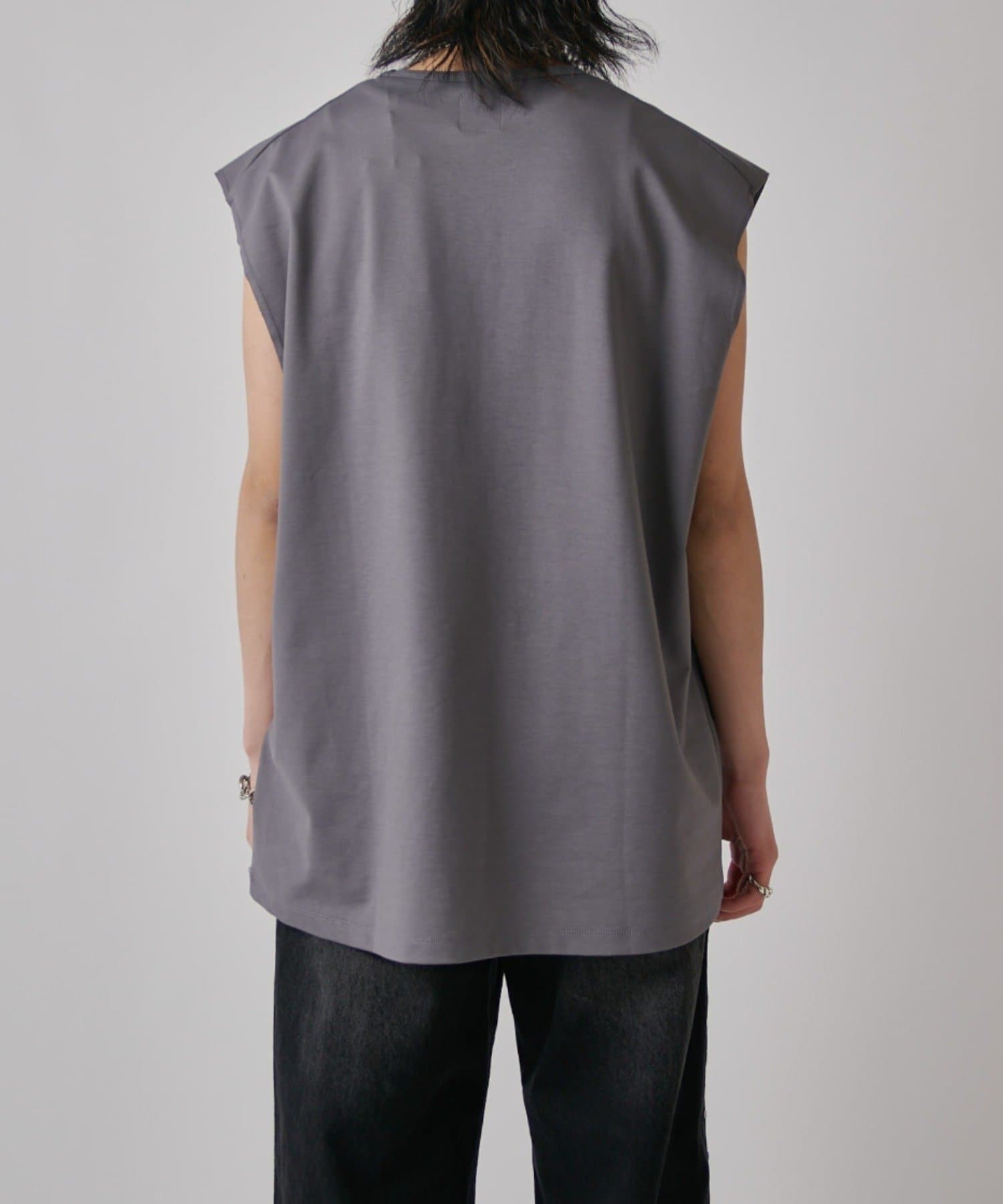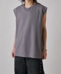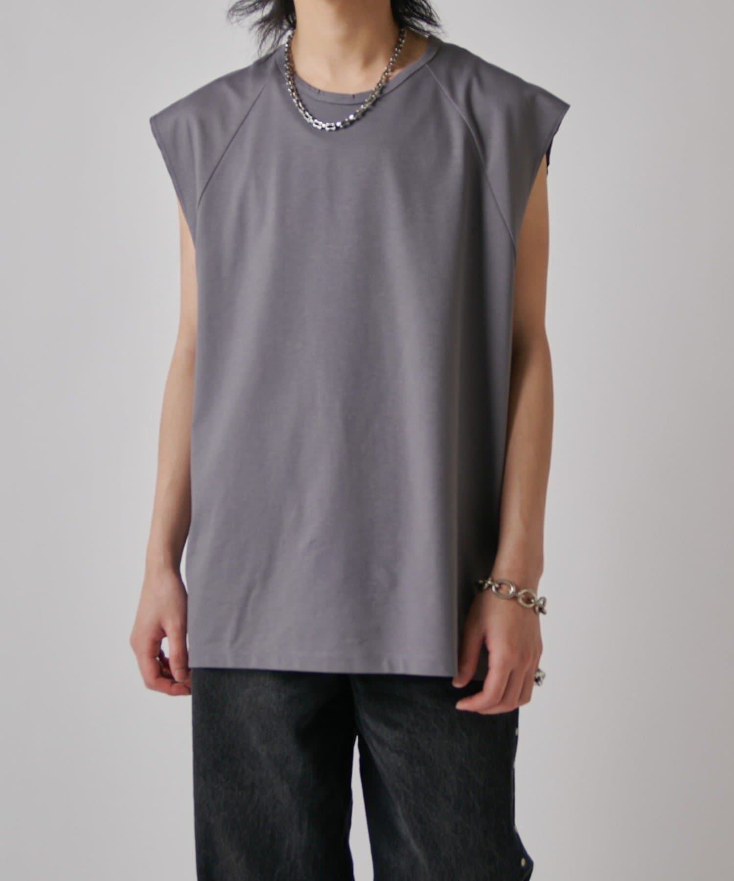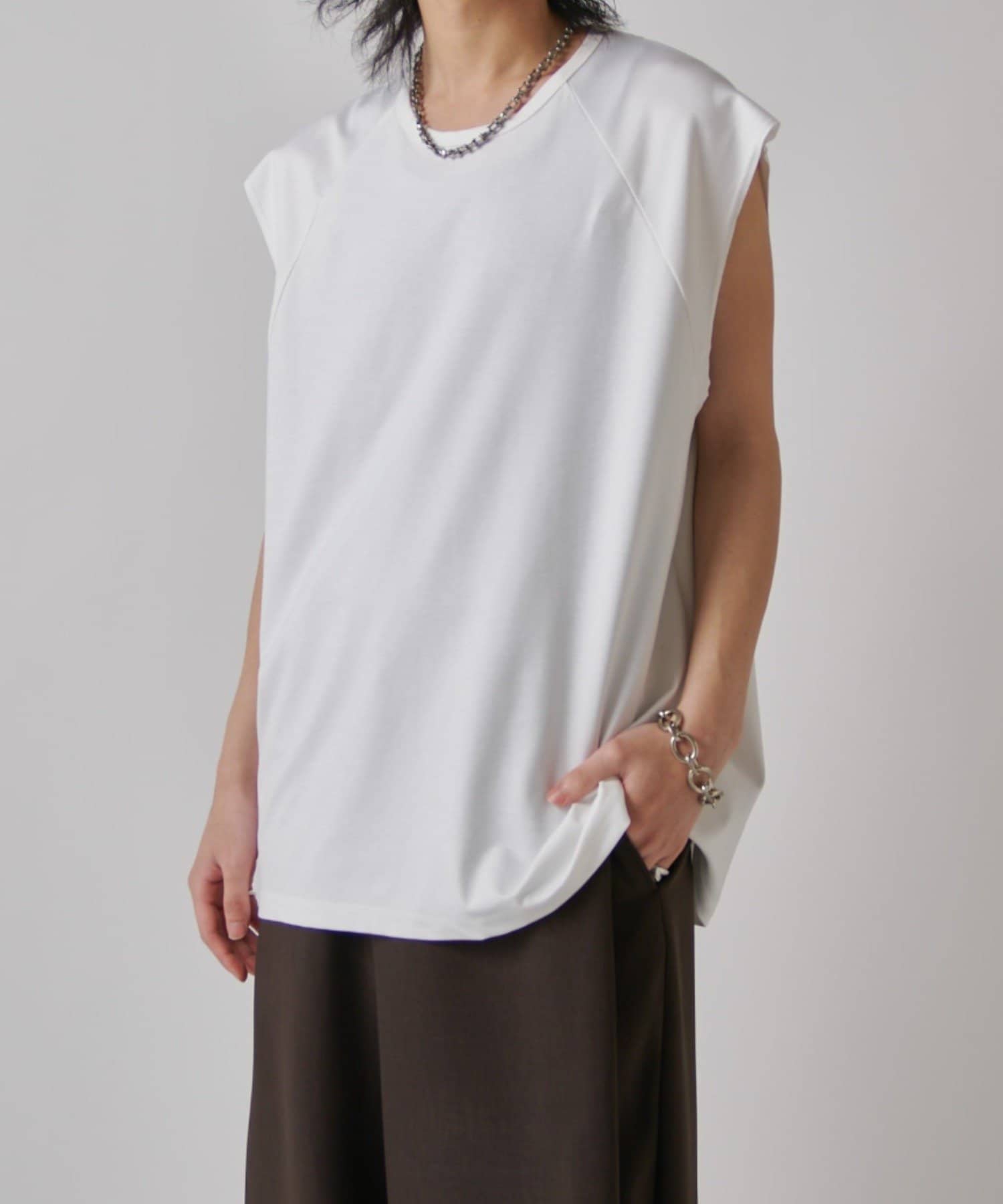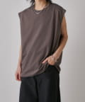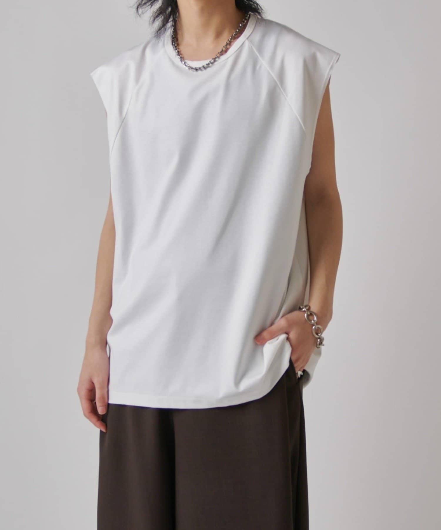 肩線が落ちるドロップショルダー仕様で、袖を無くしたノースリーブ仕様のカットソー。