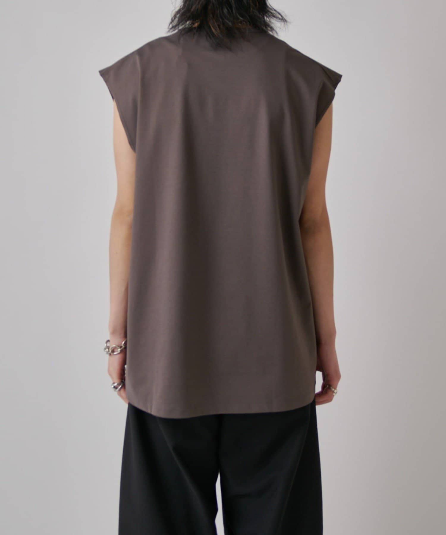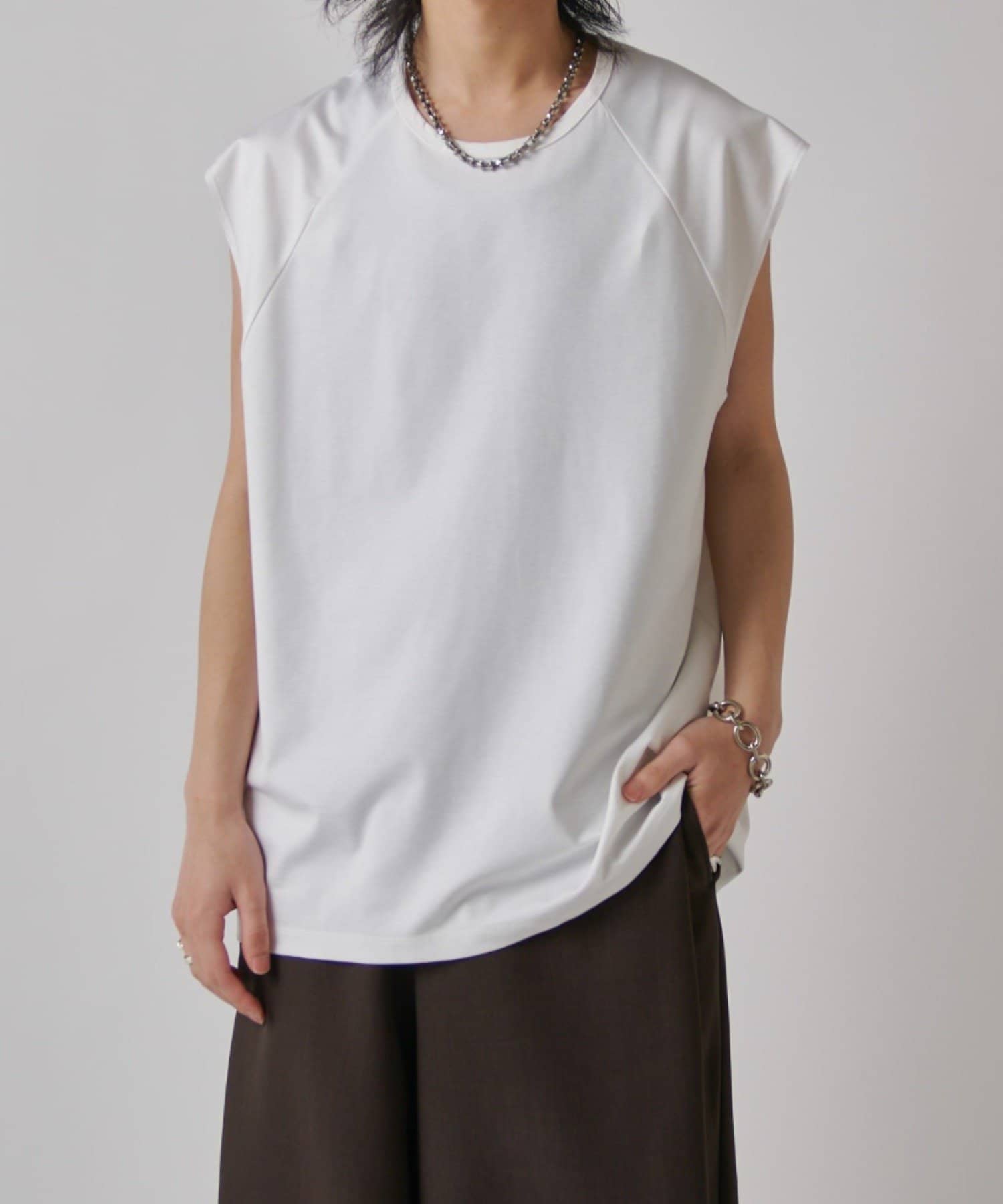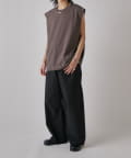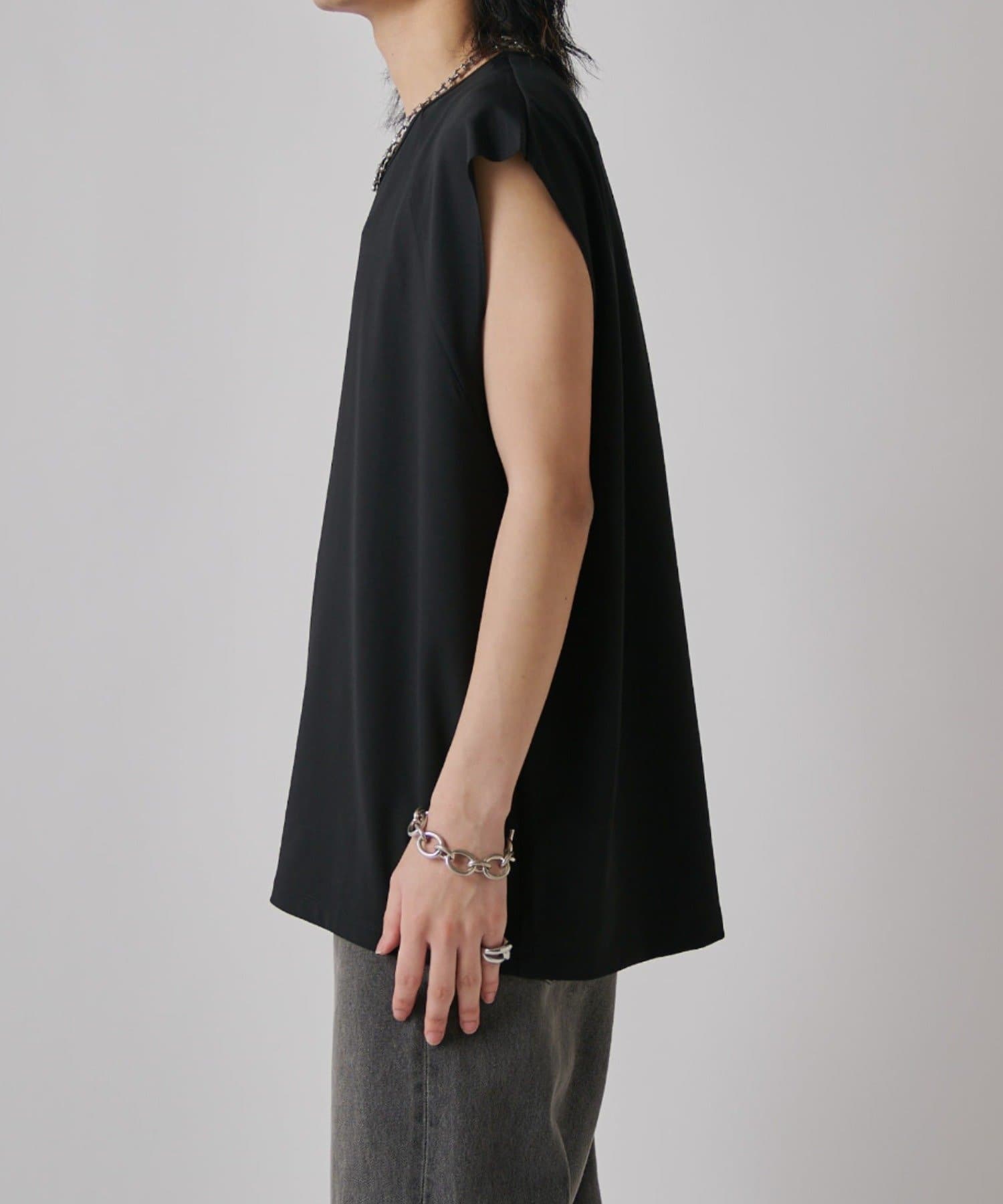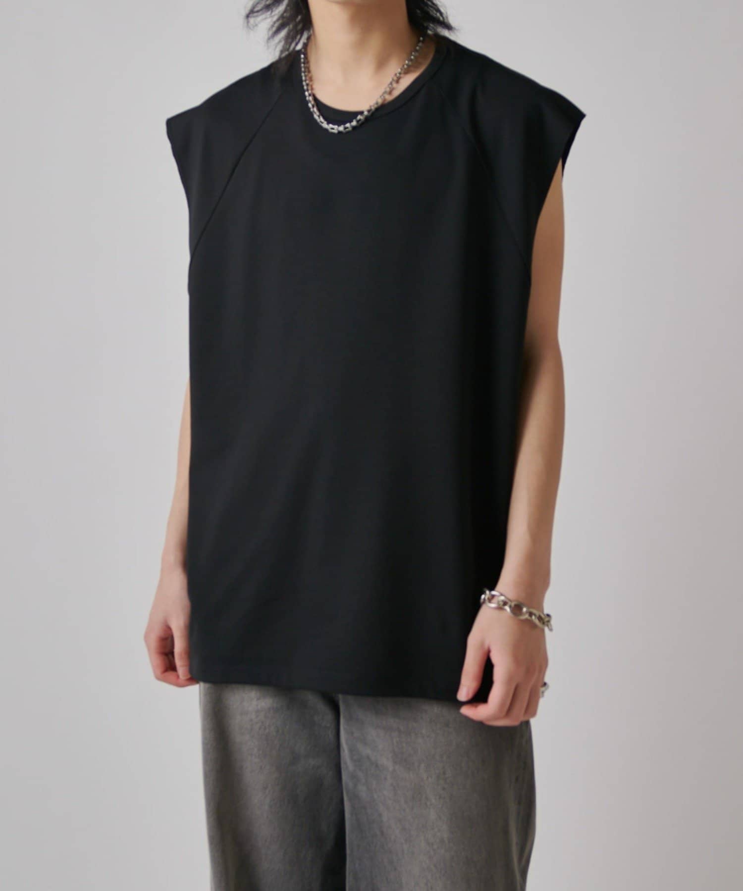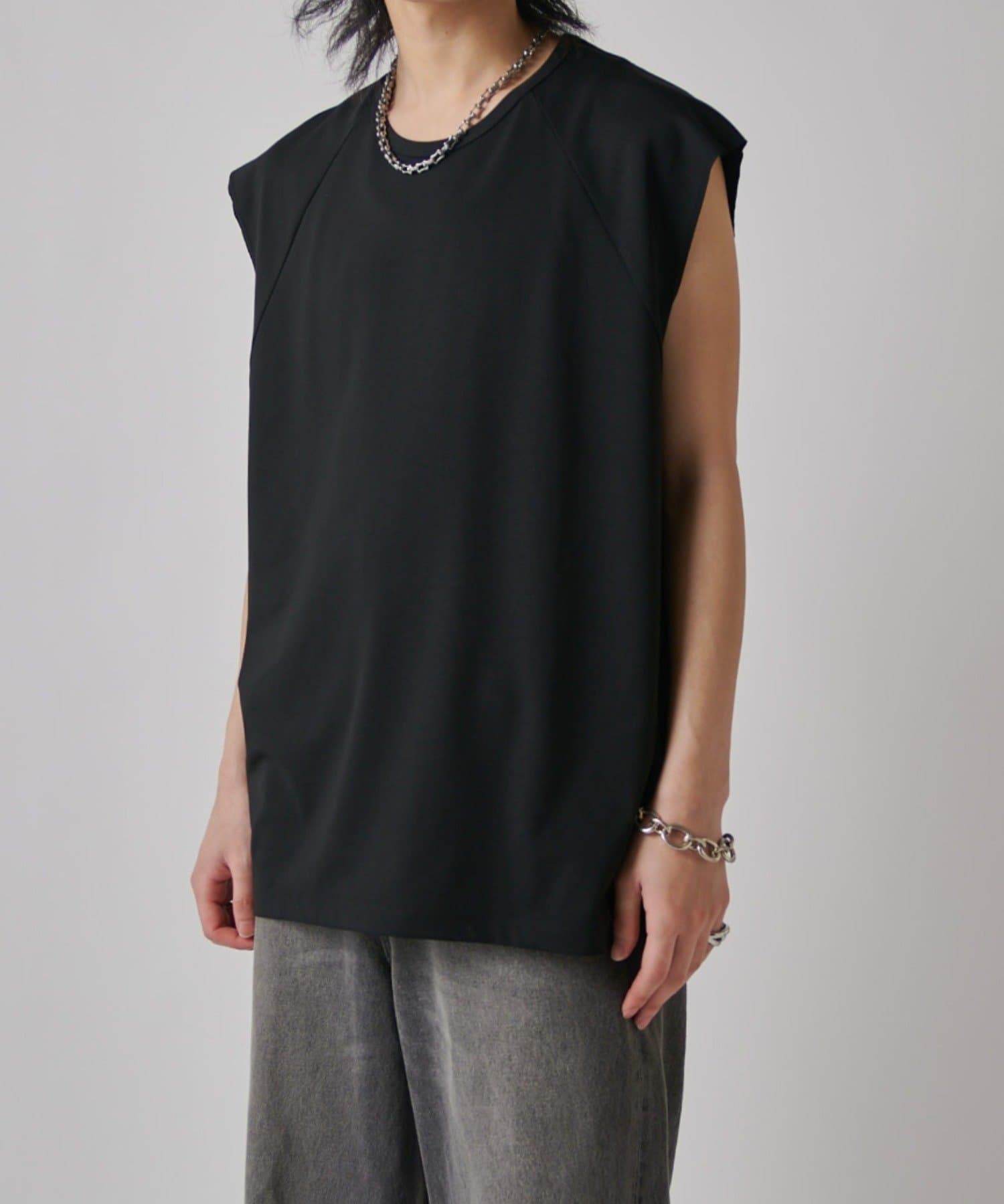 肩線が落ちるドロップショルダー仕様で、袖を無くしたノースリーブ仕様のカットソー。