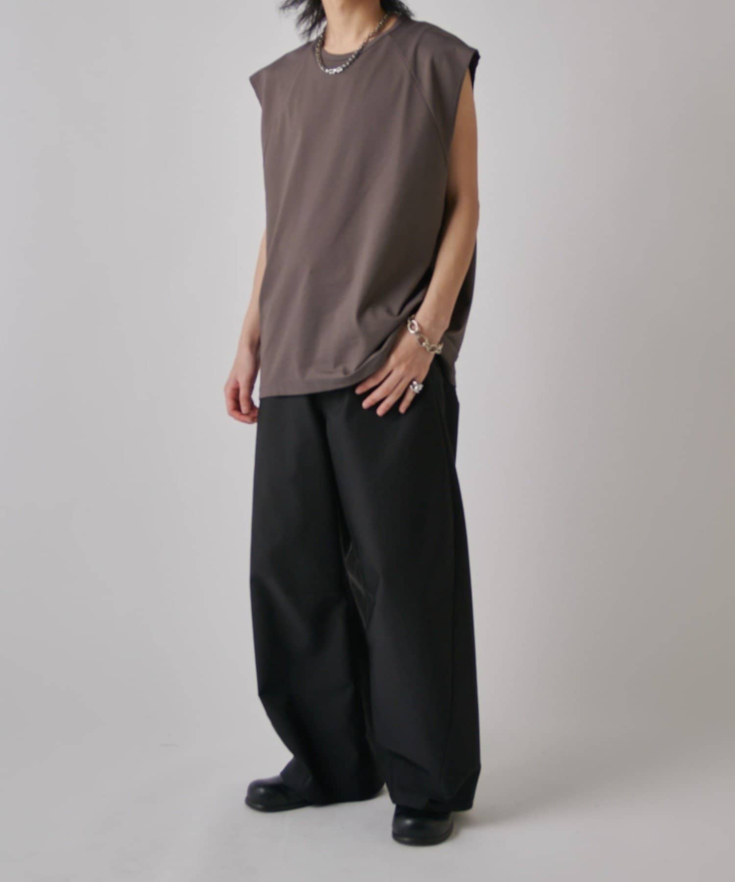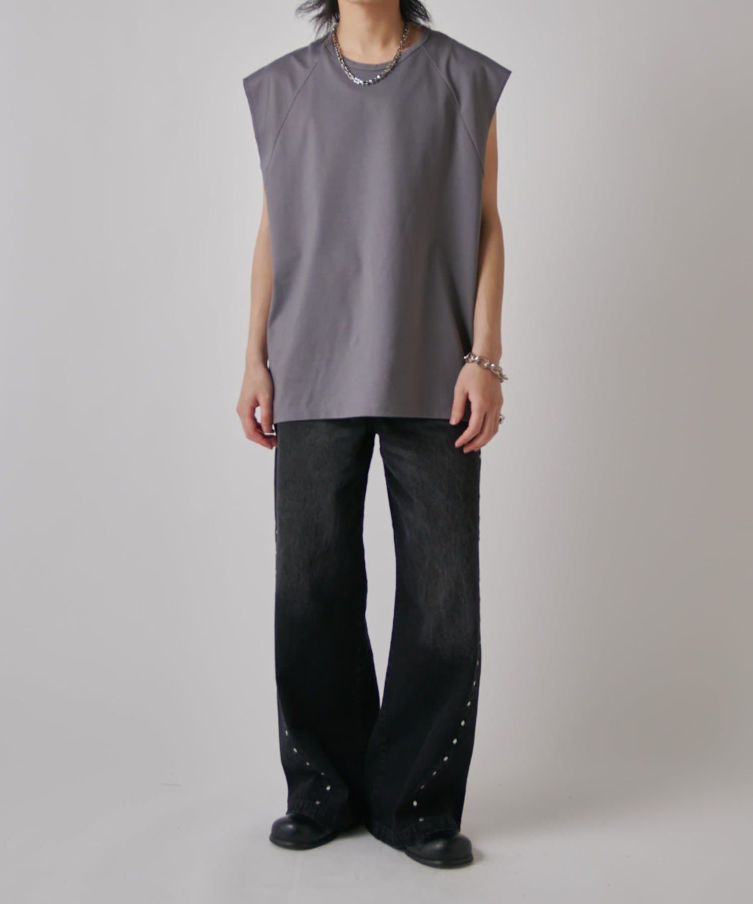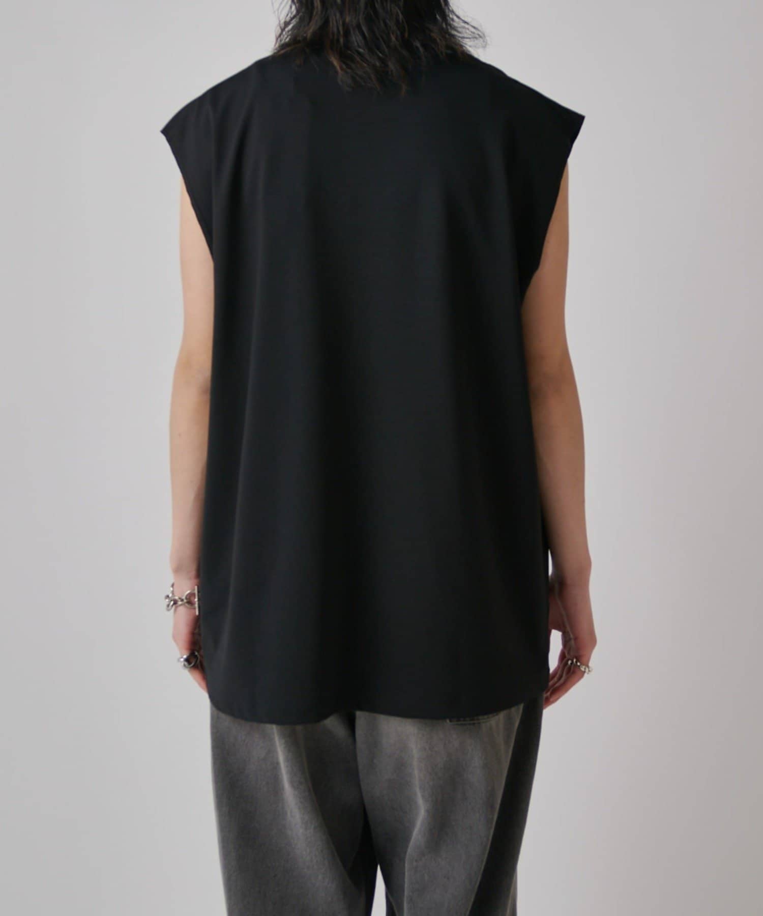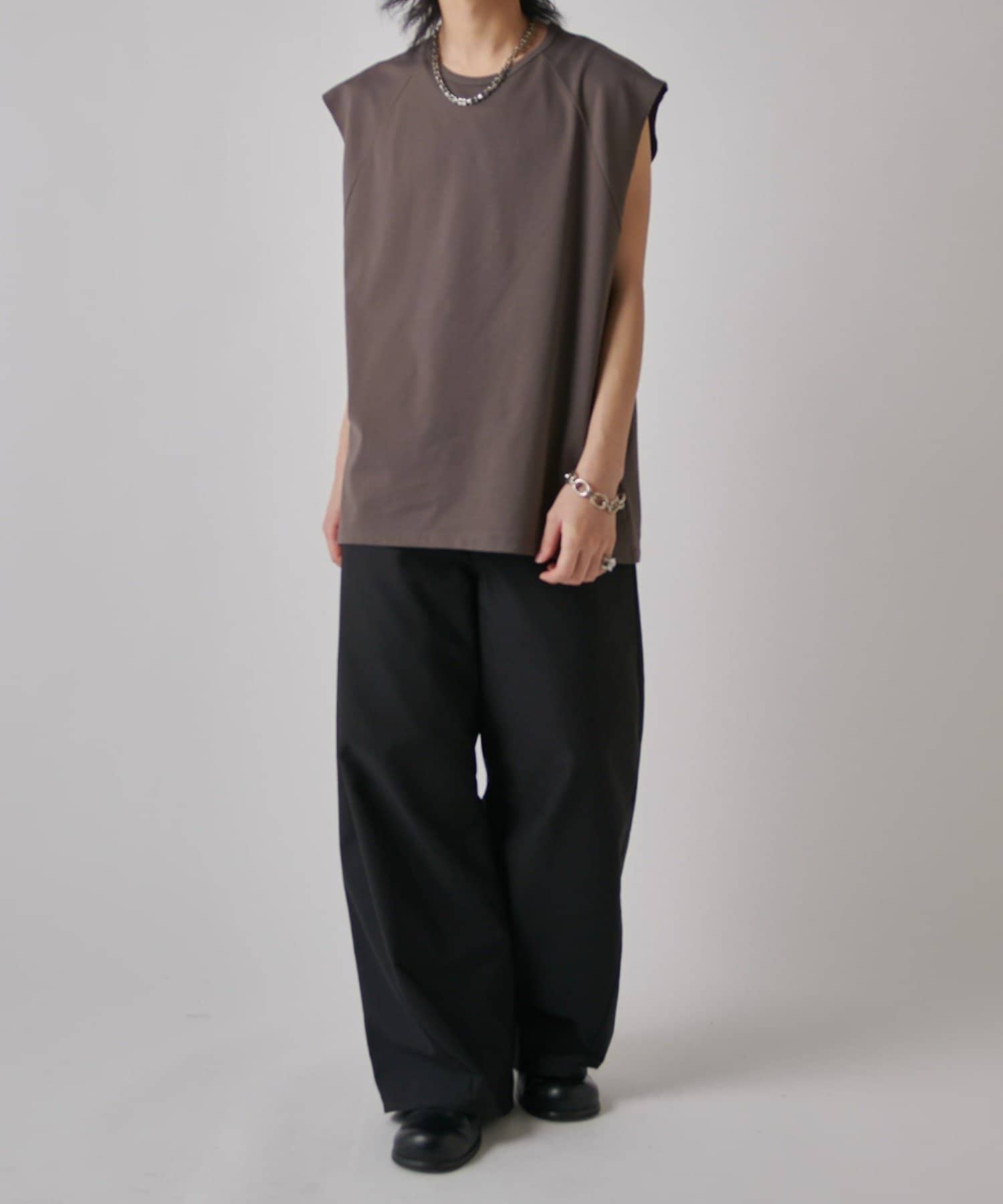 肩線が落ちるドロップショルダー仕様で、袖を無くしたノースリーブ仕様のカットソー。