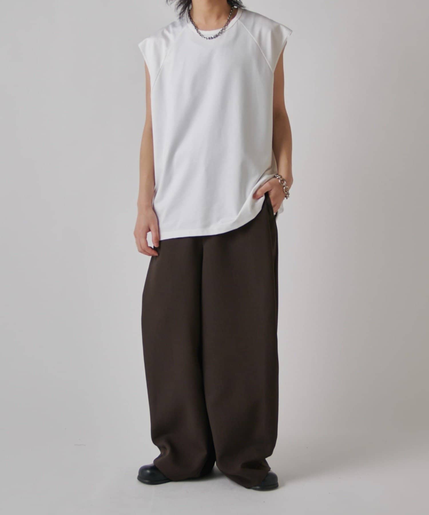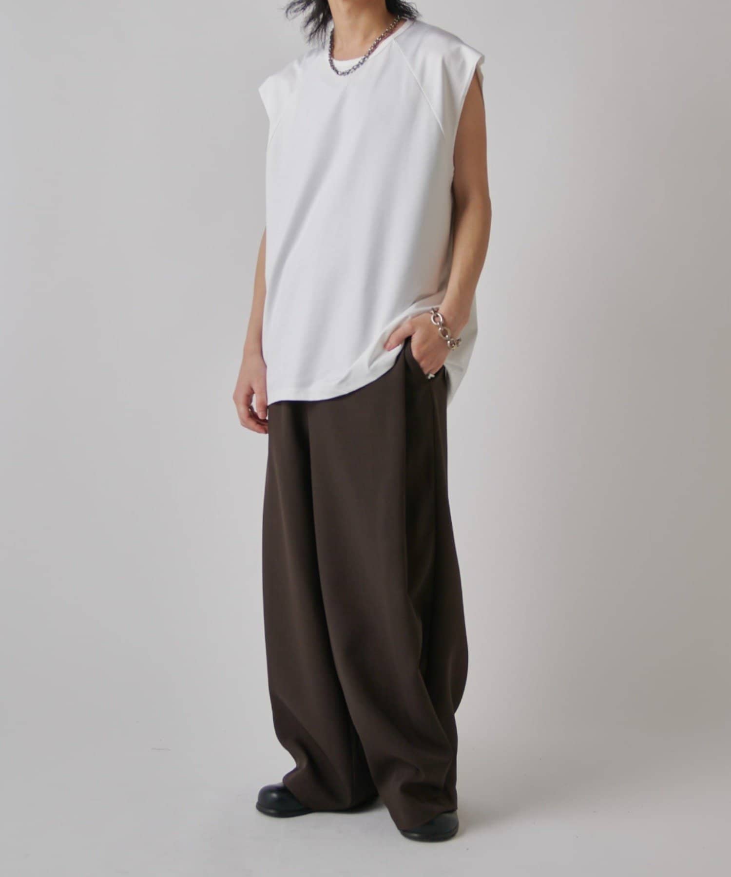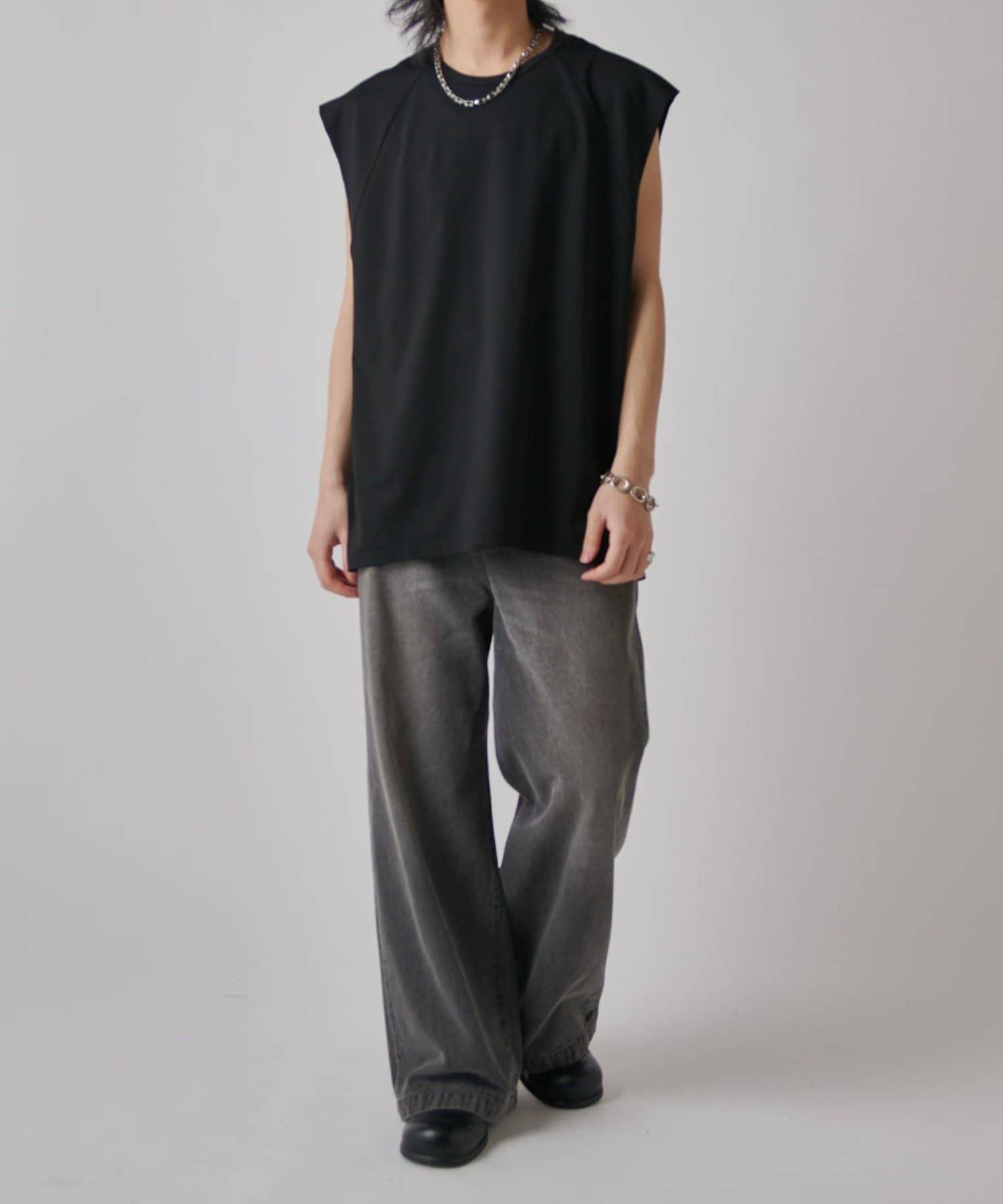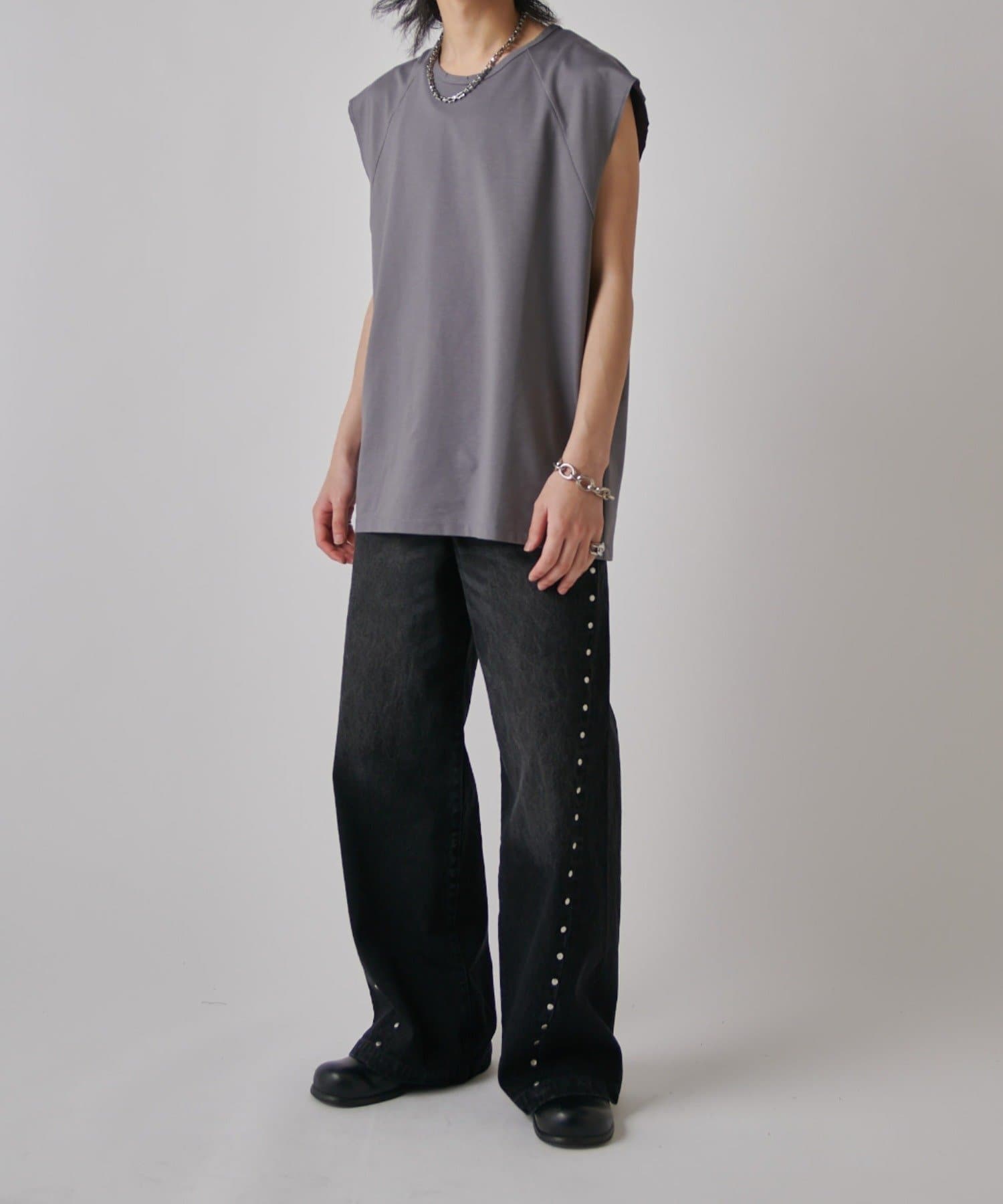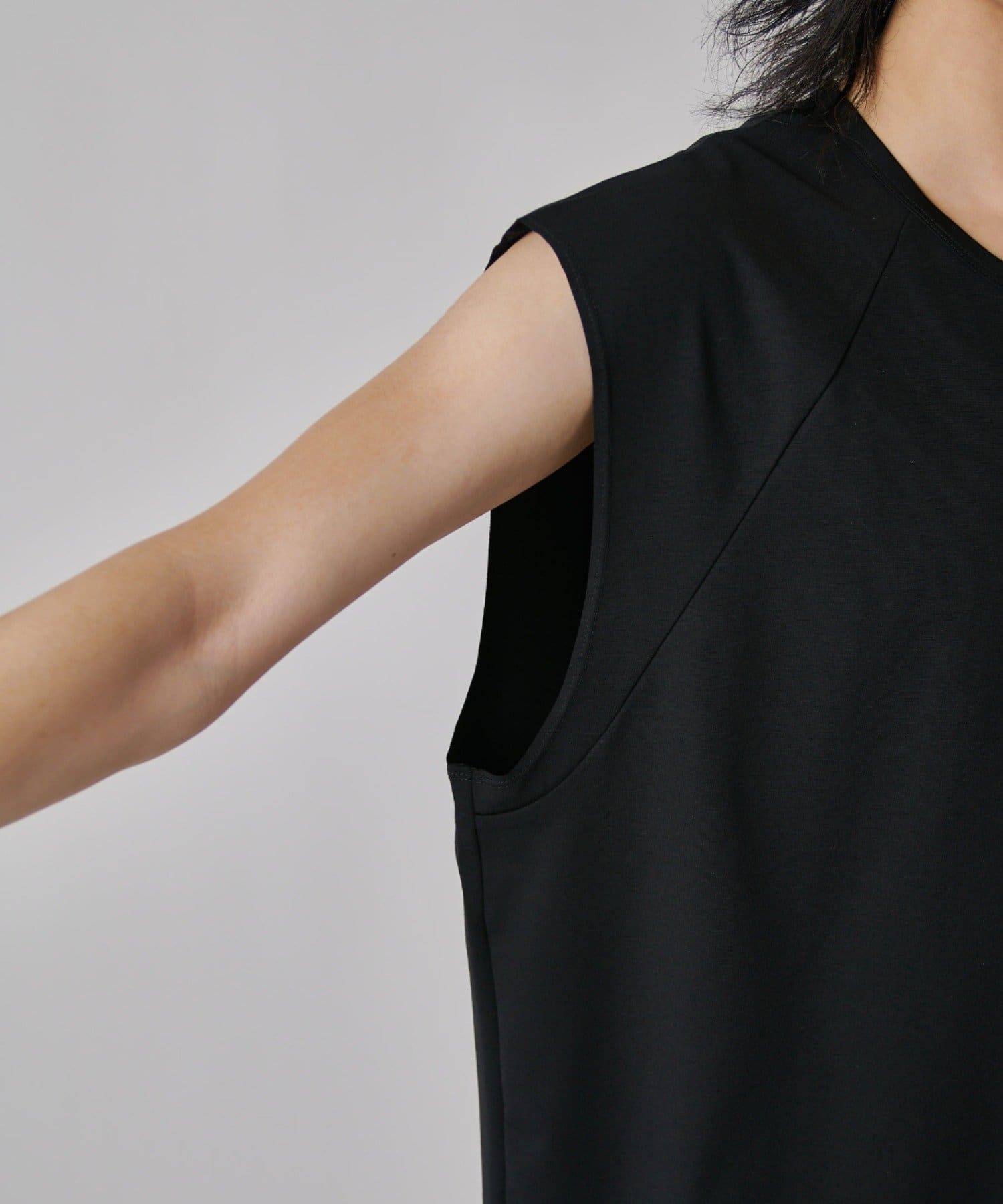肩線が落ちるドロップショルダー仕様で、袖を無くしたノースリーブ仕様のカットソー。