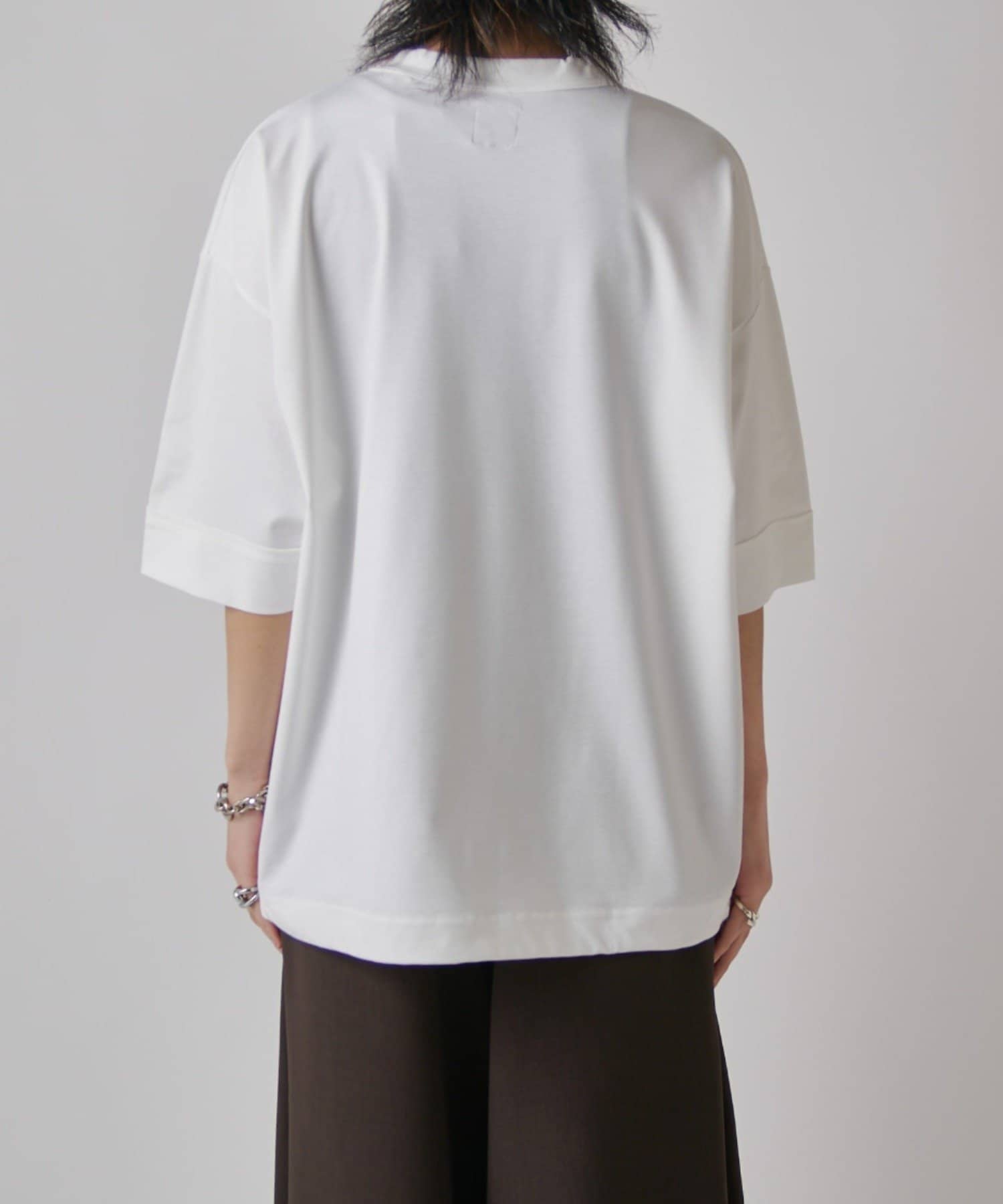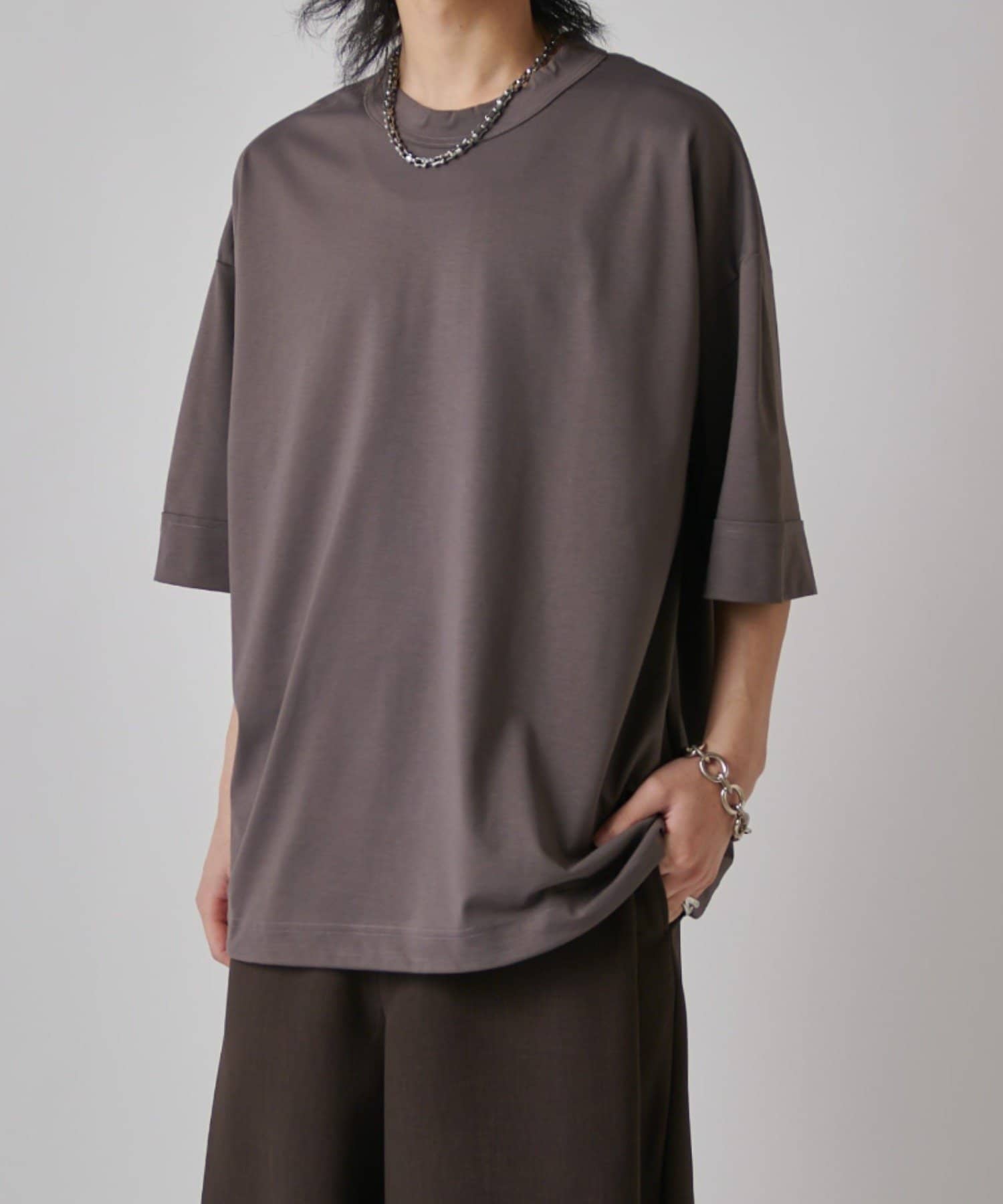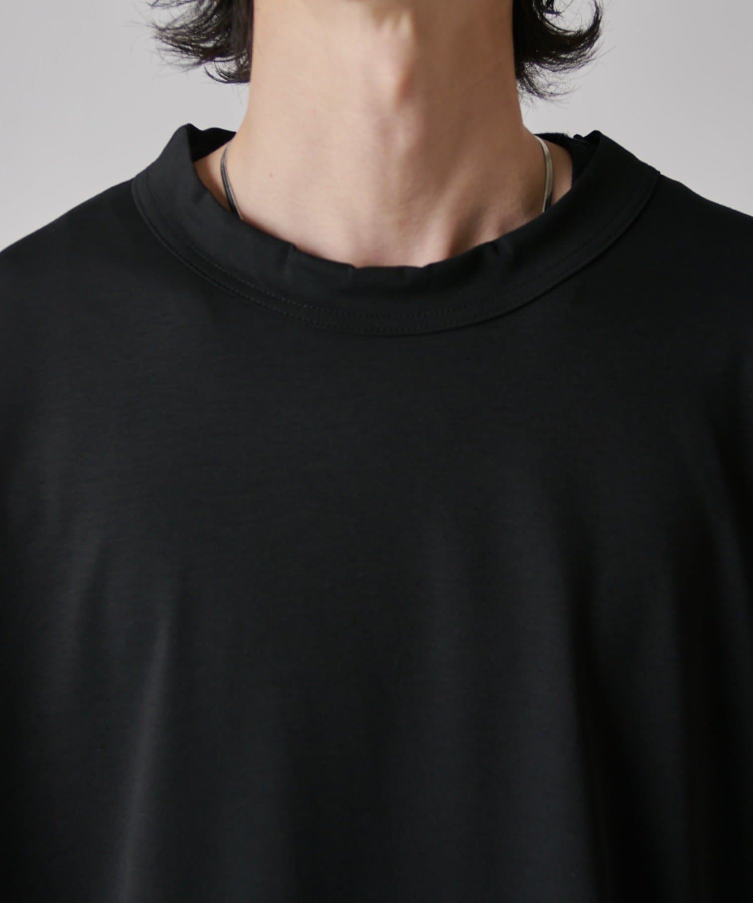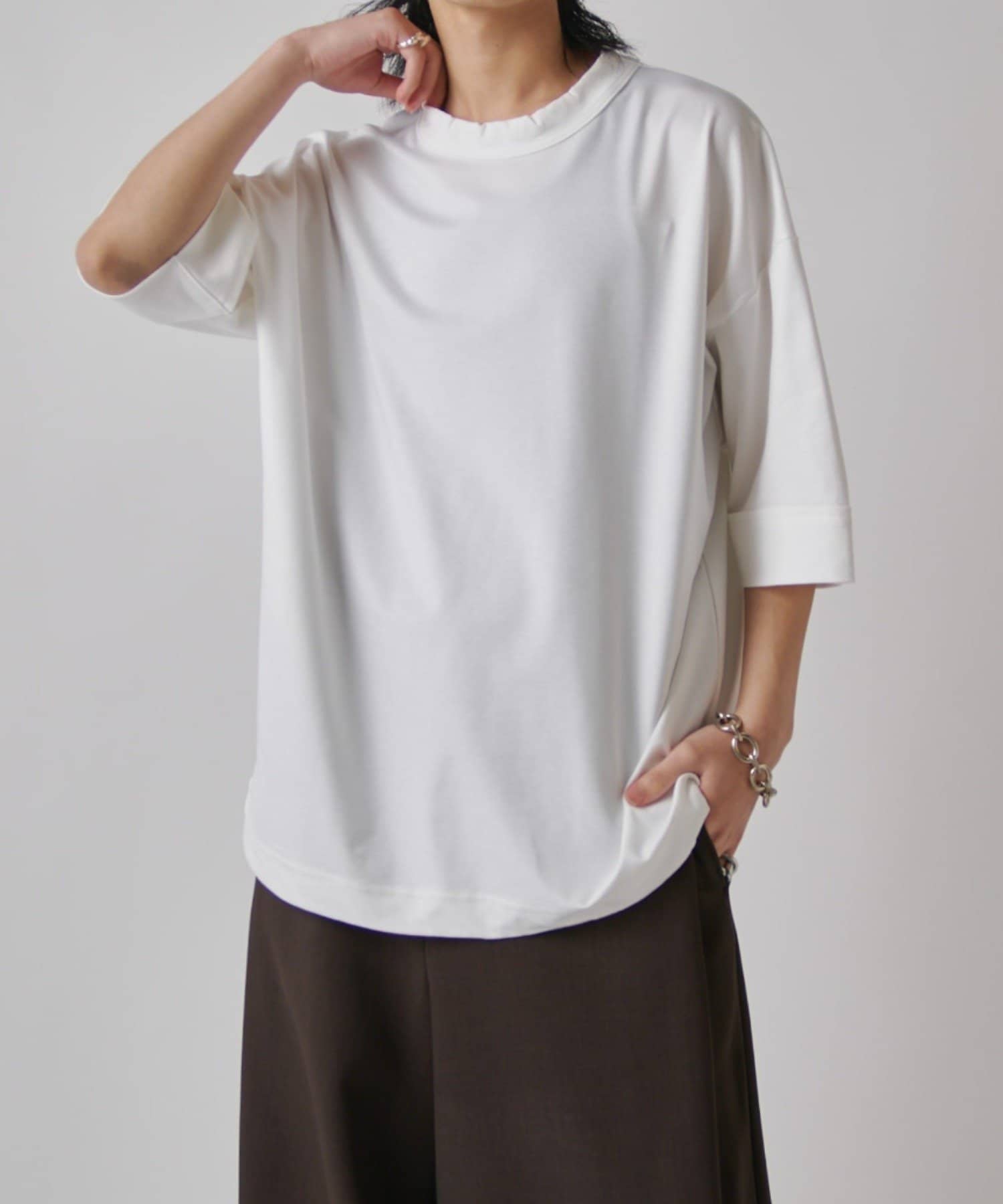 肌触りの良さと、見た目の光沢感が特徴的で、一枚で着て頂けるアイテム。