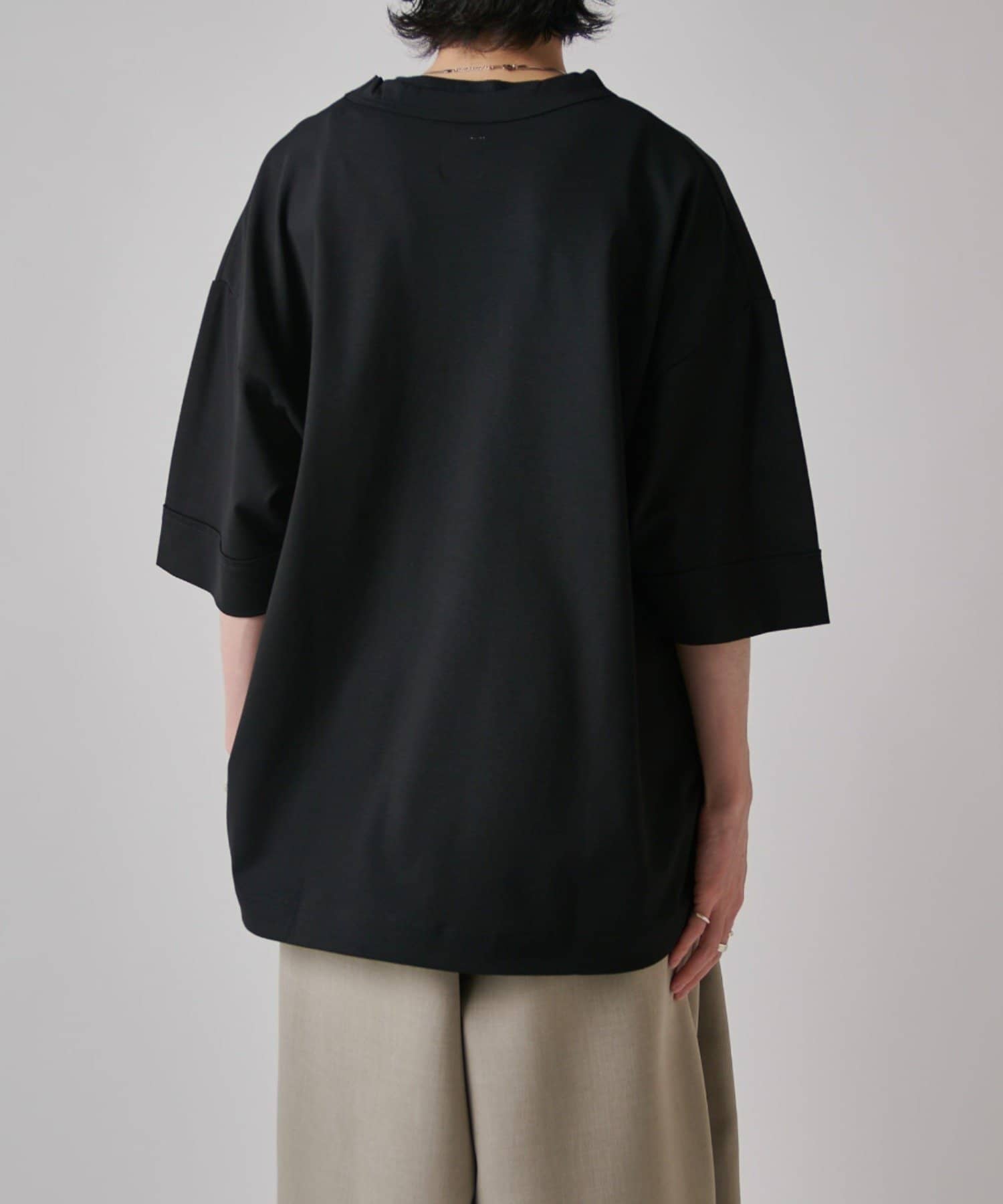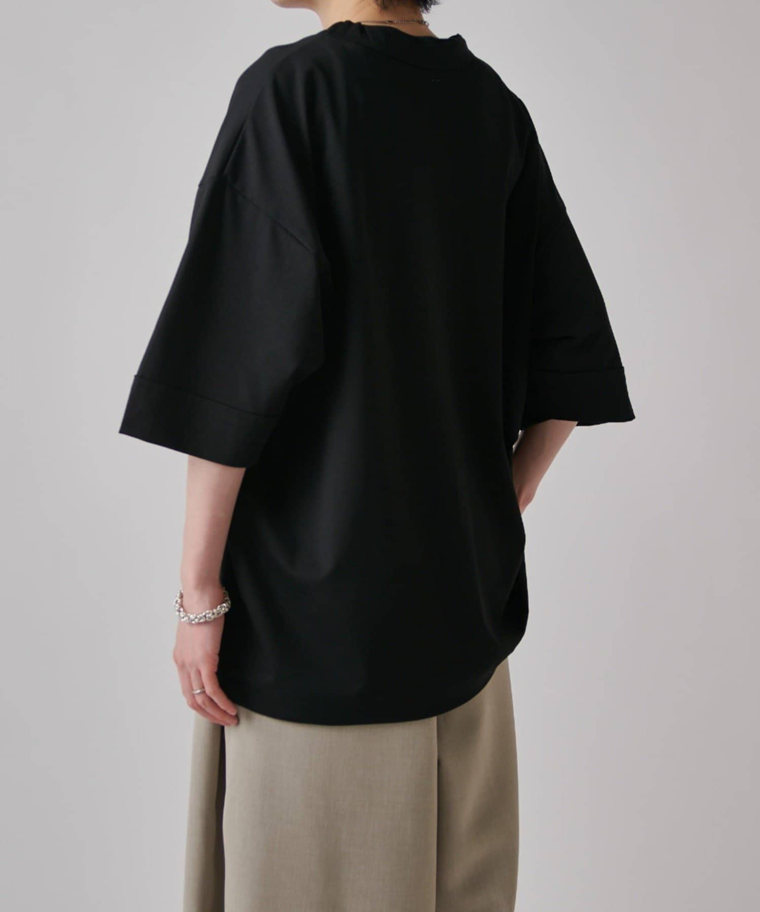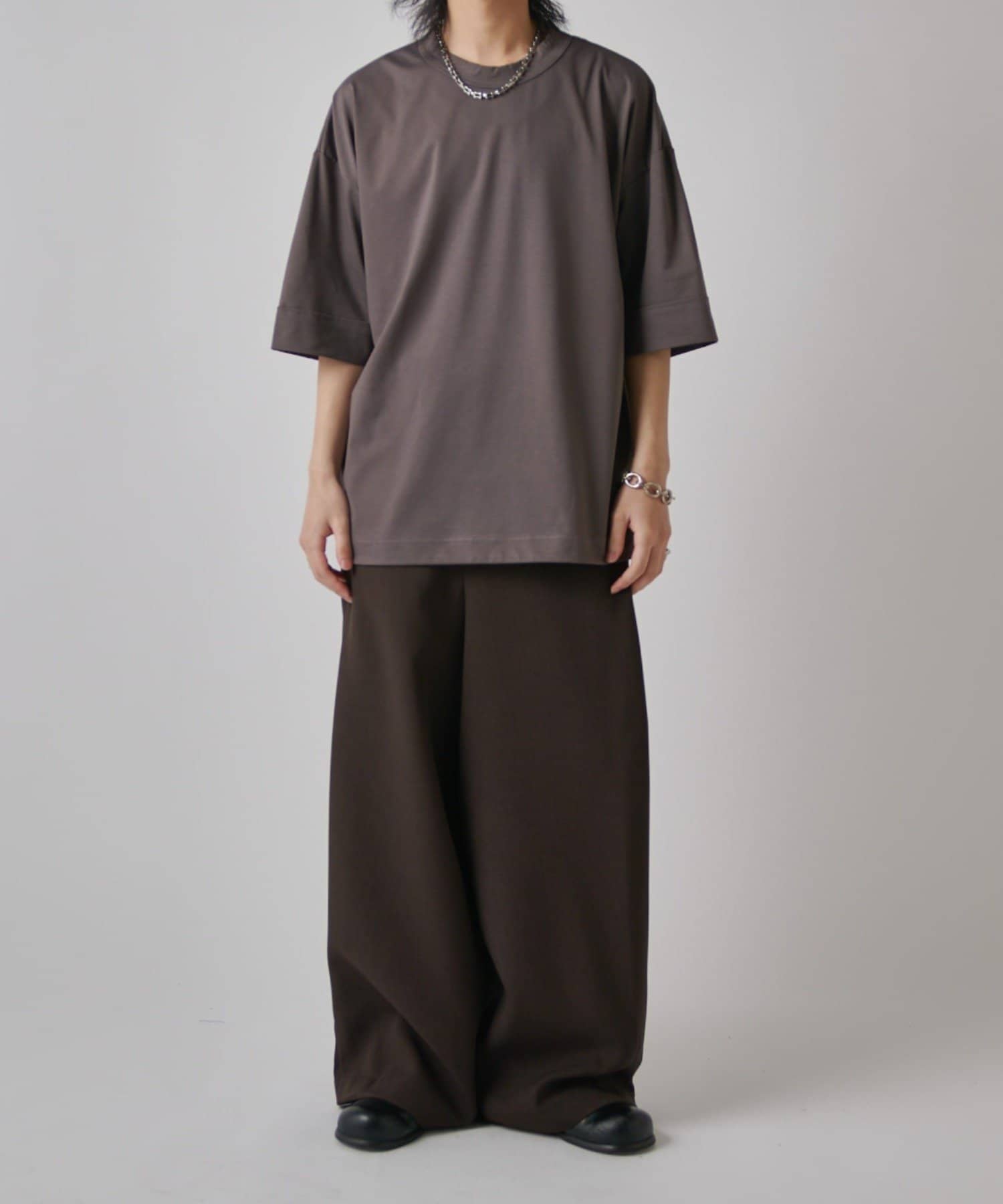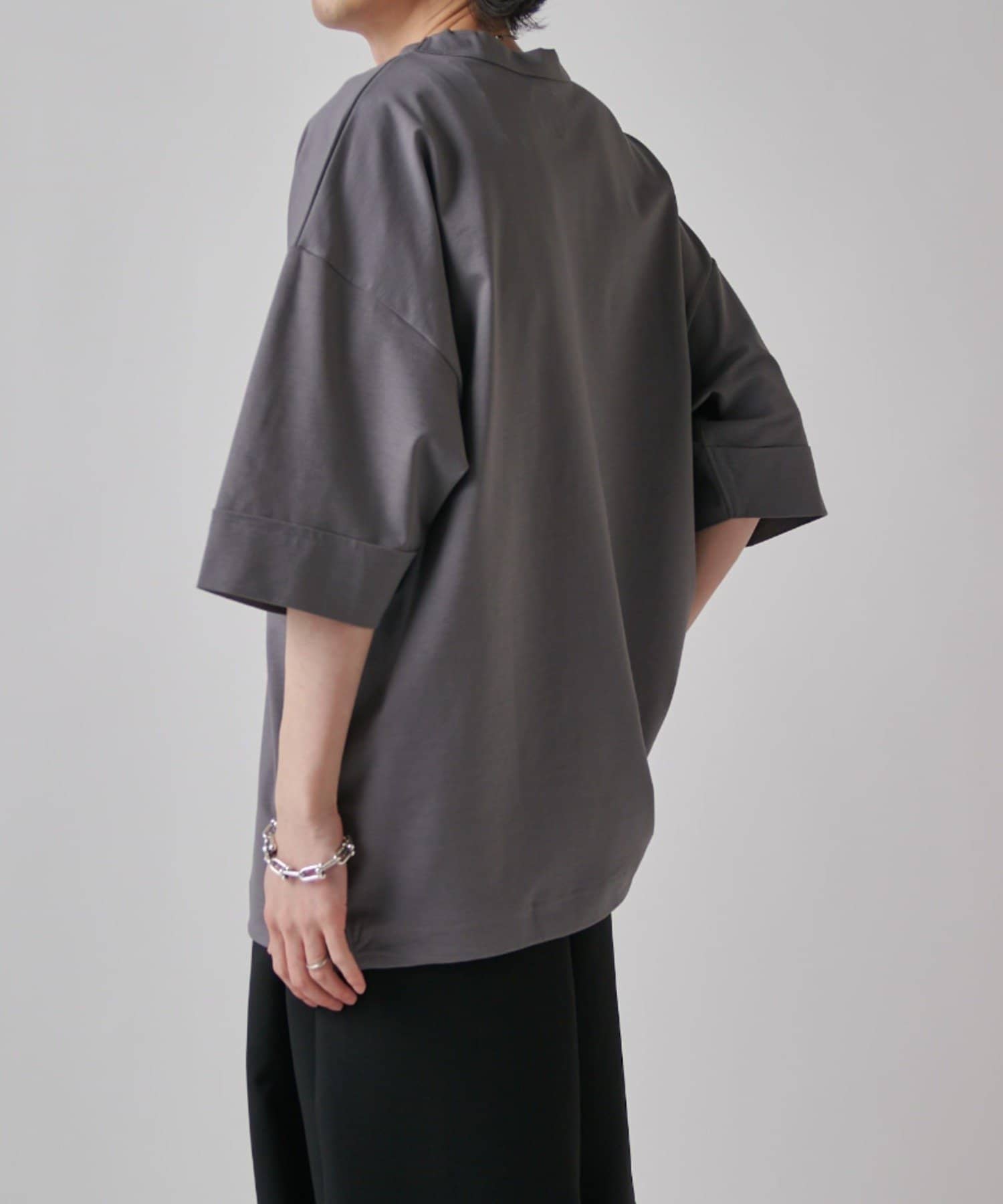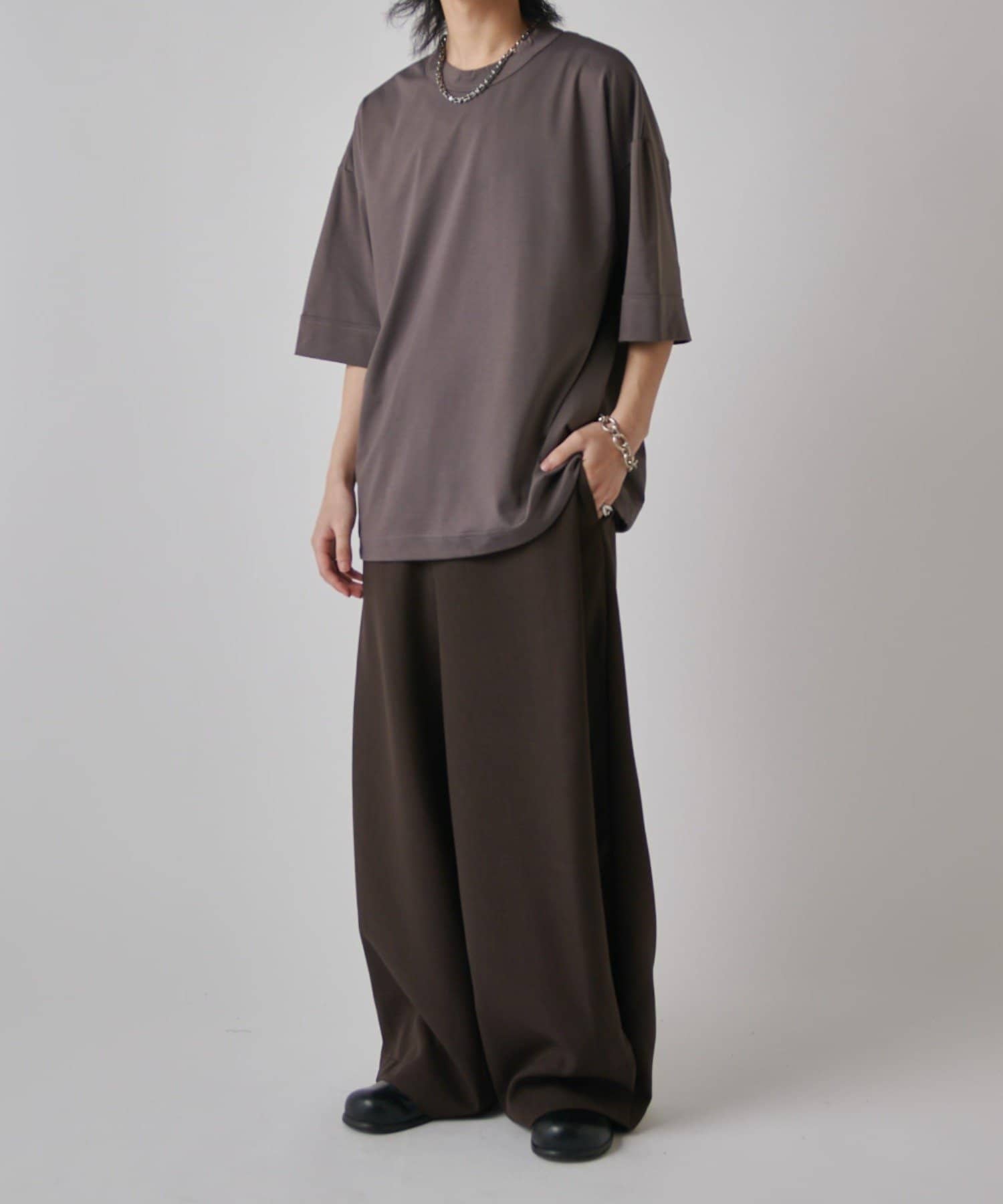 肌触りの良さと、見た目の光沢感が特徴的で、一枚で着て頂けるアイテム。