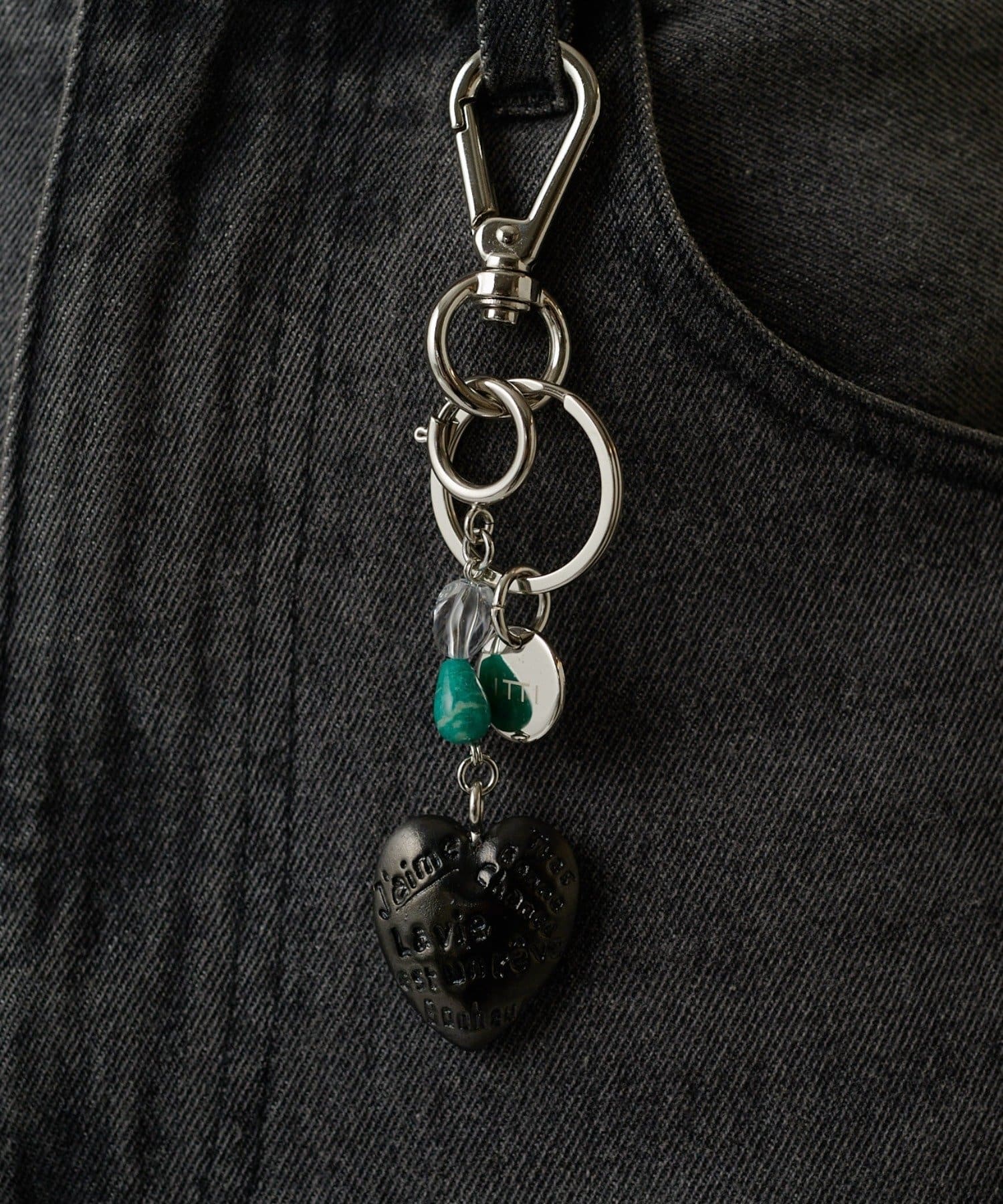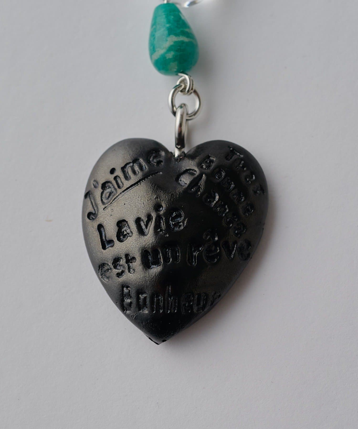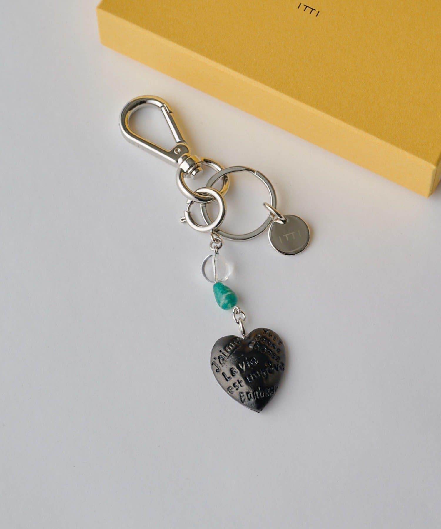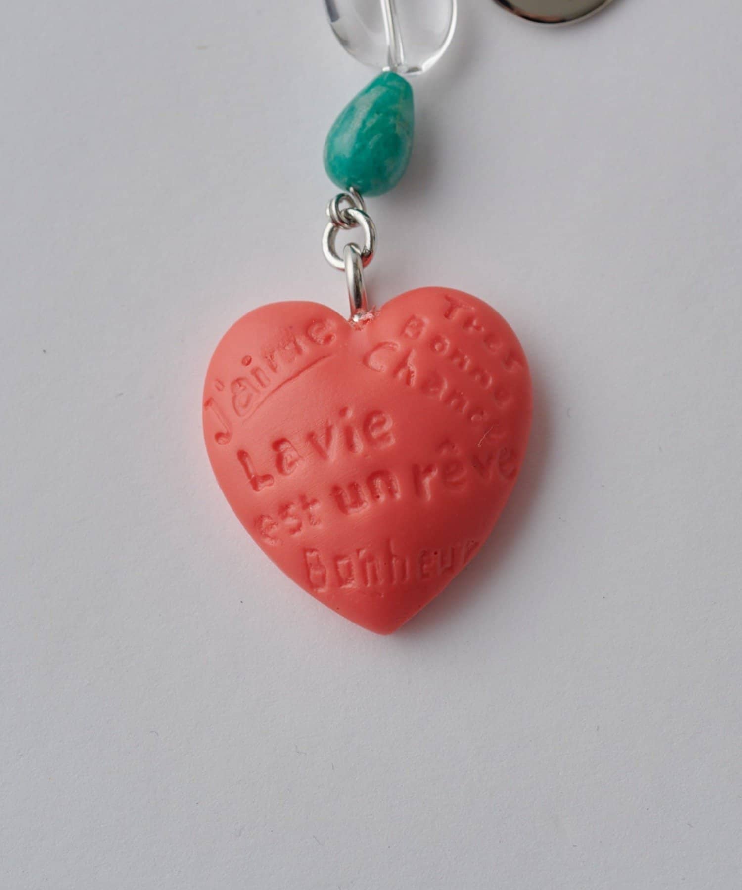 ハート部分には、「J’aime(大好き)」「Très Bonne Chance(グッドラック)」「Bonheur(幸せ)」「La vie est un rêve(人生は夢)」といった前向きでハッピーな言葉が刻まれています。※チャームはすべて手作業で仕上げているため、色味や風合いには若干の個体差があります。あらかじめご了承ください。