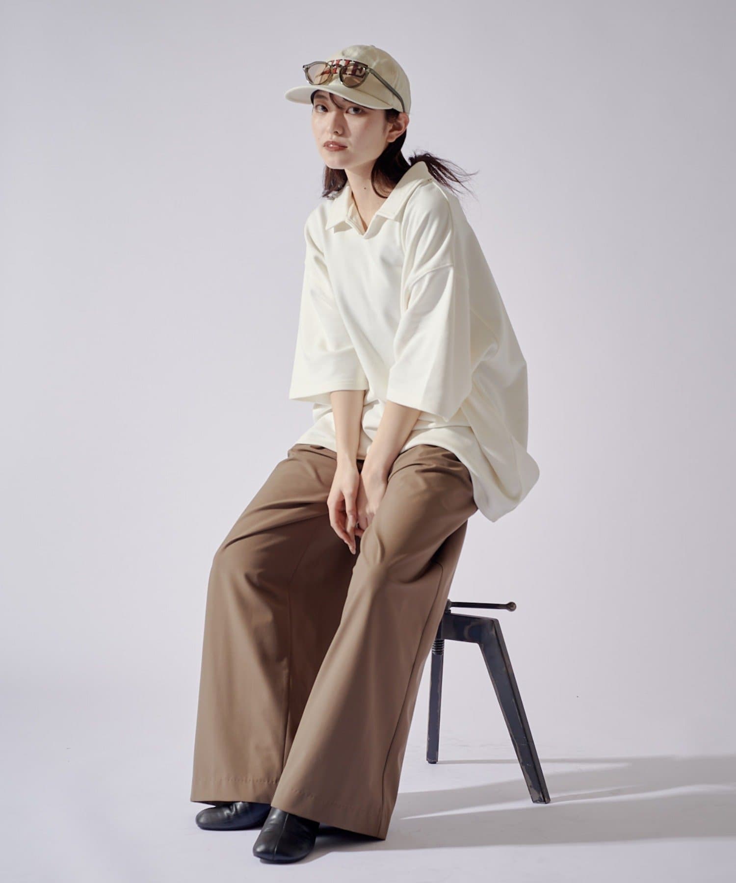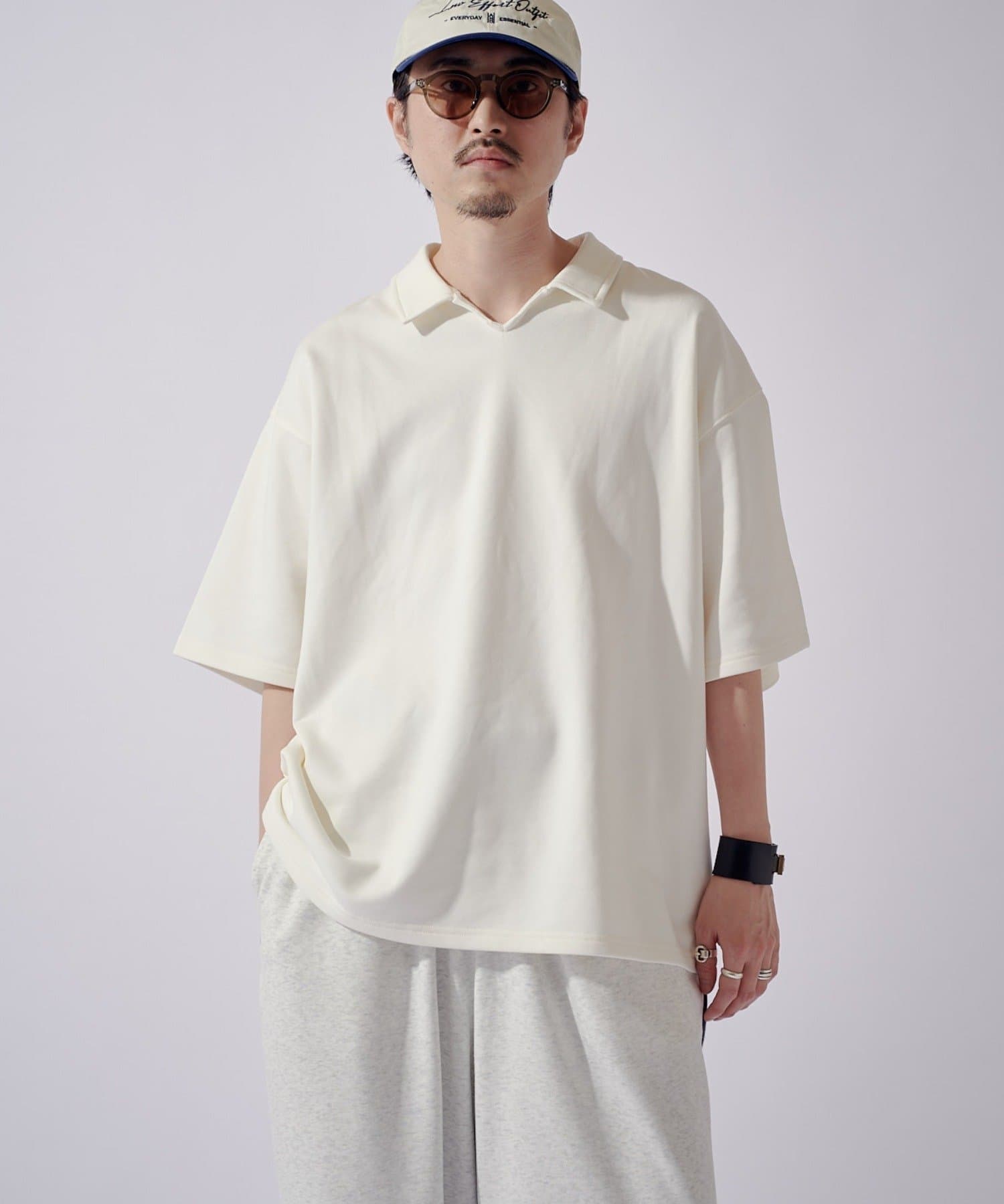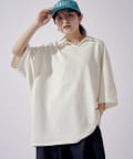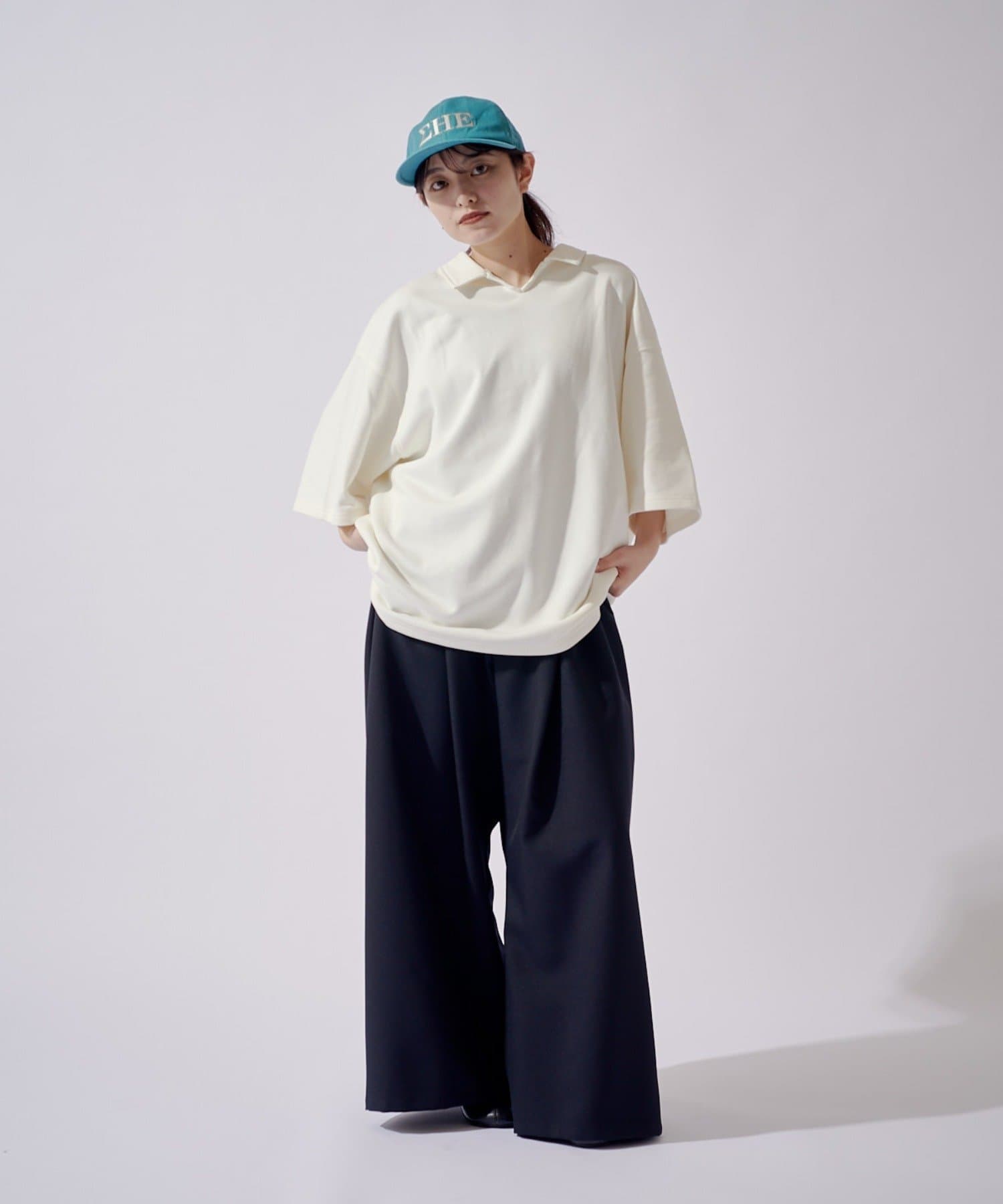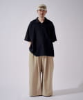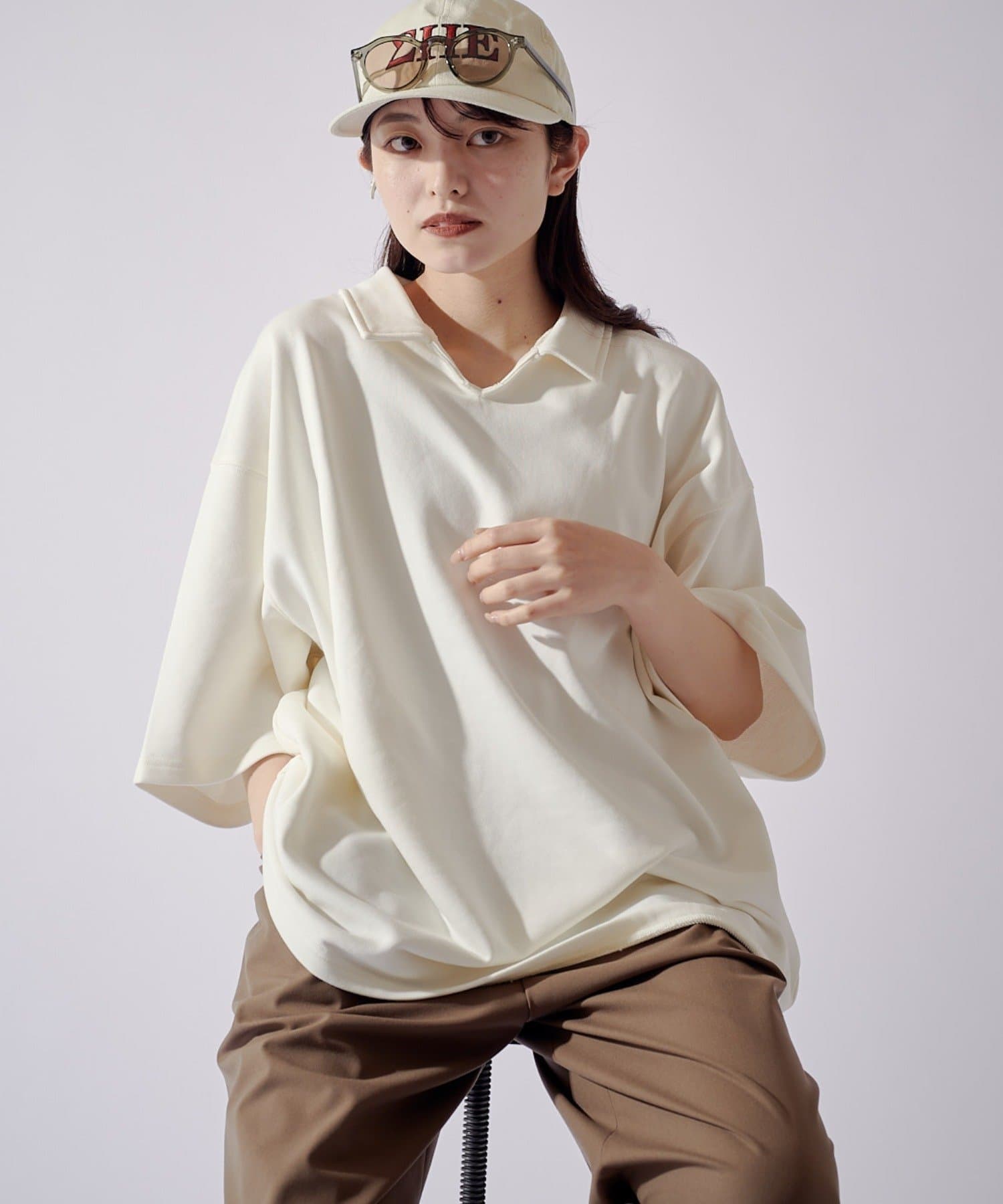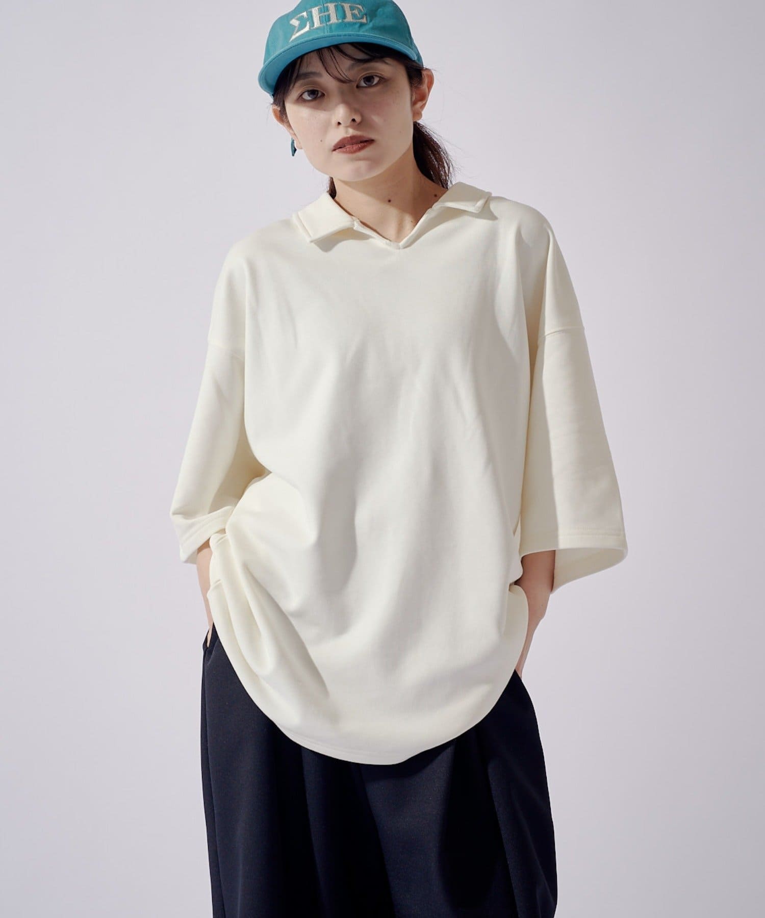 少し涼しげな印象を感じられるようにスキッパーデザインに。通常のスキッパーデザインより浅めのVネックにしてるところがこだわりです。より使いやすいかと。