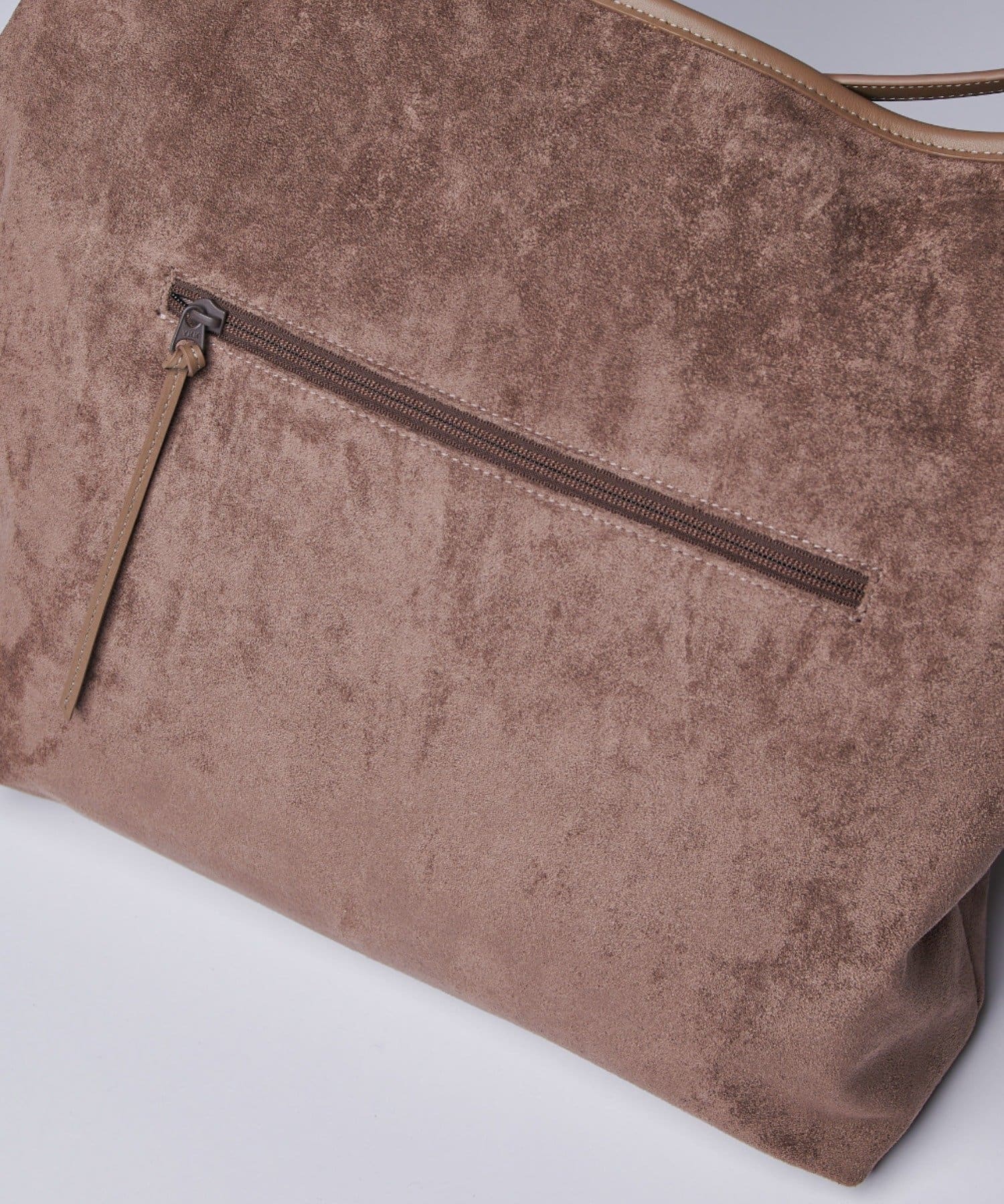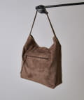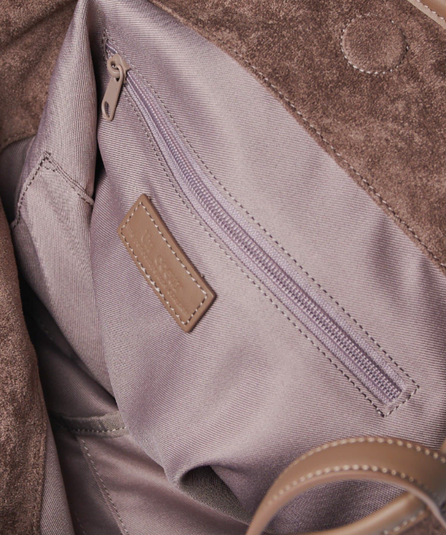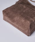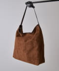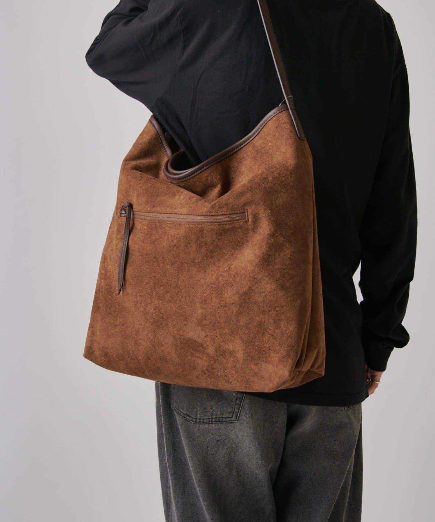 ボディーはポリスエード生地、ハンドルやショルダーにはポイントで本革を使用しています。