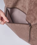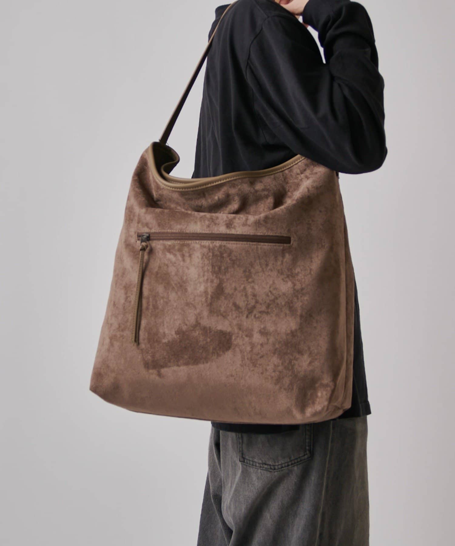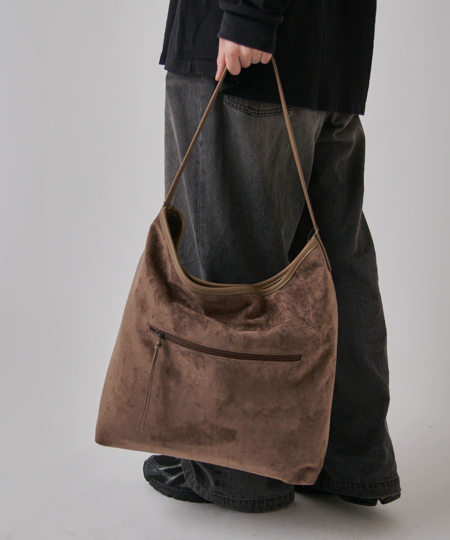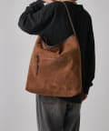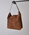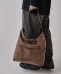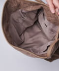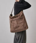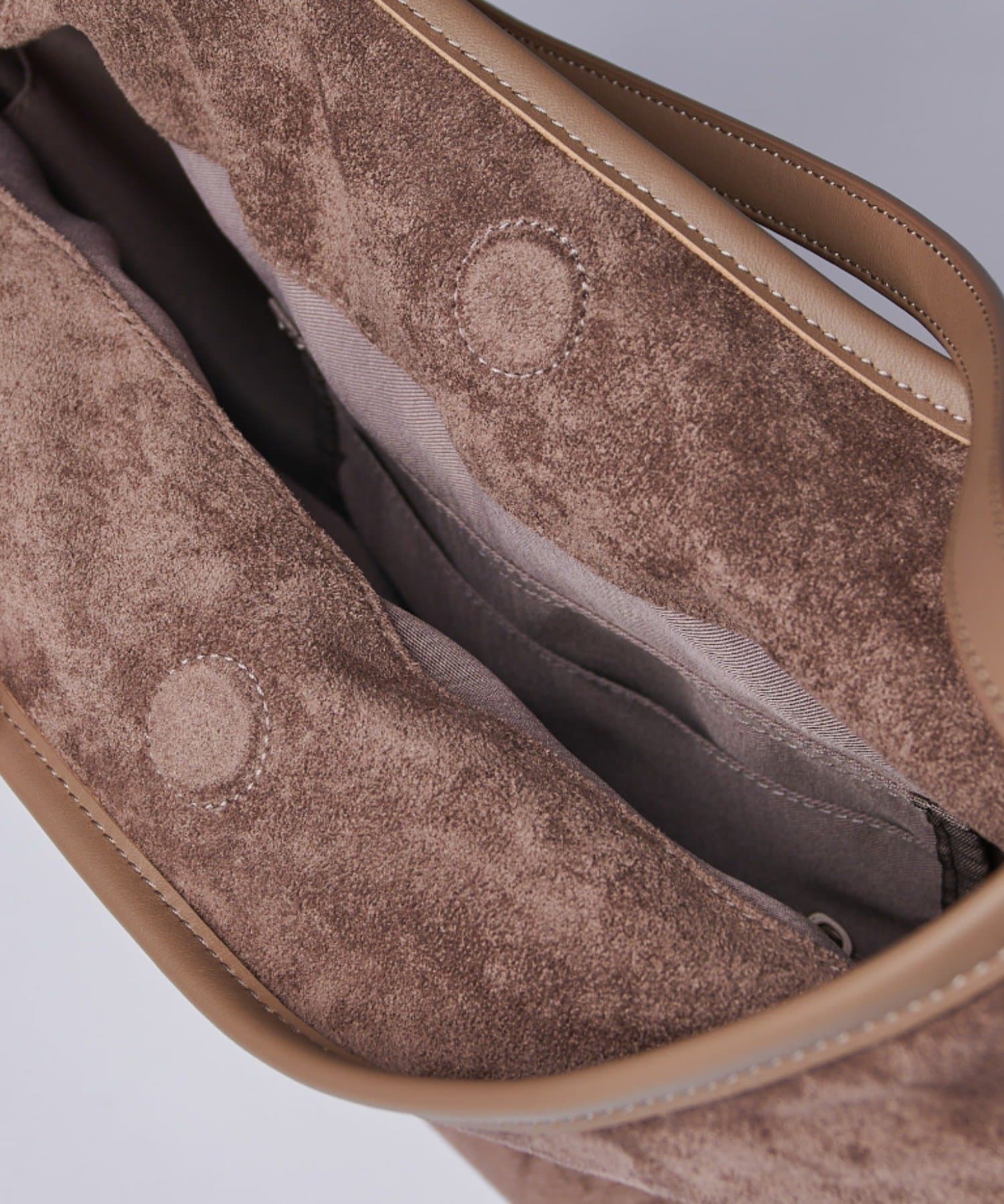 ボディーはポリスエード生地、ハンドルやショルダーにはポイントで本革を使用しています。