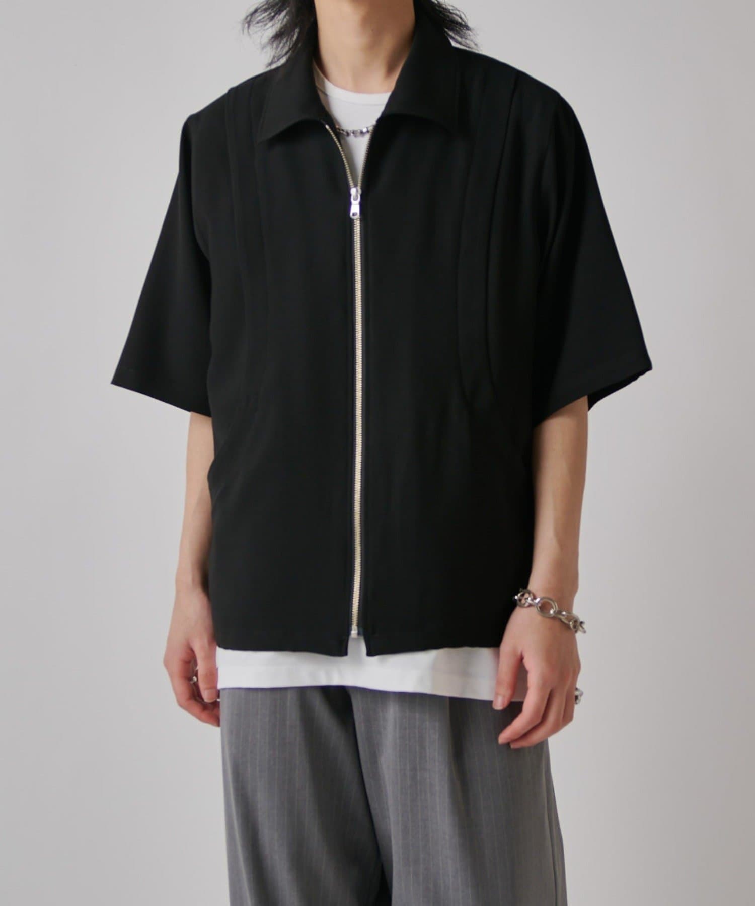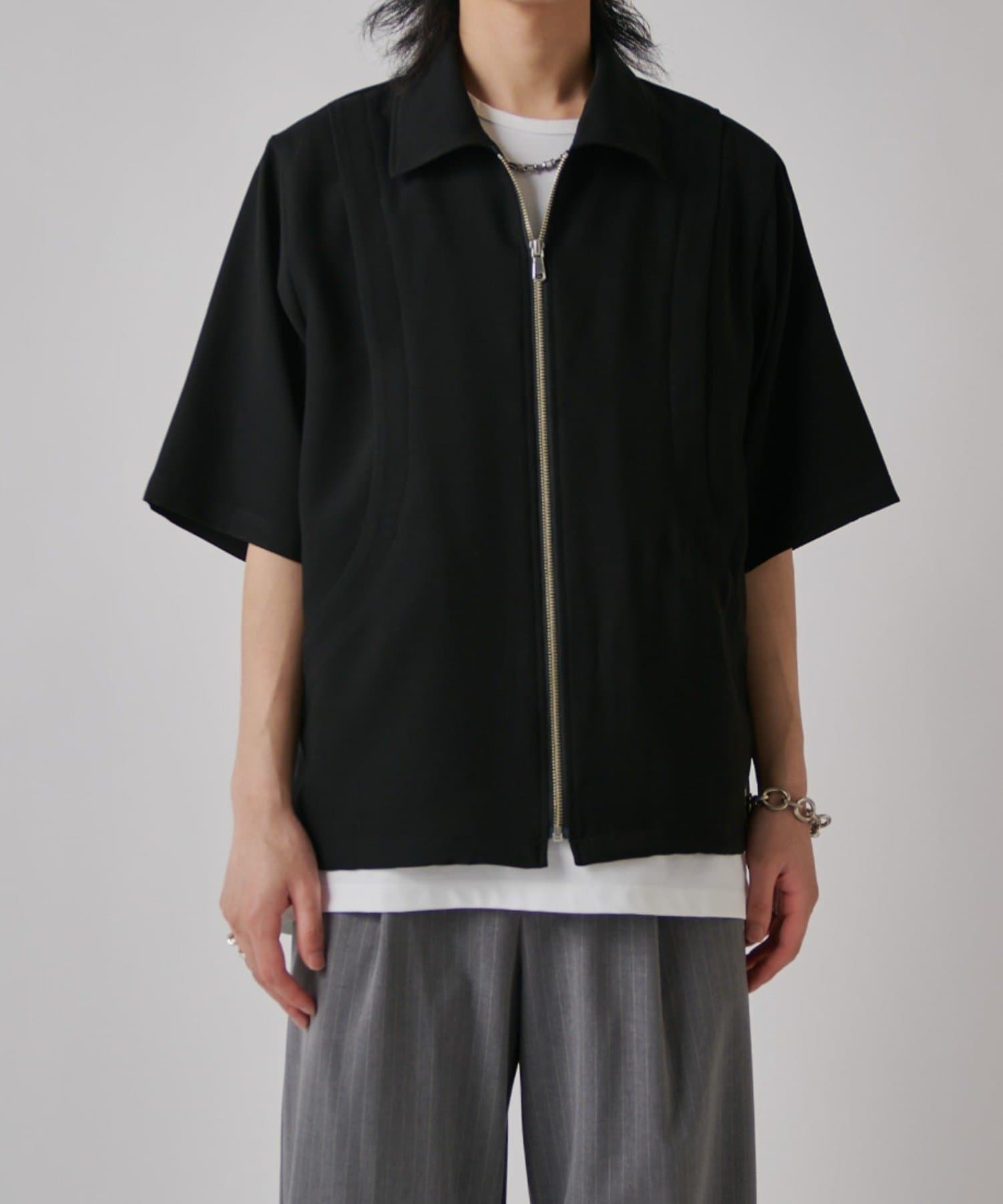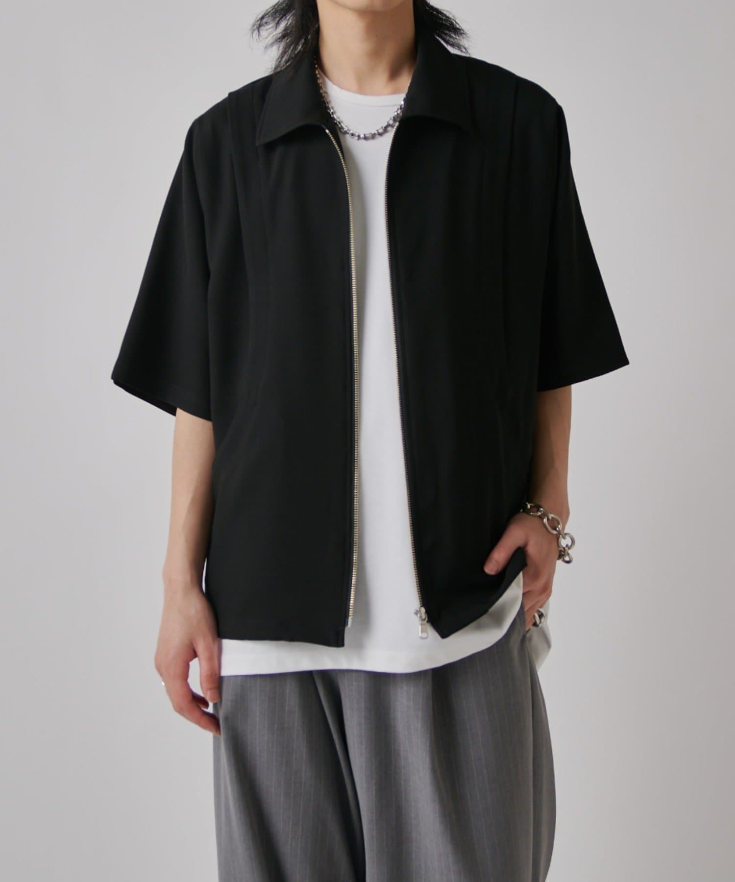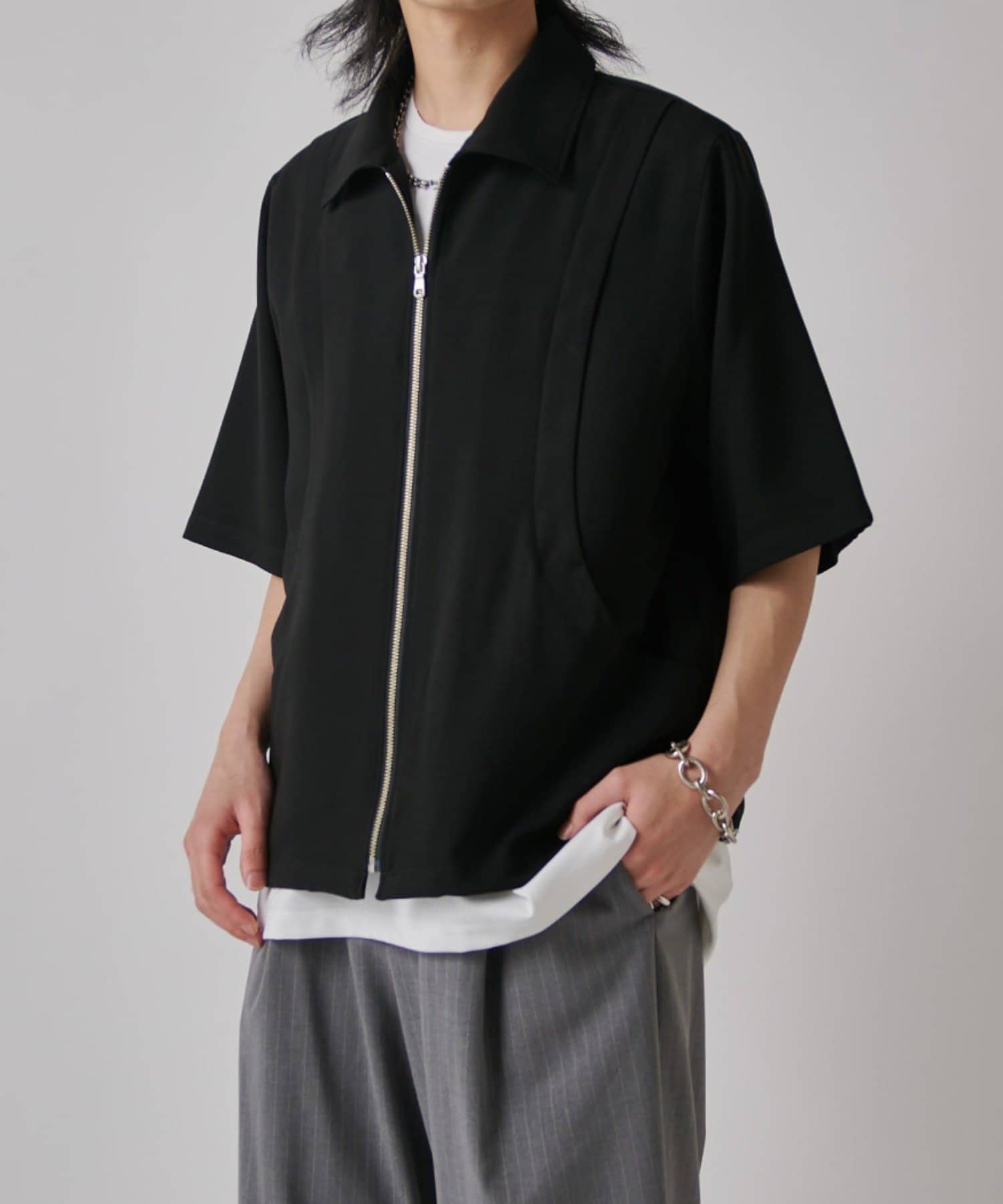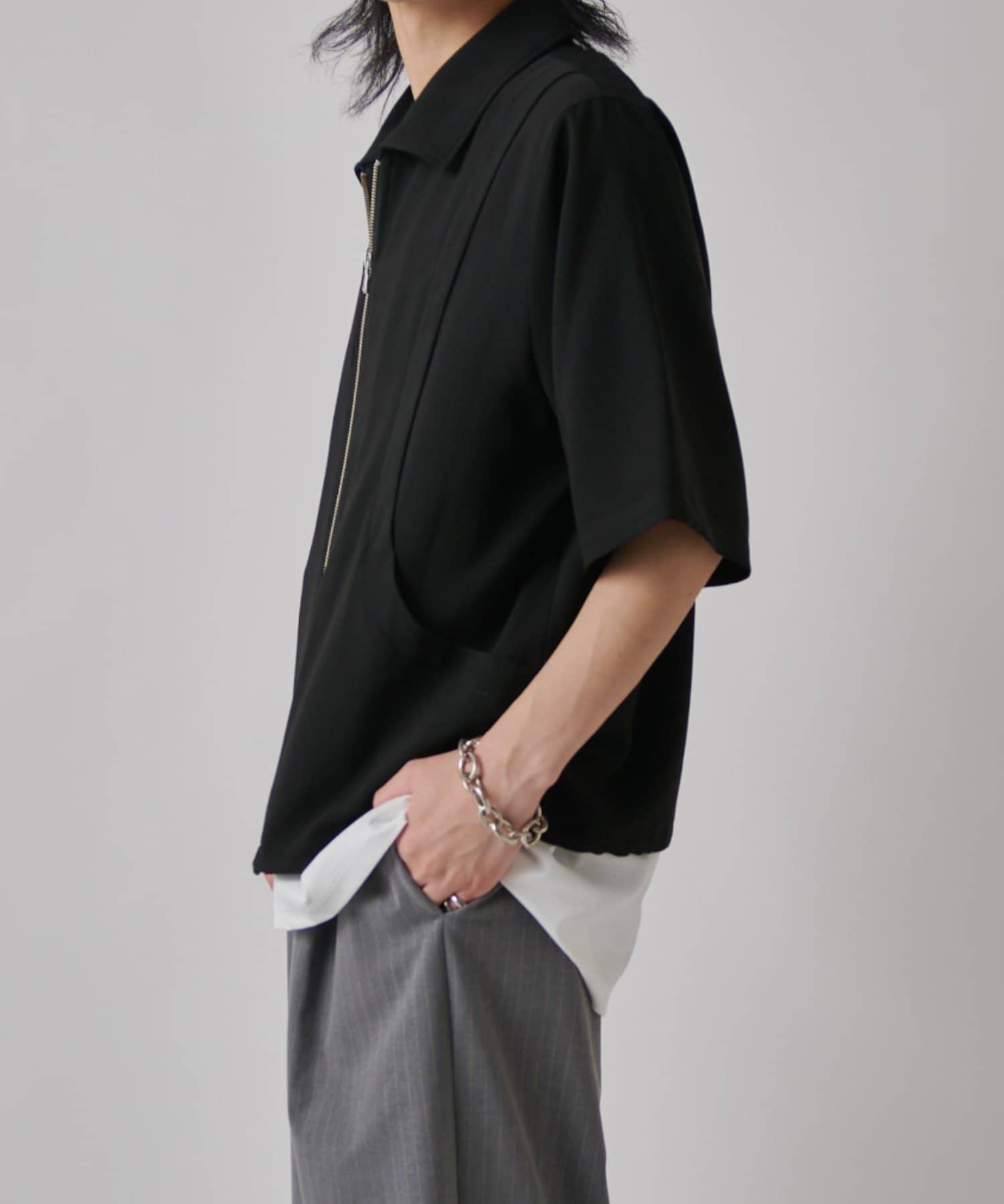 ・レイヤードデザインが特徴の半袖ジップシャツ。