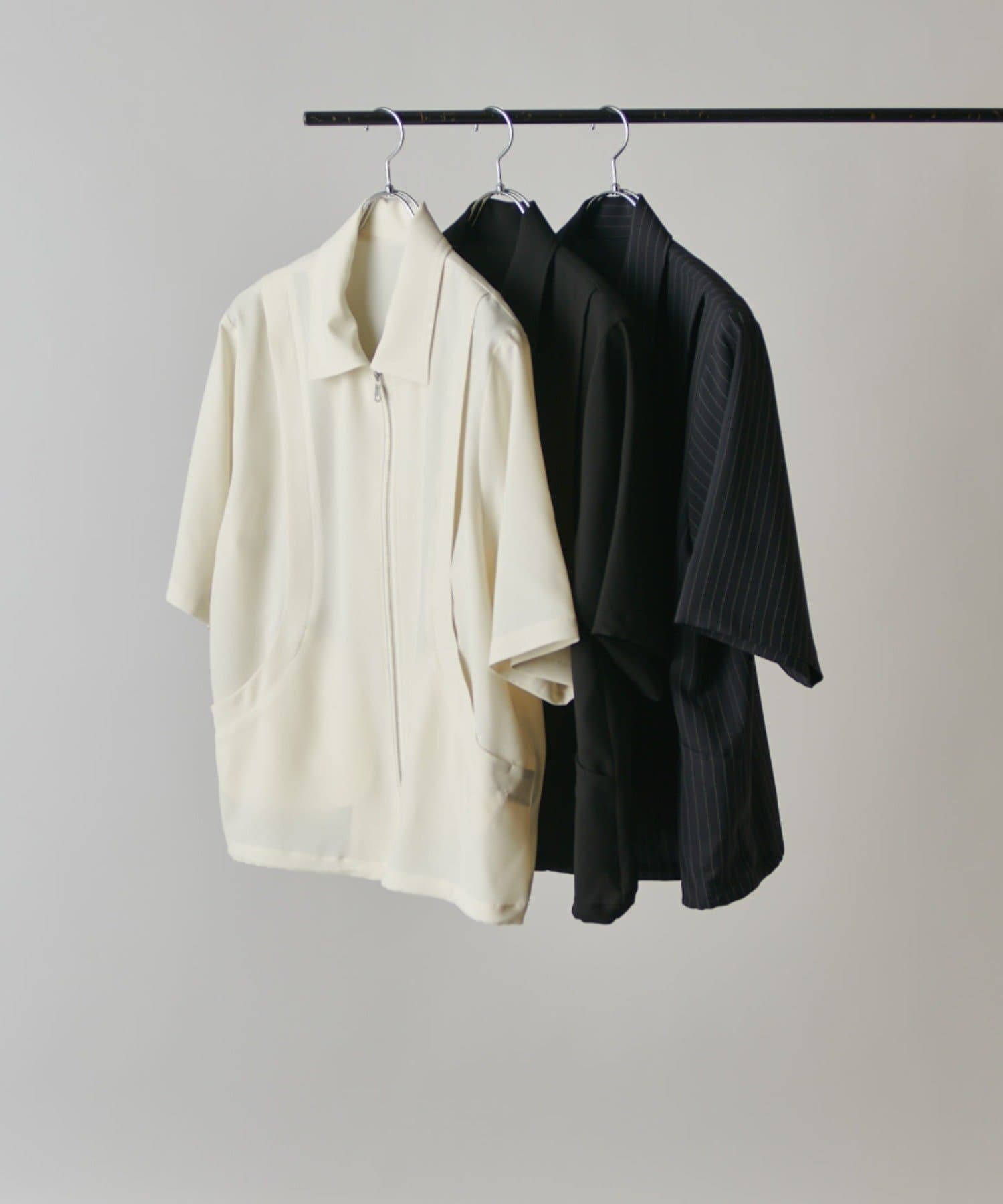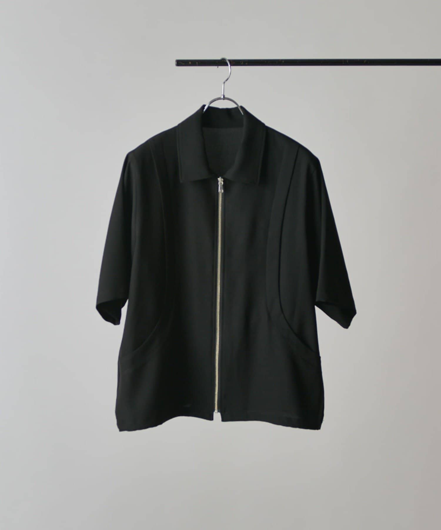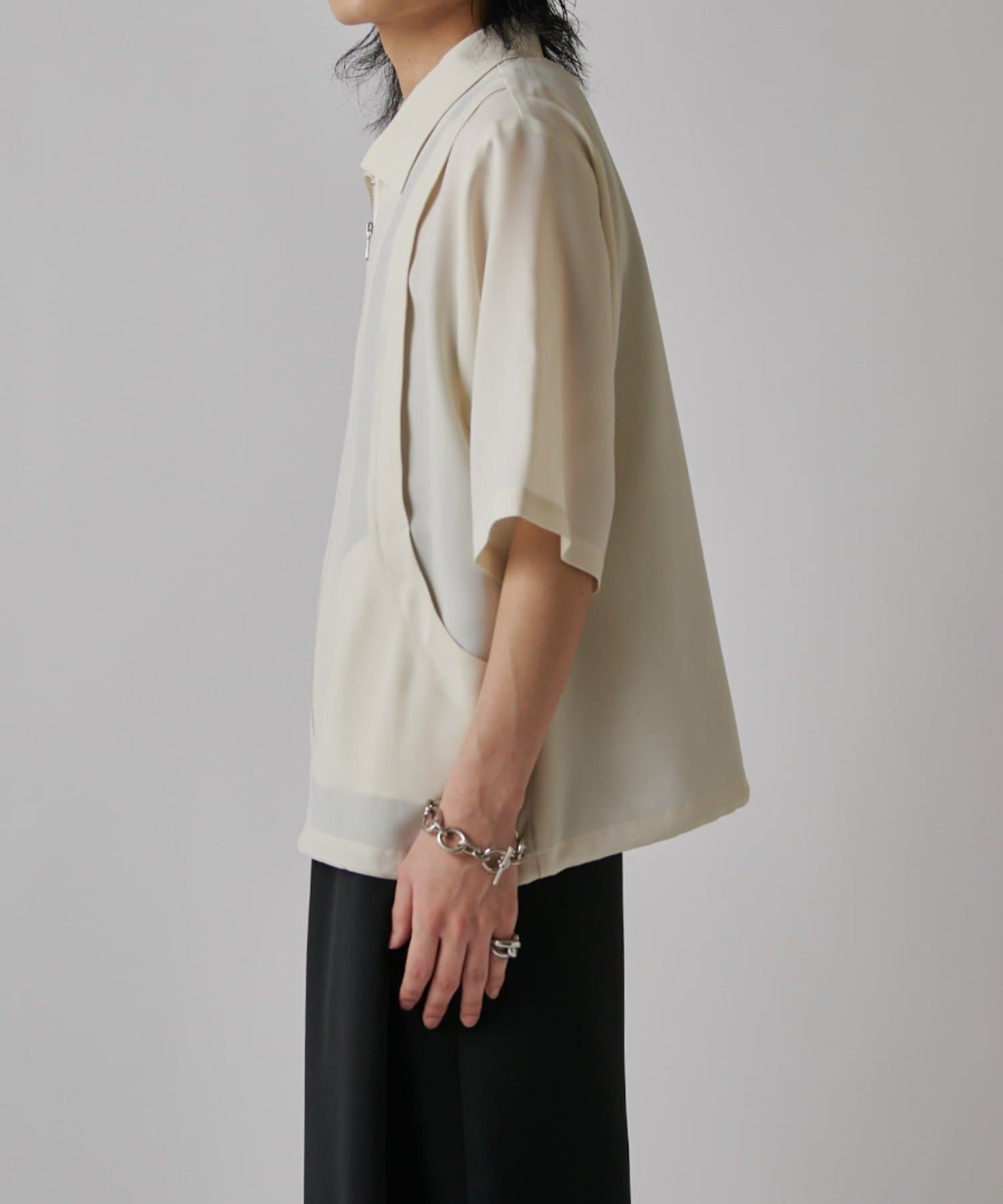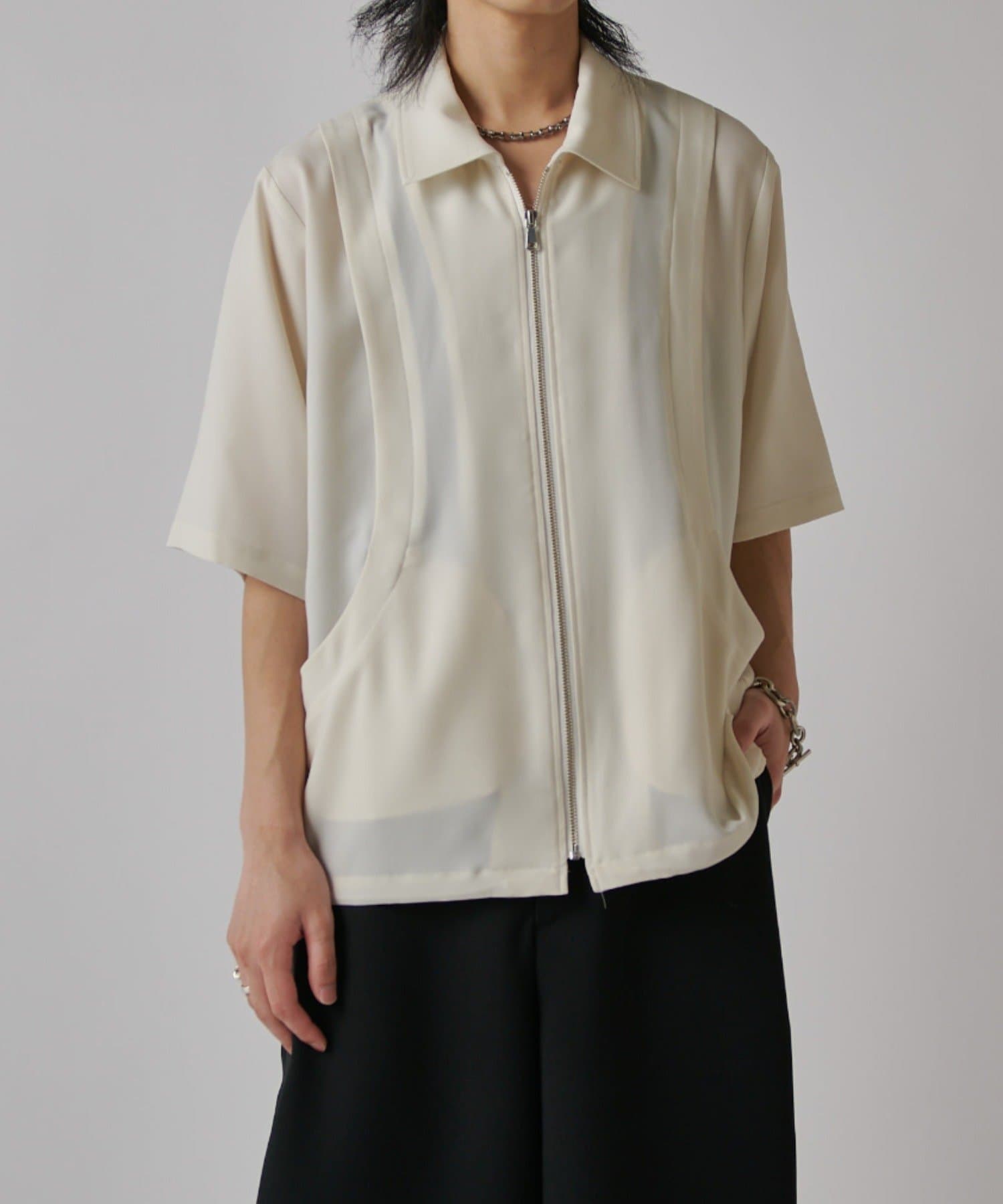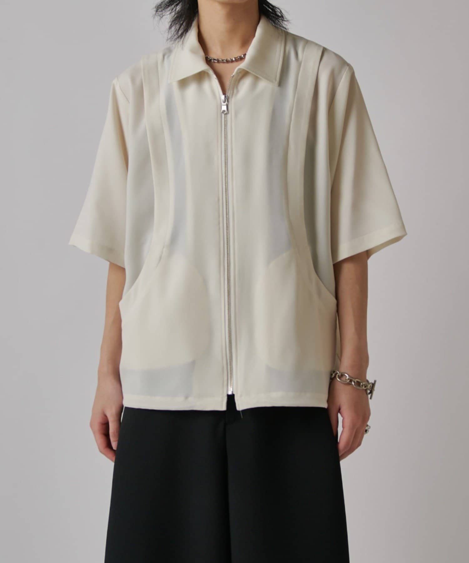 ・レイヤードデザインが特徴の半袖ジップシャツ。