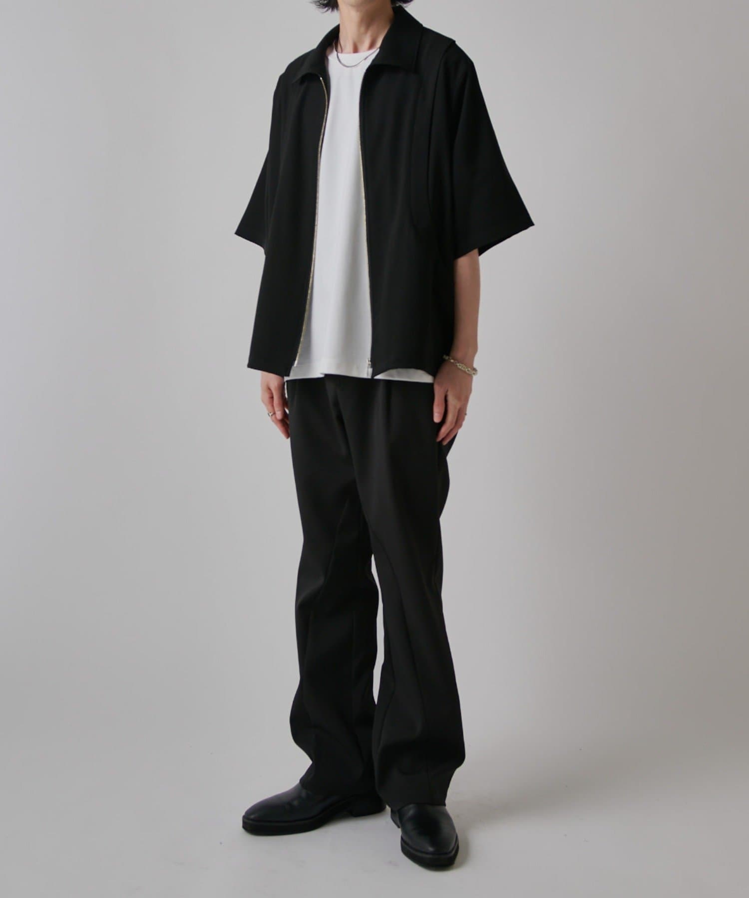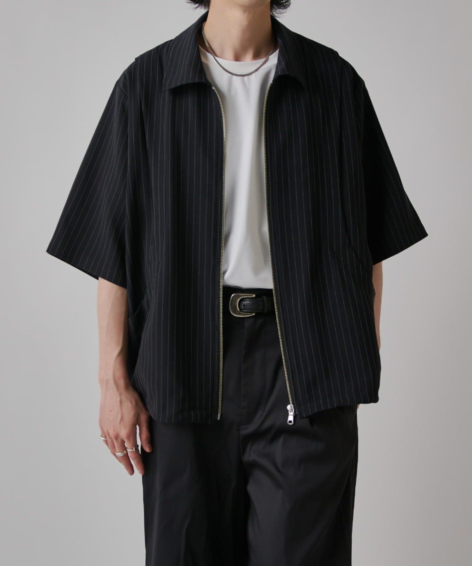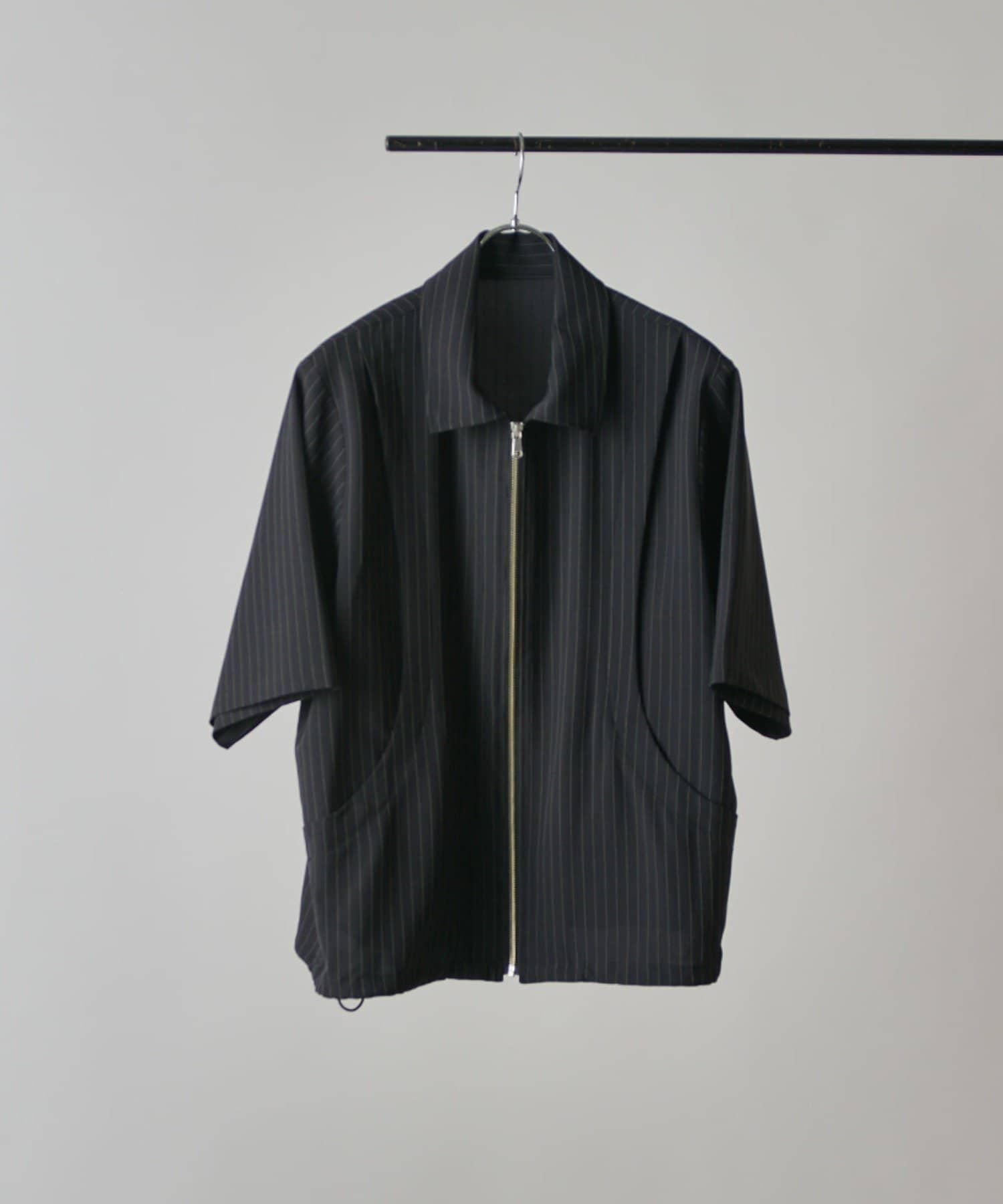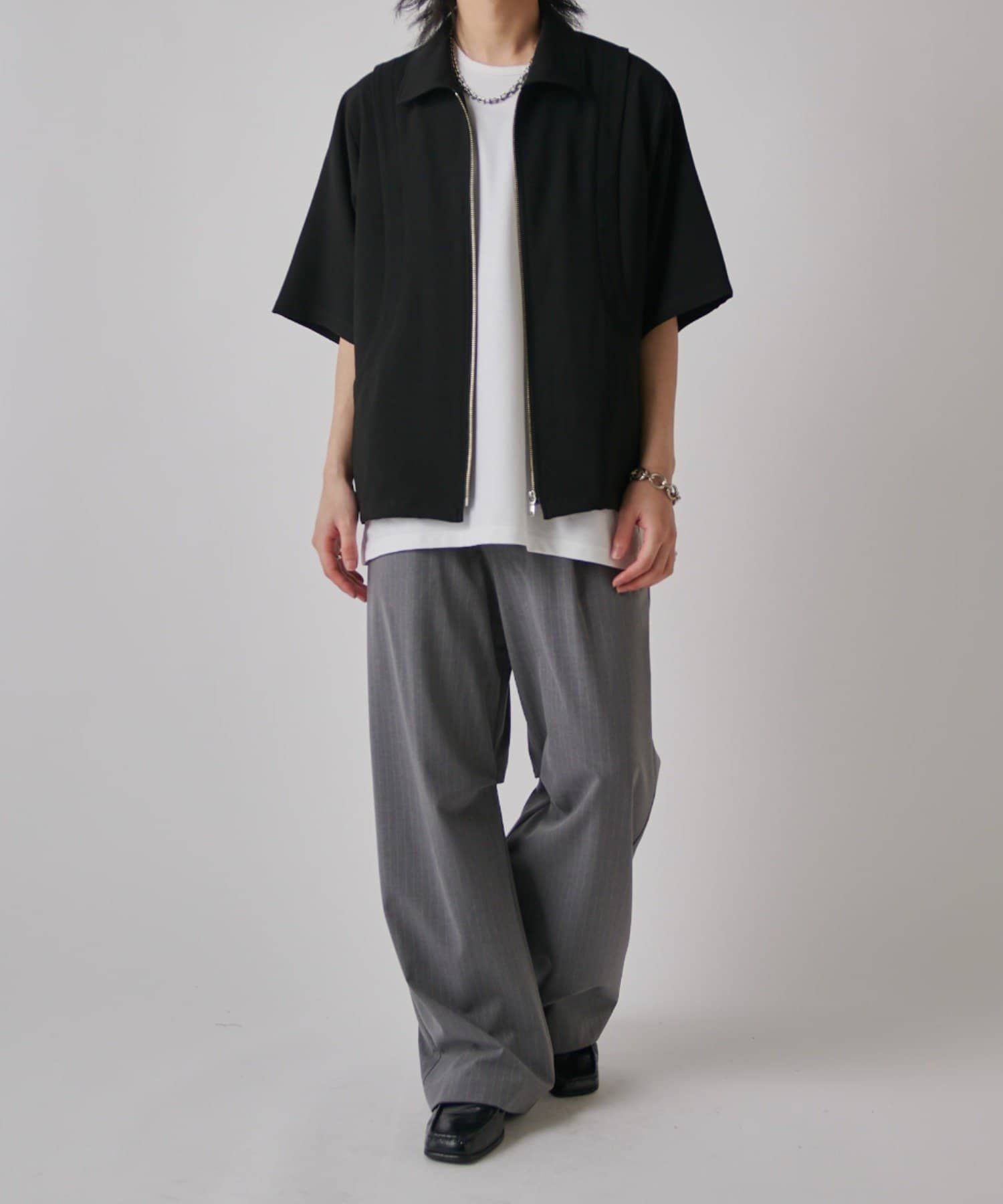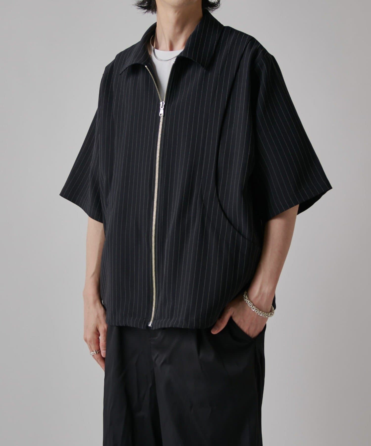 ・レイヤードデザインが特徴の半袖ジップシャツ。