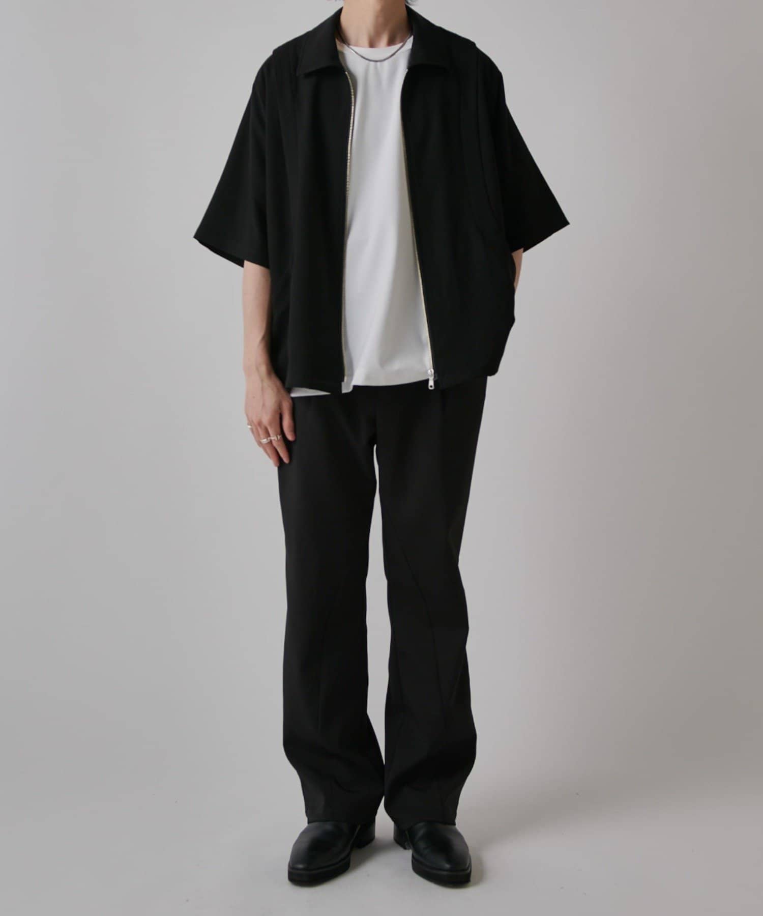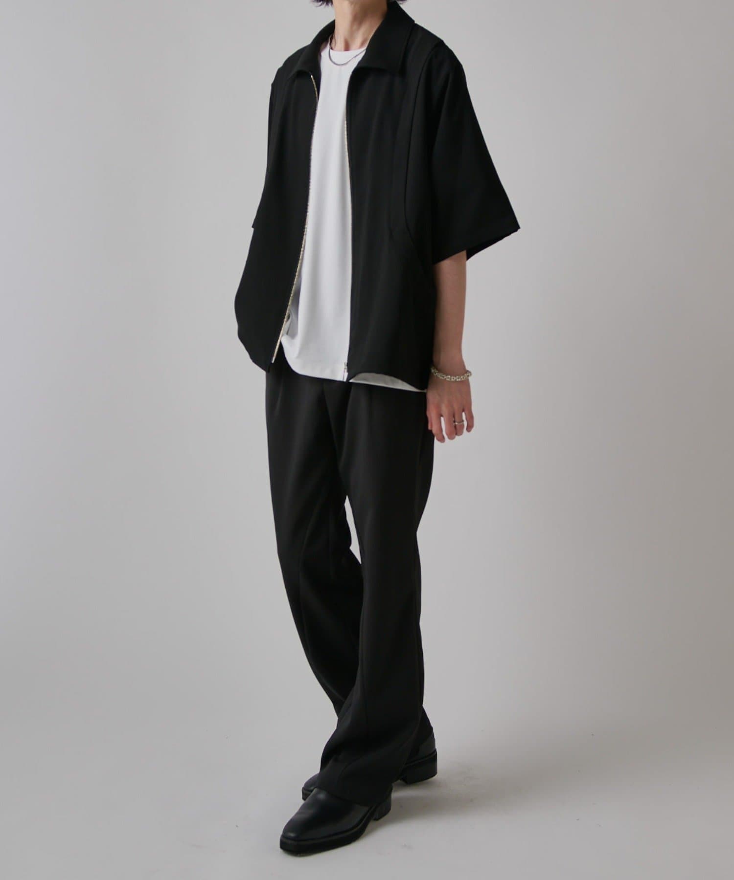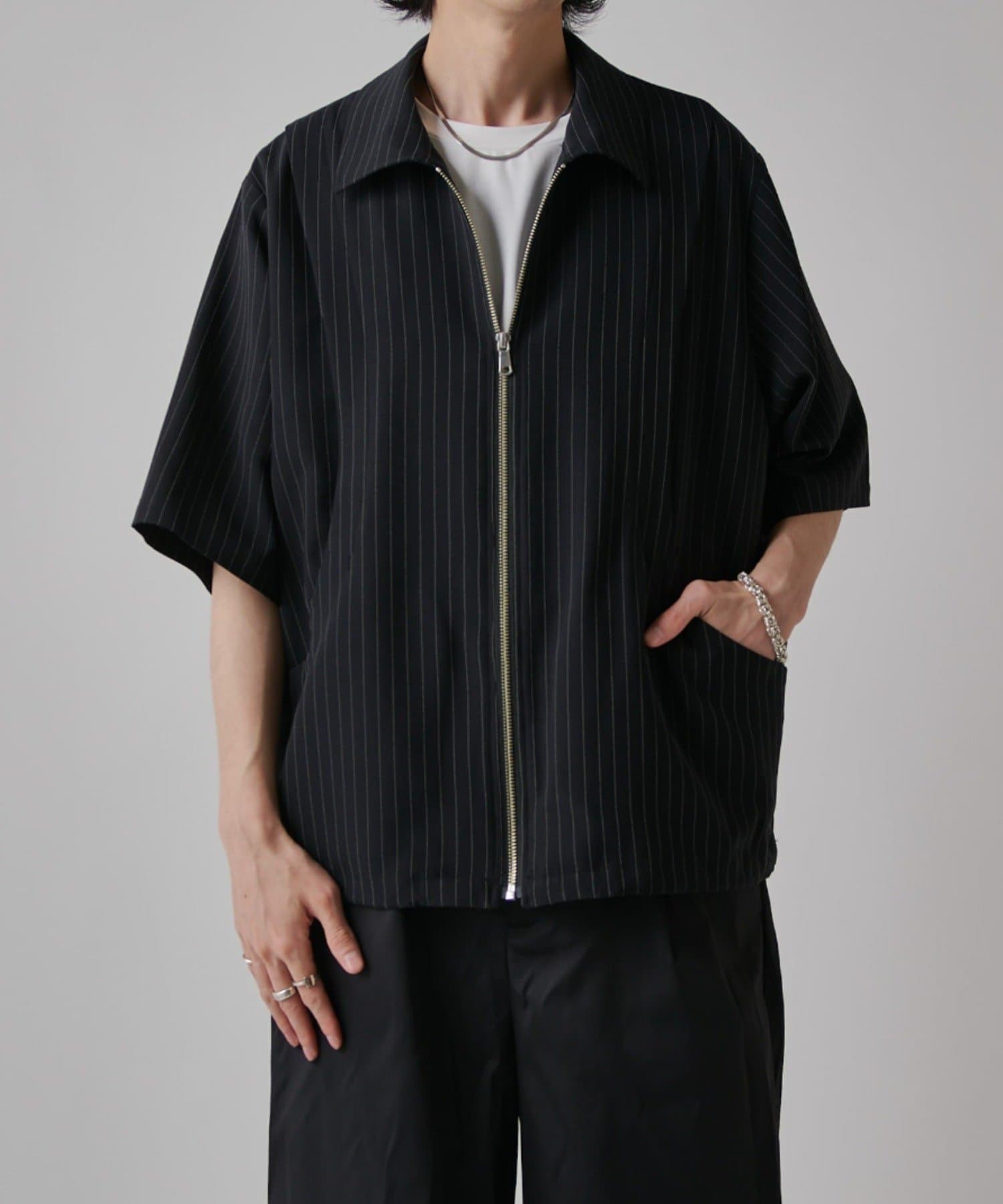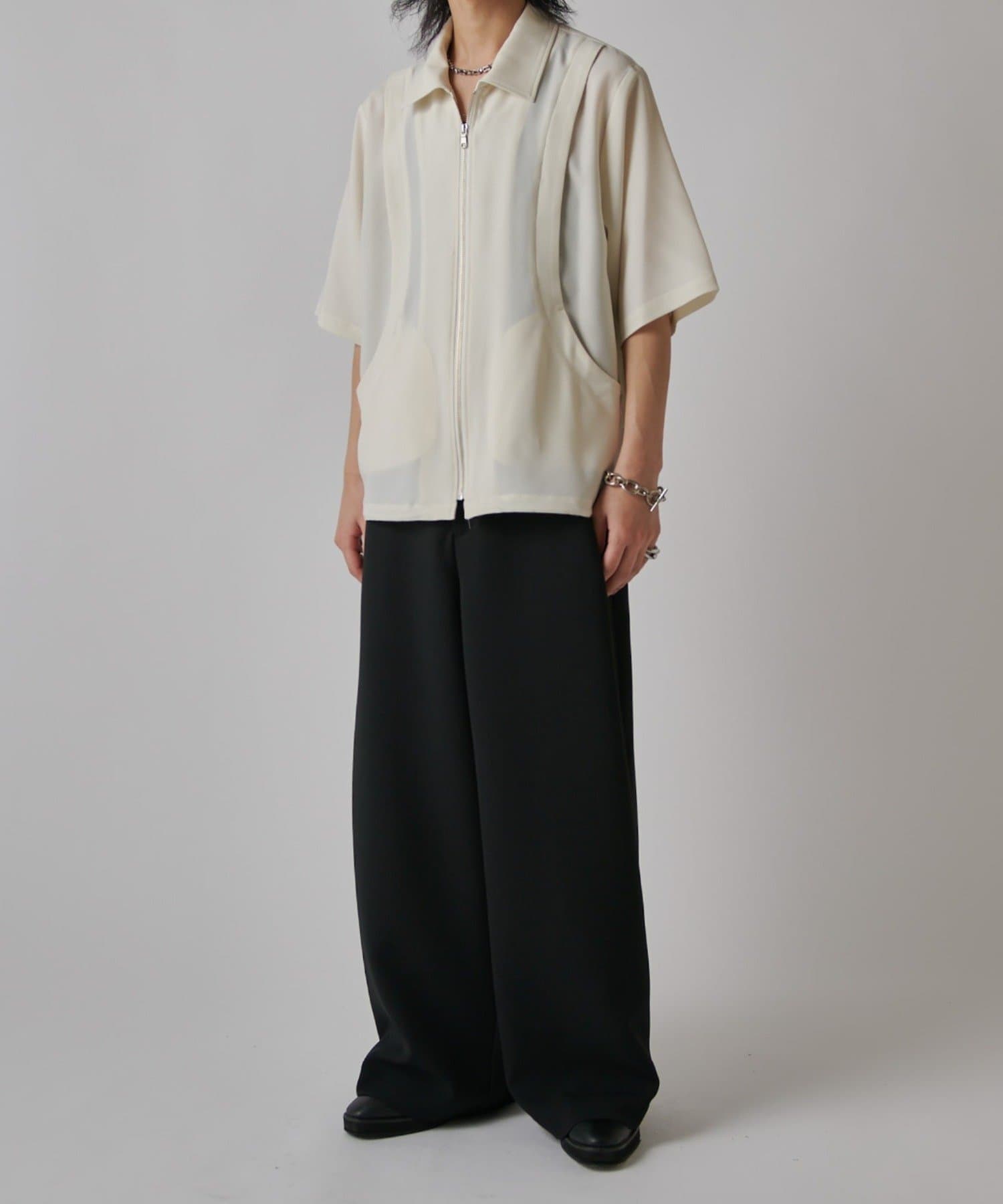 ・レイヤードデザインが特徴の半袖ジップシャツ。