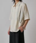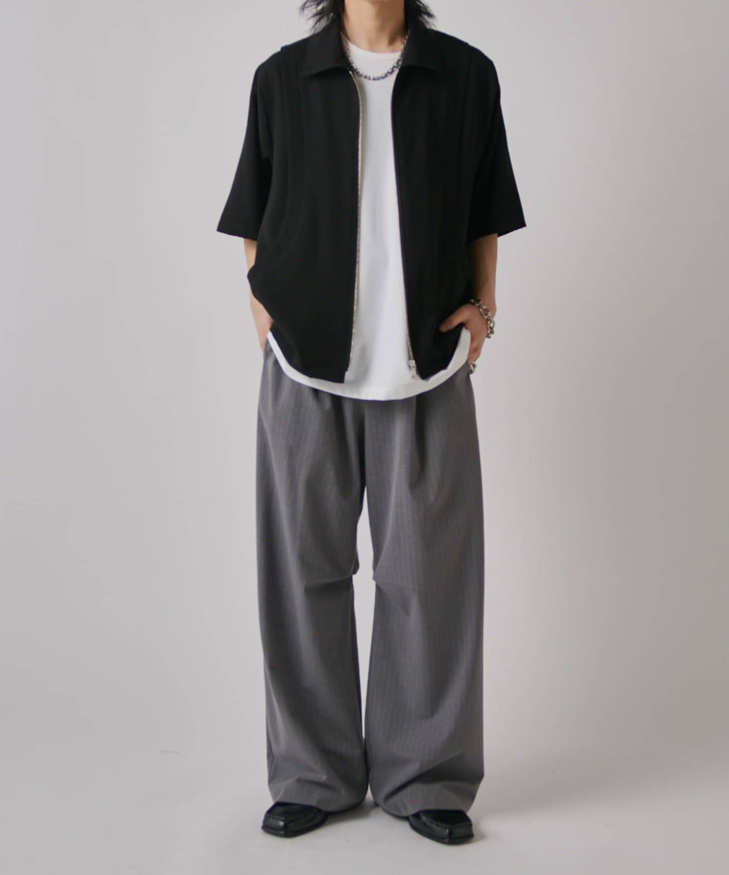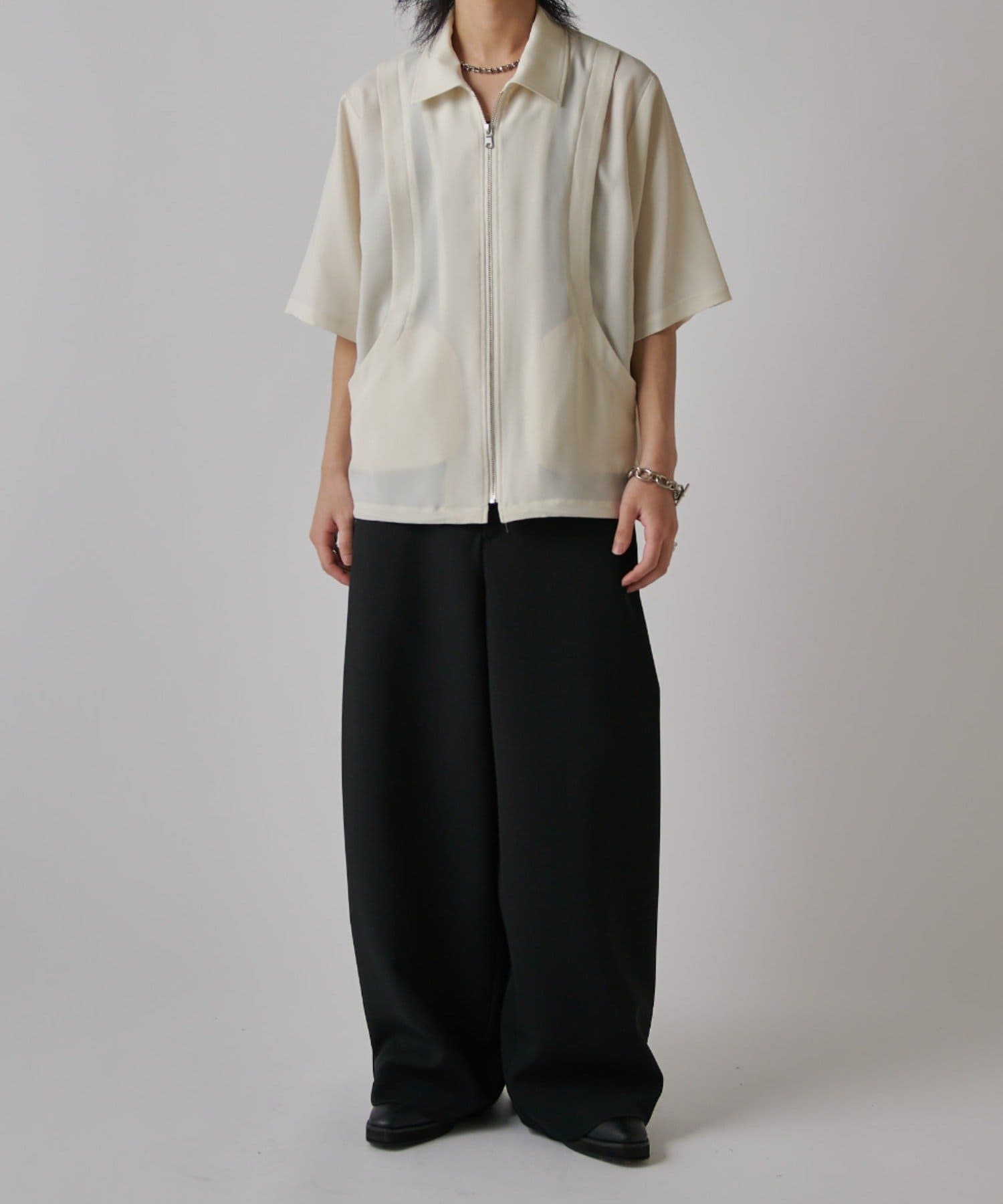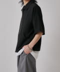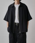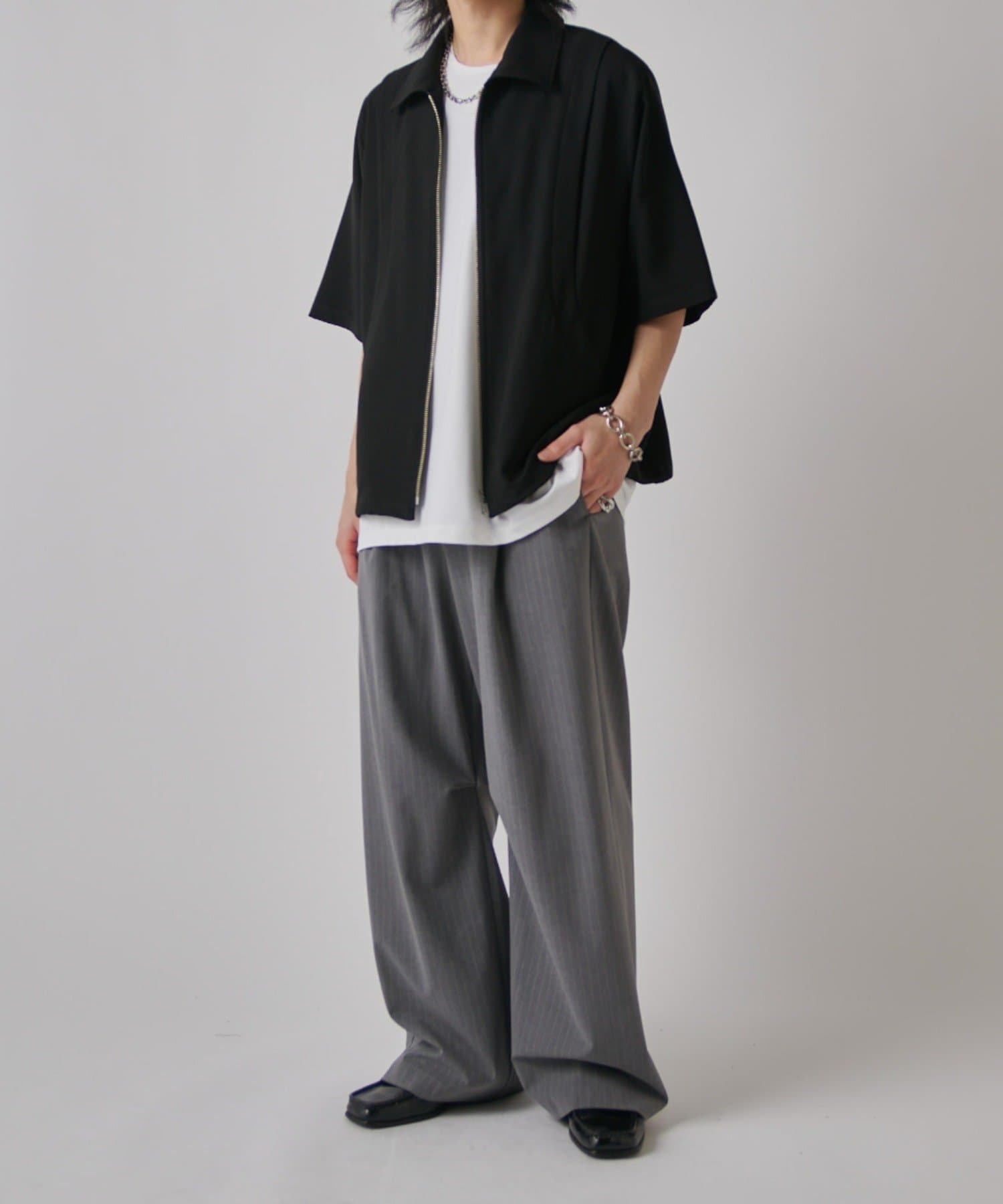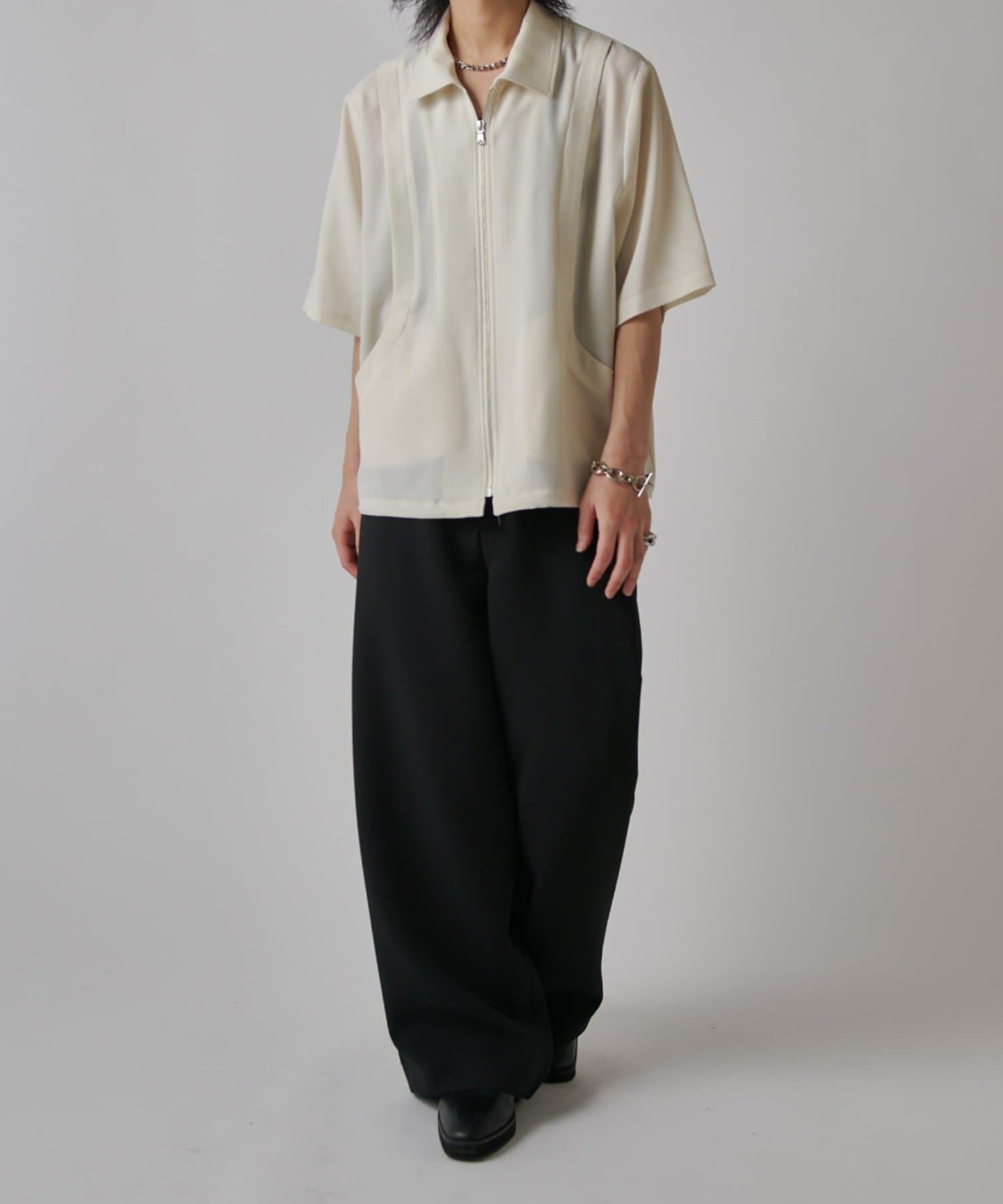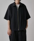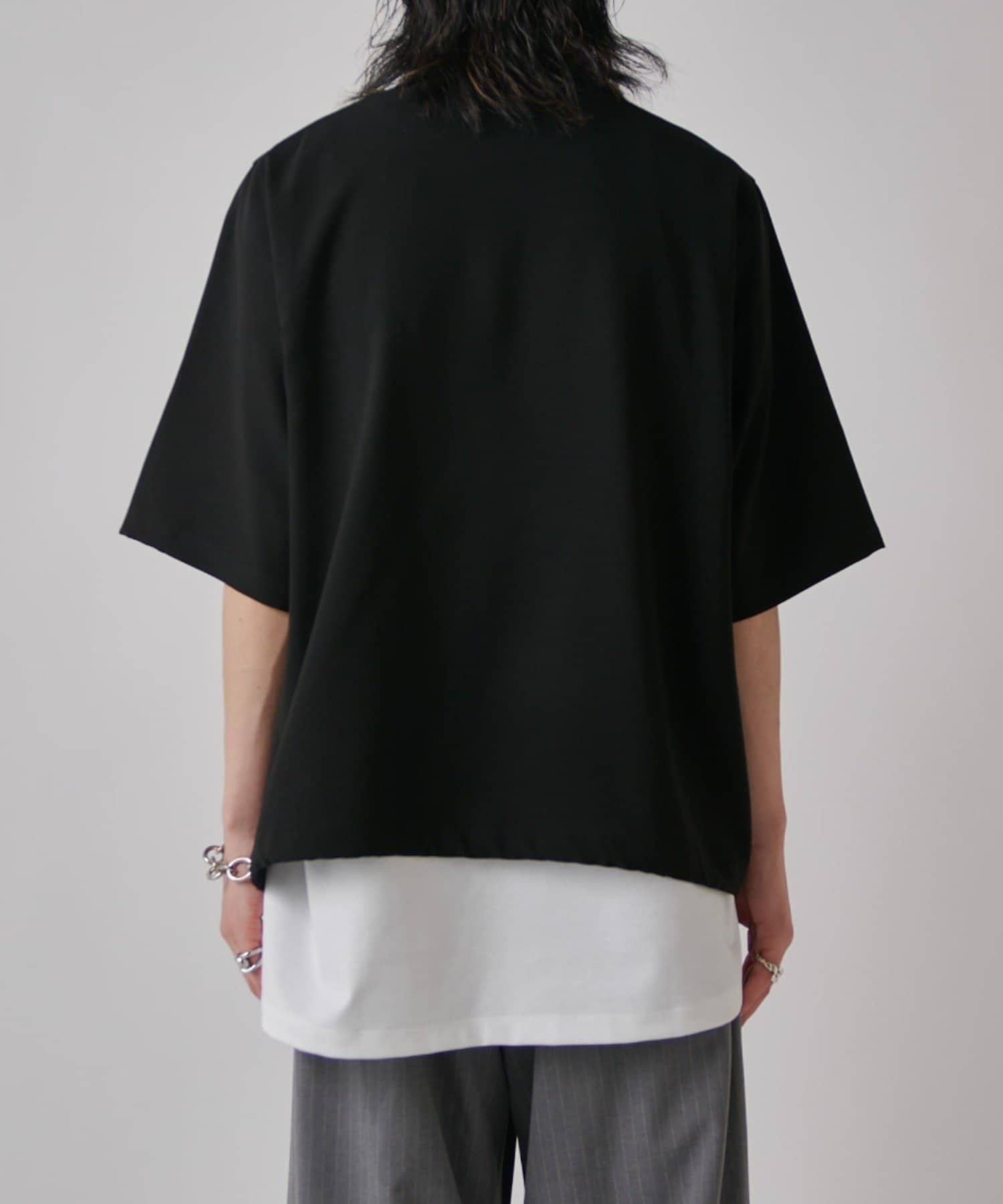 ・レイヤードデザインが特徴の半袖ジップシャツ。