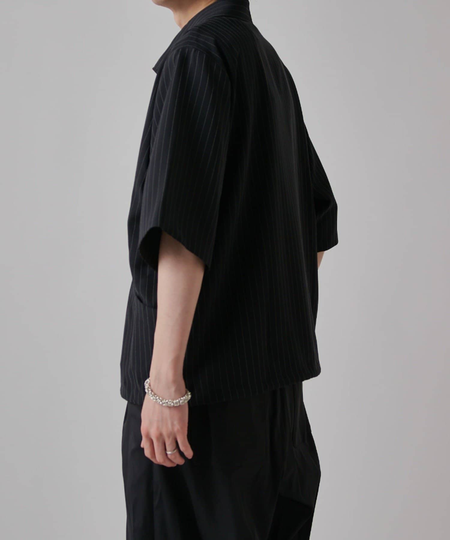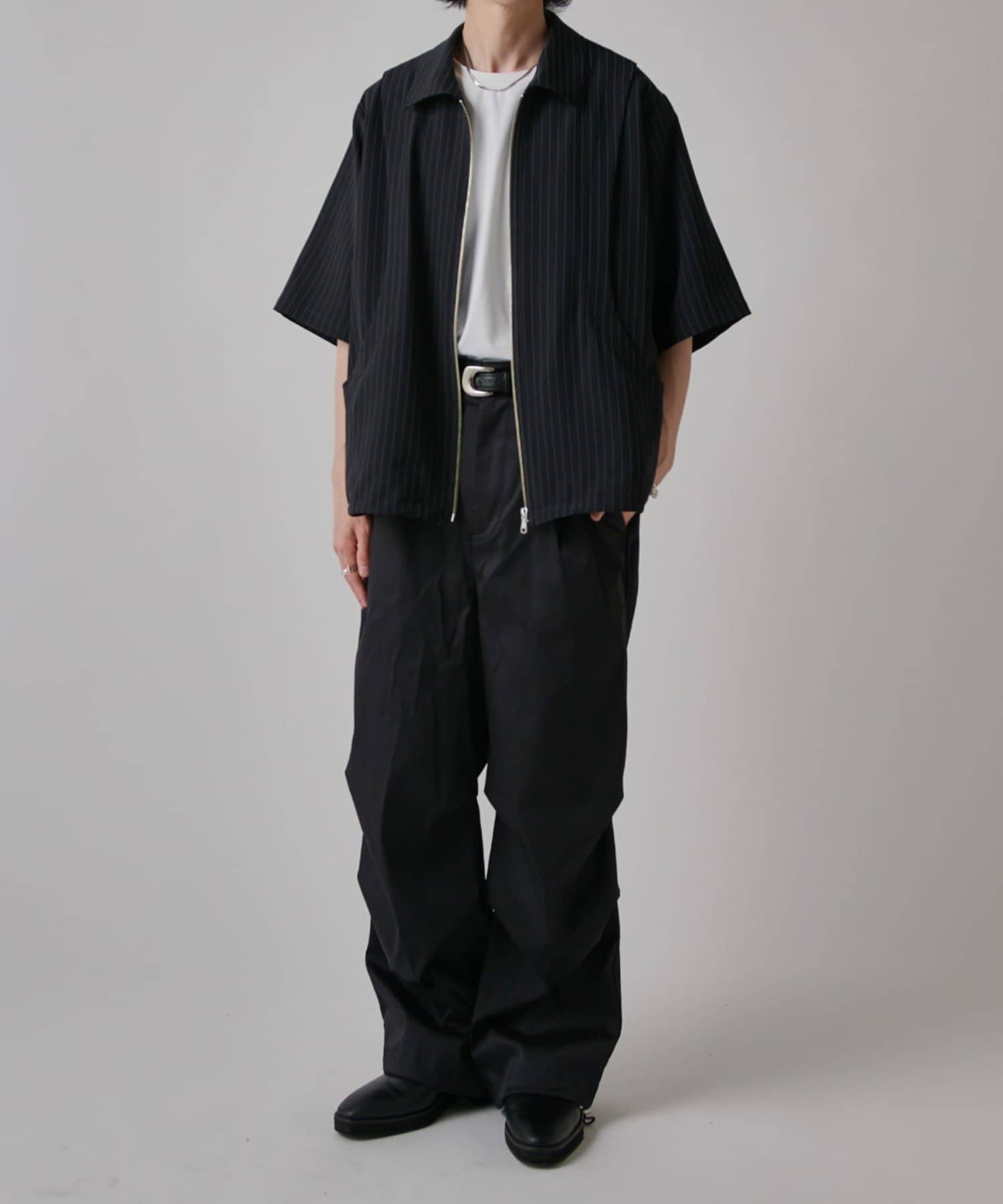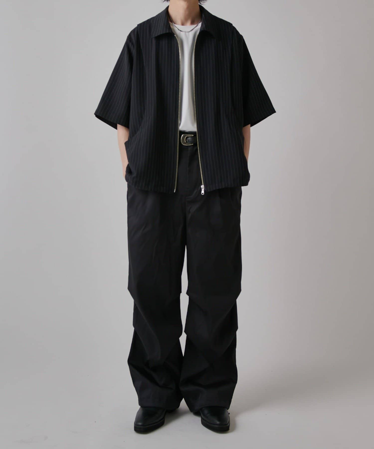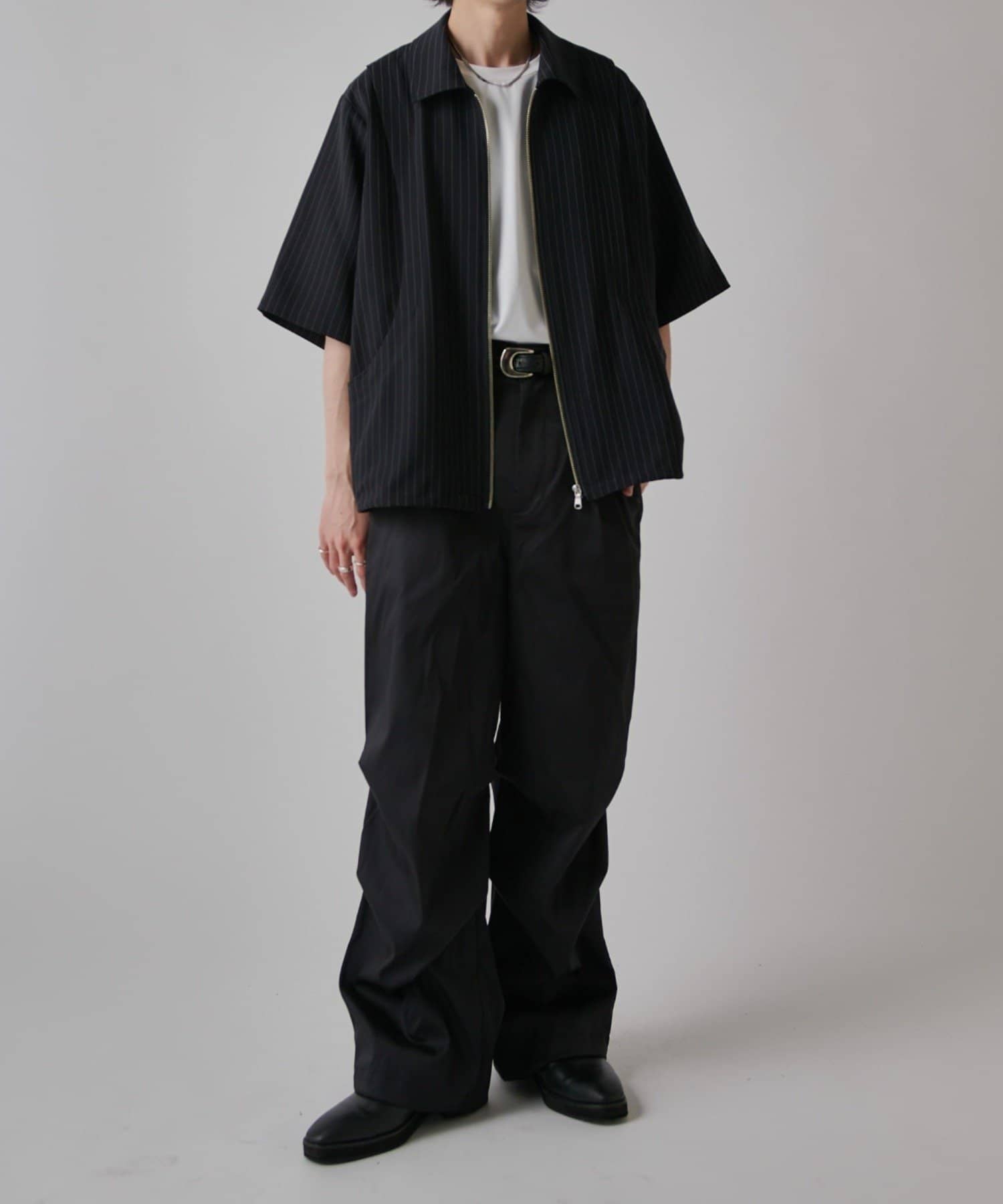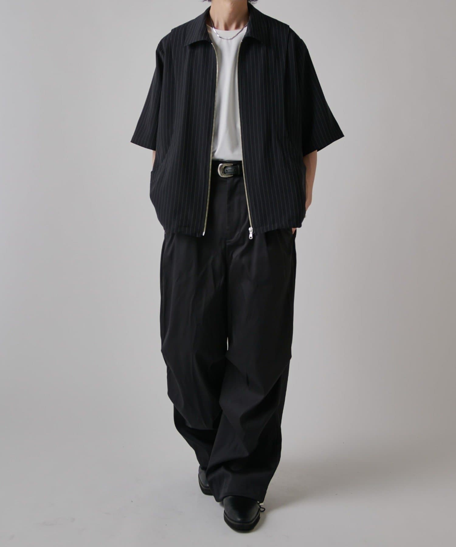・レイヤードデザインが特徴の半袖ジップシャツ。
