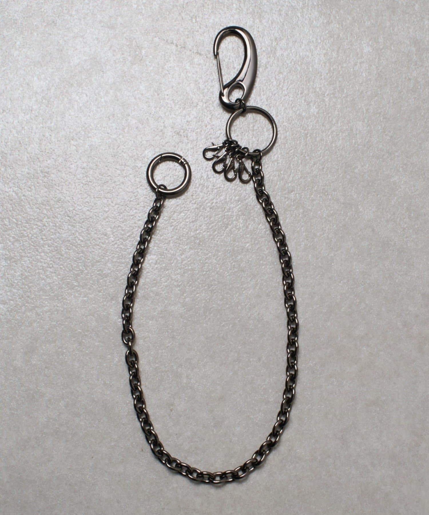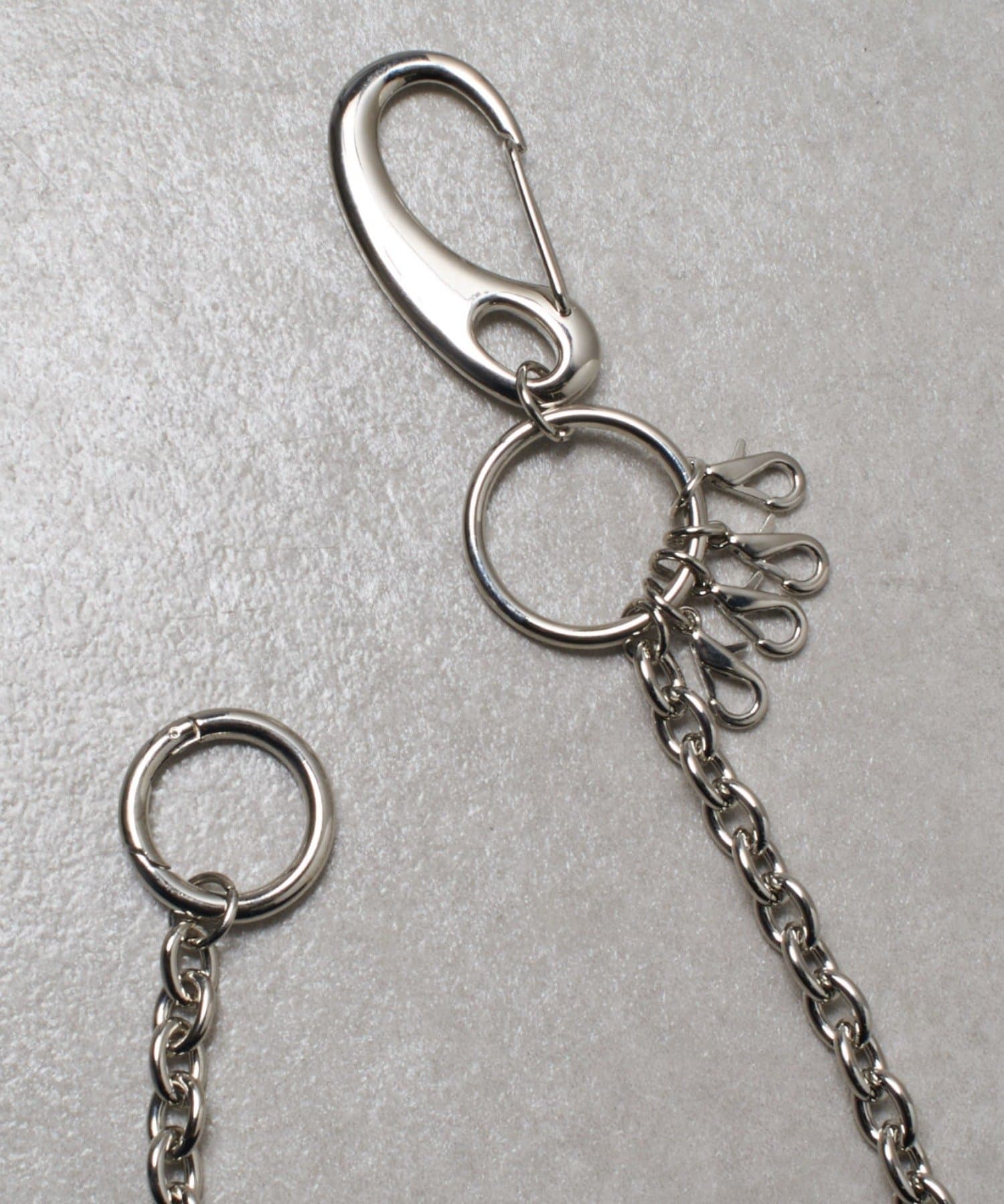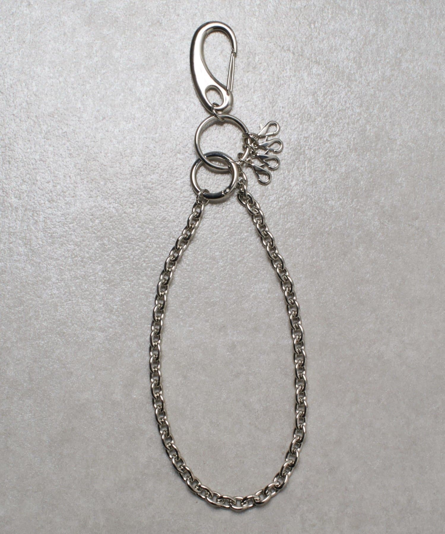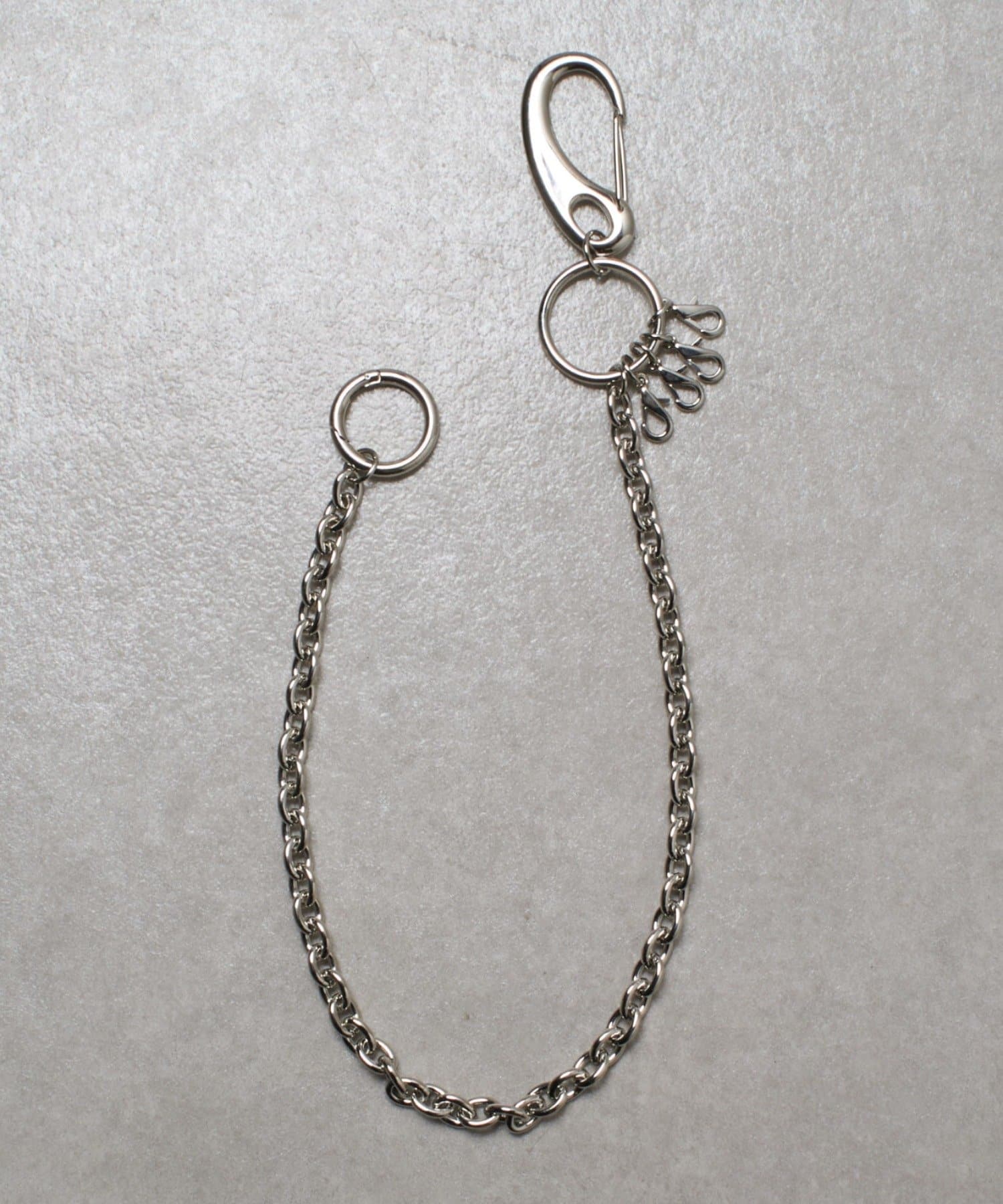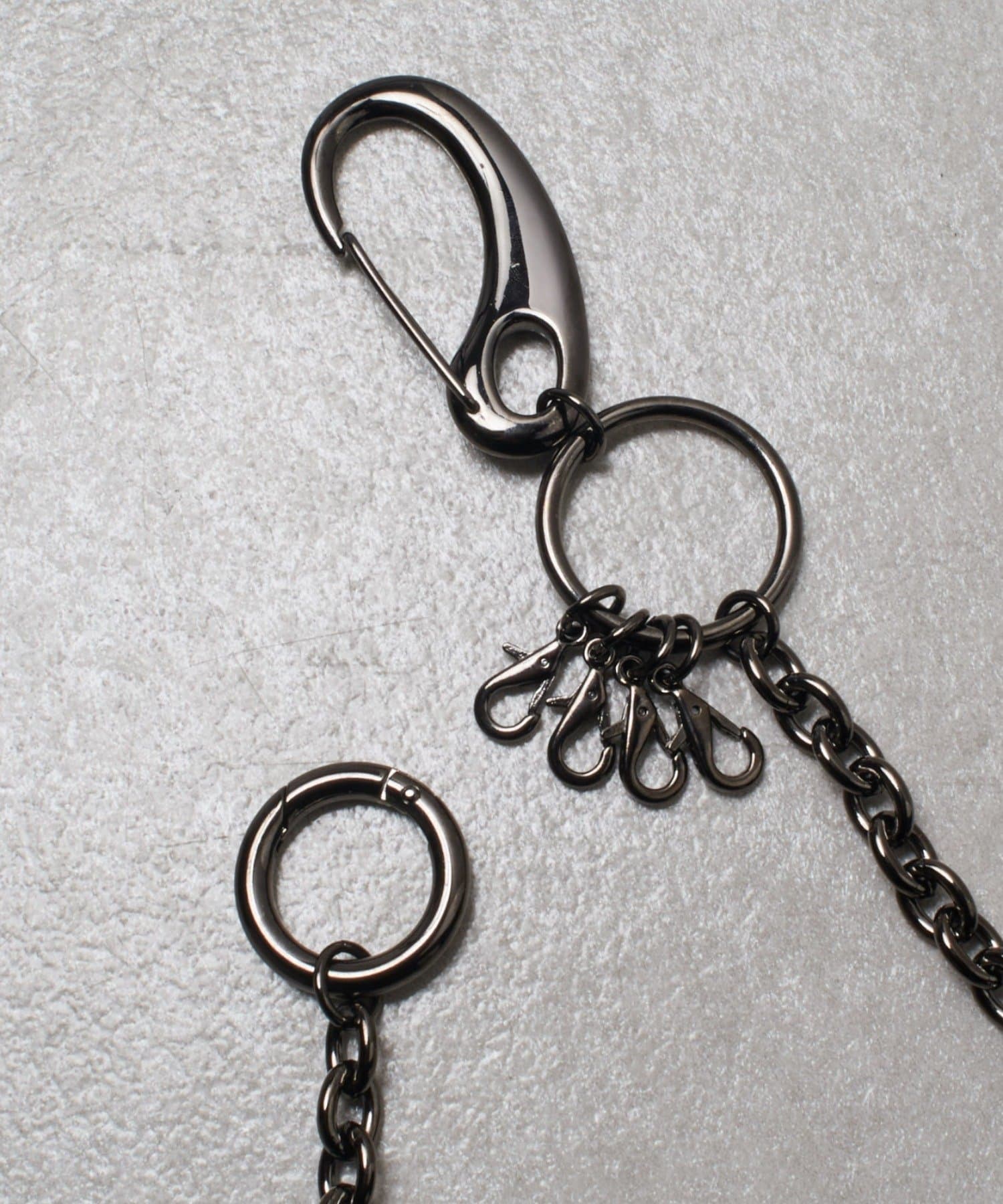 インパクトがありながらも、クリーンで上品な見た目がポイント。一つ一つのパーツを1から選び、組み合わせた、Ahでは初めてのウォレットチェーンです。フック部分は存在感のある楕円系のフックを採用。そこにつながった丸管には4つの小さいフックがついており、カギや、キーホルダー、チャームなどを取り付け可能。垂れ下がる様が船のアンカーのような大きめのチェーンを採用。今回はシルバーとブラックの2色展開。さりげないアクセントに使える拘りのアイテムです。