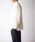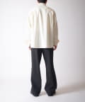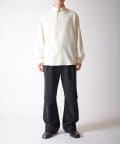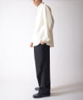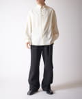 上品でクリーンな見た目のシャツなので、ワイドスラックスや、フレアパンツと組み合わせたキレイめなスタイルがオススメ。