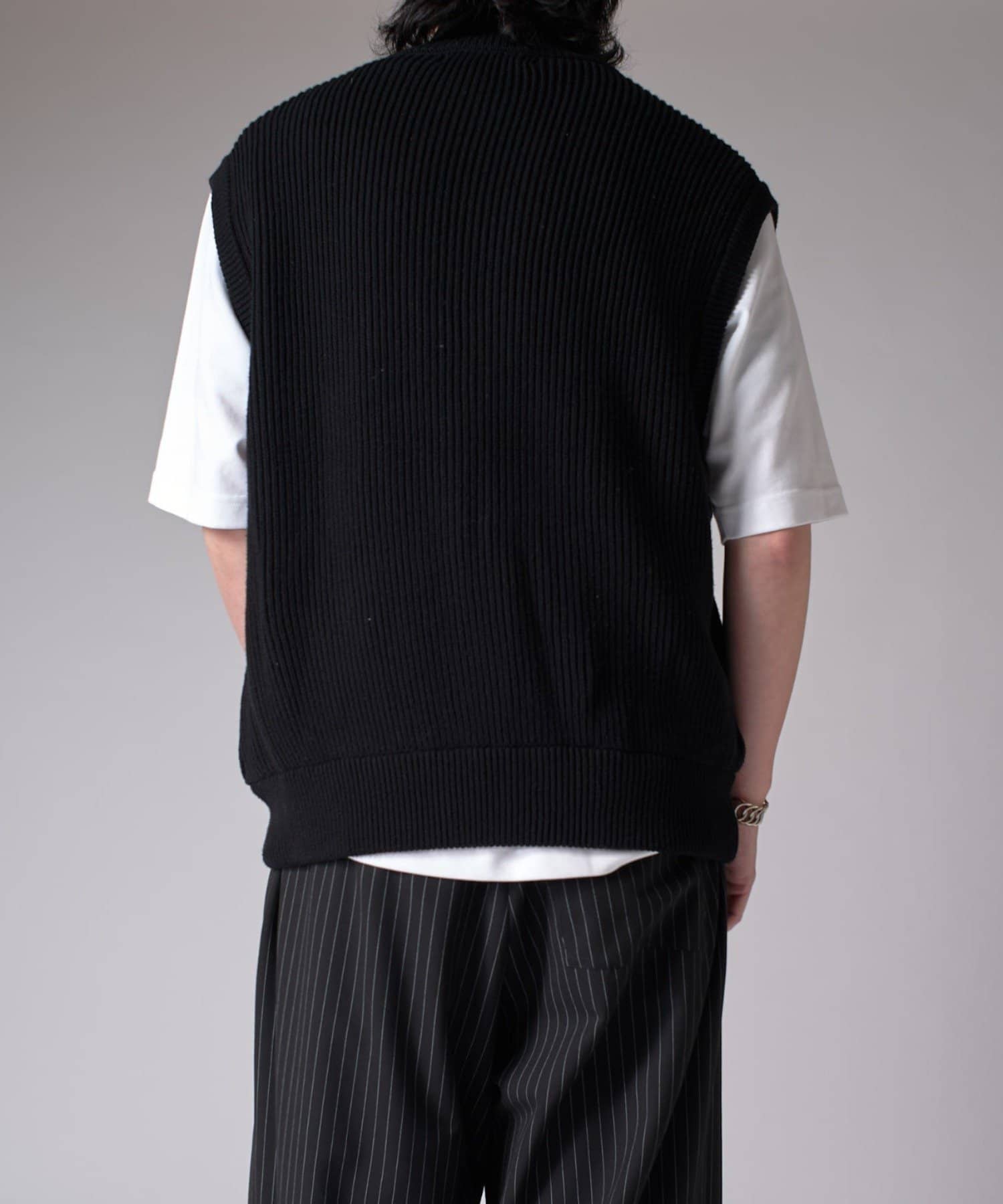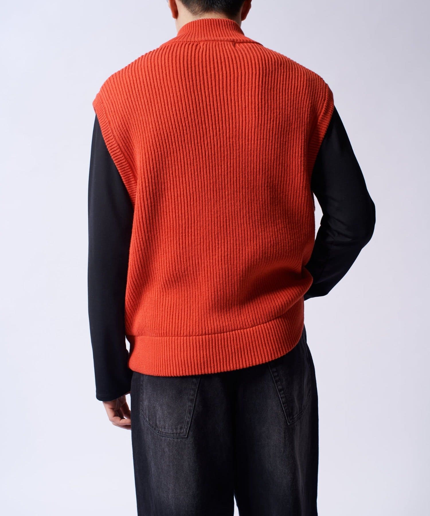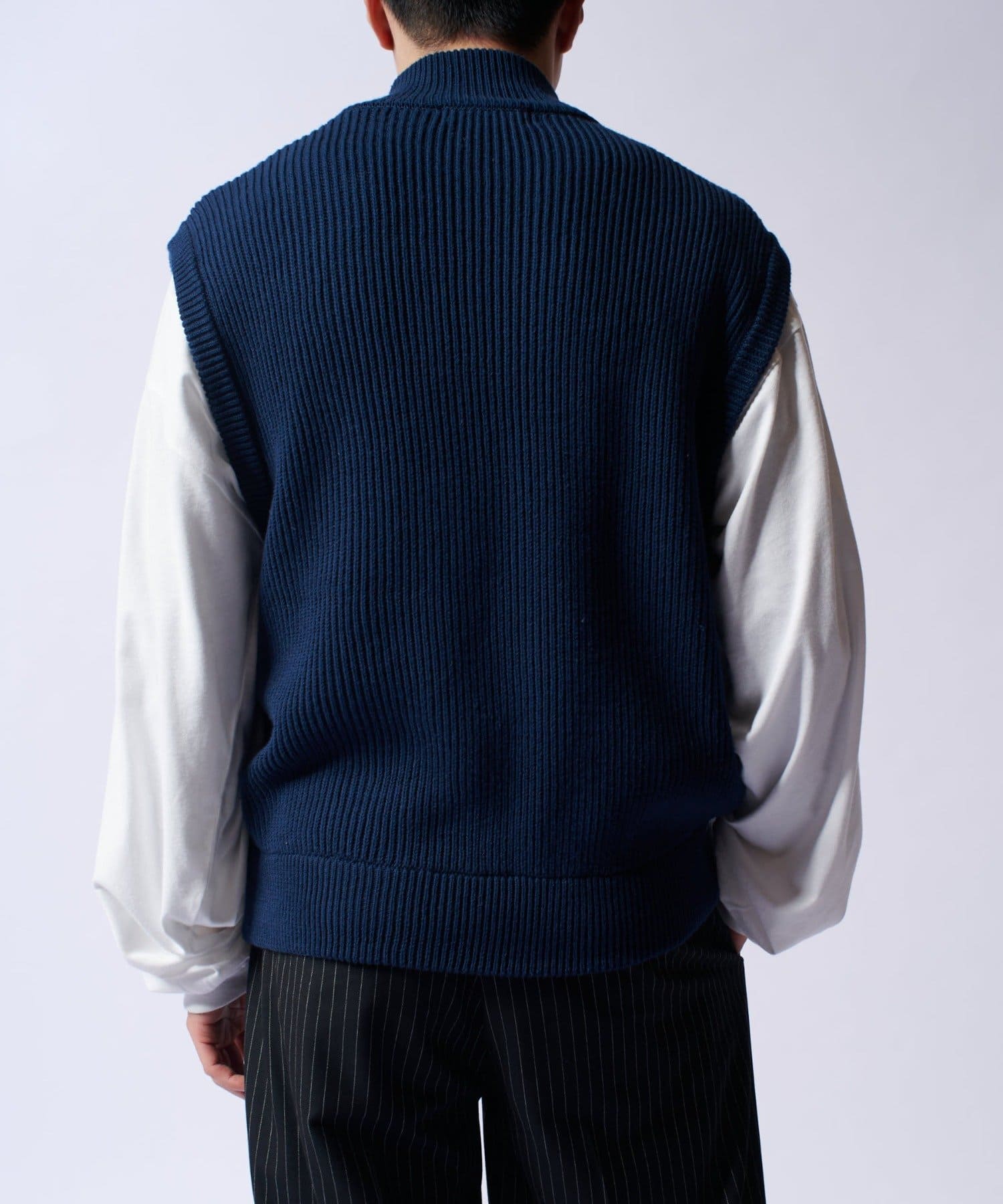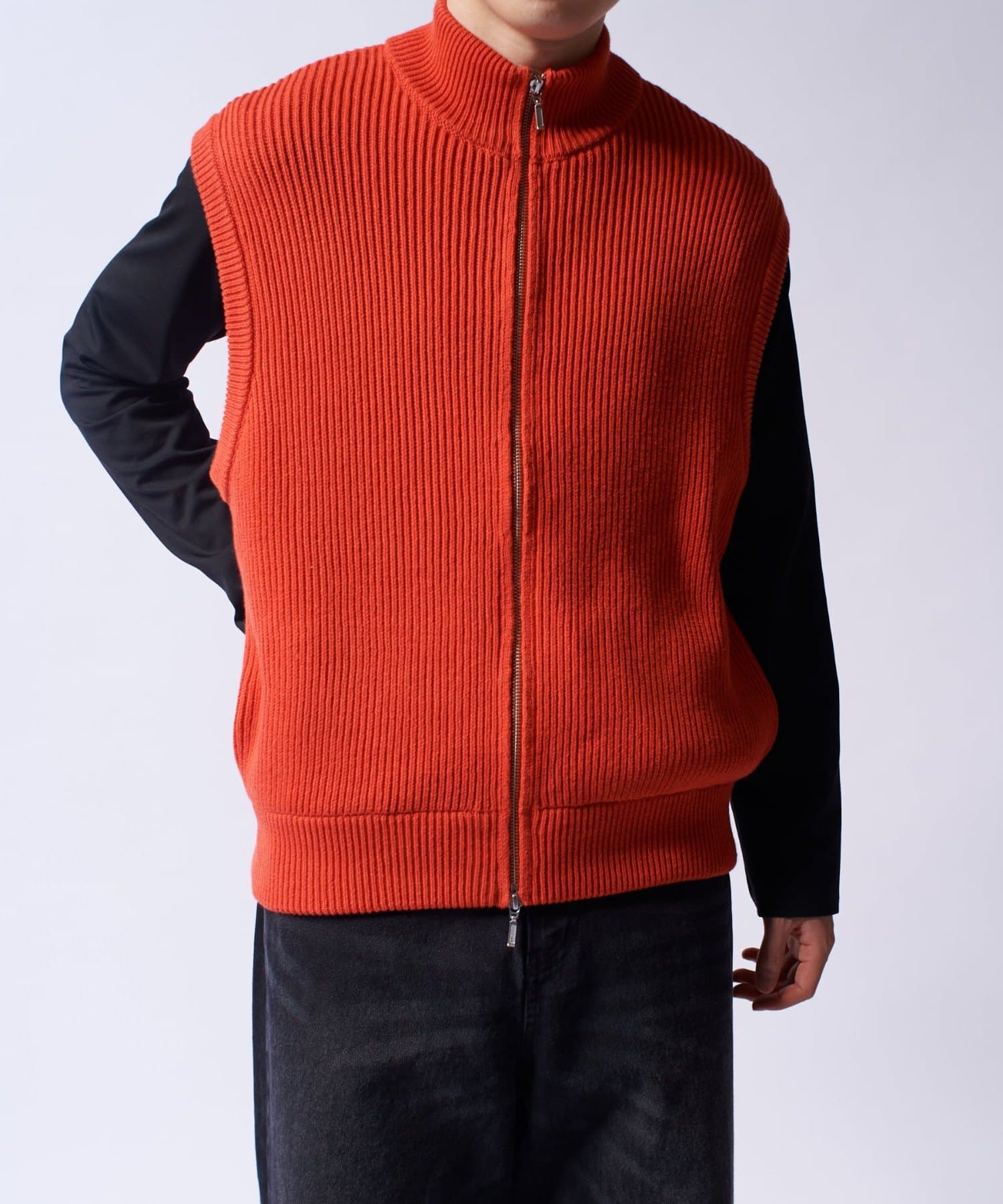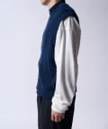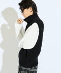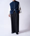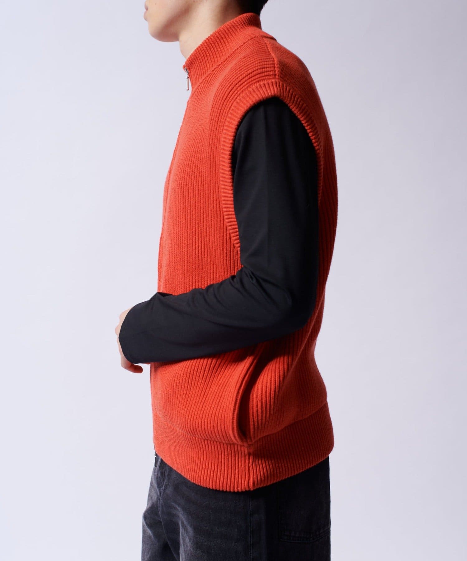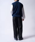 レイヤードしやすいニットベストなので、Tシャツやスウェットの上から、逆にアウターのインナーして頂くことも可能。