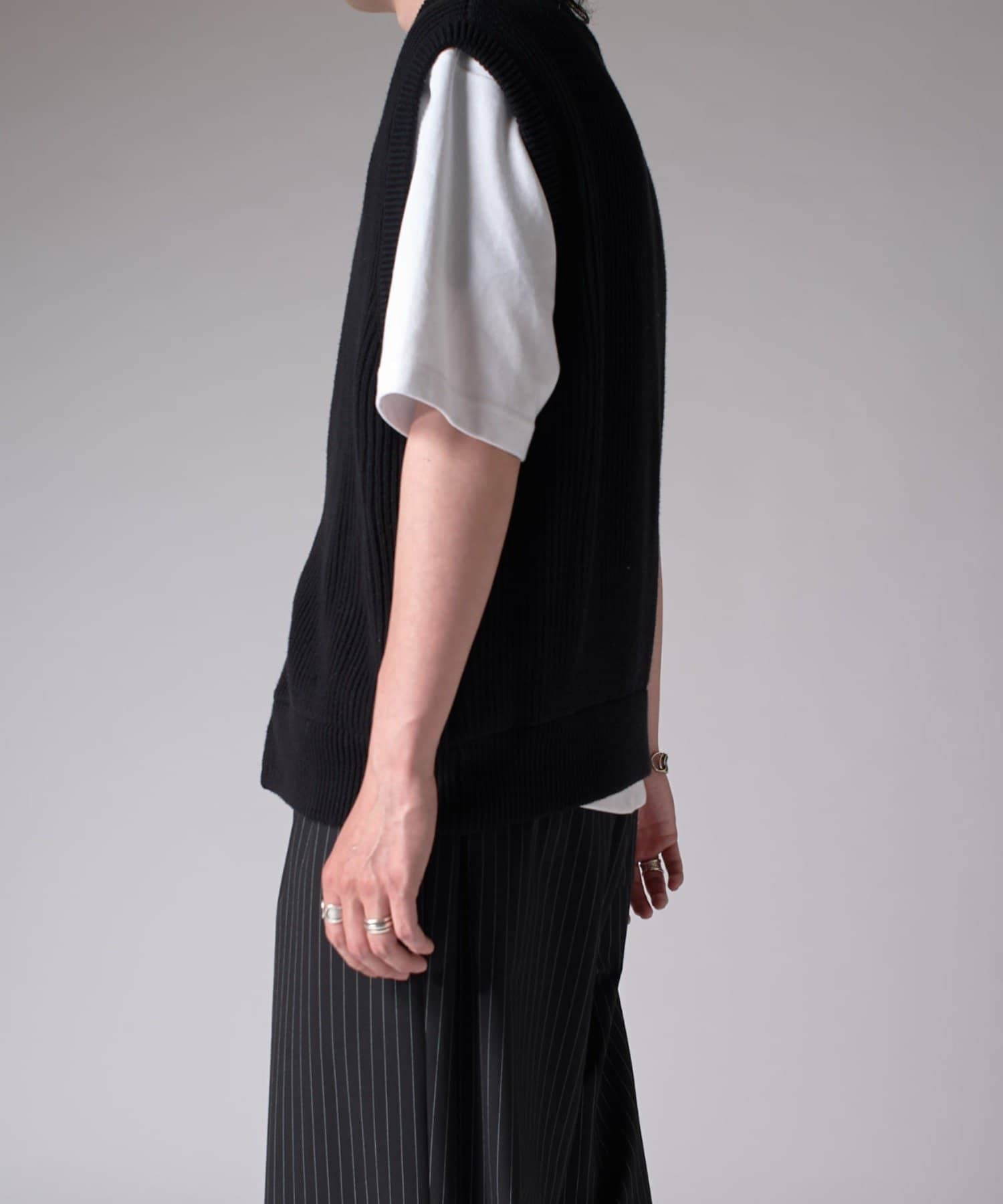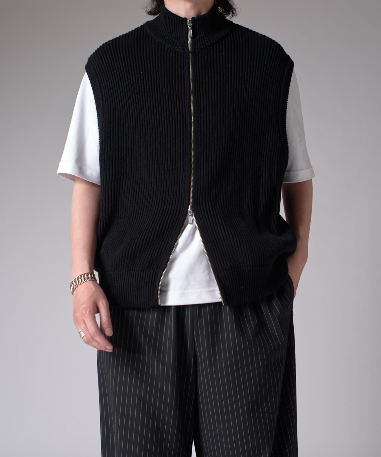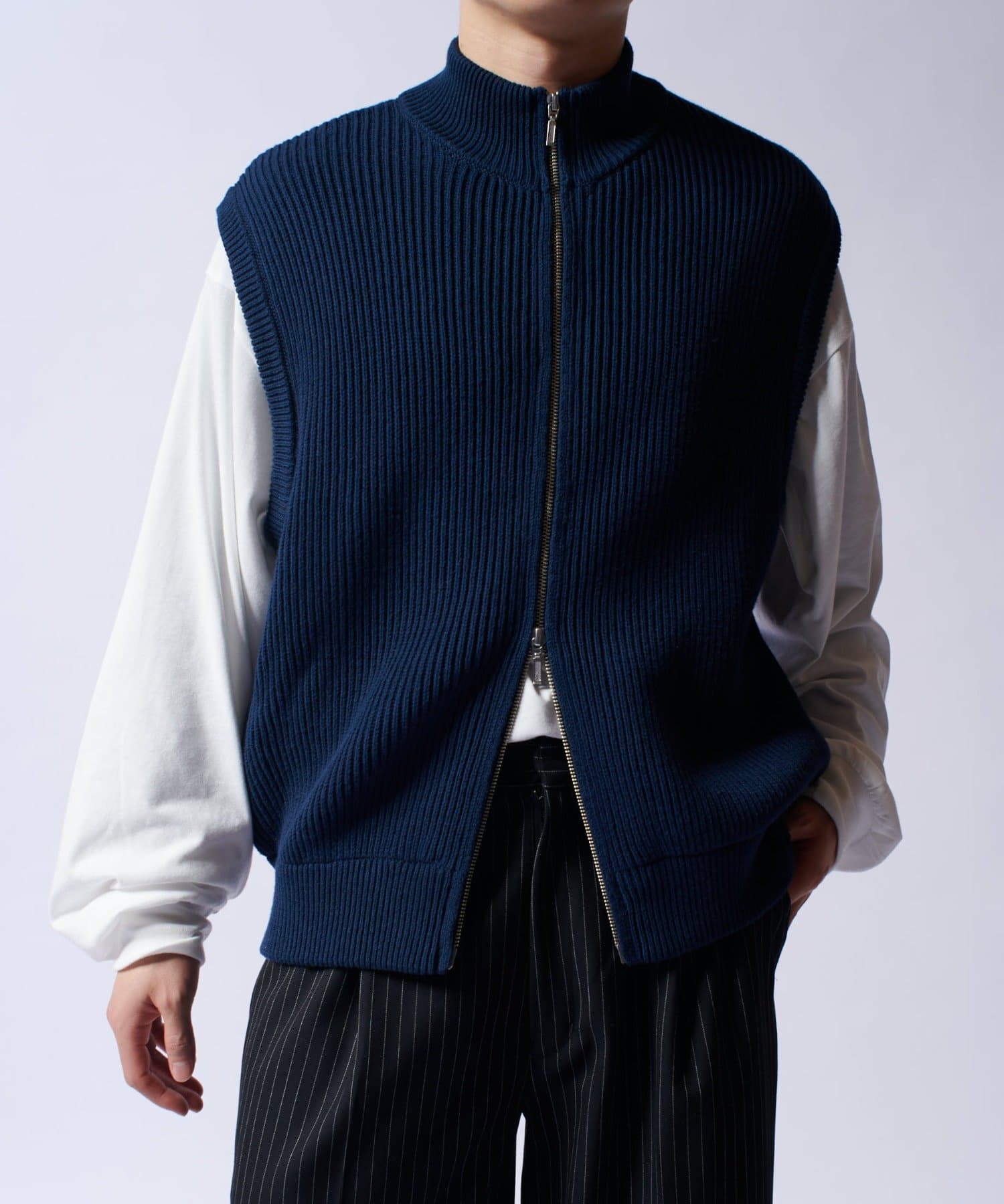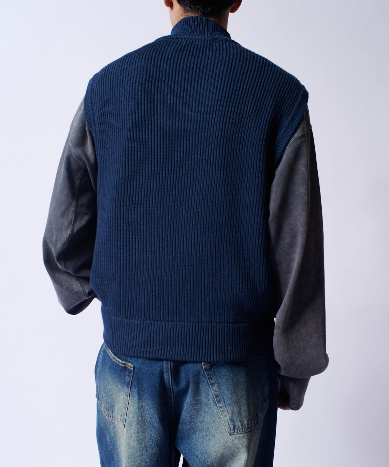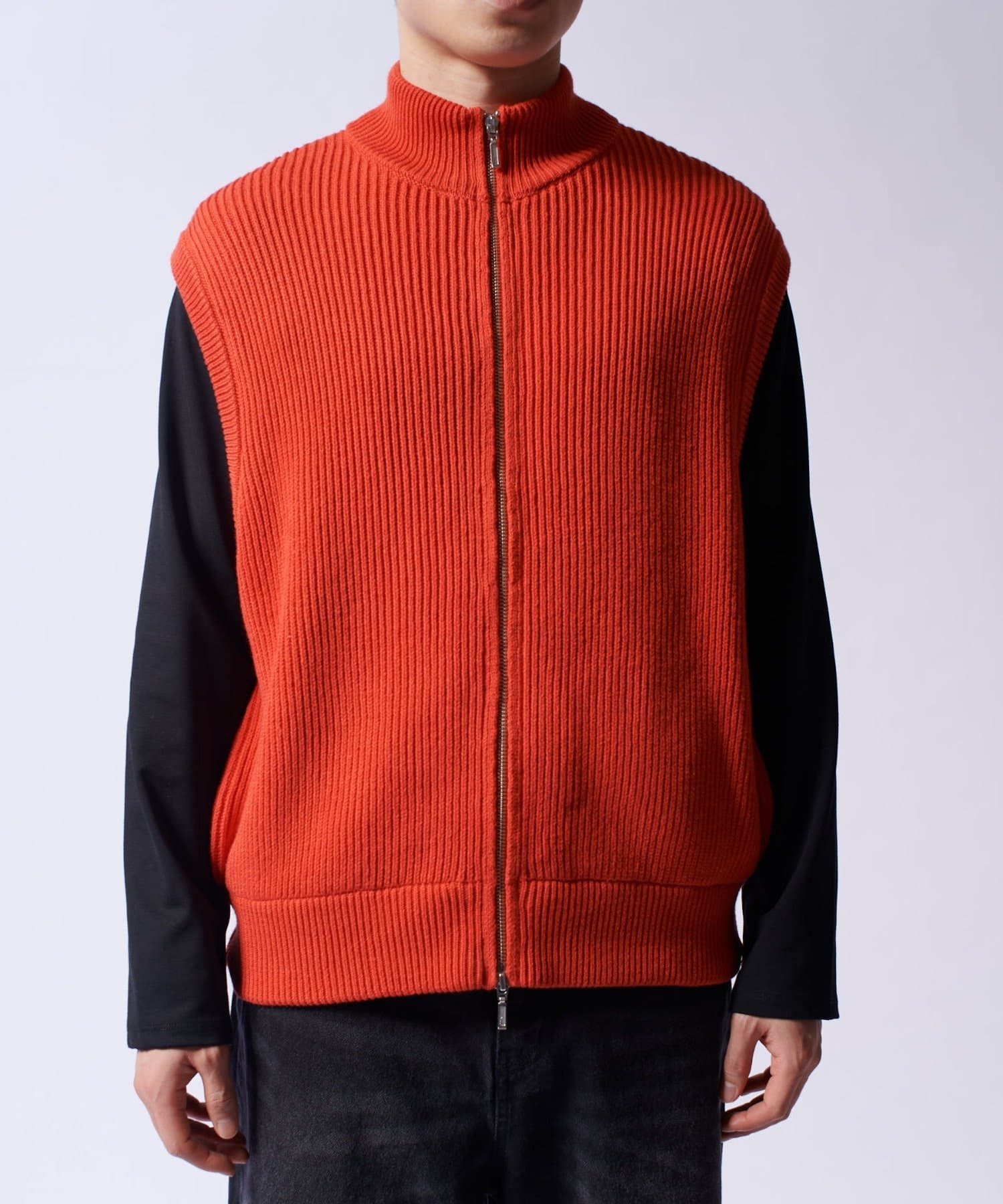 レイヤードしやすいニットベストなので、Tシャツやスウェットの上から、逆にアウターのインナーして頂くことも可能。