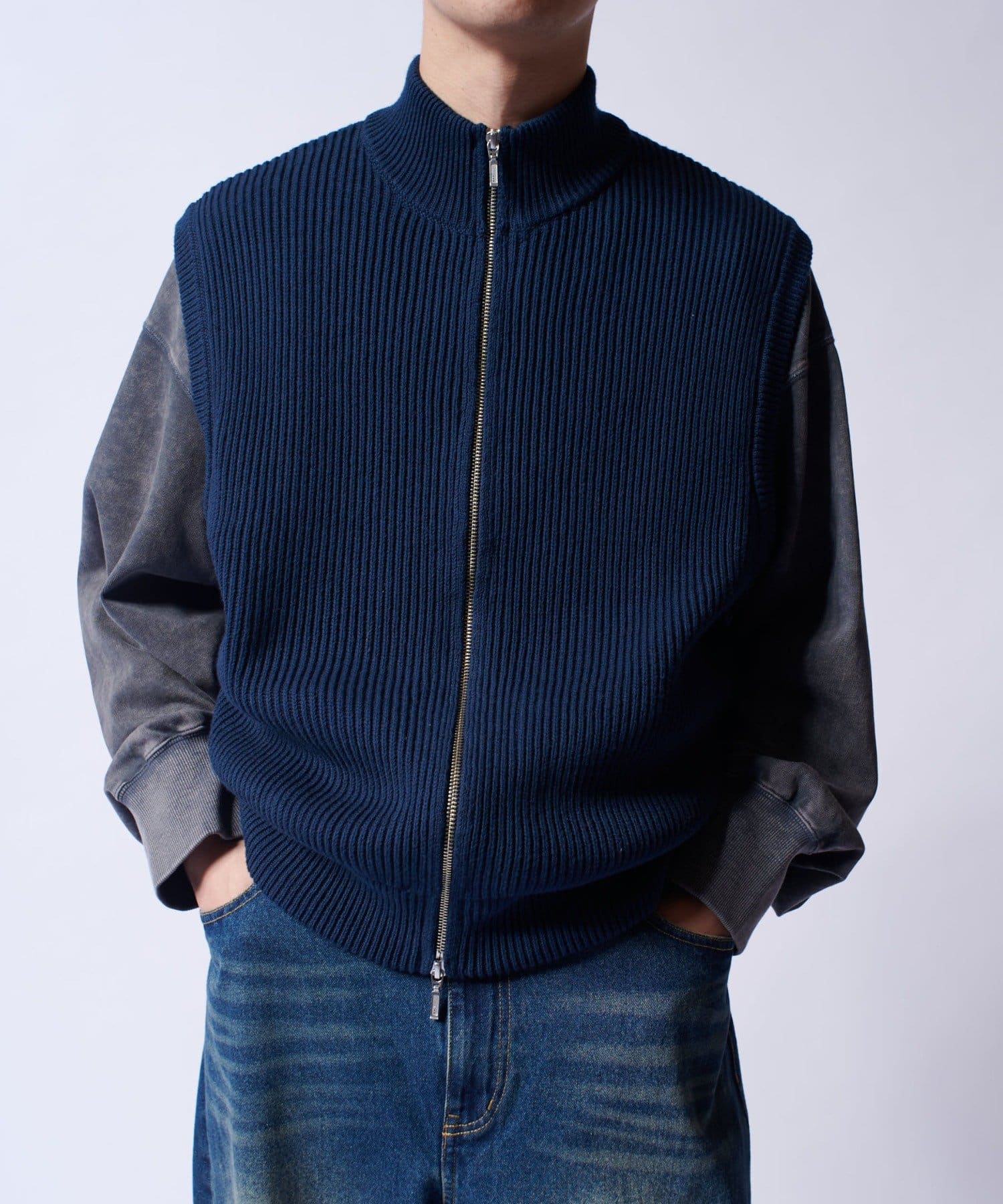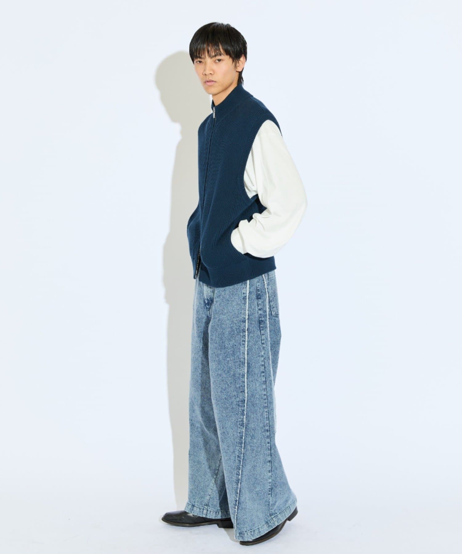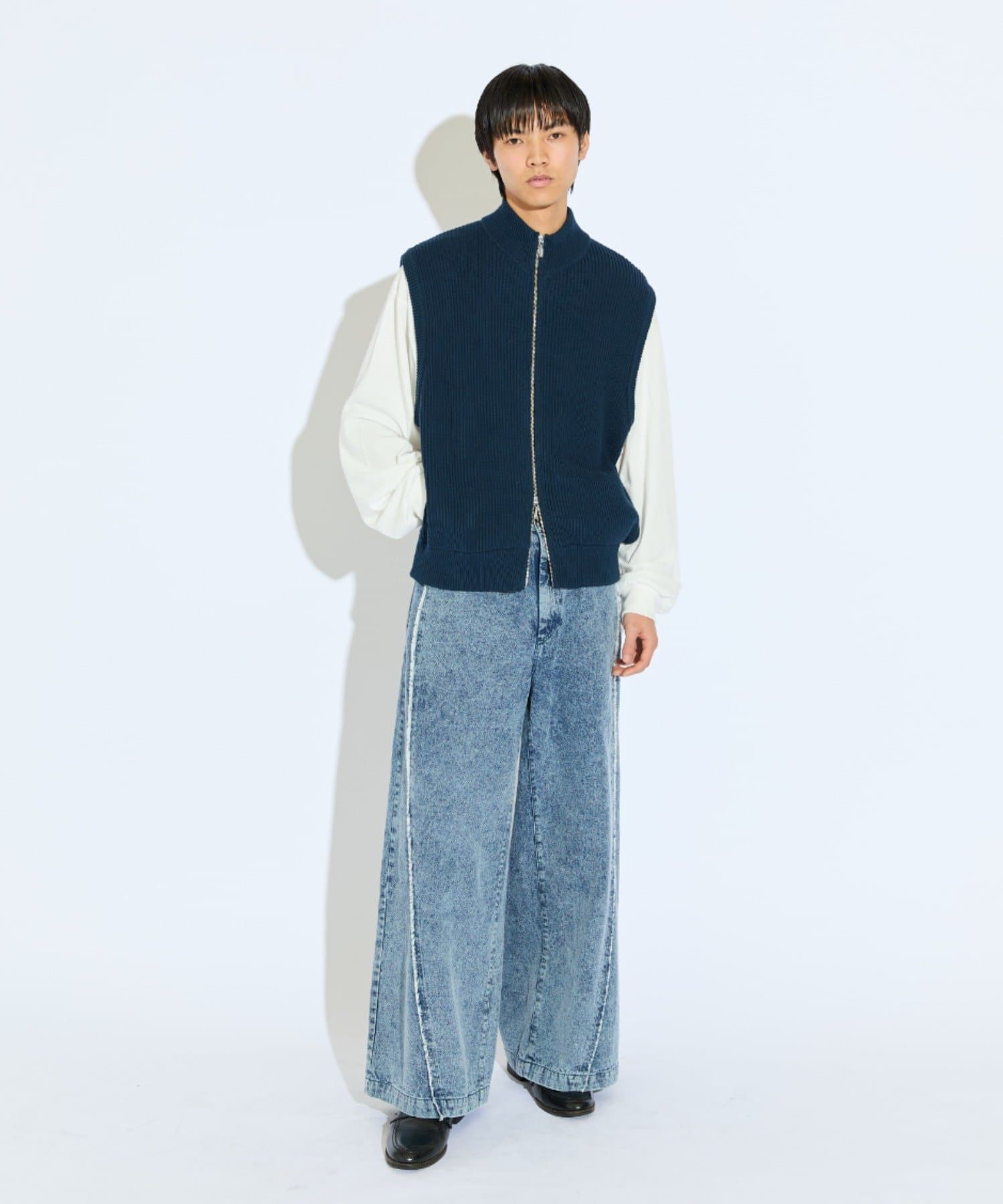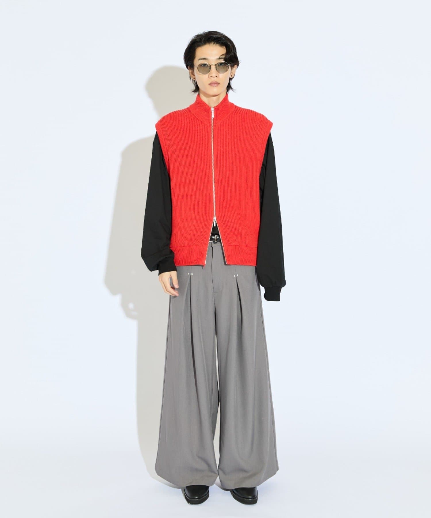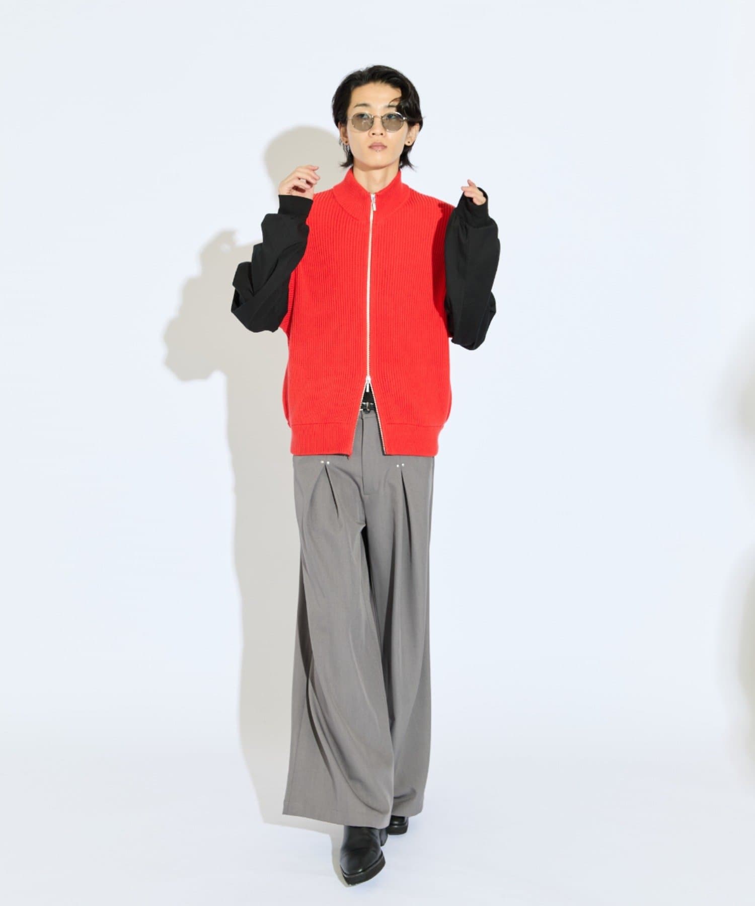 レイヤードしやすいニットベストなので、Tシャツやスウェットの上から、逆にアウターのインナーして頂くことも可能。