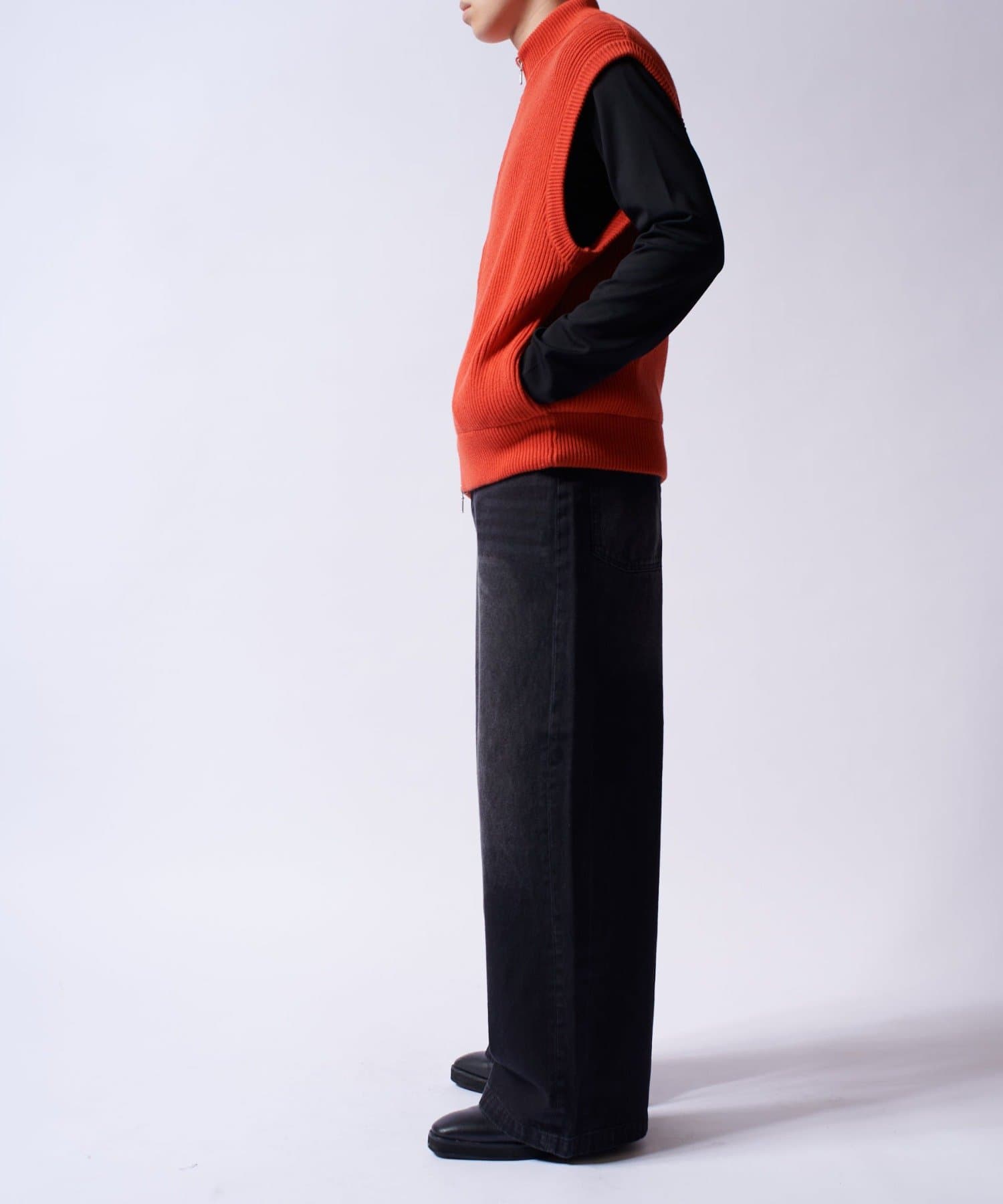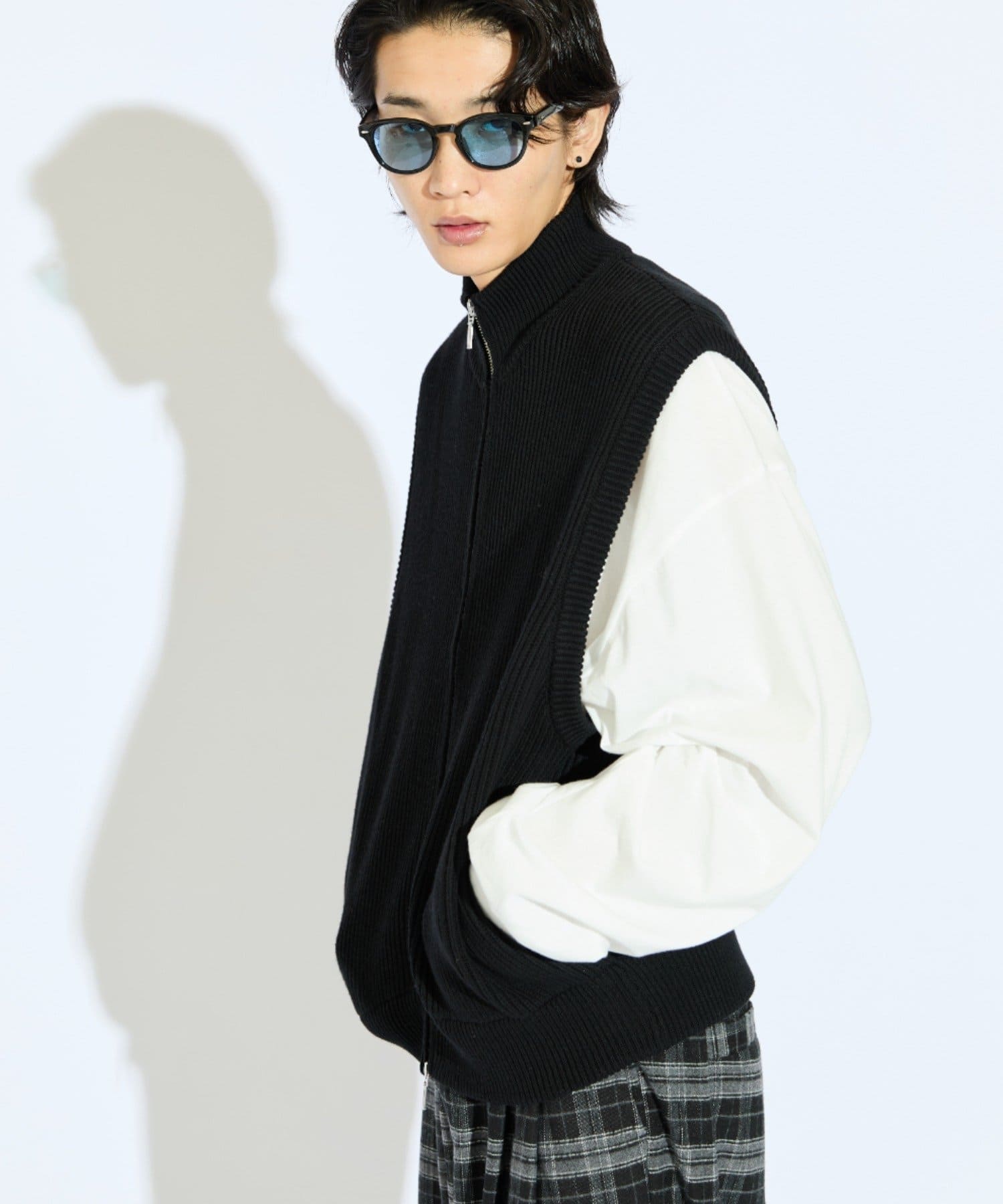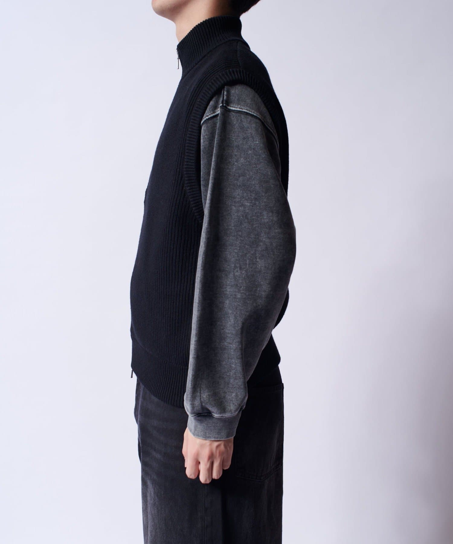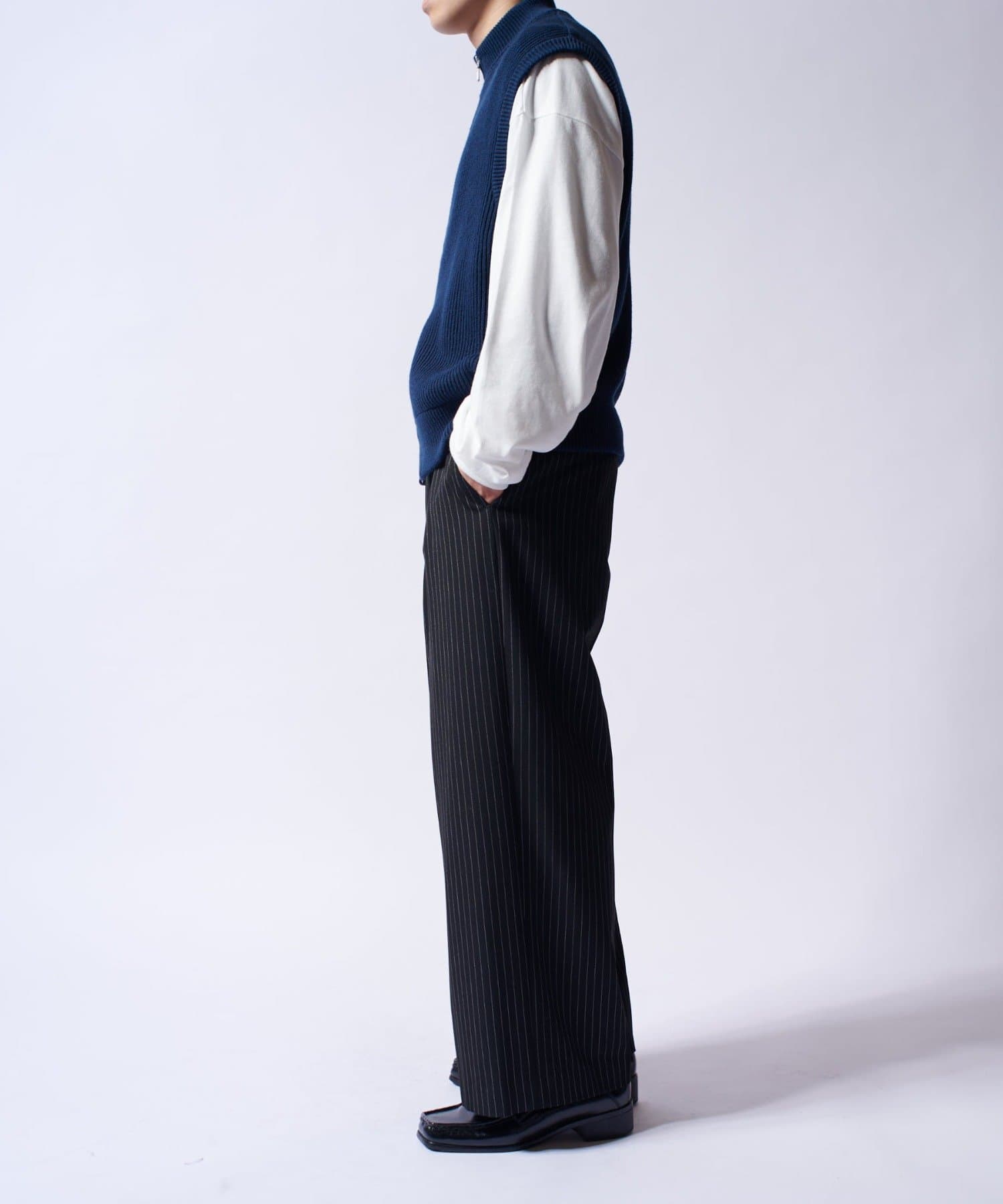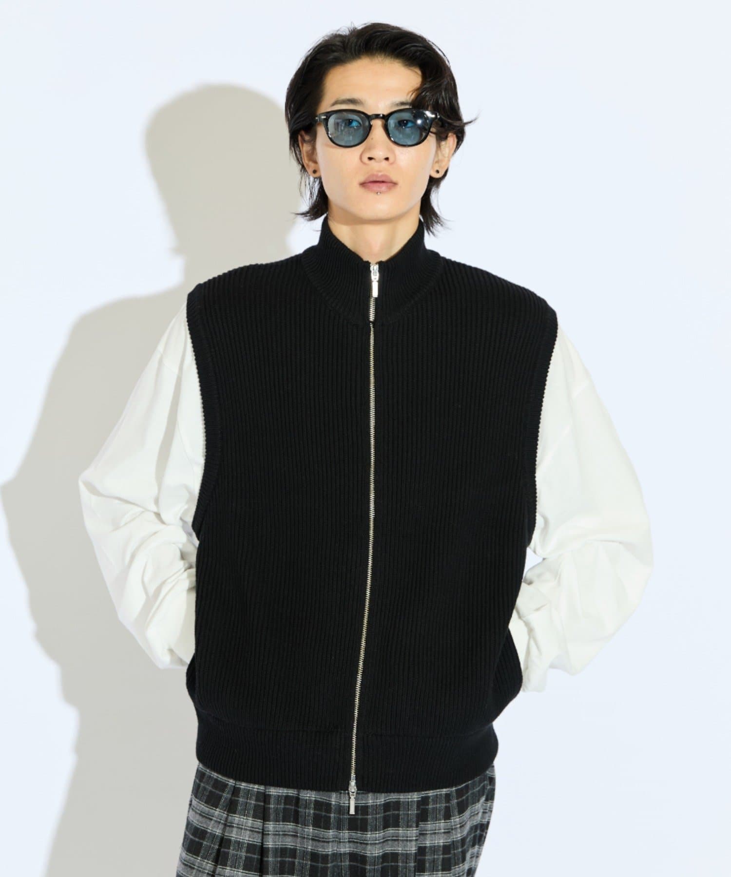レイヤードしやすいニットベストなので、Tシャツやスウェットの上から、逆にアウターのインナーして頂くことも可能。