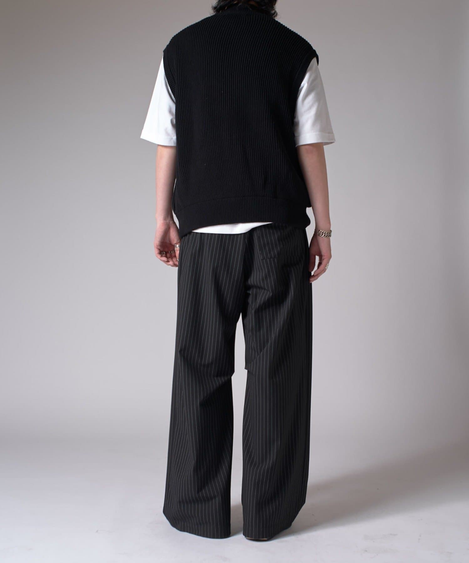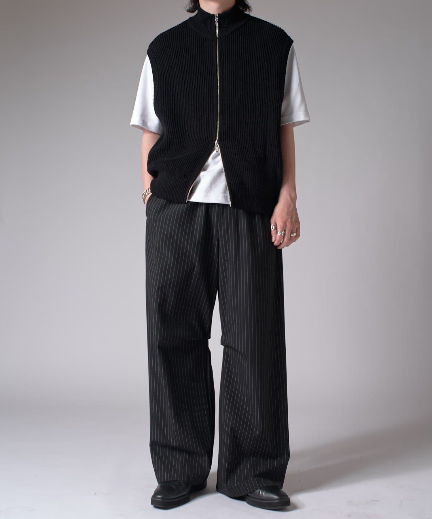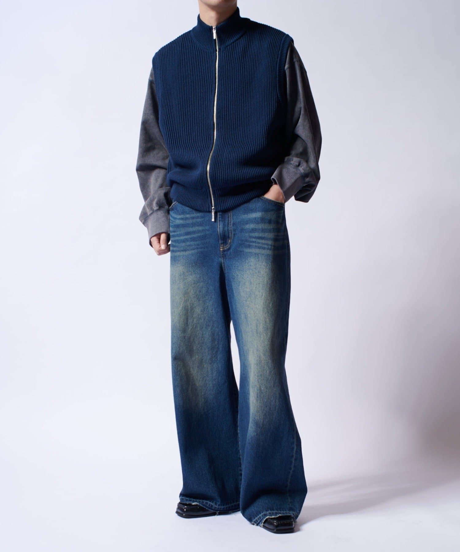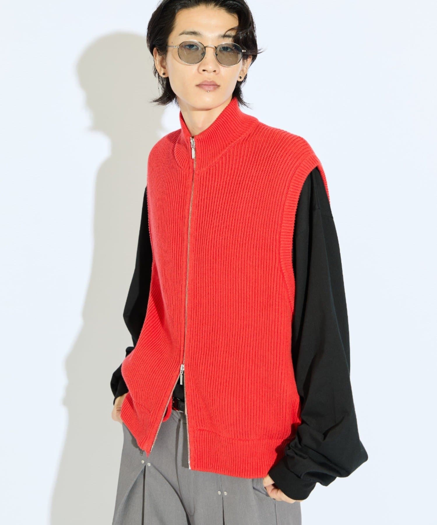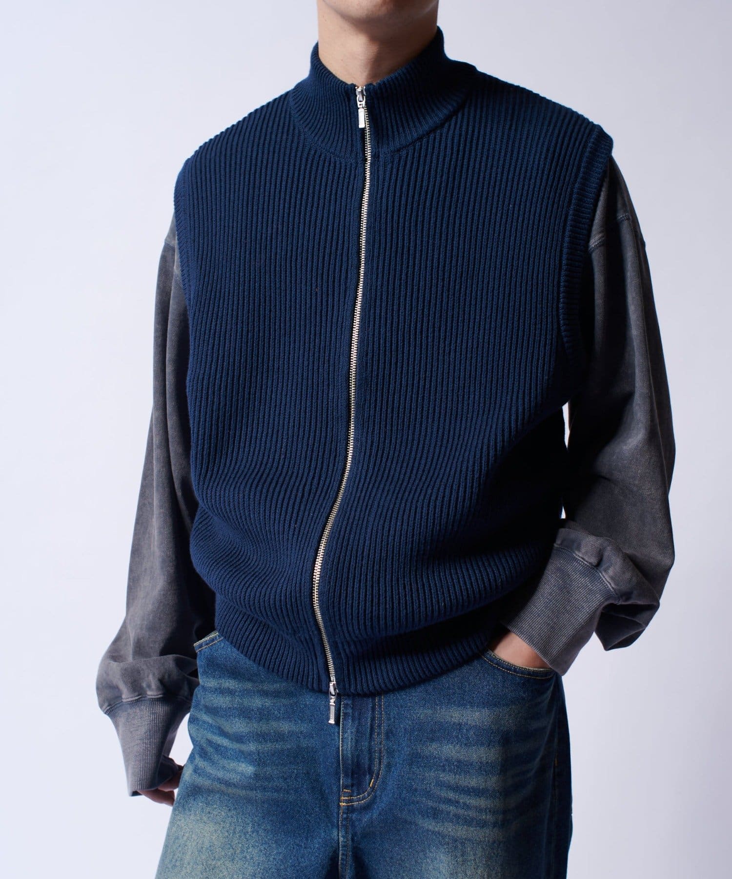 レイヤードしやすいニットベストなので、Tシャツやスウェットの上から、逆にアウターのインナーして頂くことも可能。