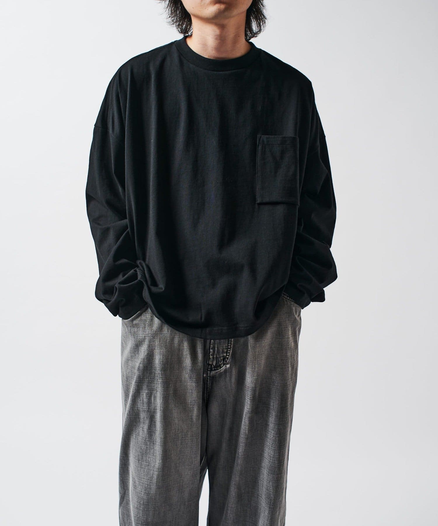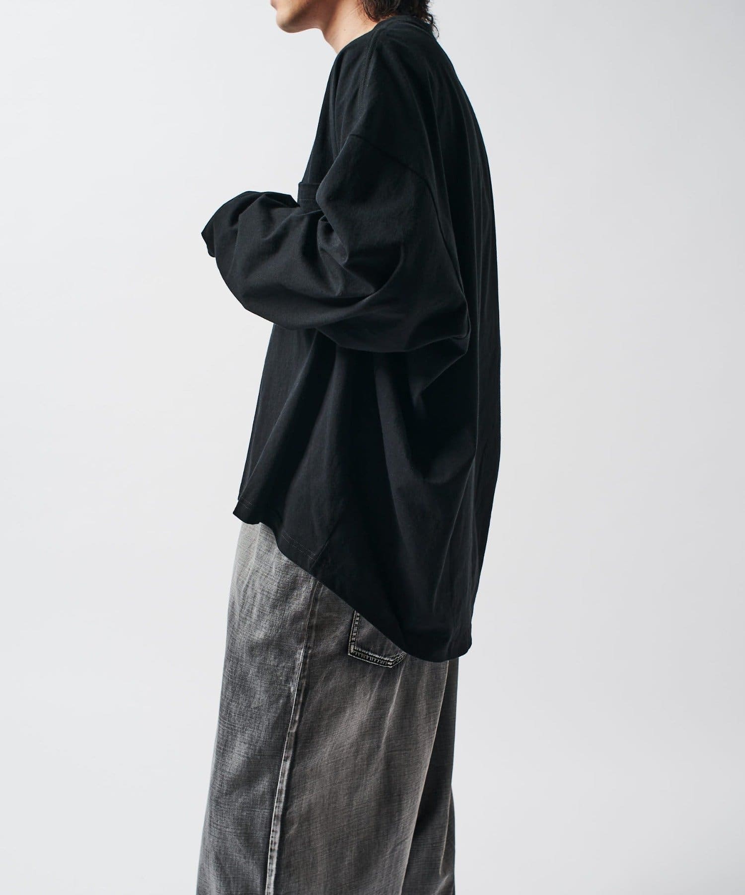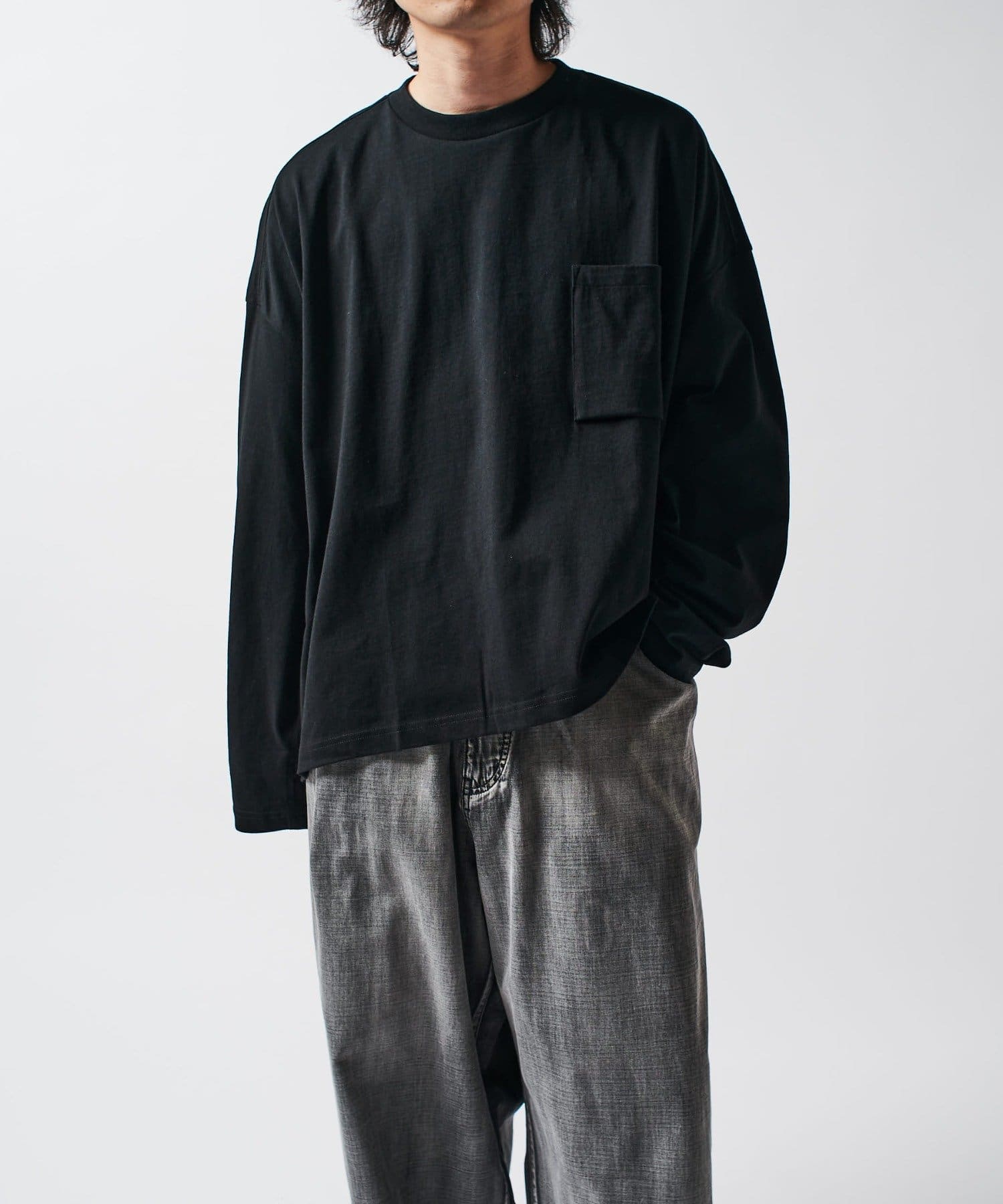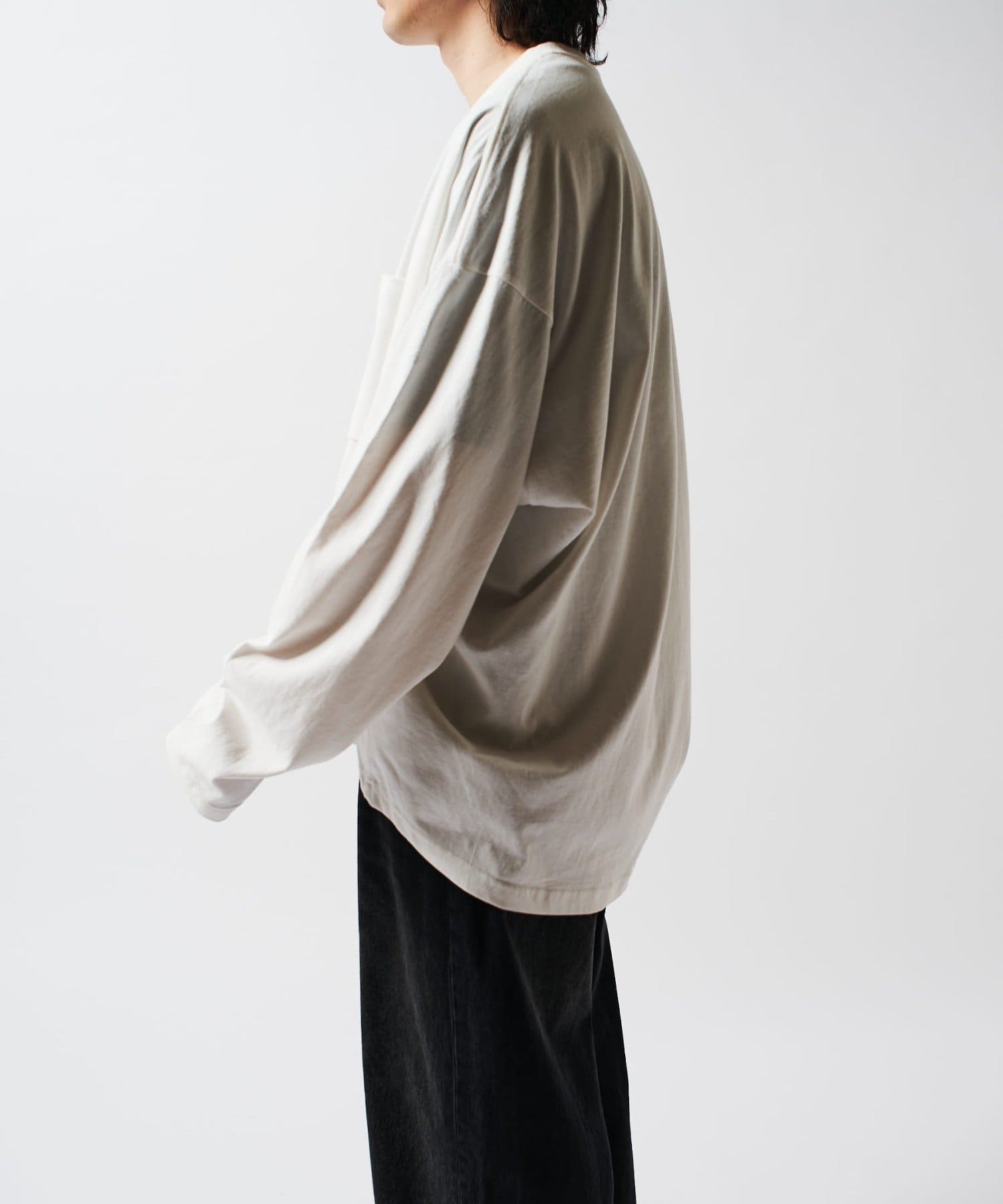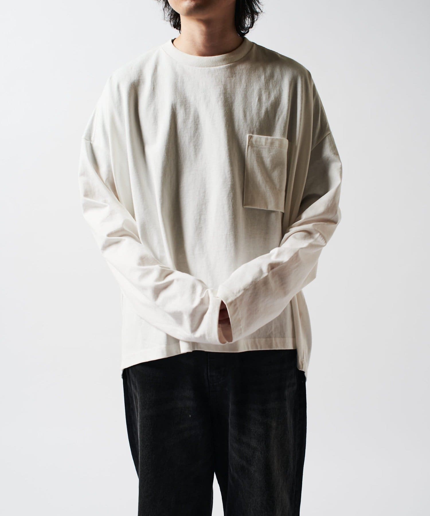 着用したときのシルエットはどことなく上品でモードな空気感を演出してくれます。 四角でミニマルなポケットは折り返しのマチ付きで機能性を向上し、袖には簡単なスリットのサムホールを装備しています。