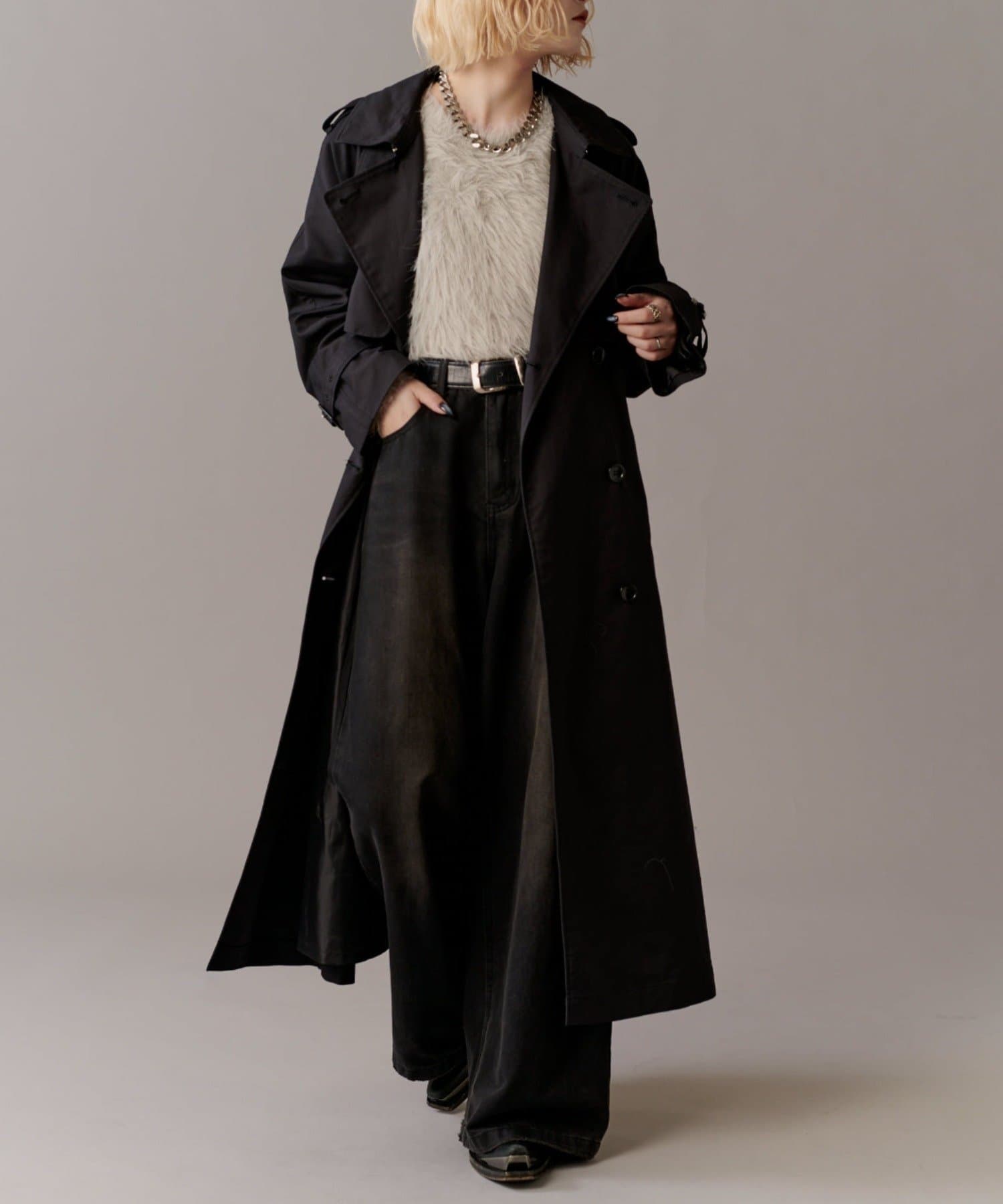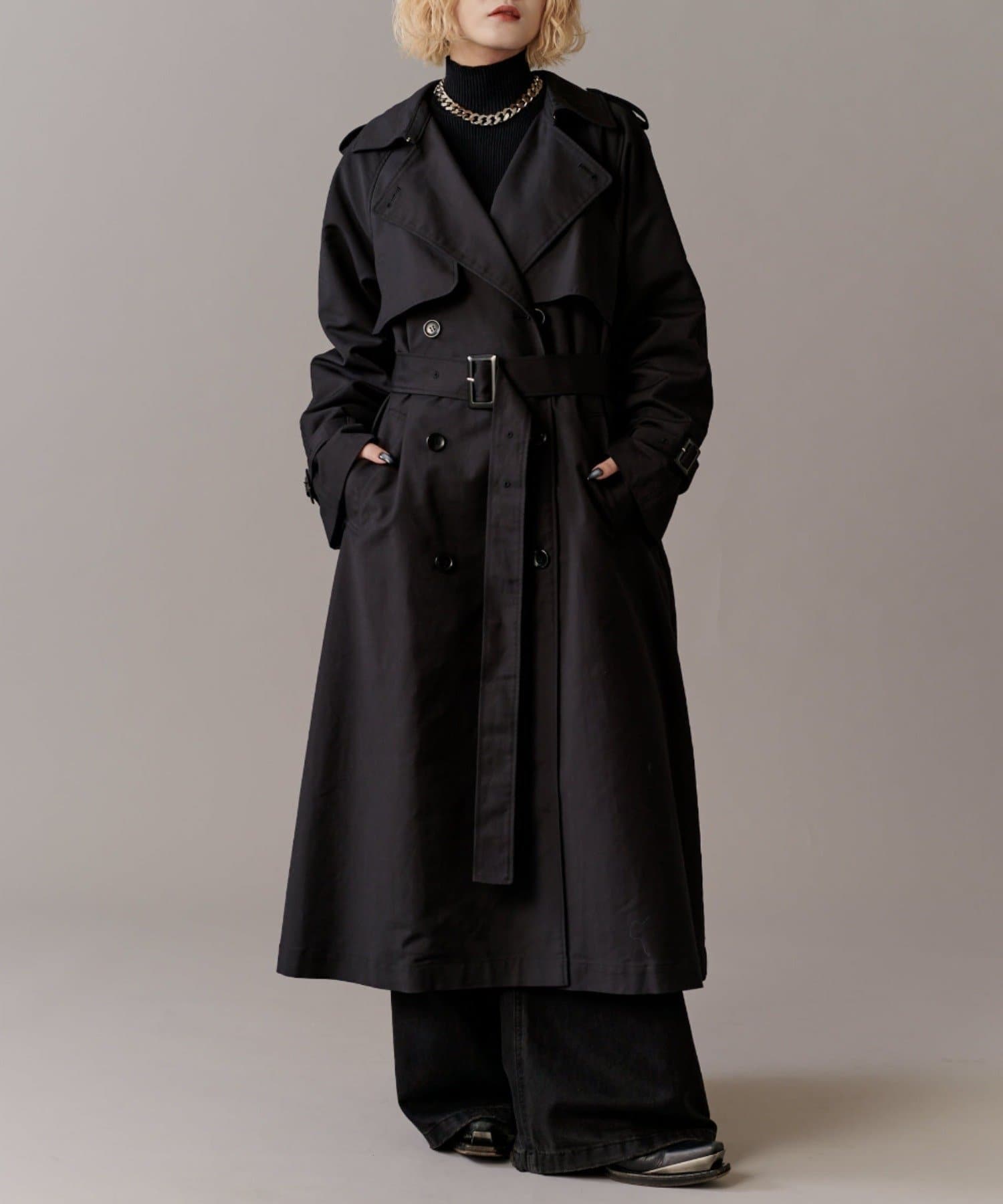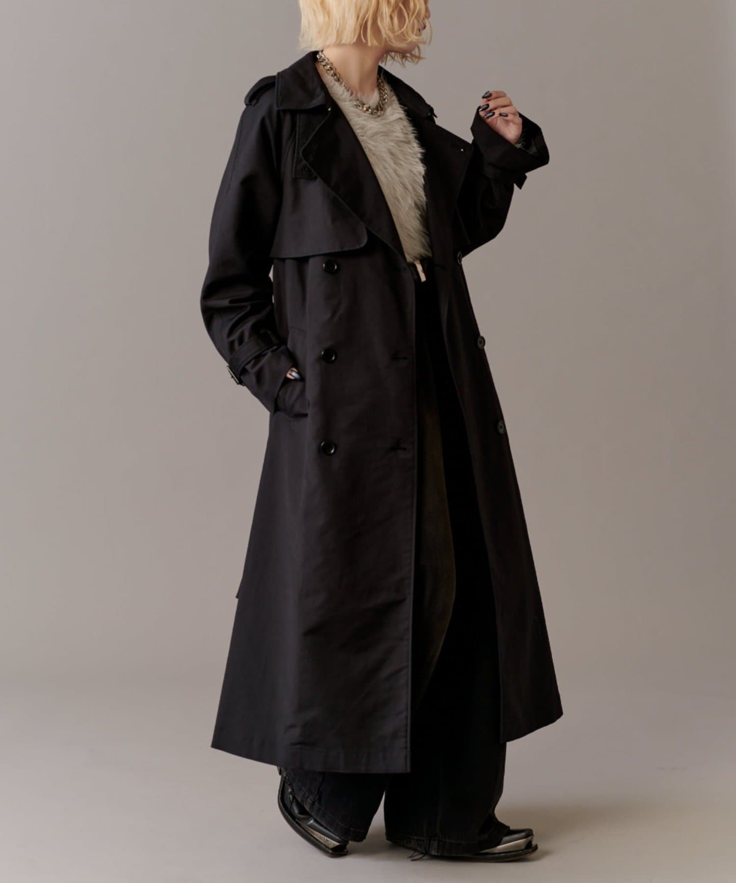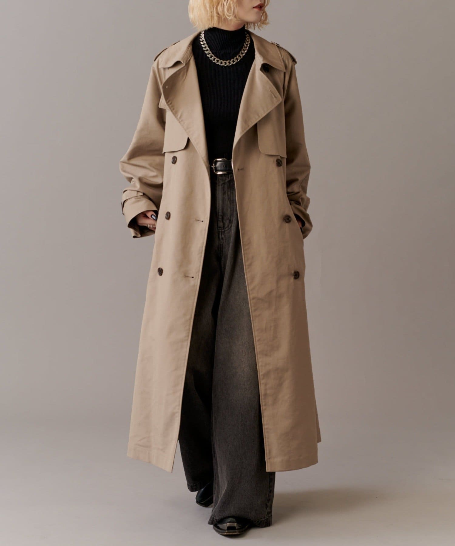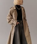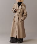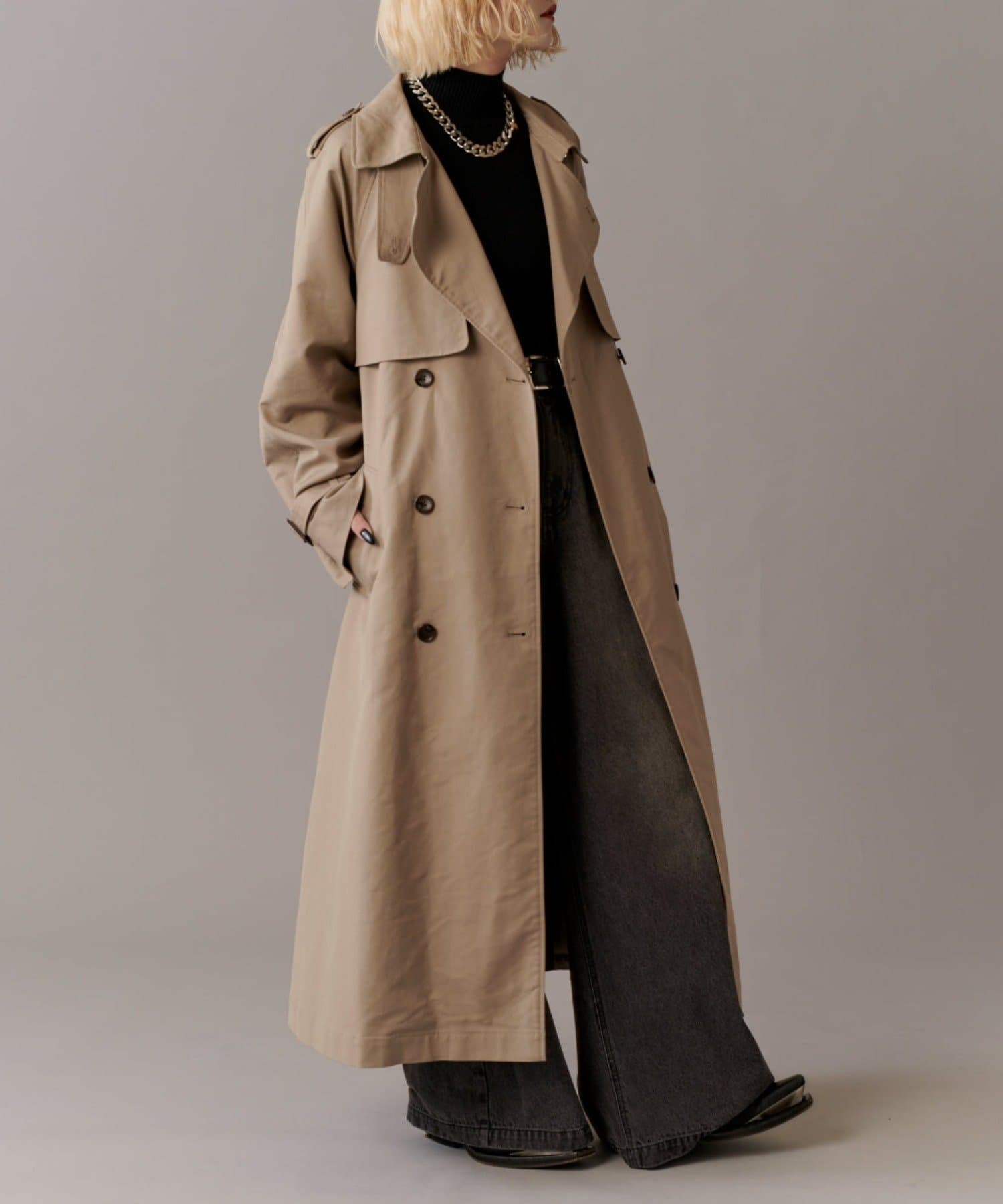 高級感あふれる素材と、圧倒的な存在感のあるロングトレンチコート