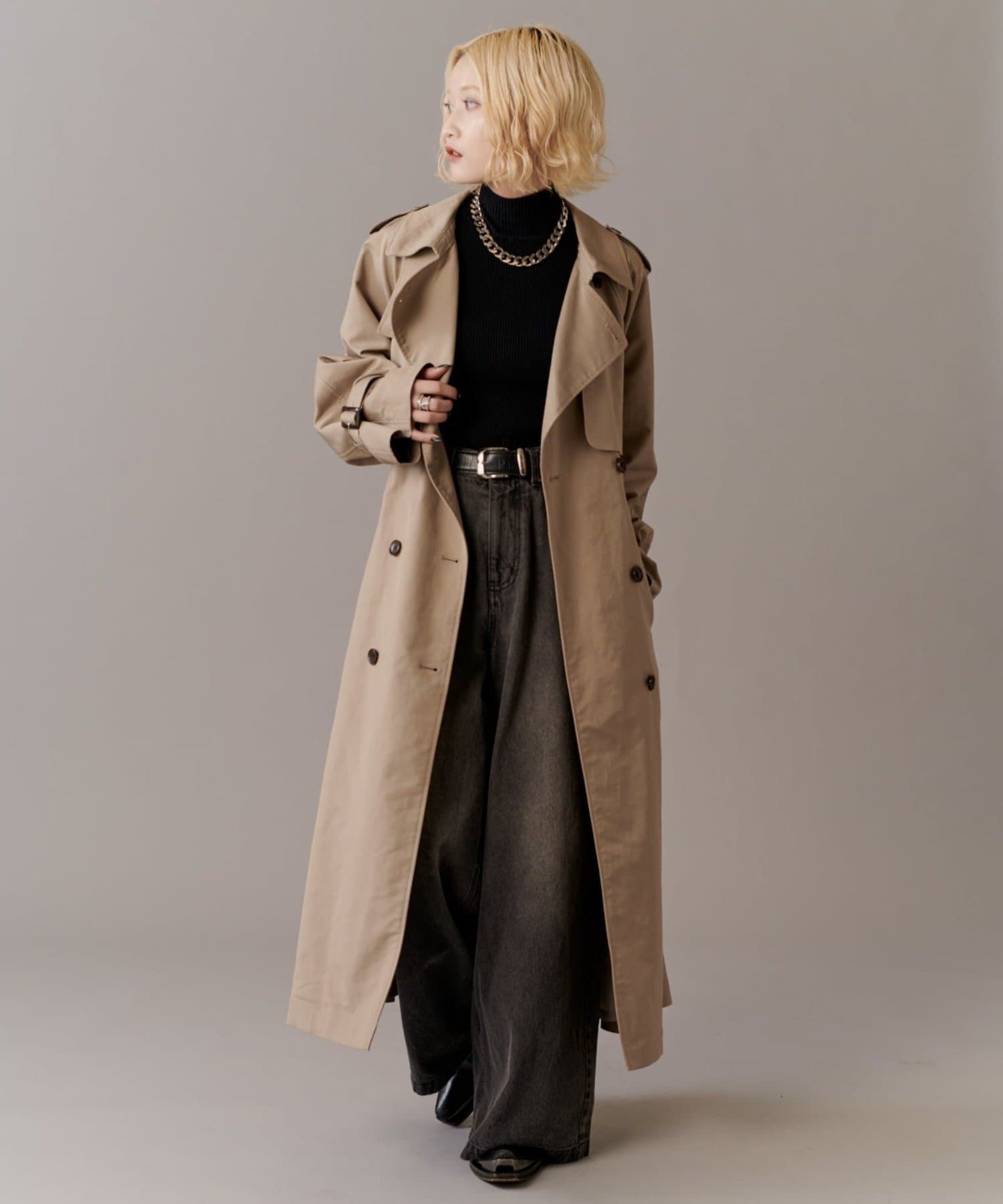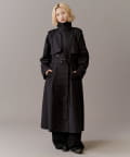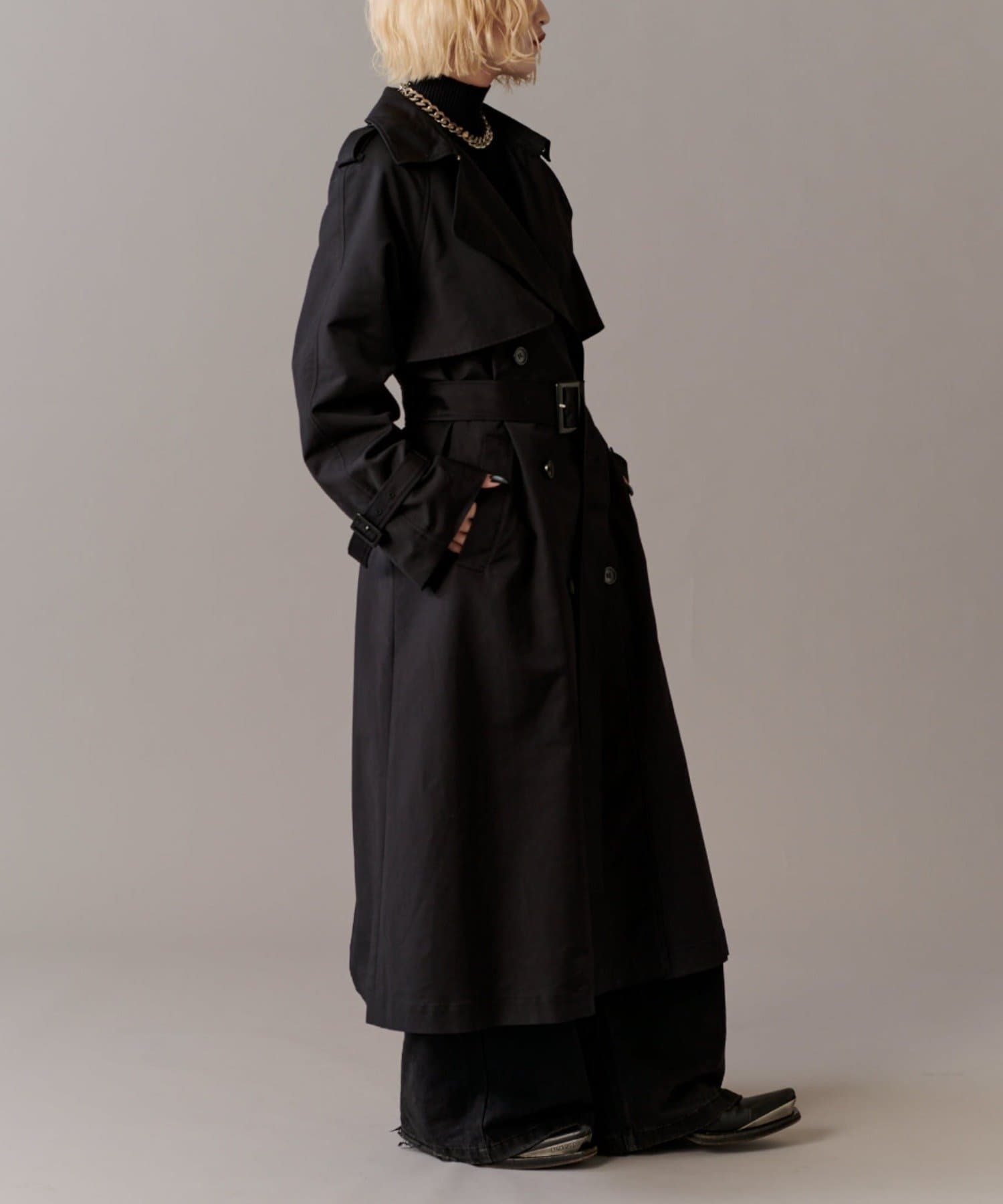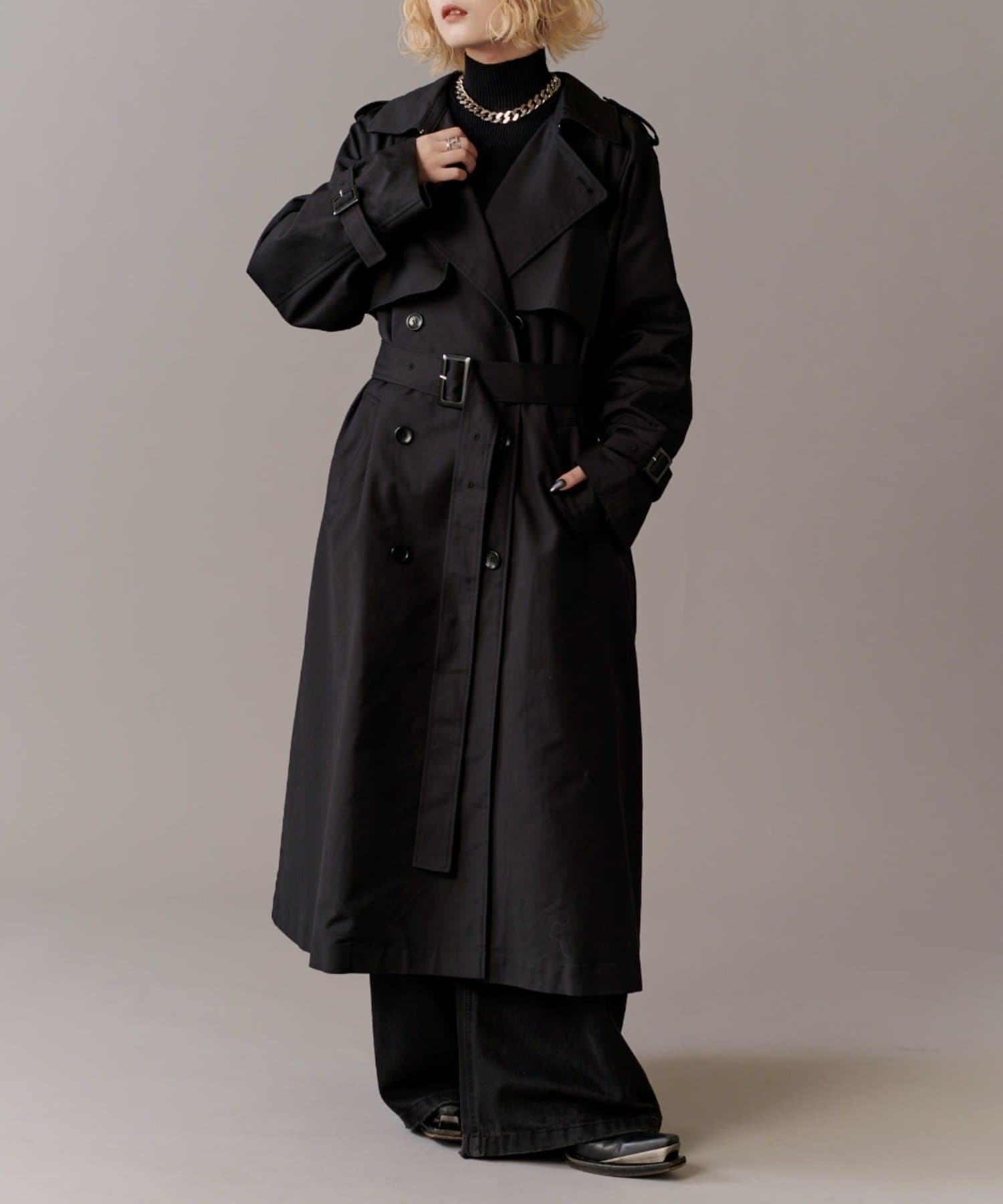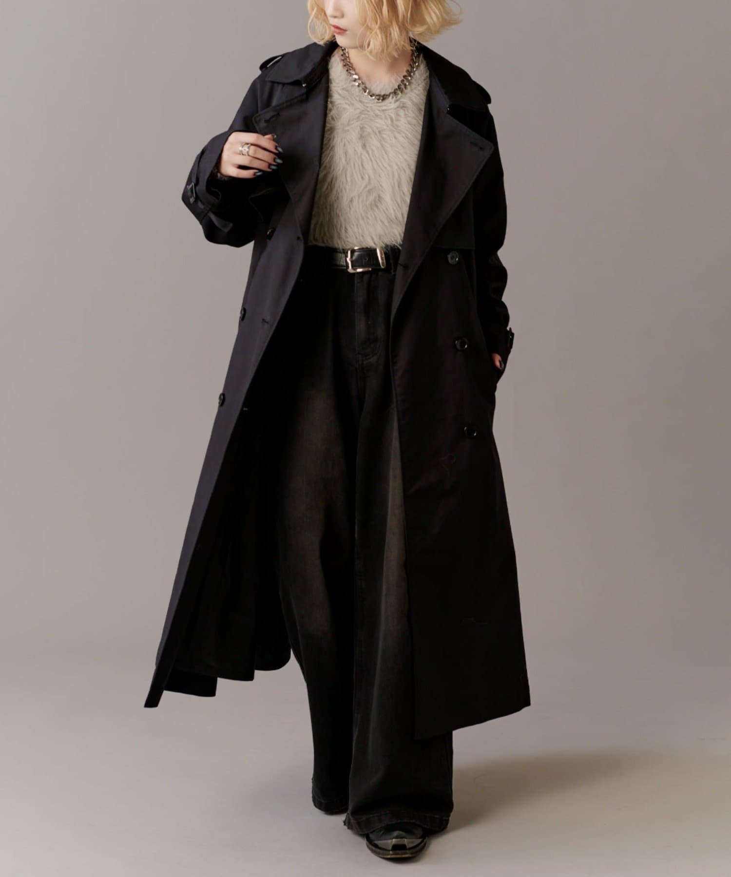 高級感あふれる素材と、圧倒的な存在感のあるロングトレンチコート