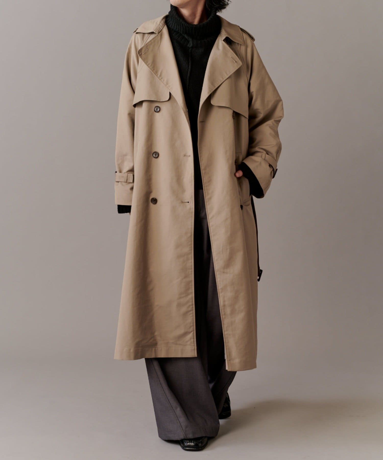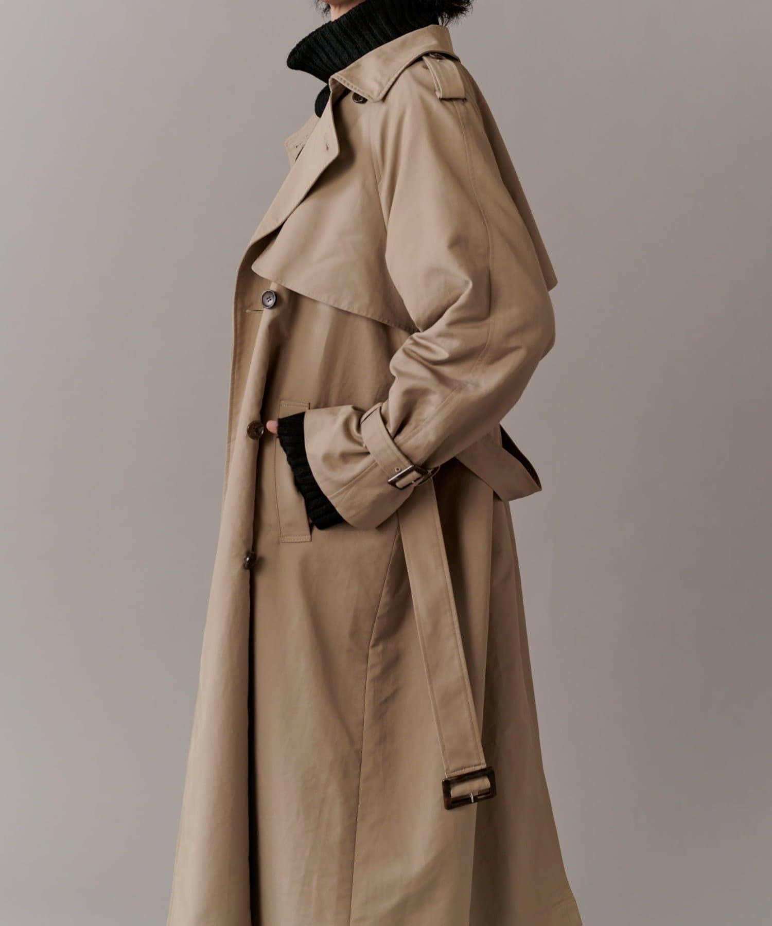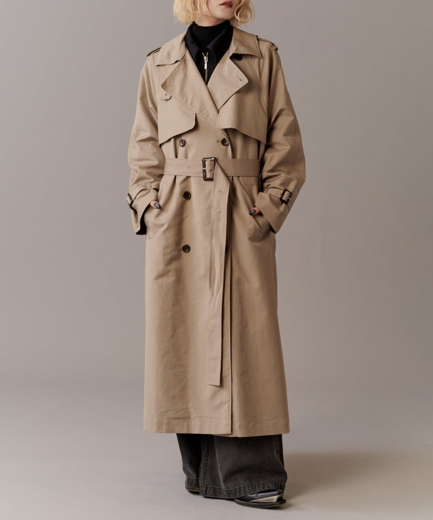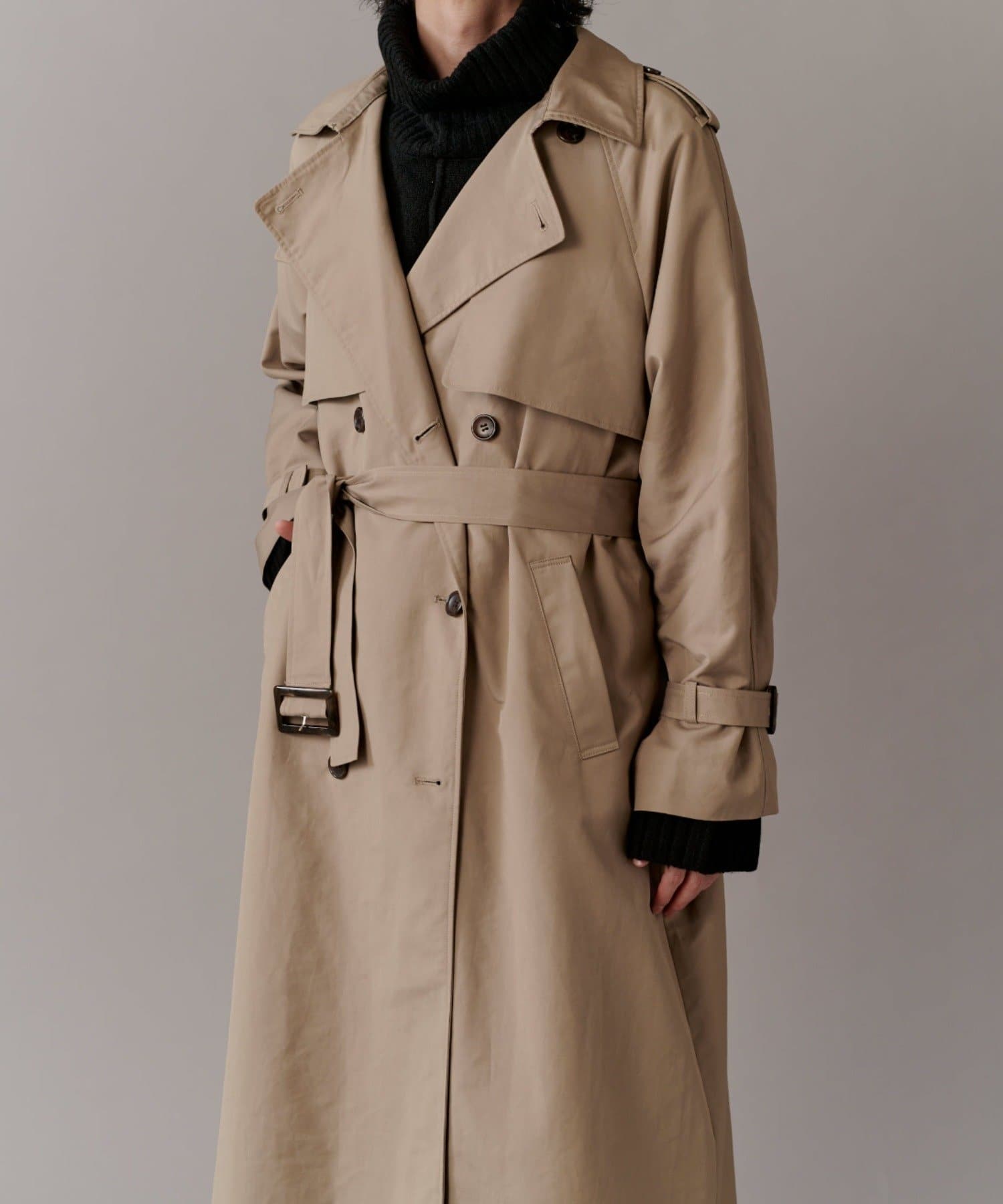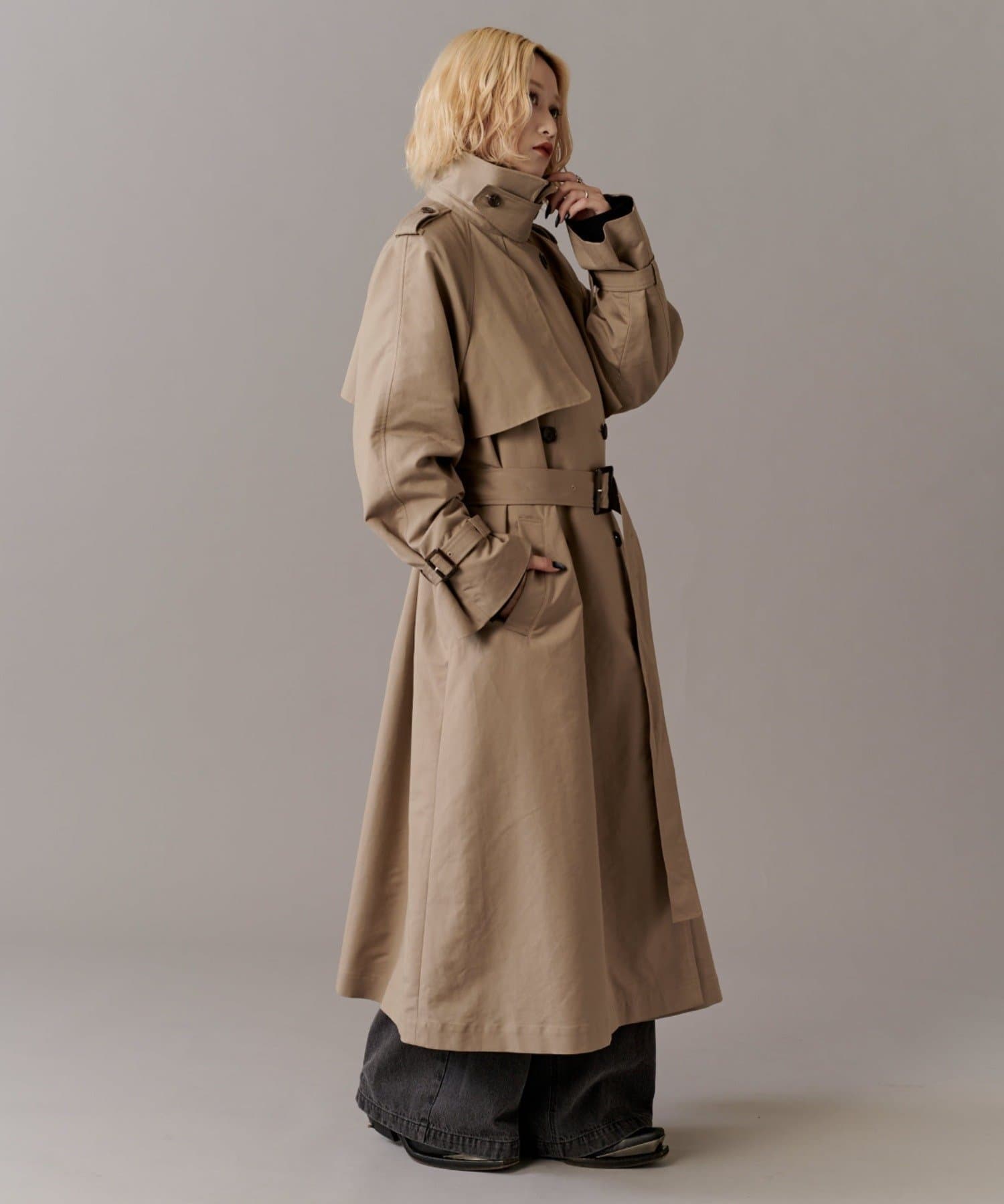 高級感あふれる素材と、圧倒的な存在感のあるロングトレンチコート