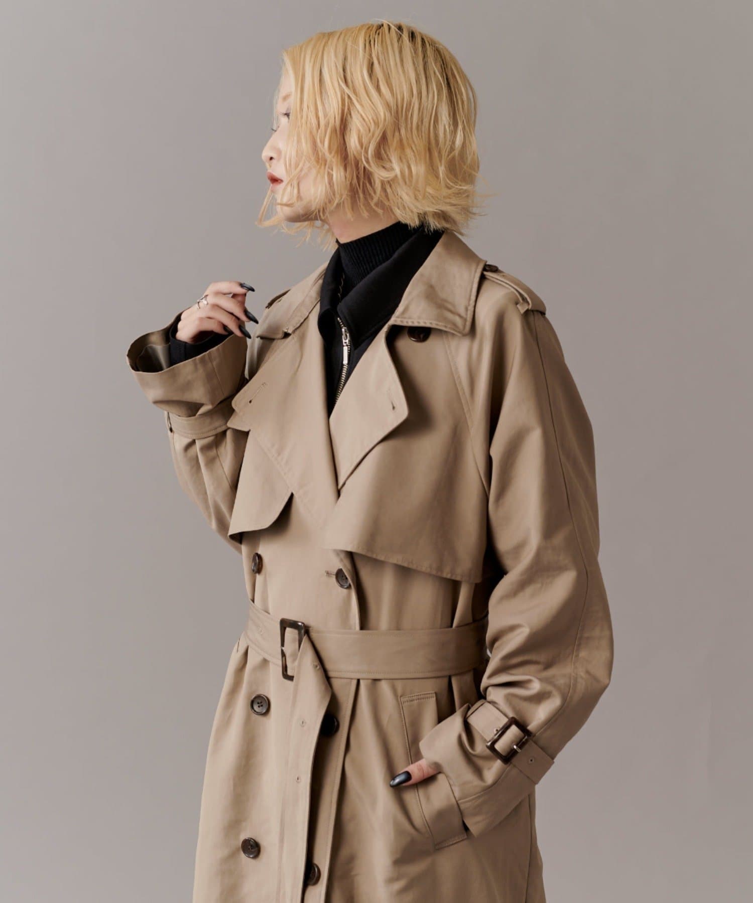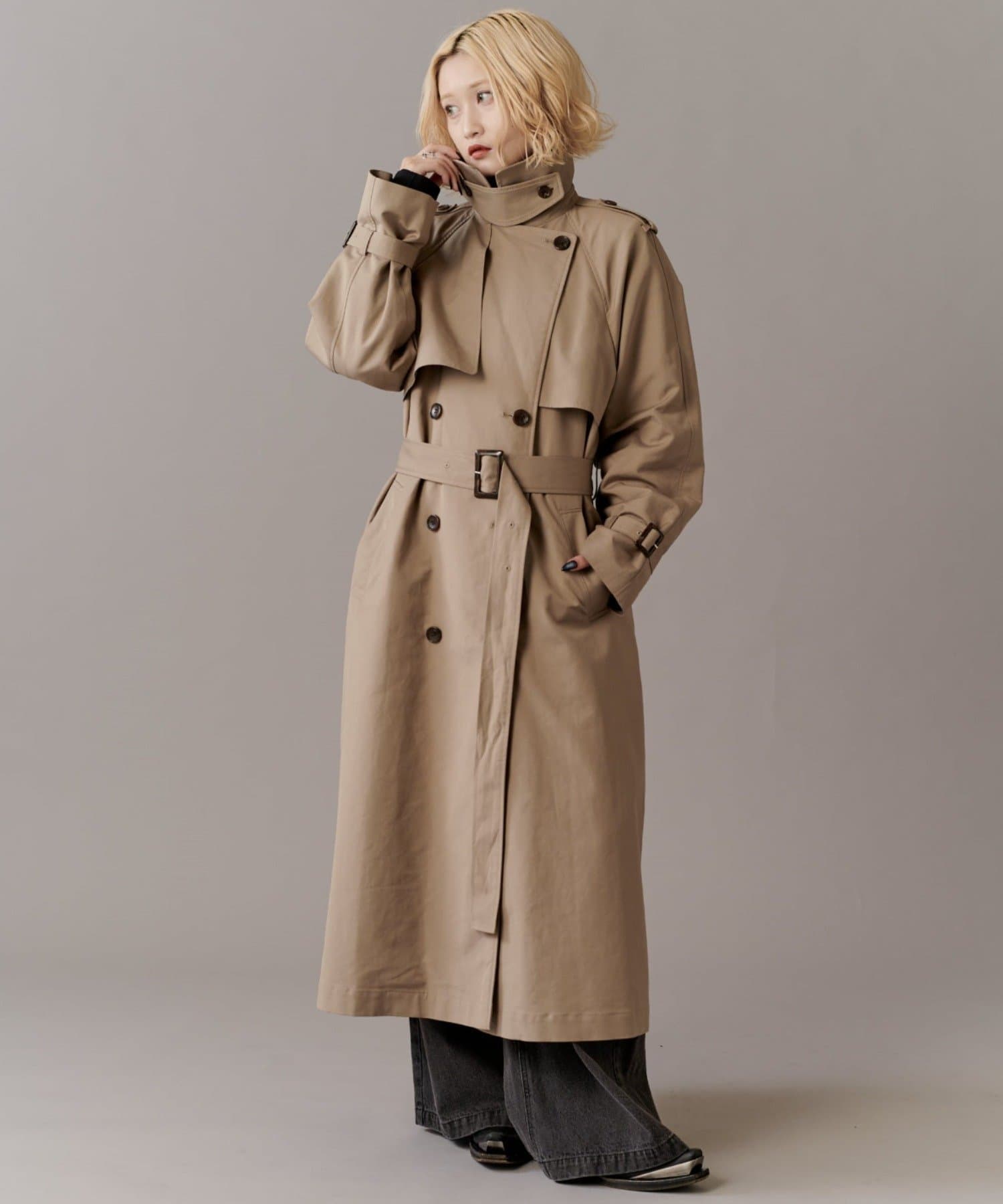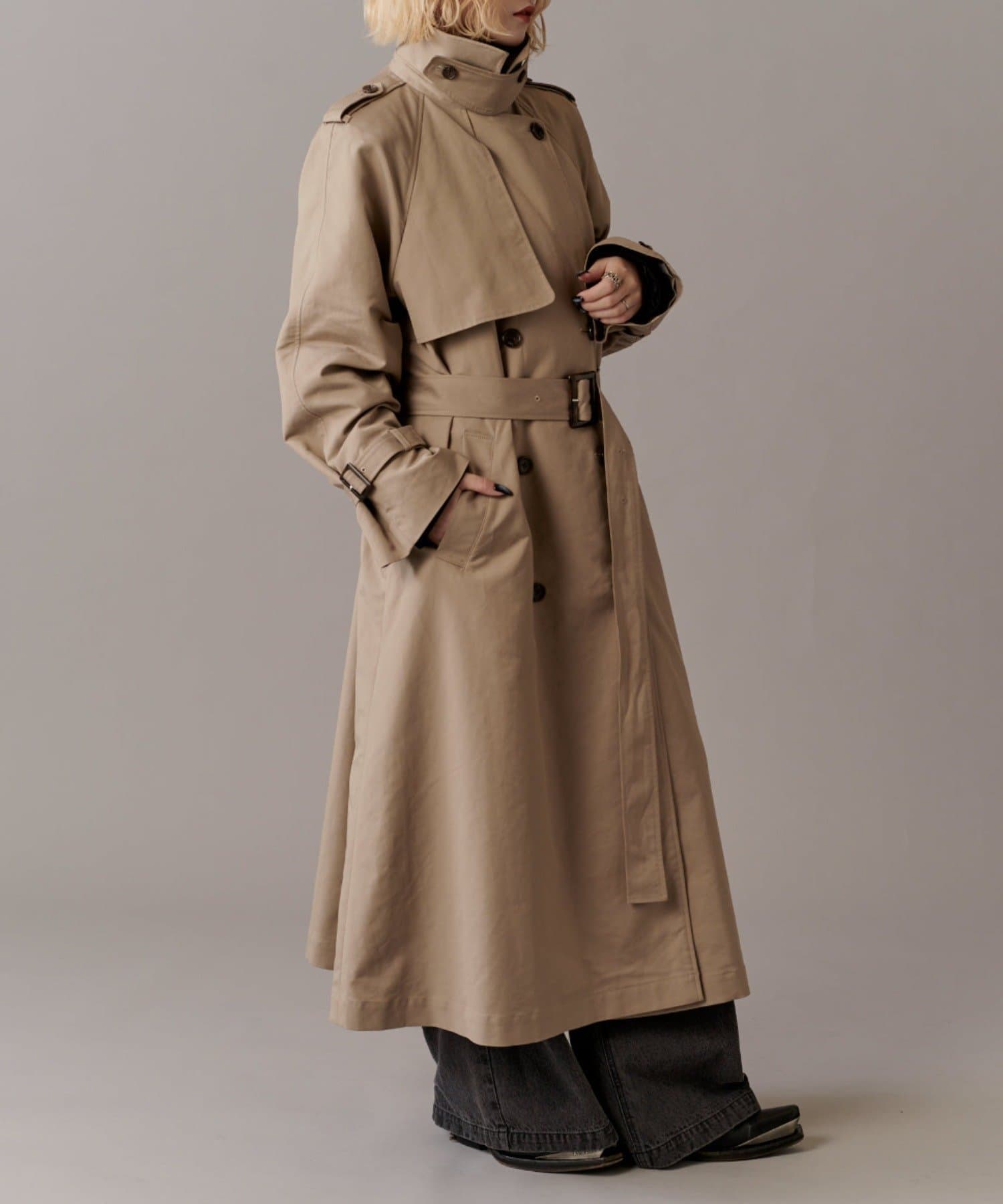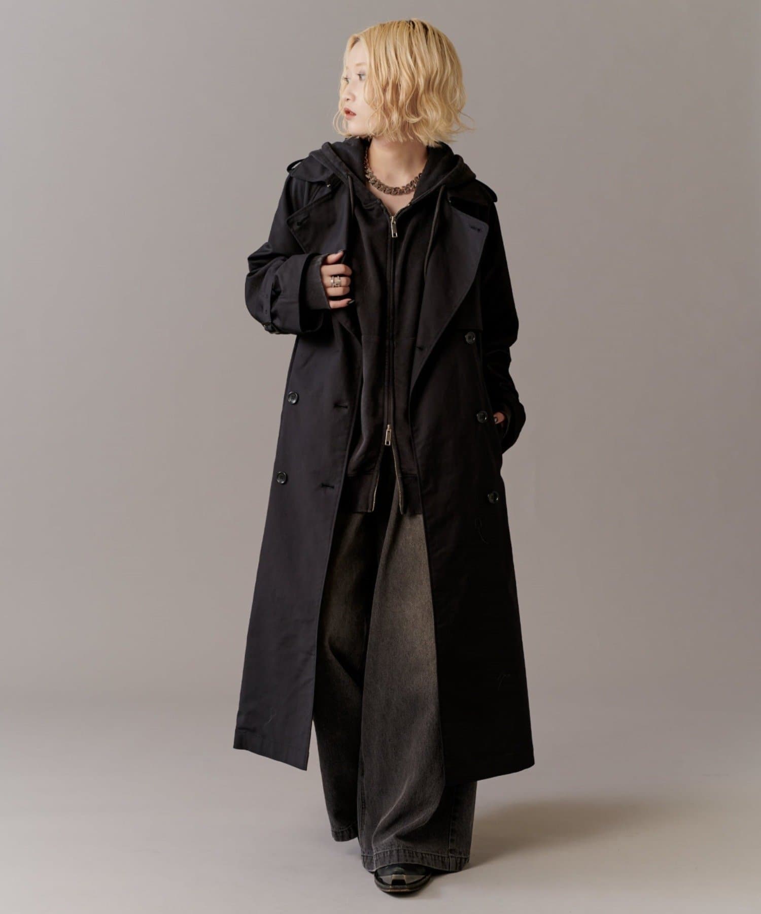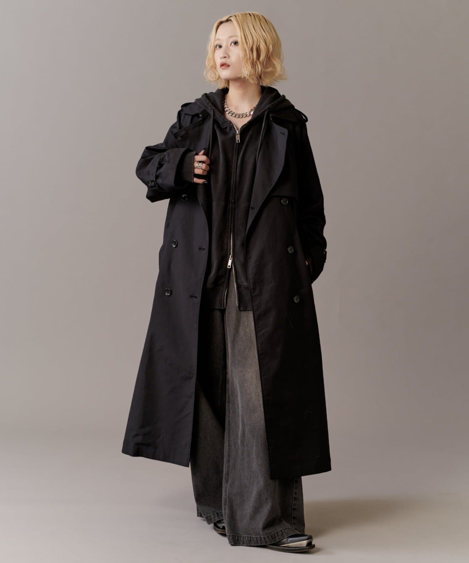 高級感あふれる素材と、圧倒的な存在感のあるロングトレンチコート