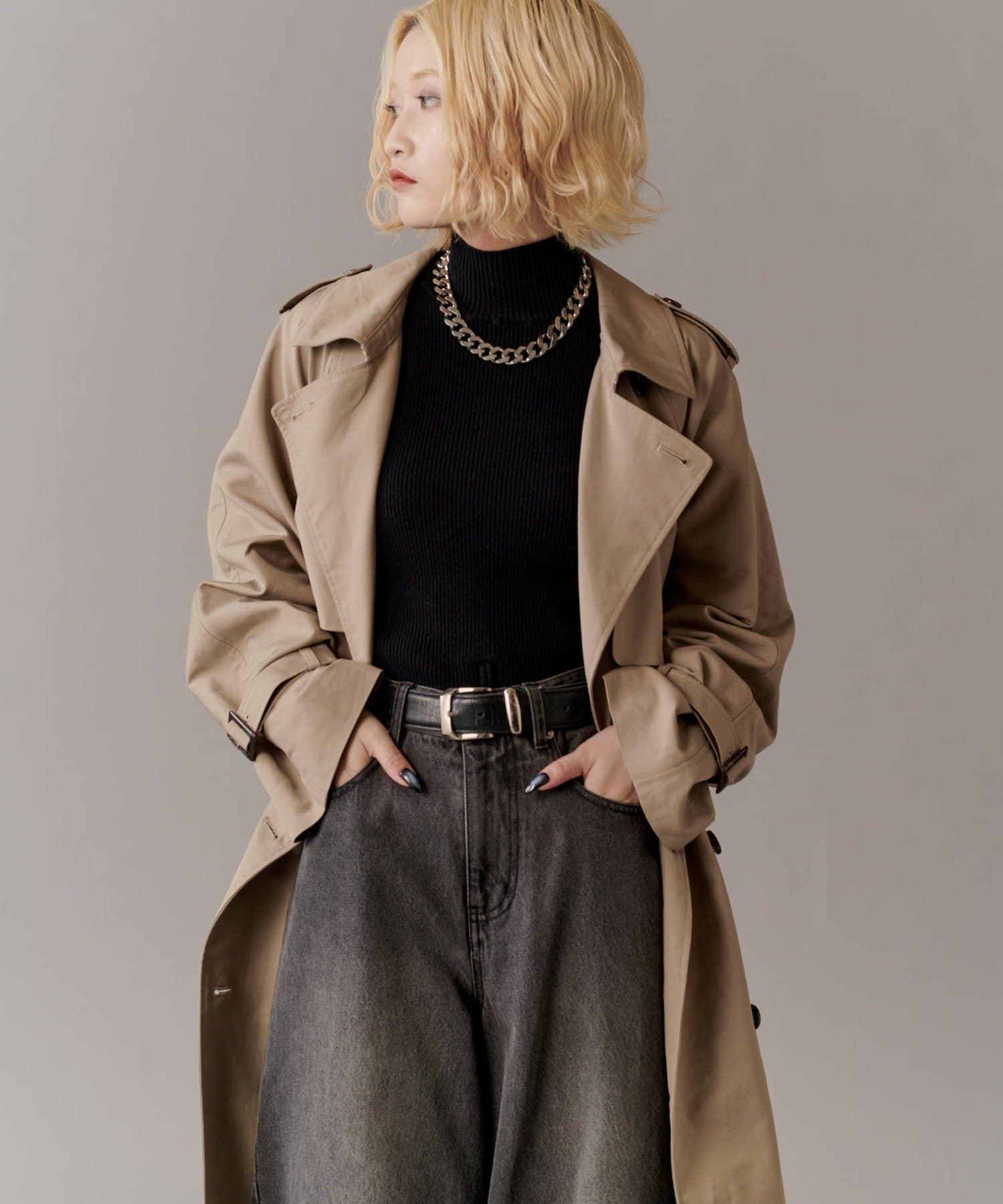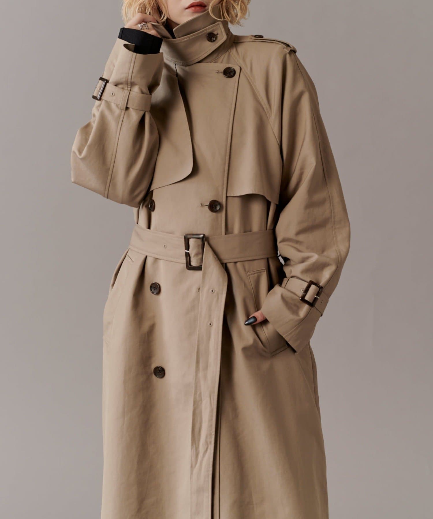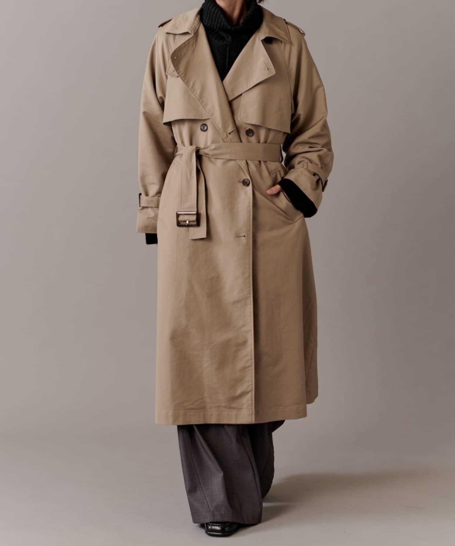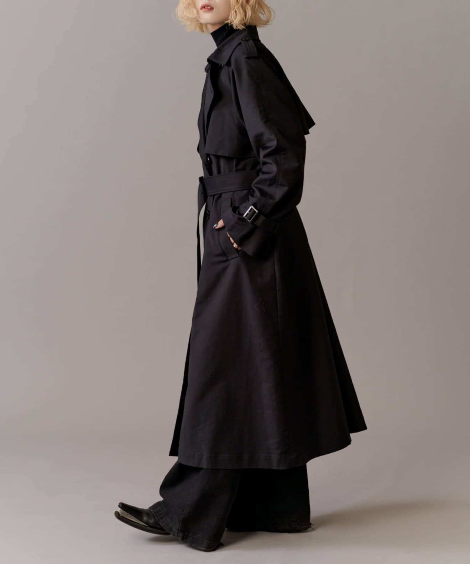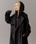 高級感あふれる素材と、圧倒的な存在感のあるロングトレンチコート