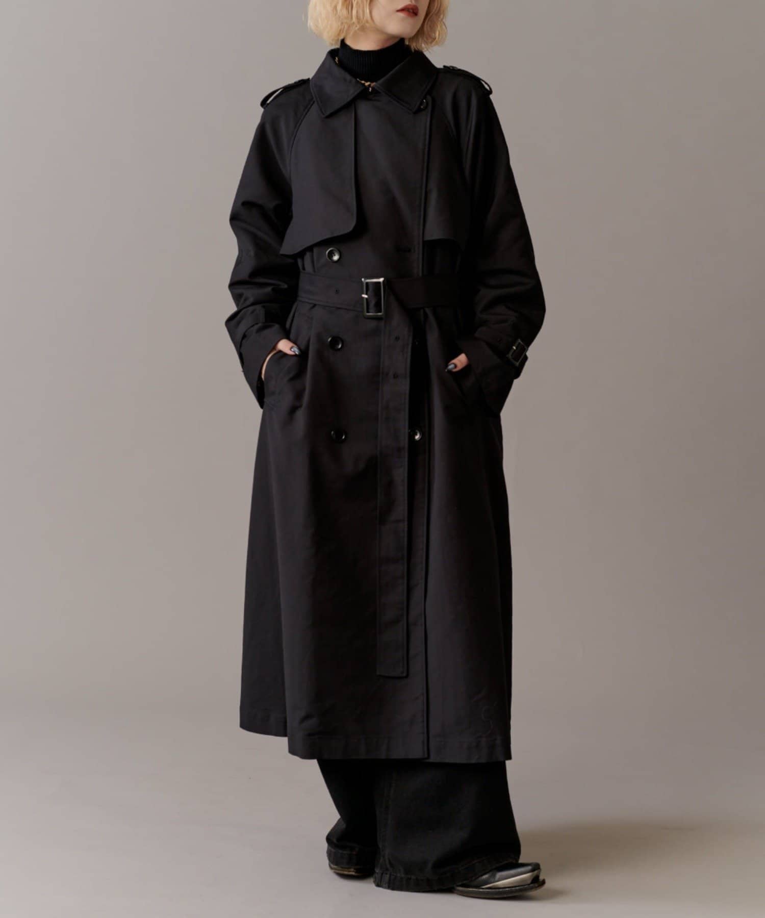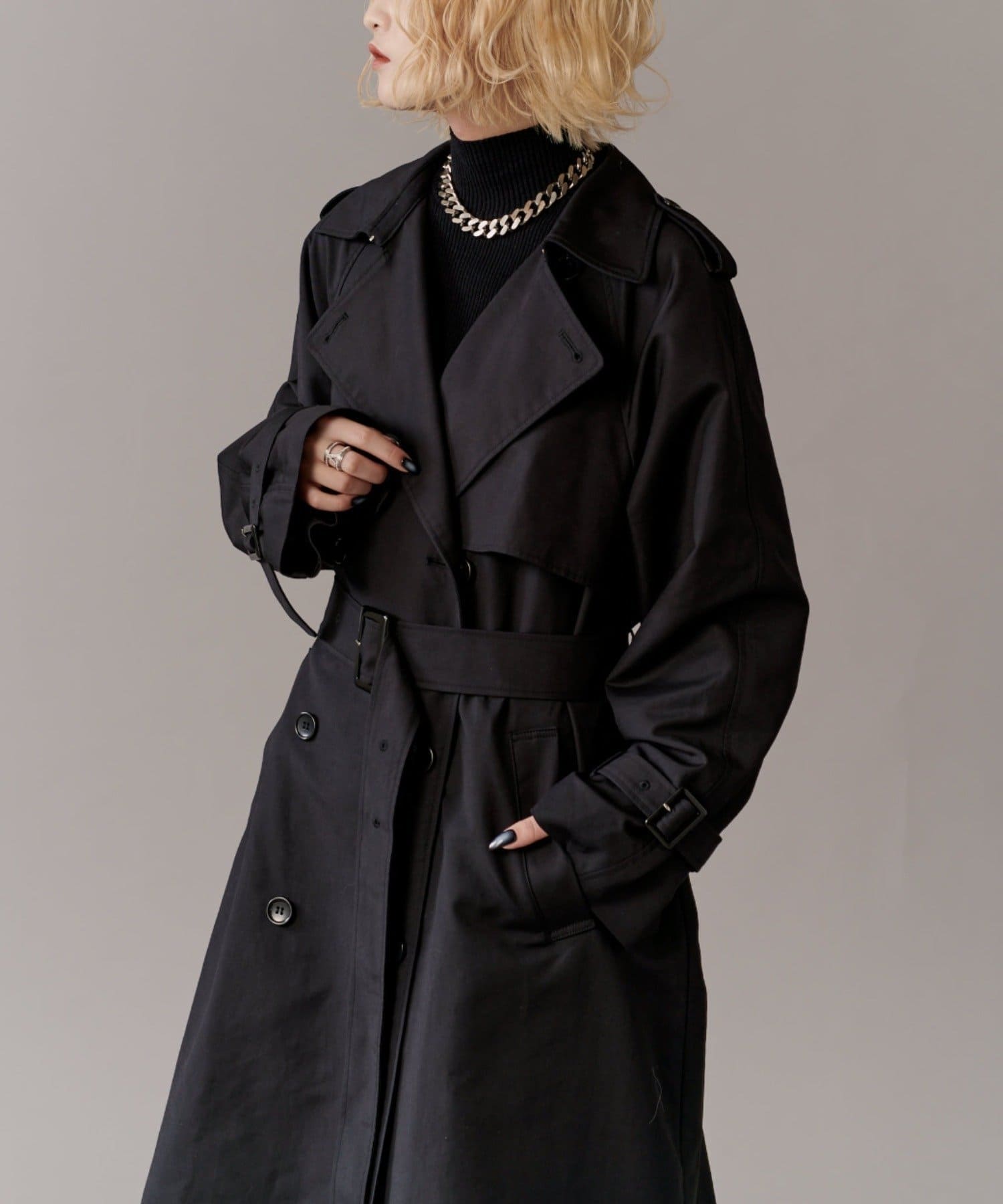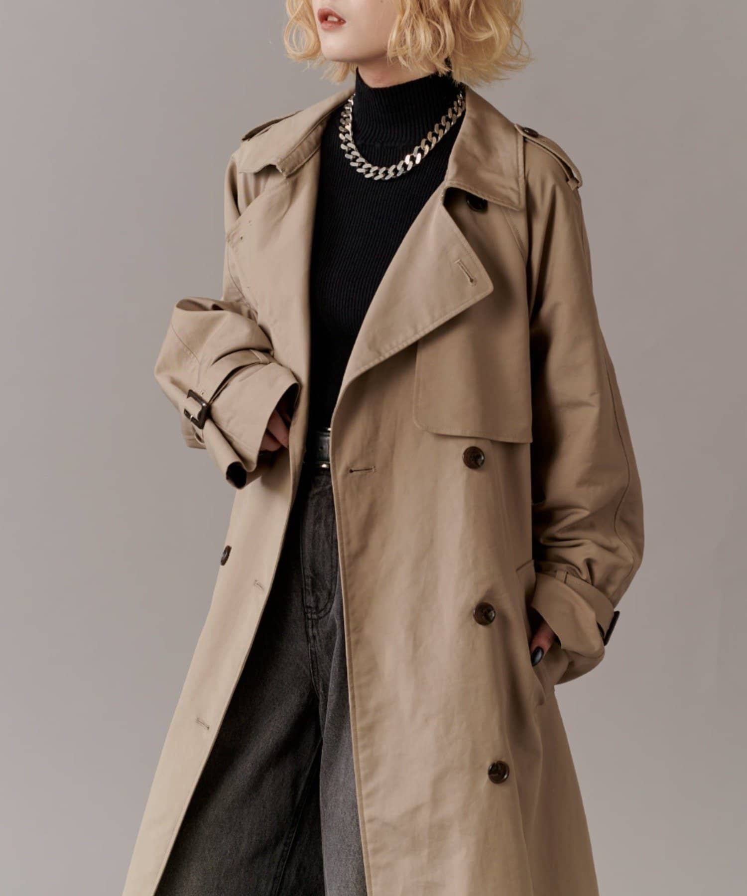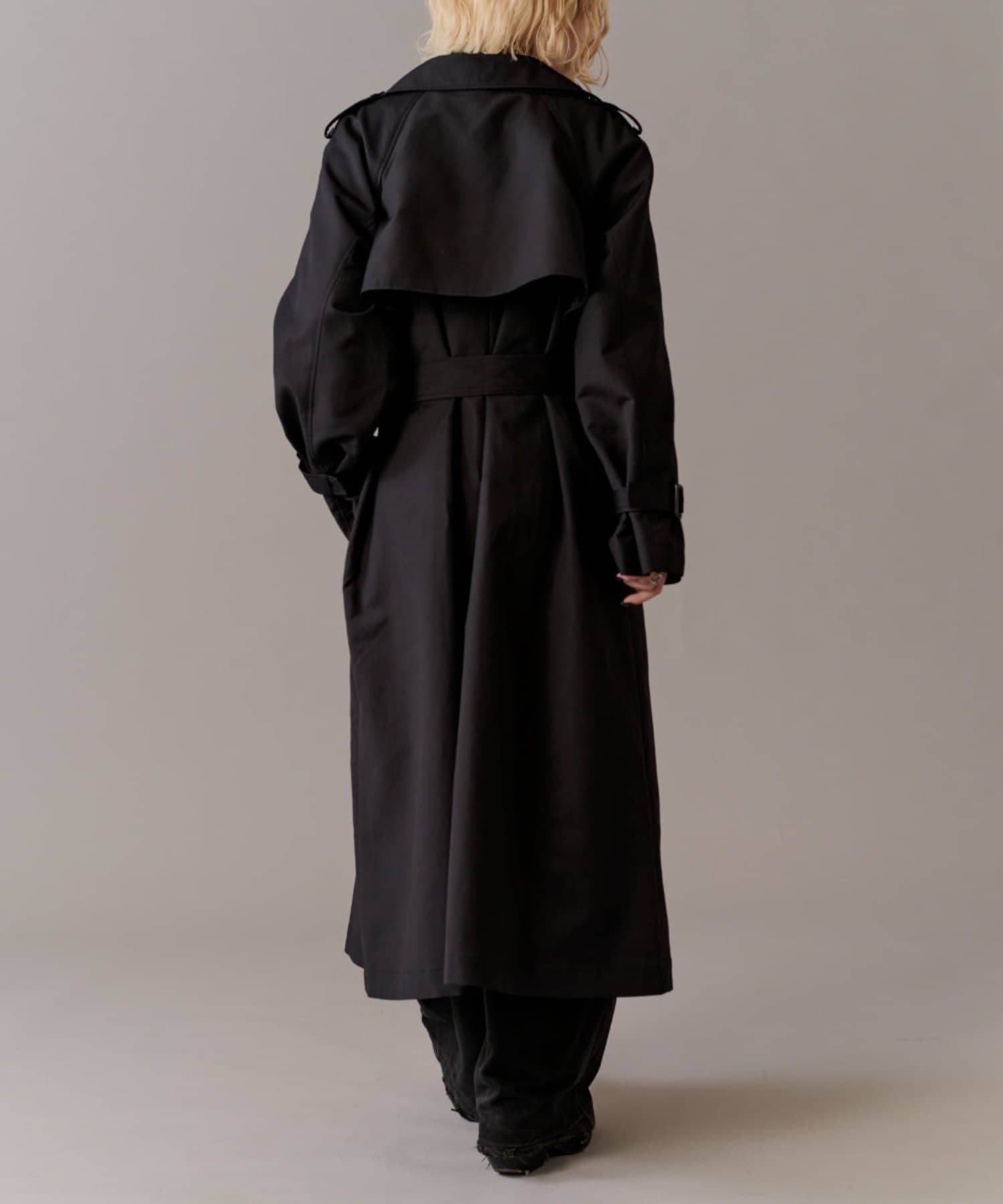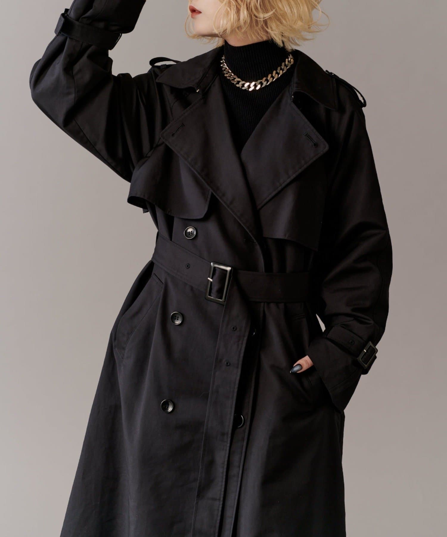 高級感あふれる素材と、圧倒的な存在感のあるロングトレンチコート