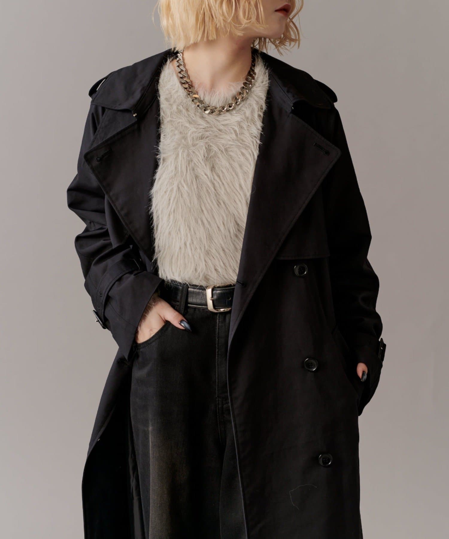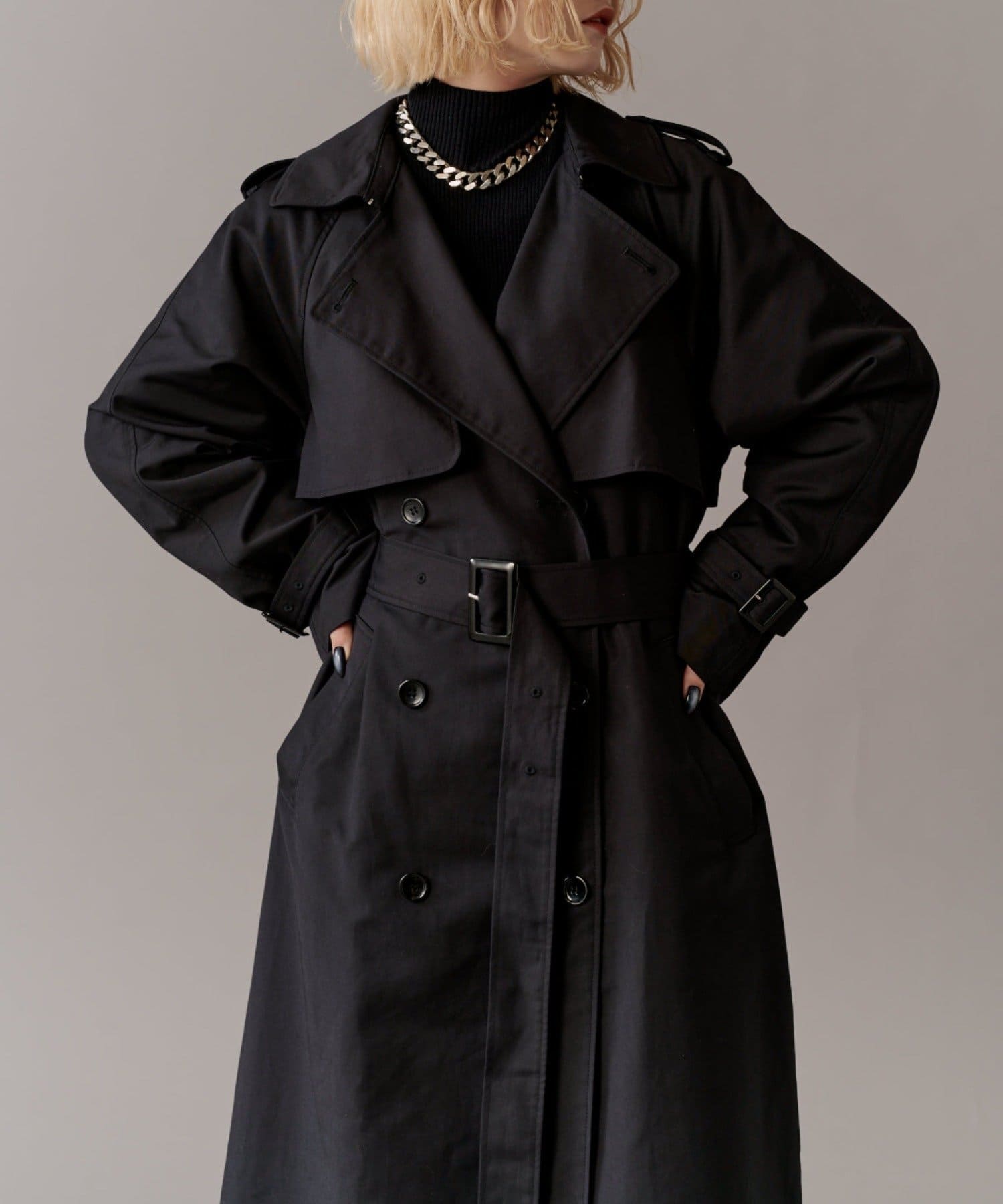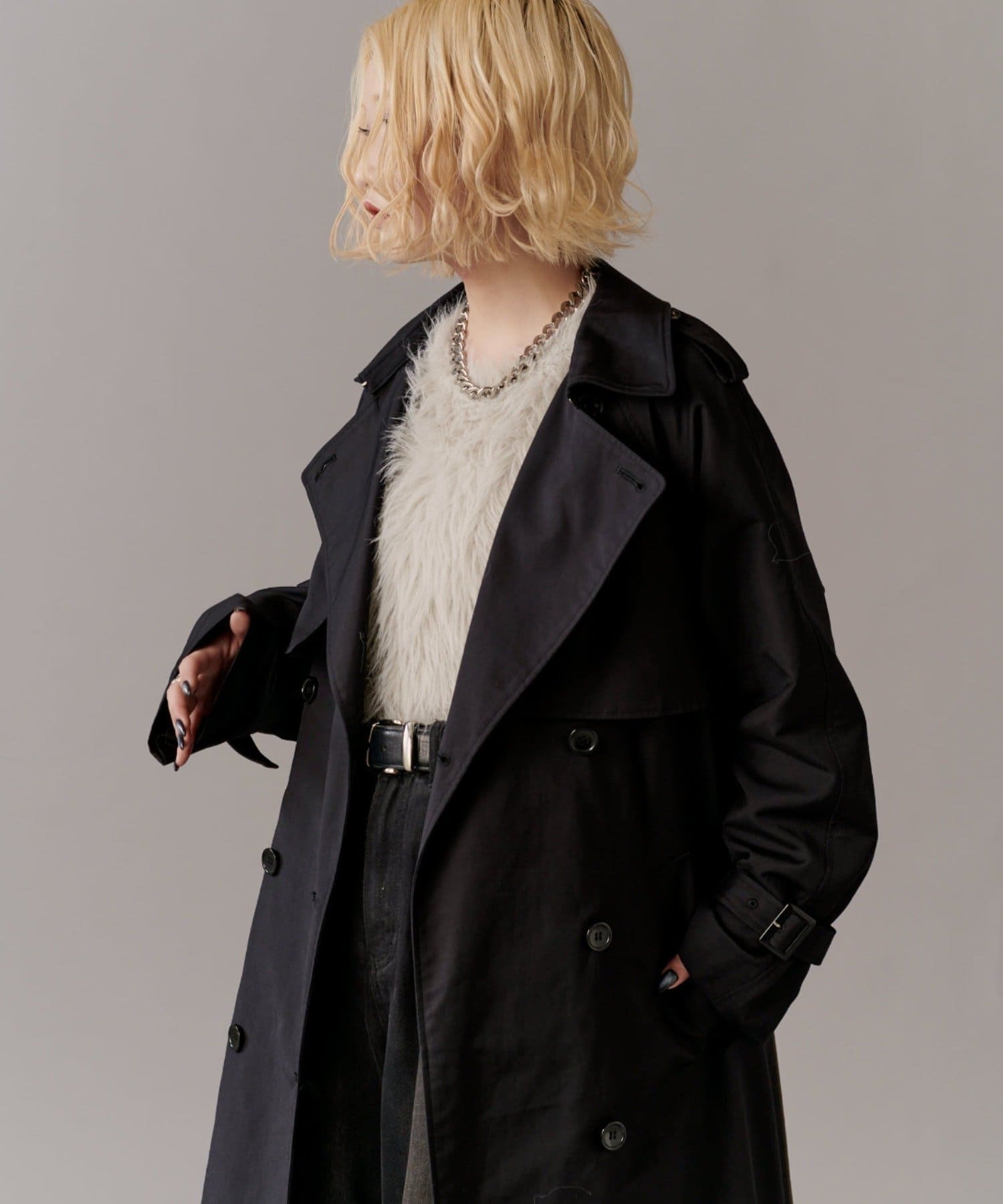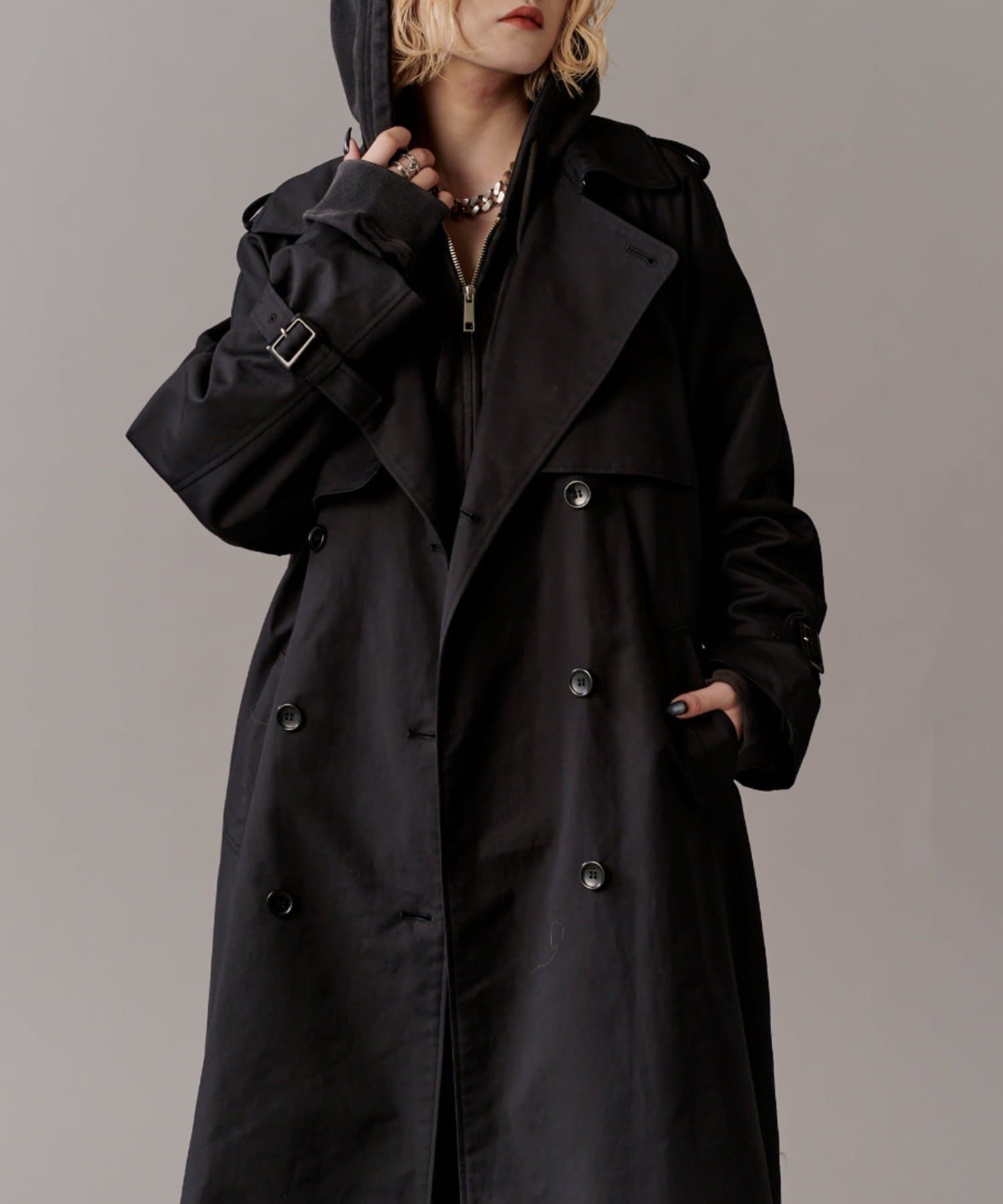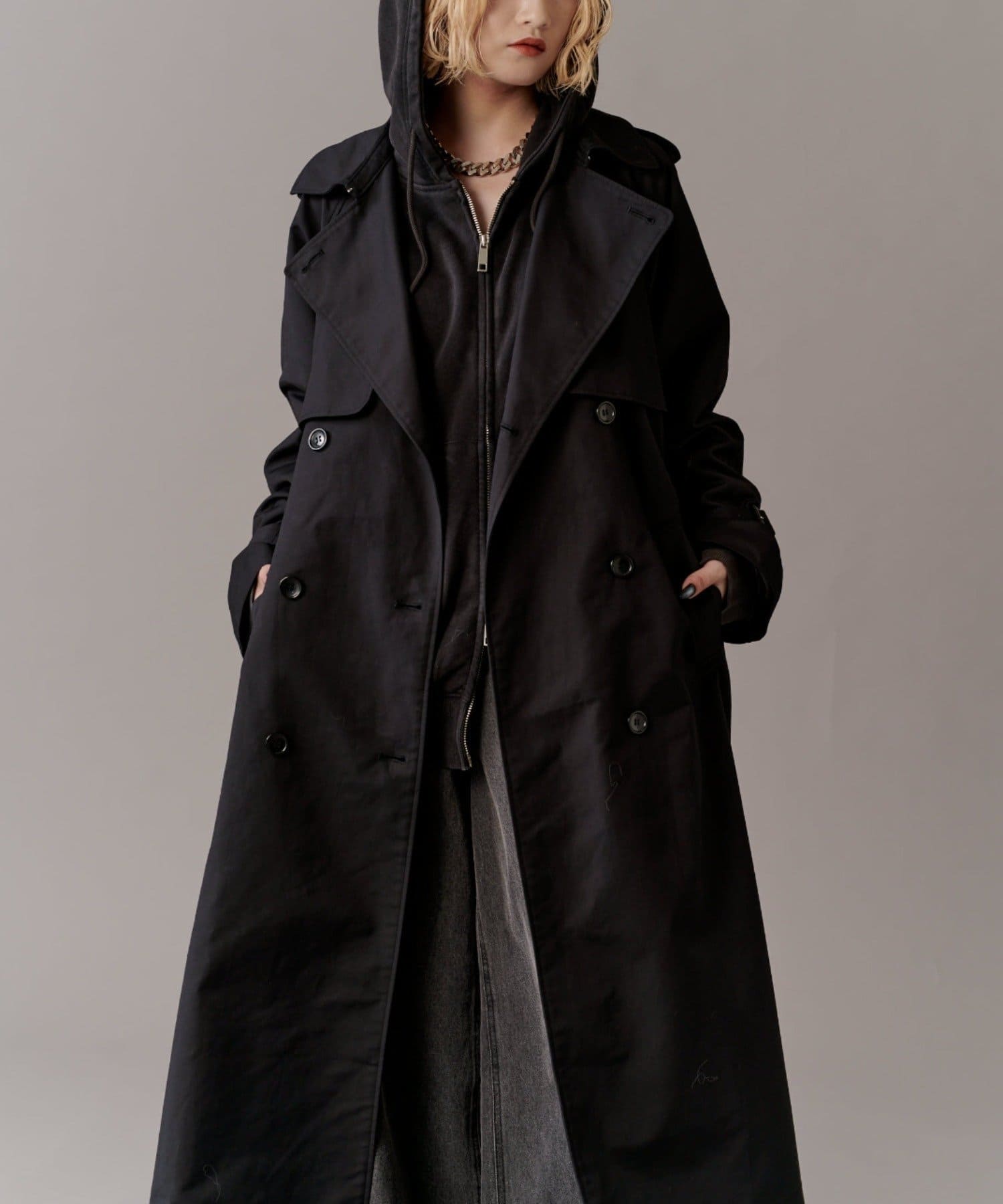 高級感あふれる素材と、圧倒的な存在感のあるロングトレンチコート