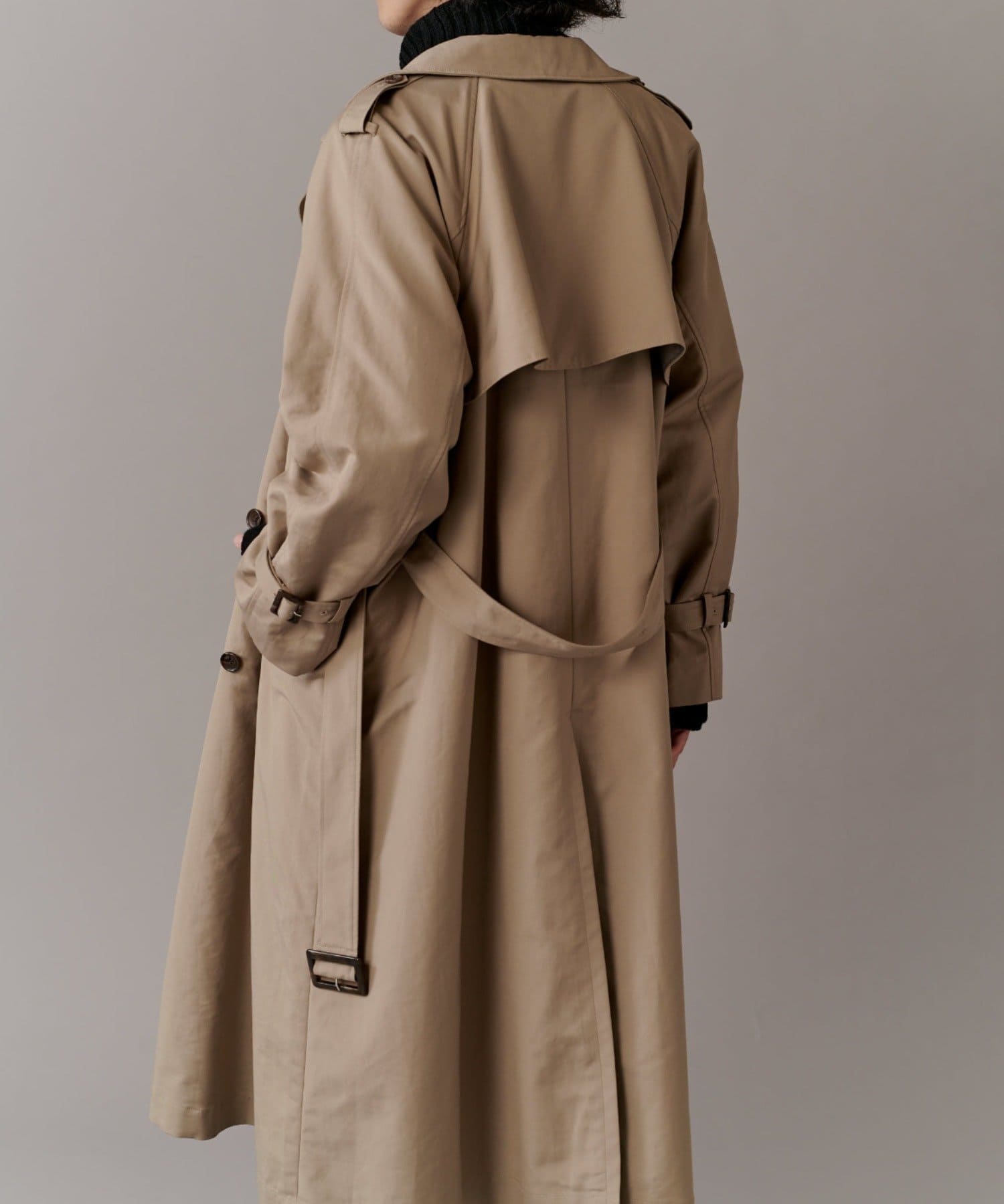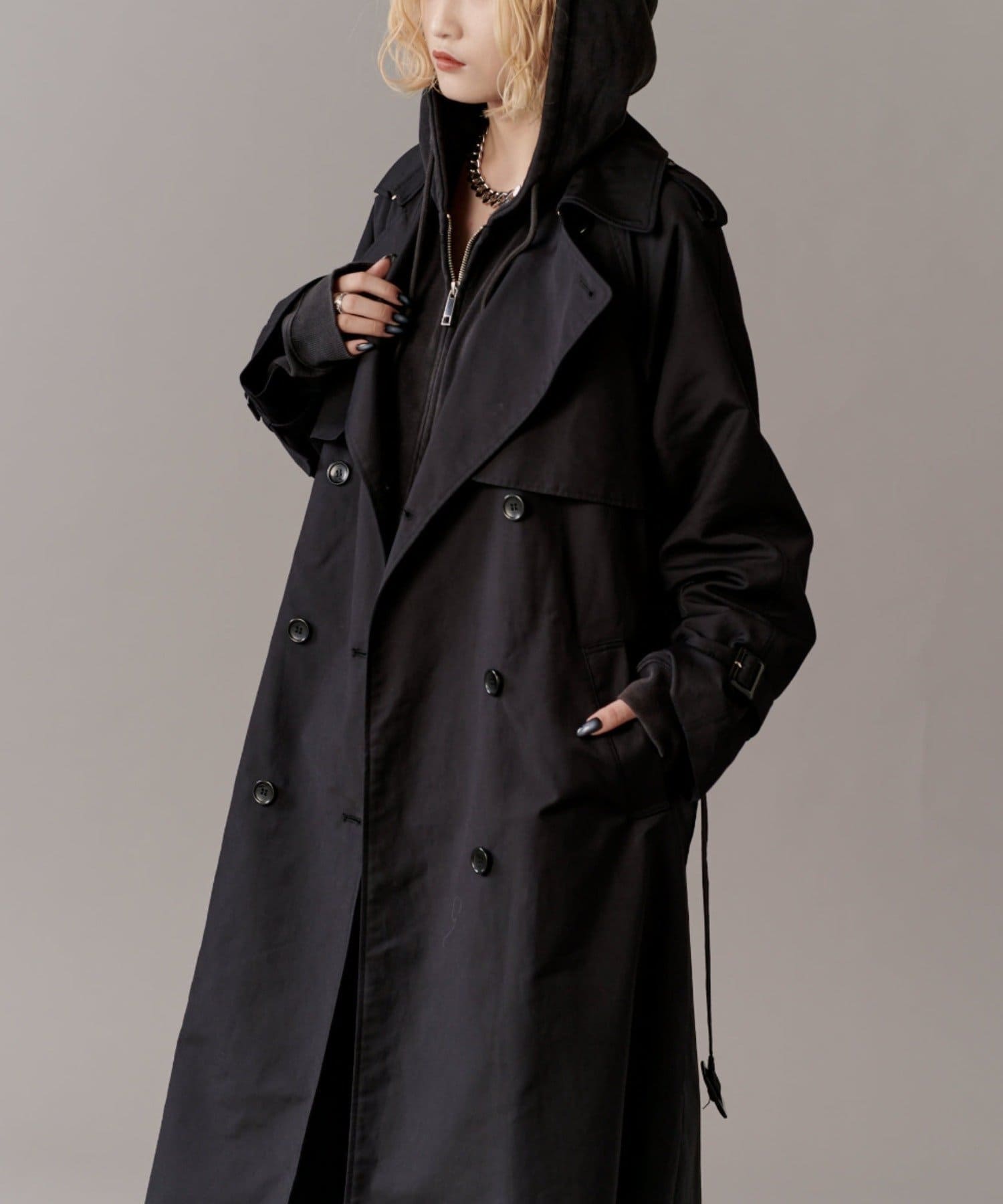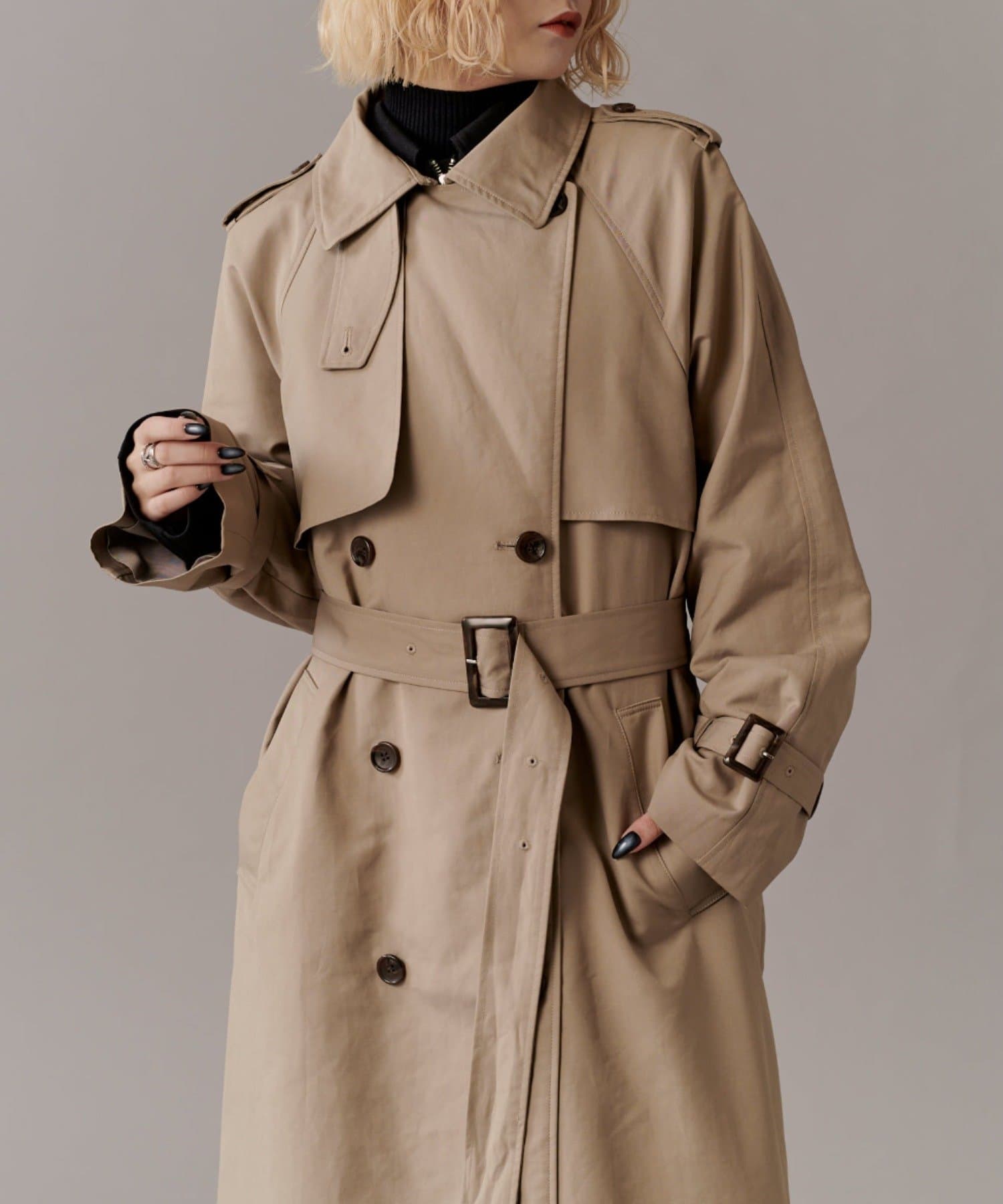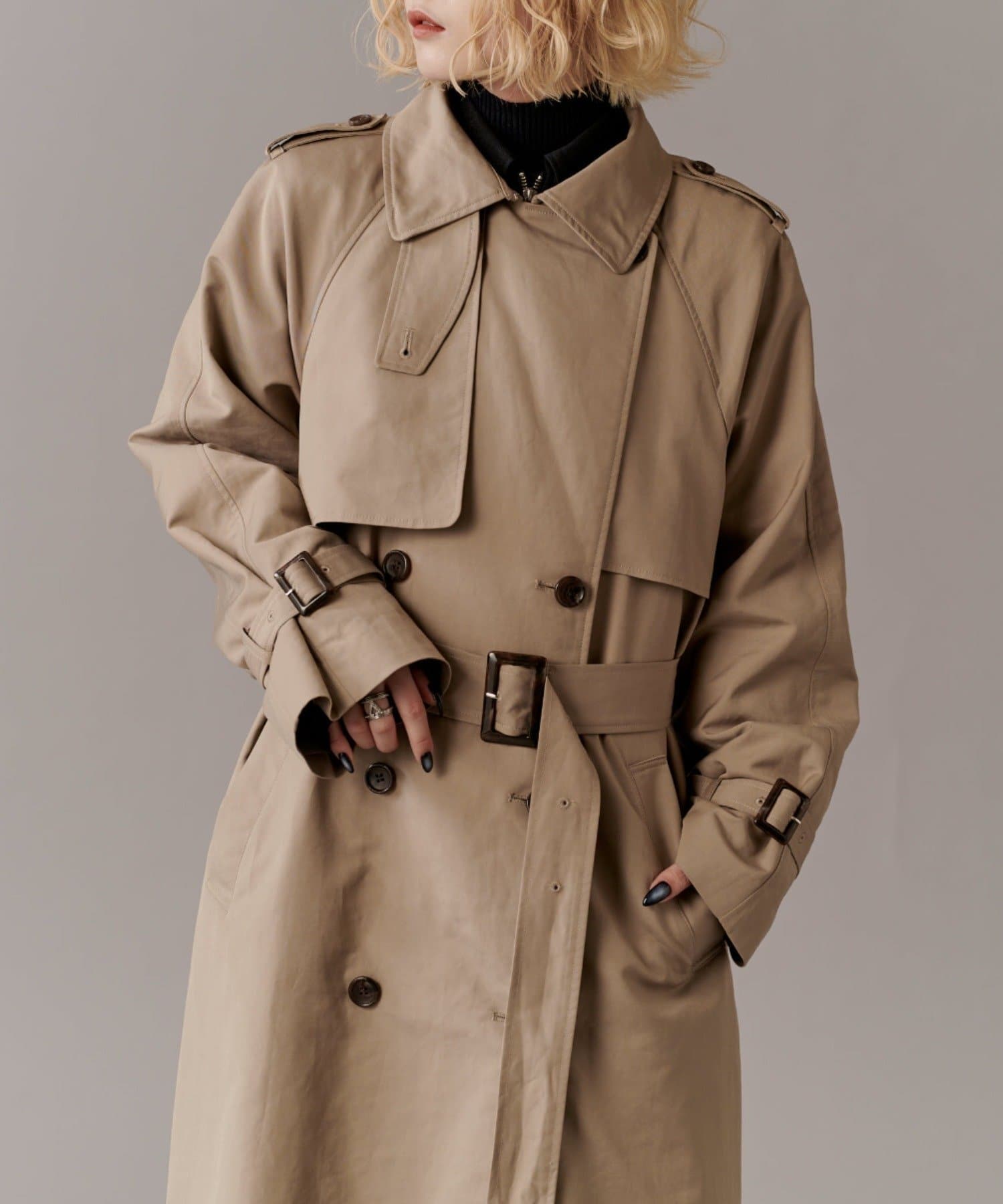 高級感あふれる素材と、圧倒的な存在感のあるロングトレンチコート