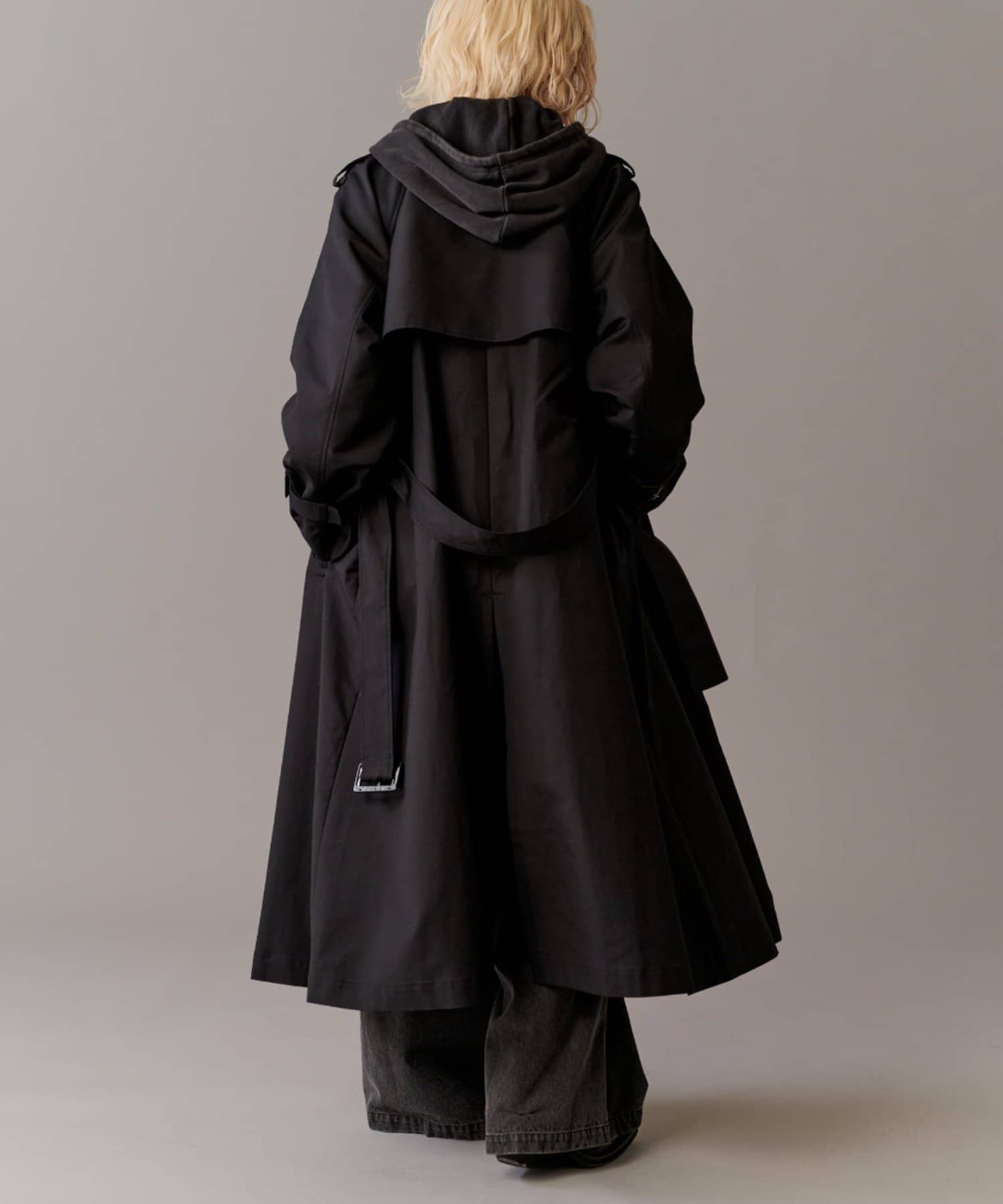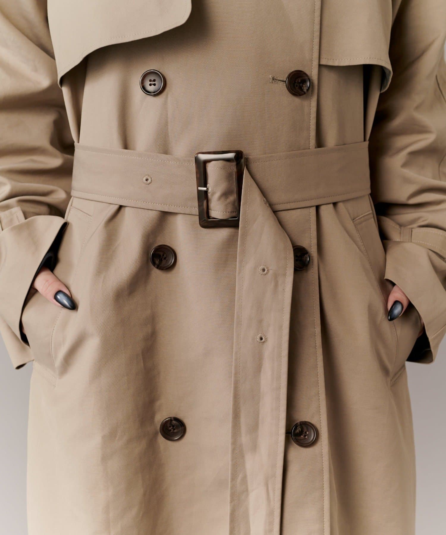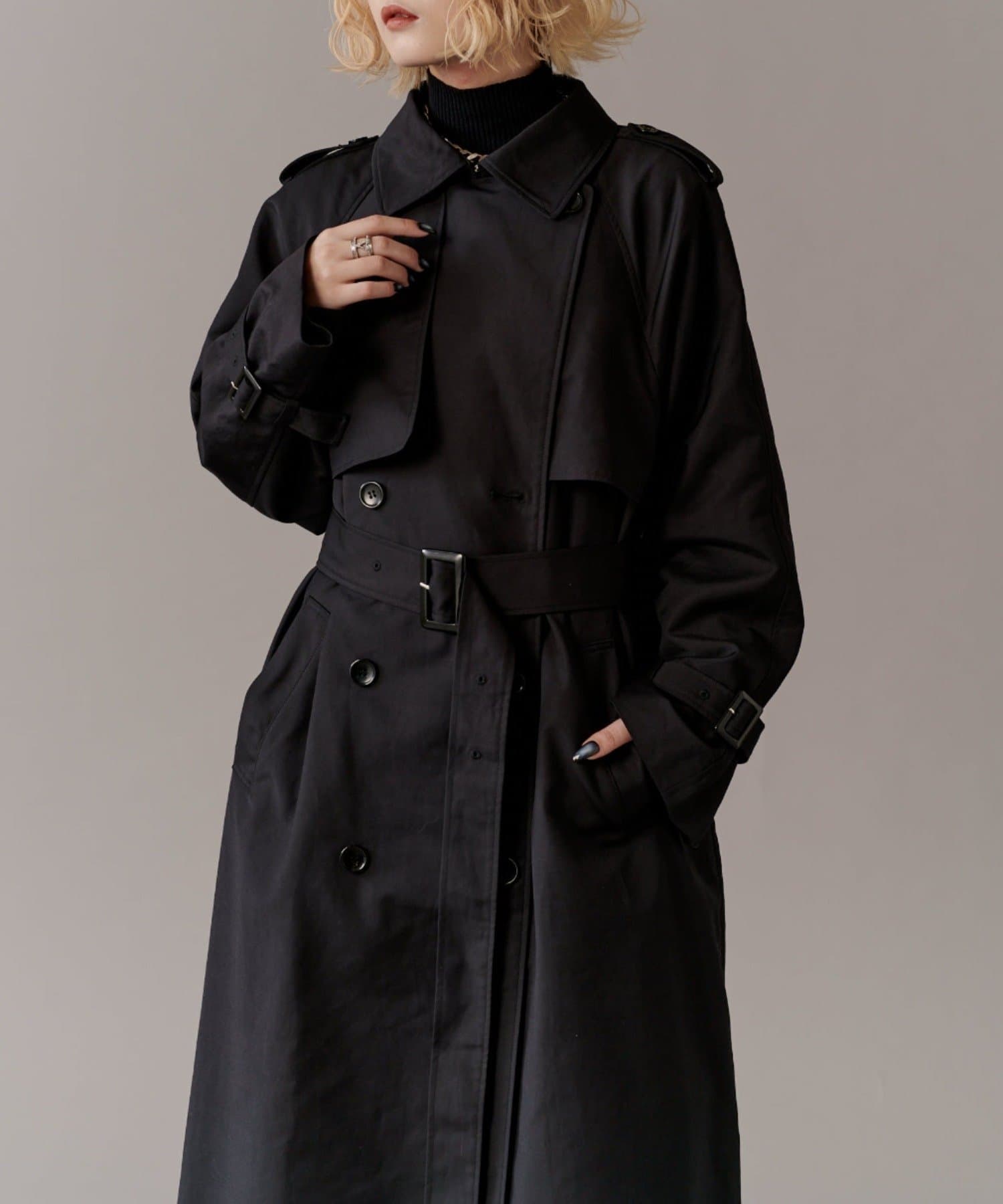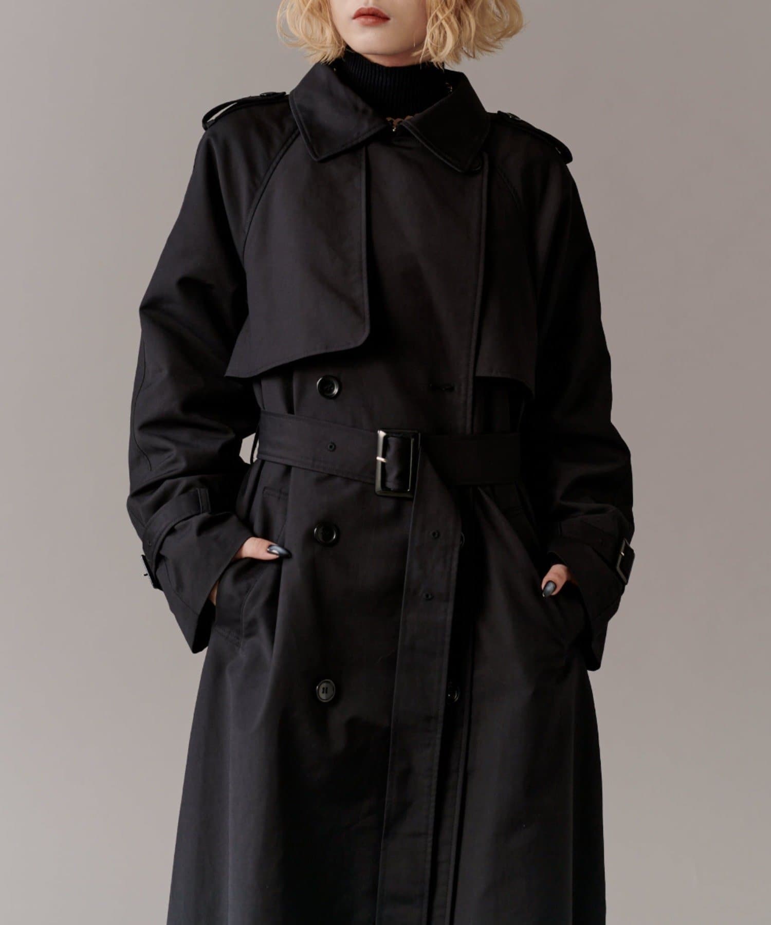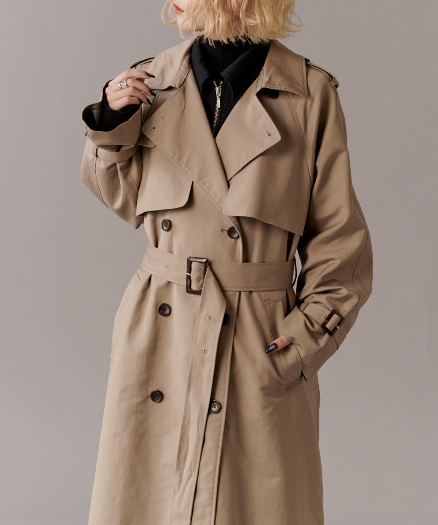 高級感あふれる素材と、圧倒的な存在感のあるロングトレンチコート