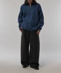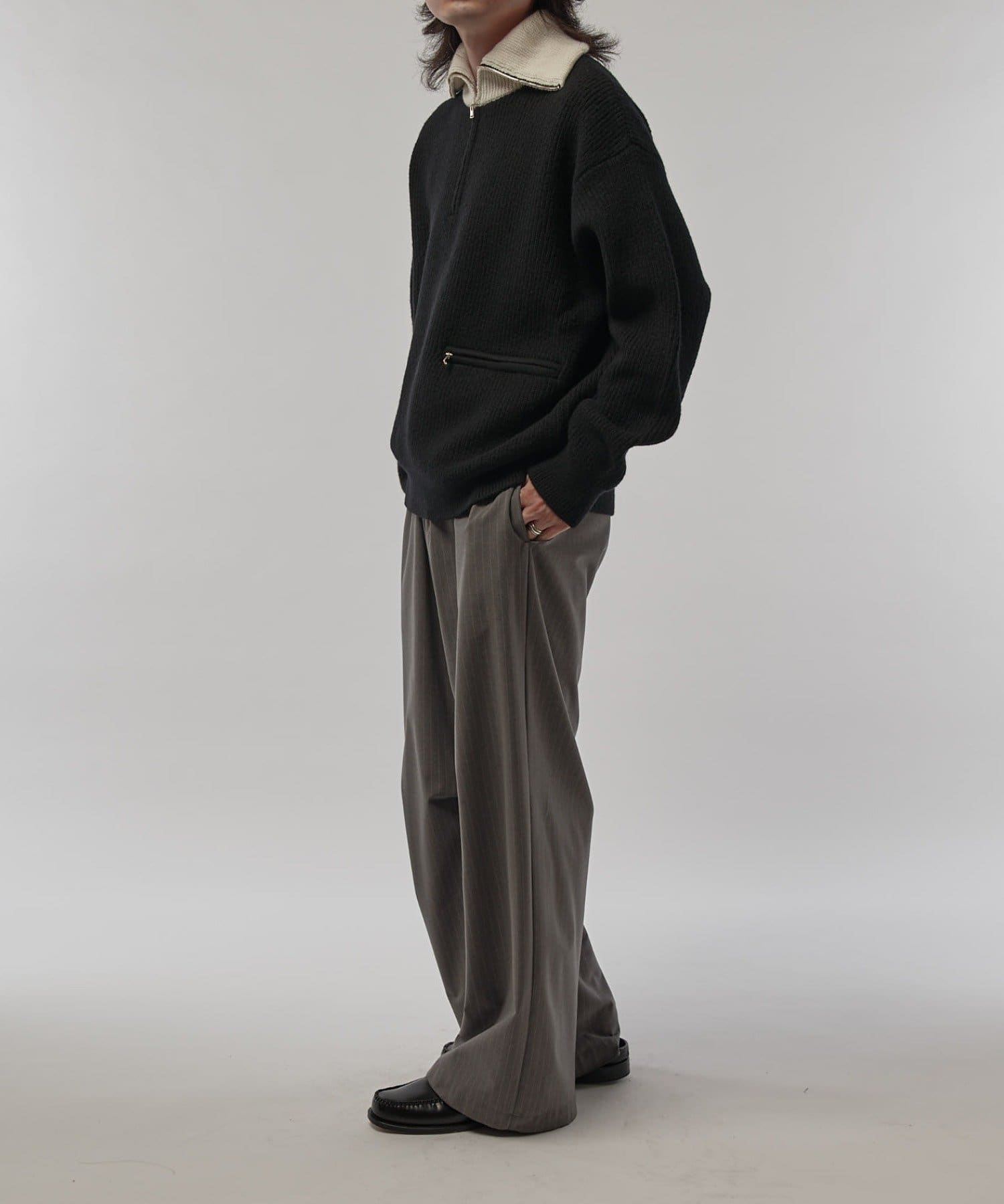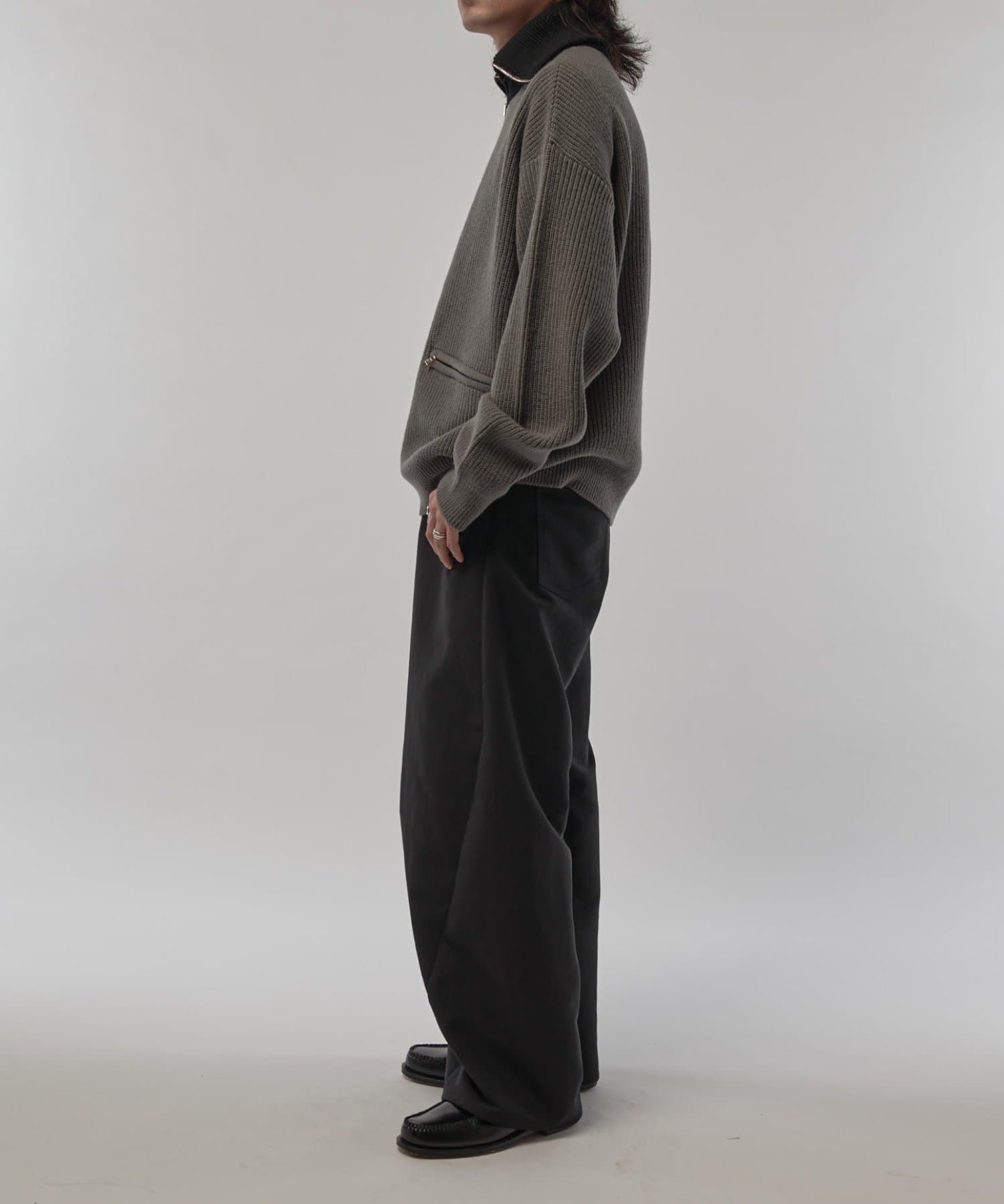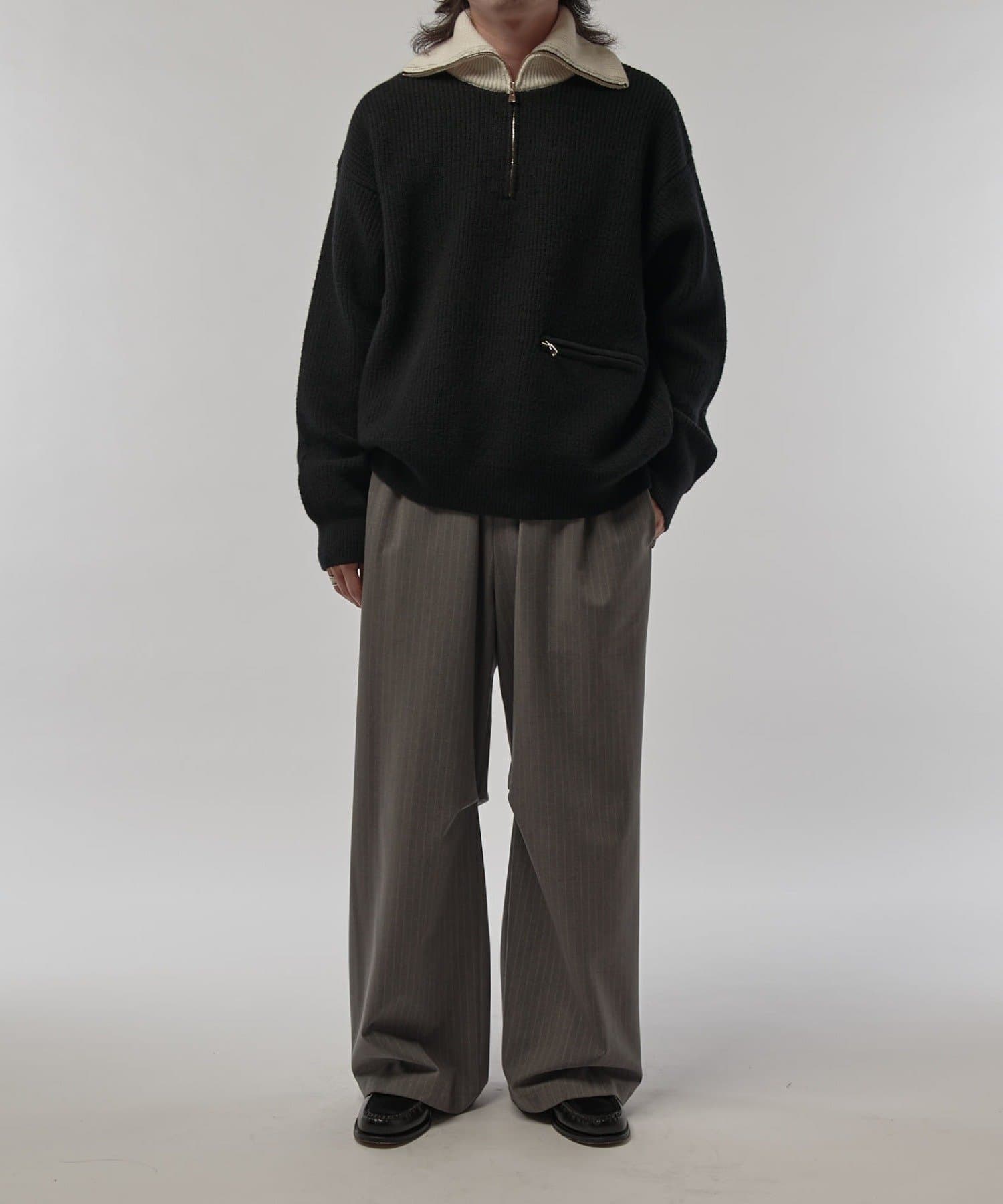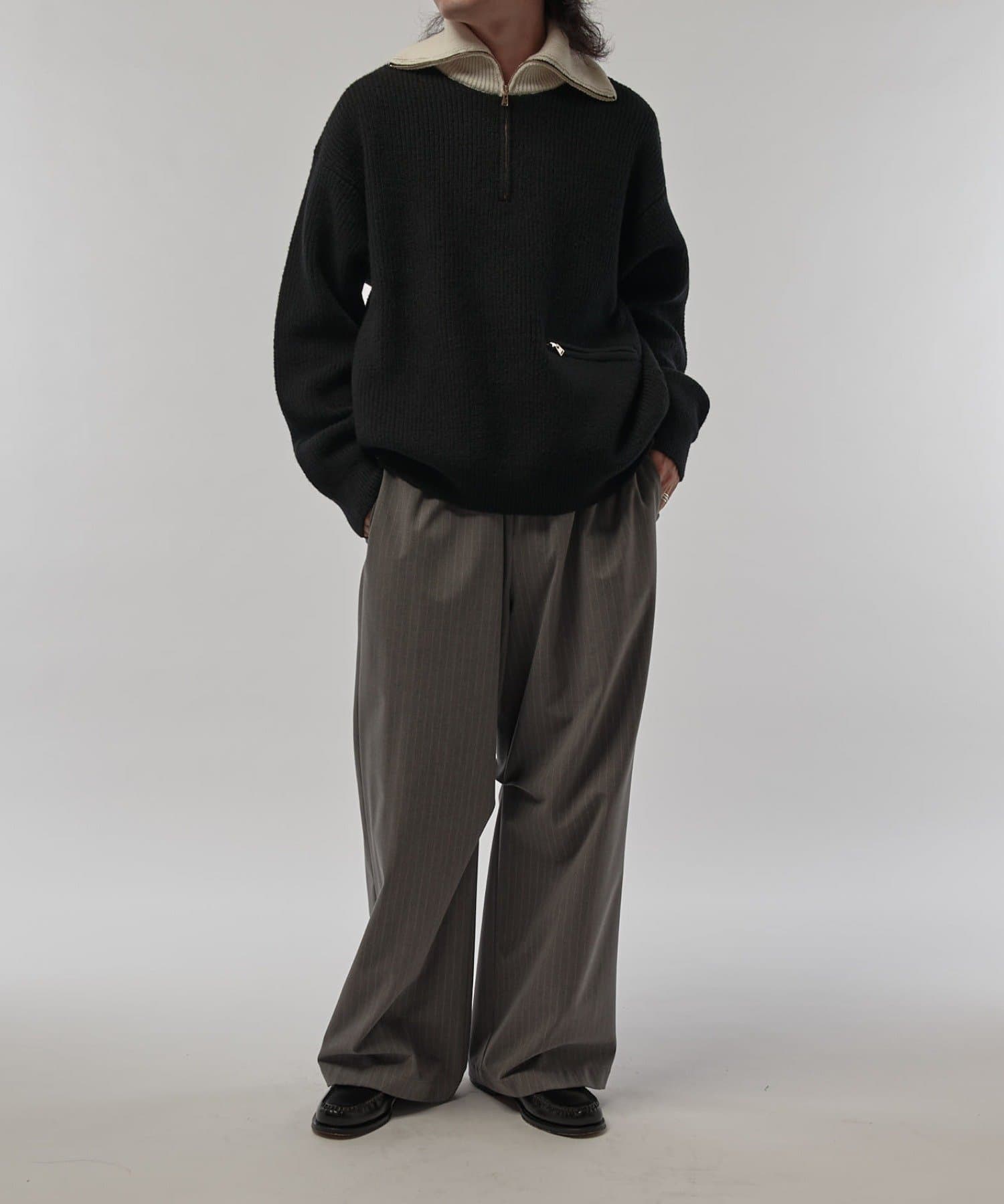 上品な雰囲気のハーフZIPニットなので、ワイドデニムやパラシュートパンツと組み合わせたキレイ目カジュアルなスタイルがオススメ。
