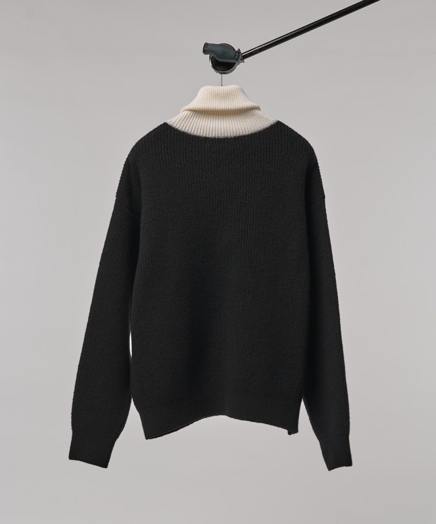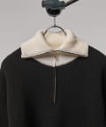 心地よい肌触りと軽やかな着心地で衿はバイカラーでアクセントにしフロントのファスナーを閉じてハイネックニットとしても着用が可能。