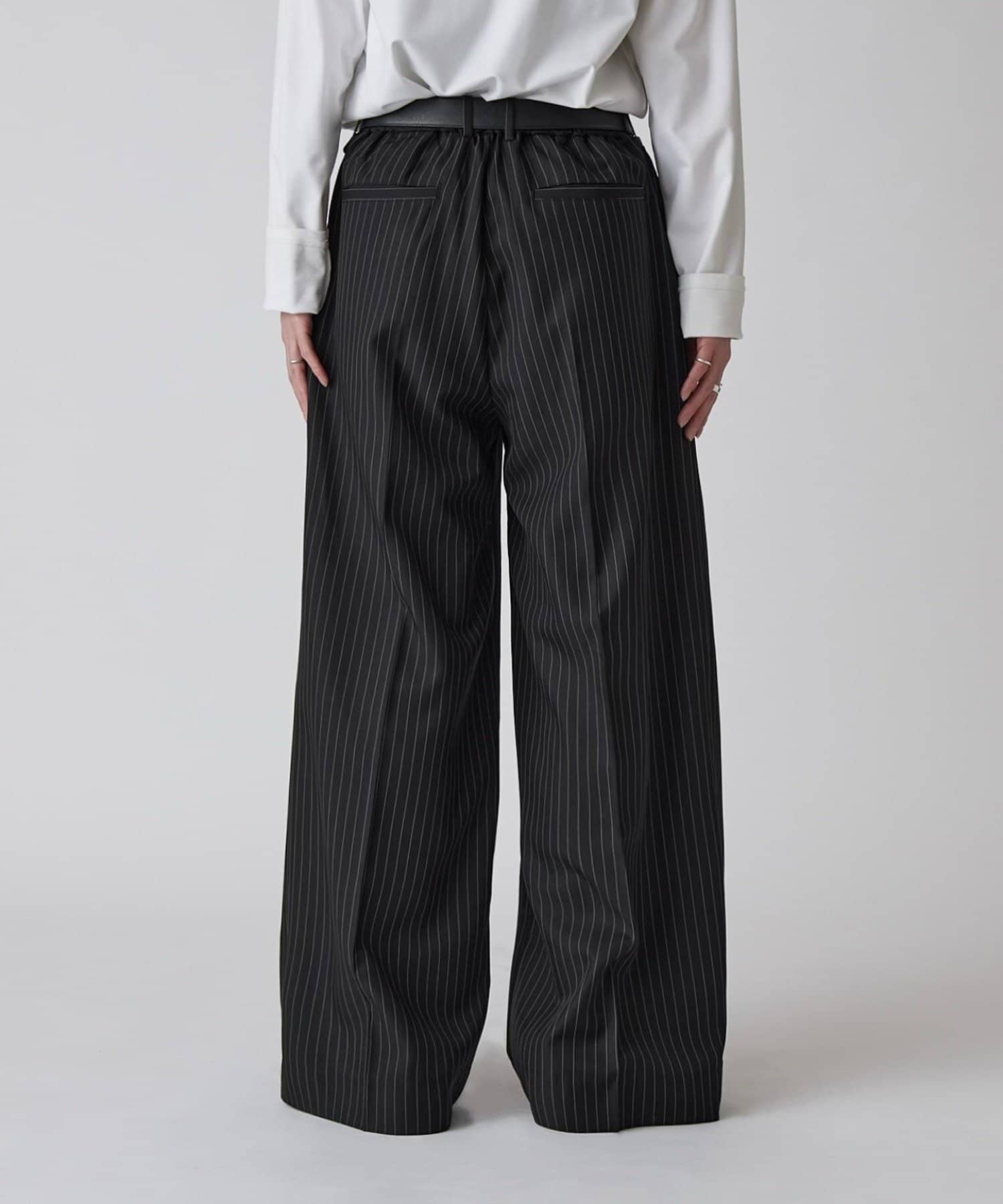 ・「ストライプ」×「ハイウエスト」なので脚長効果もありつつ、履くだけでコーデが引き締まると同時に、オフホワイトのピンストライプを採用し柔らかい印象にすることで、カッチリし過ぎずデイリーに使い回ししやすいデザインを追求。