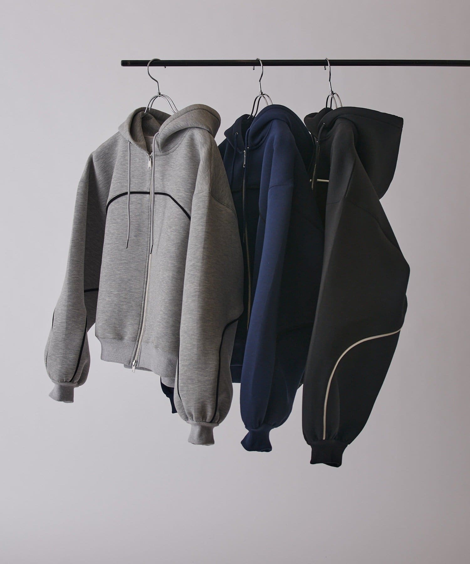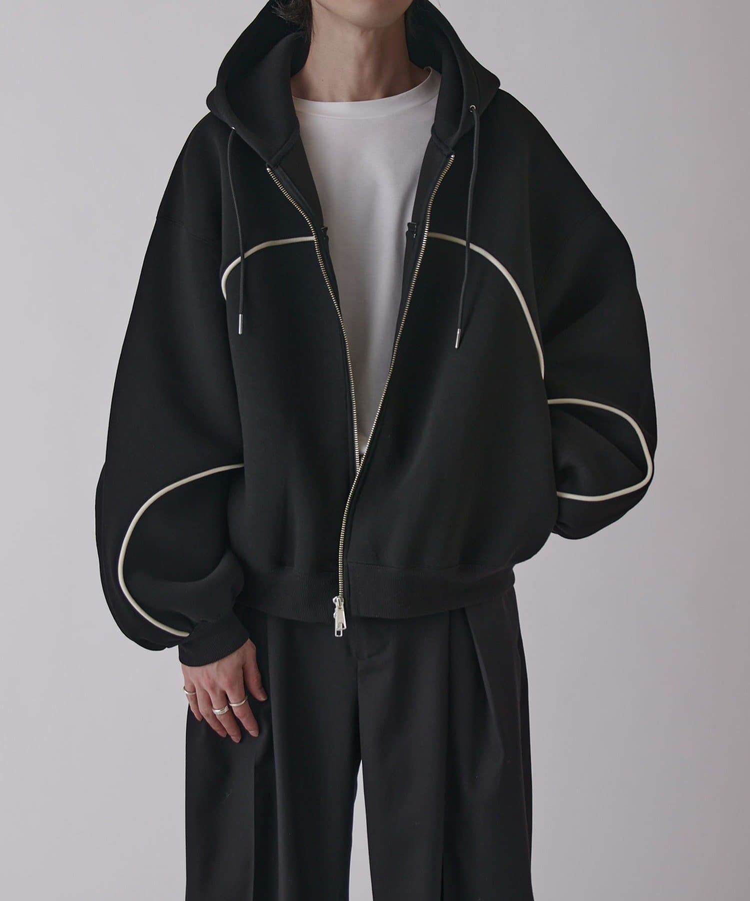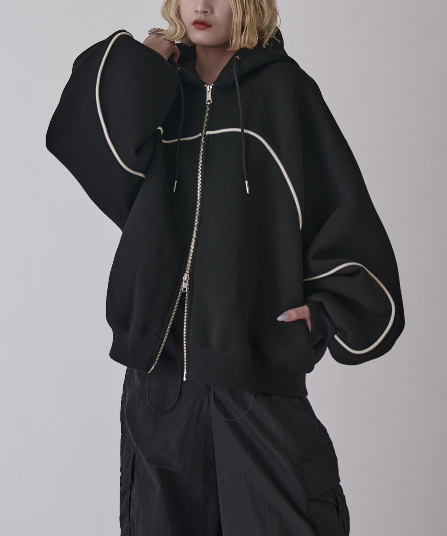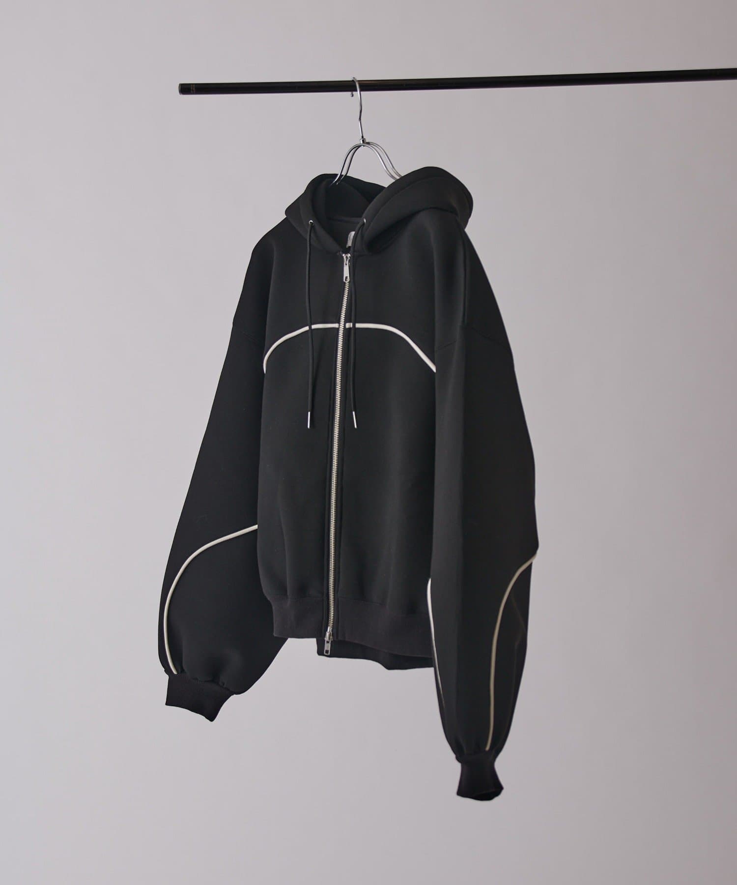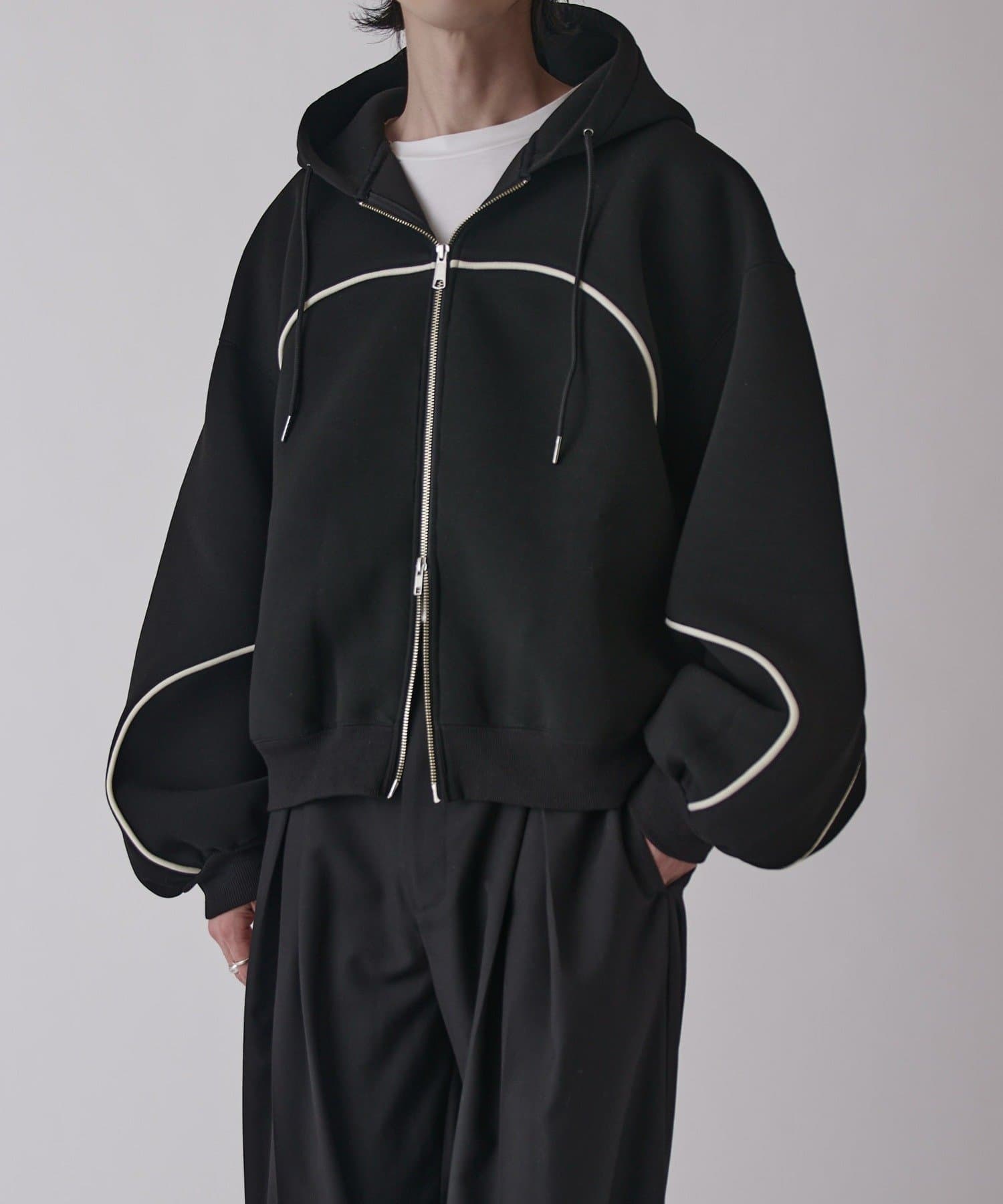 ・シンプルなデザインをベースに、大袈裟なシルエットバランスとパイピングをアクセントに加えたZIPフーディー。