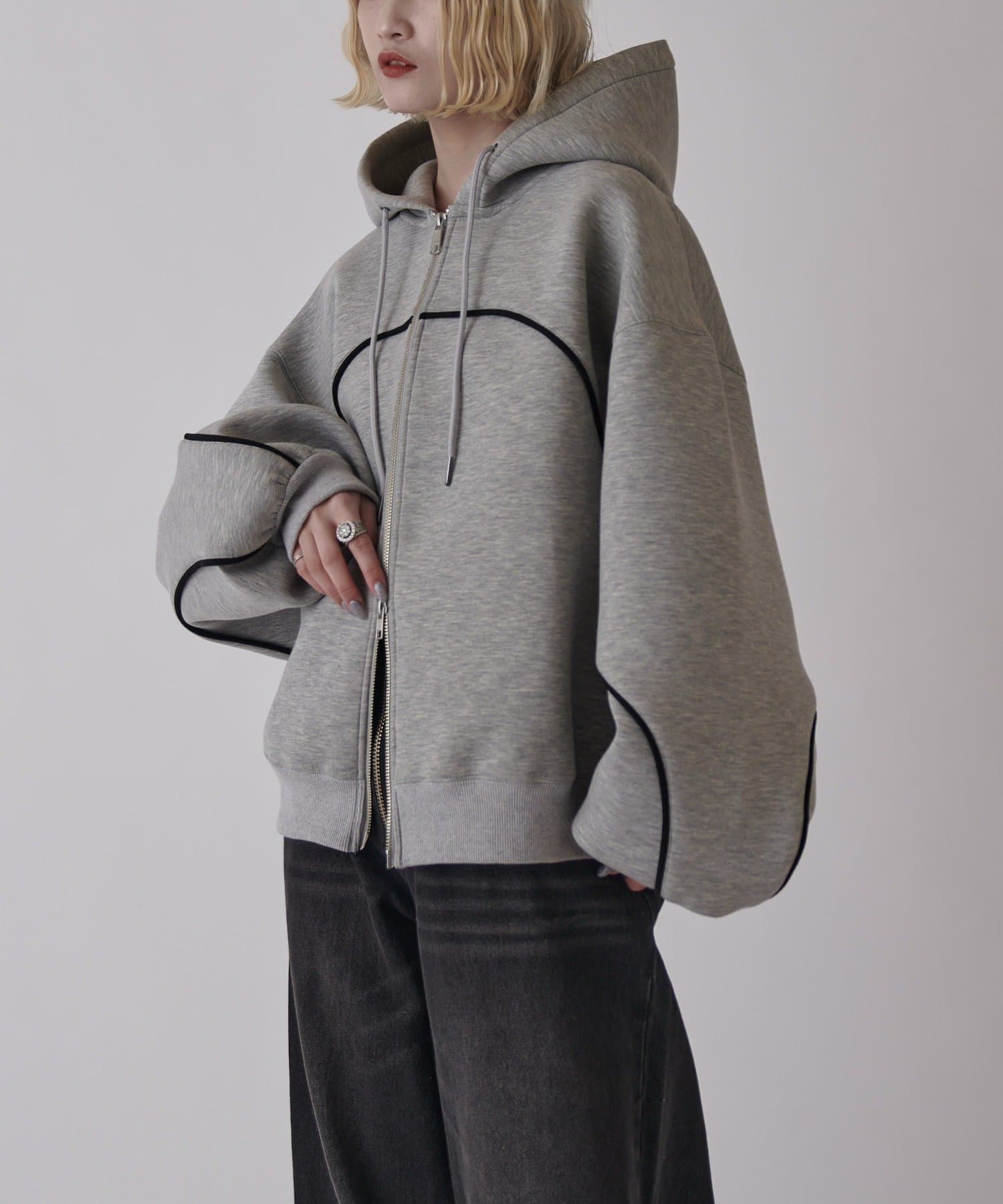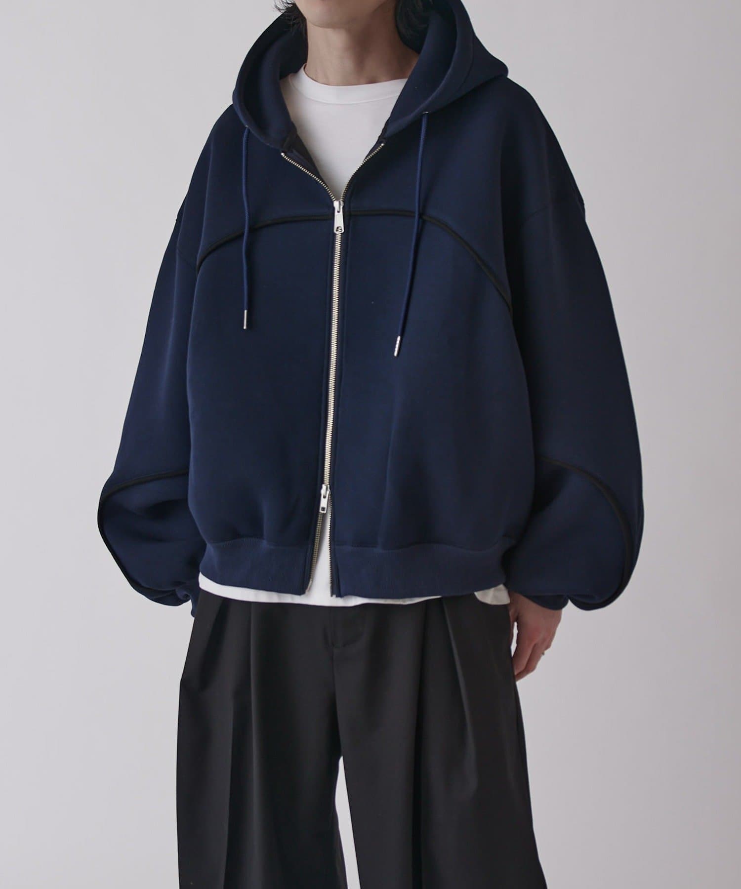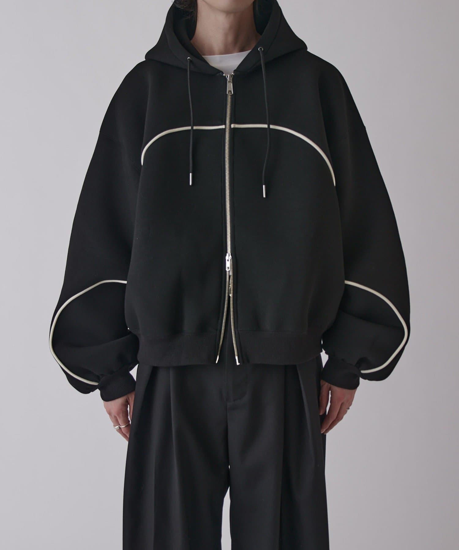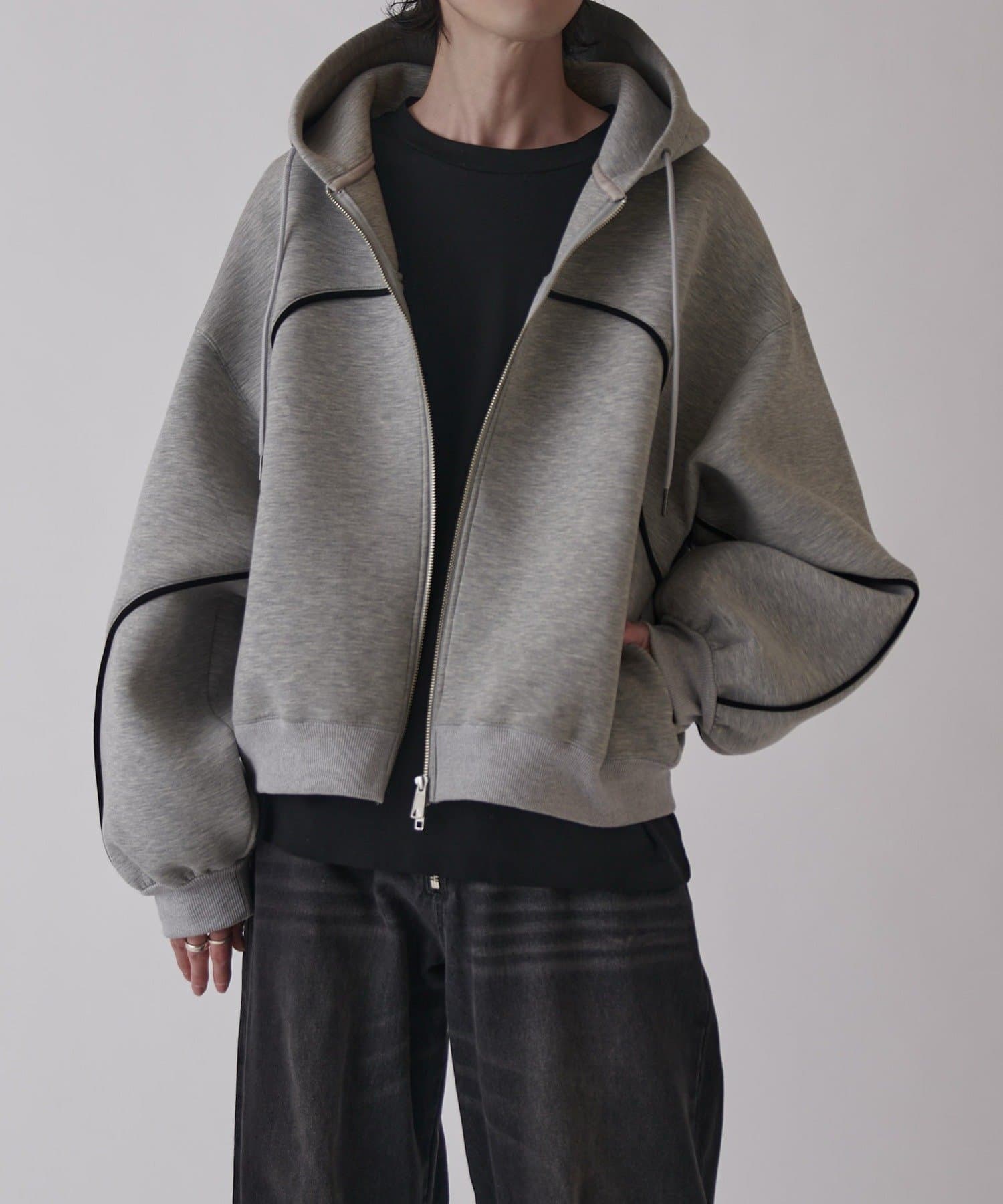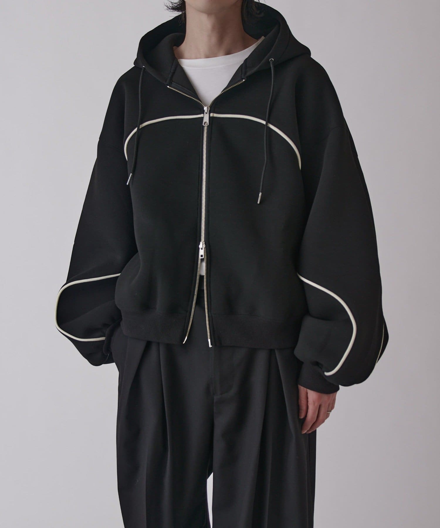 ・シンプルなデザインをベースに、大袈裟なシルエットバランスとパイピングをアクセントに加えたZIPフーディー。