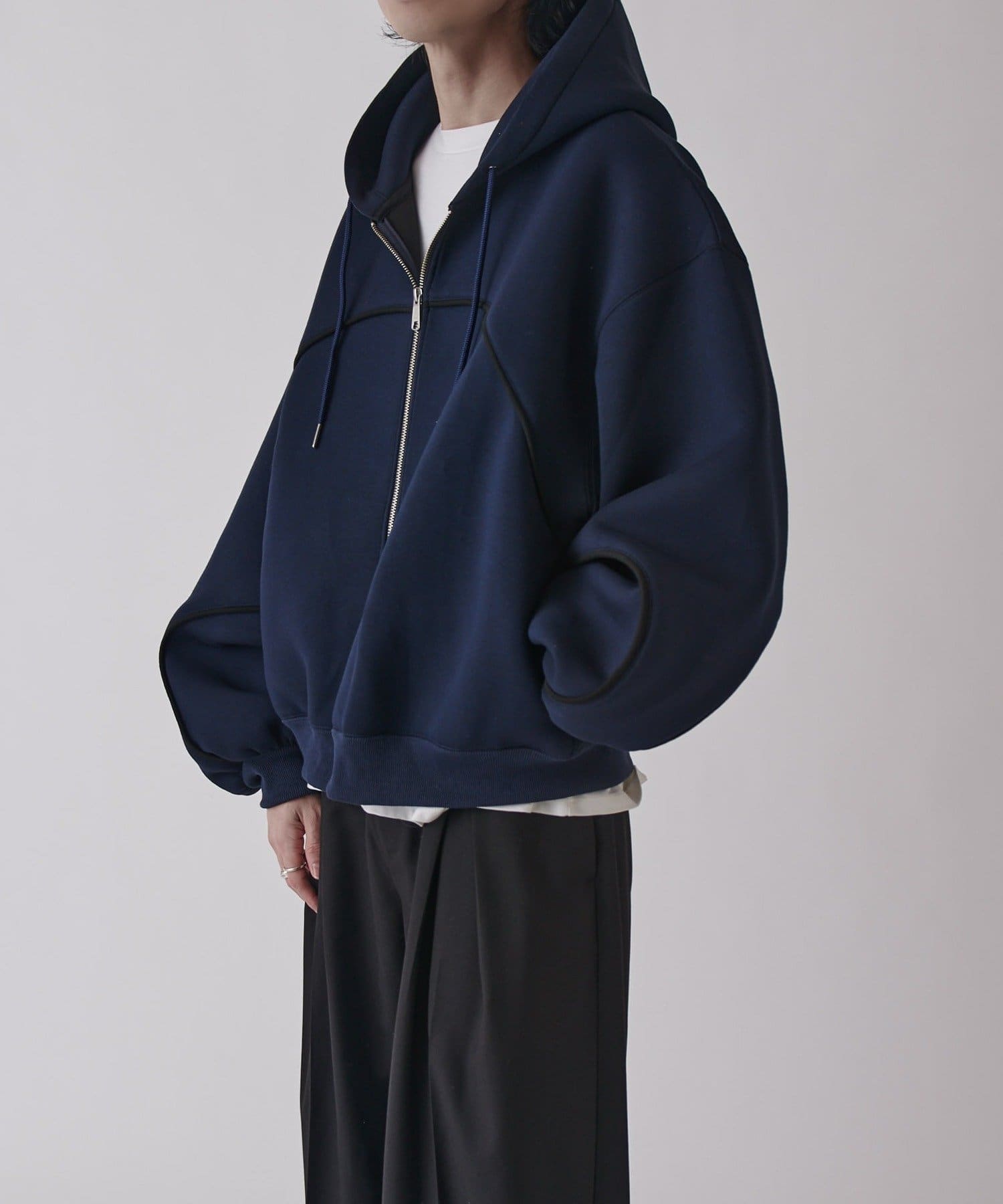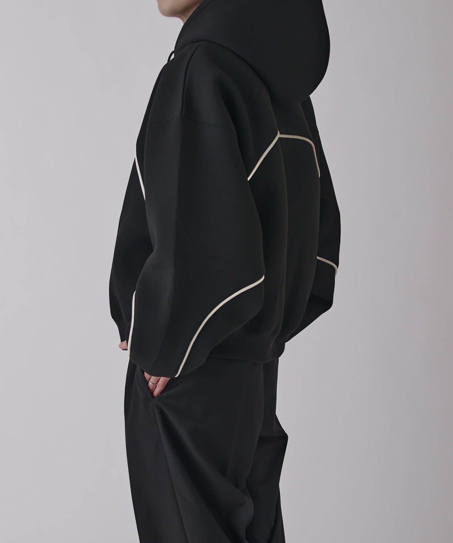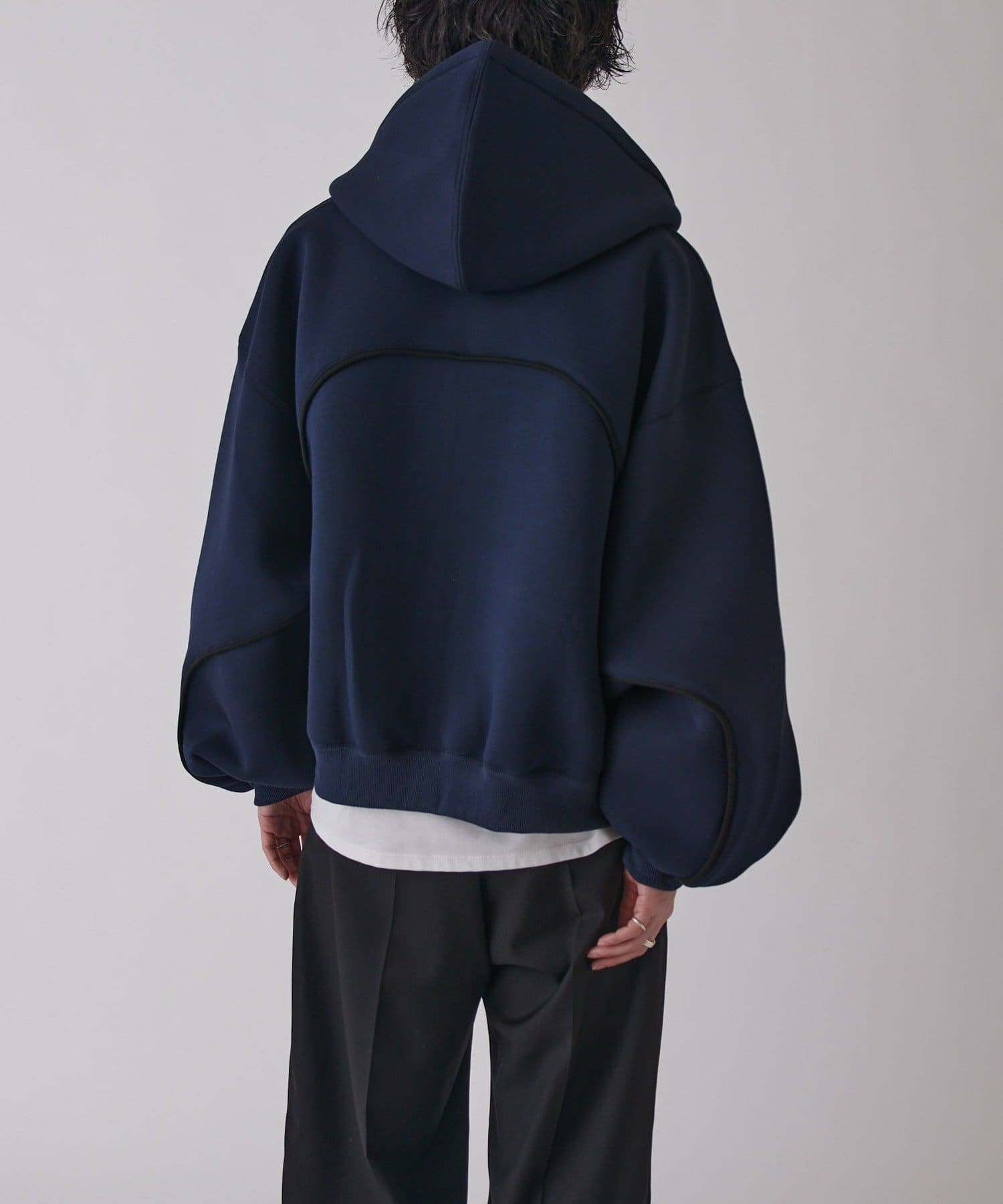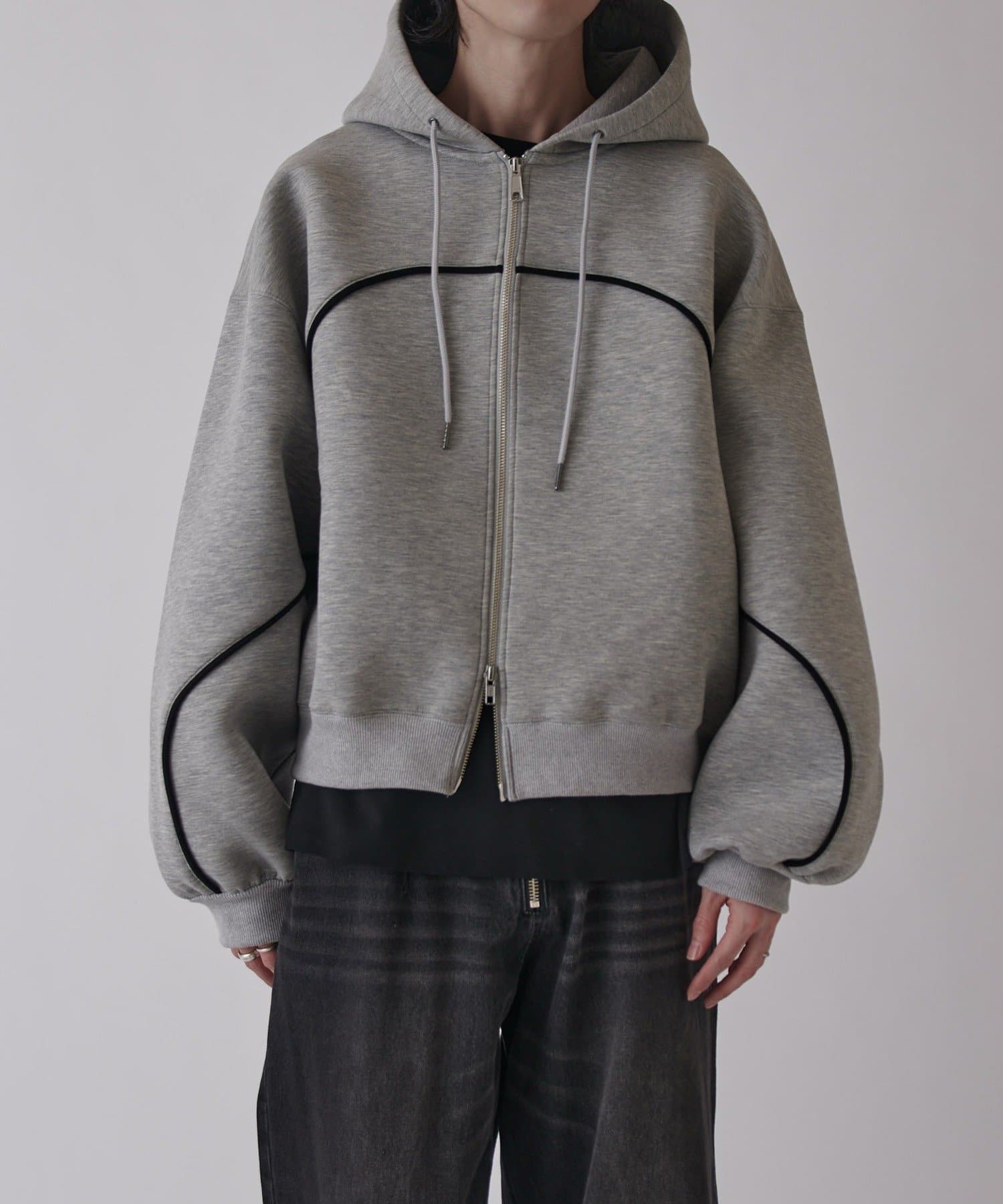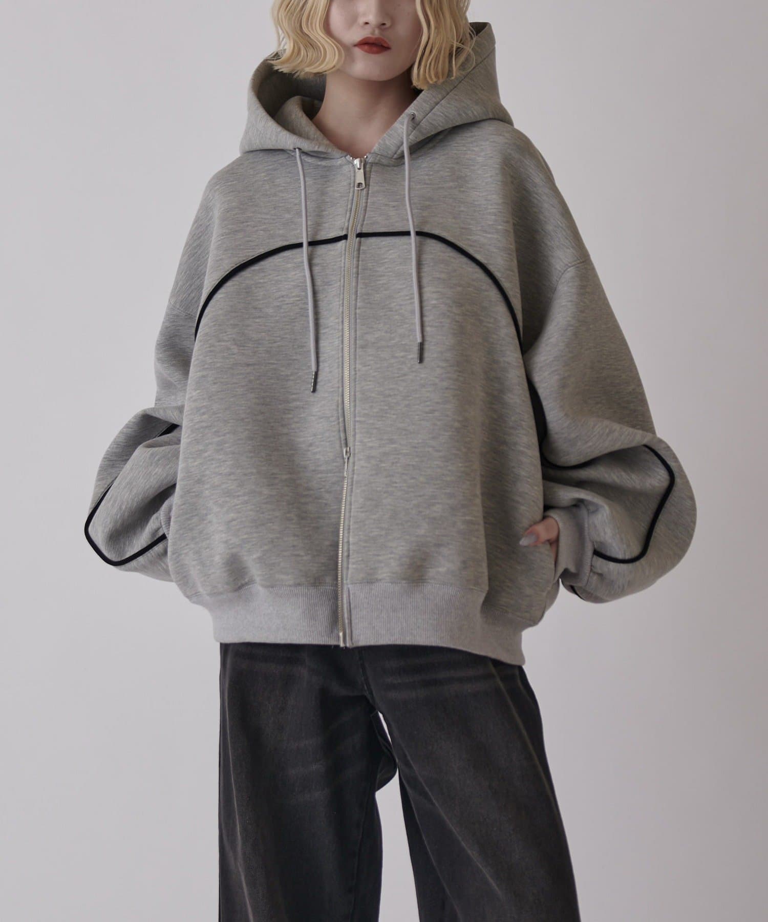 ・シンプルなデザインをベースに、大袈裟なシルエットバランスとパイピングをアクセントに加えたZIPフーディー。