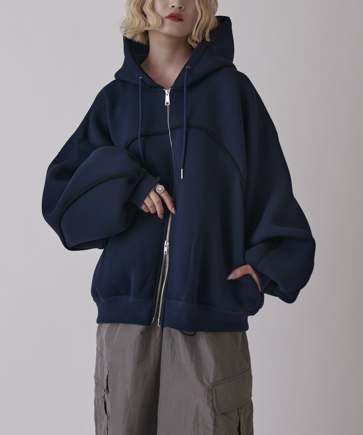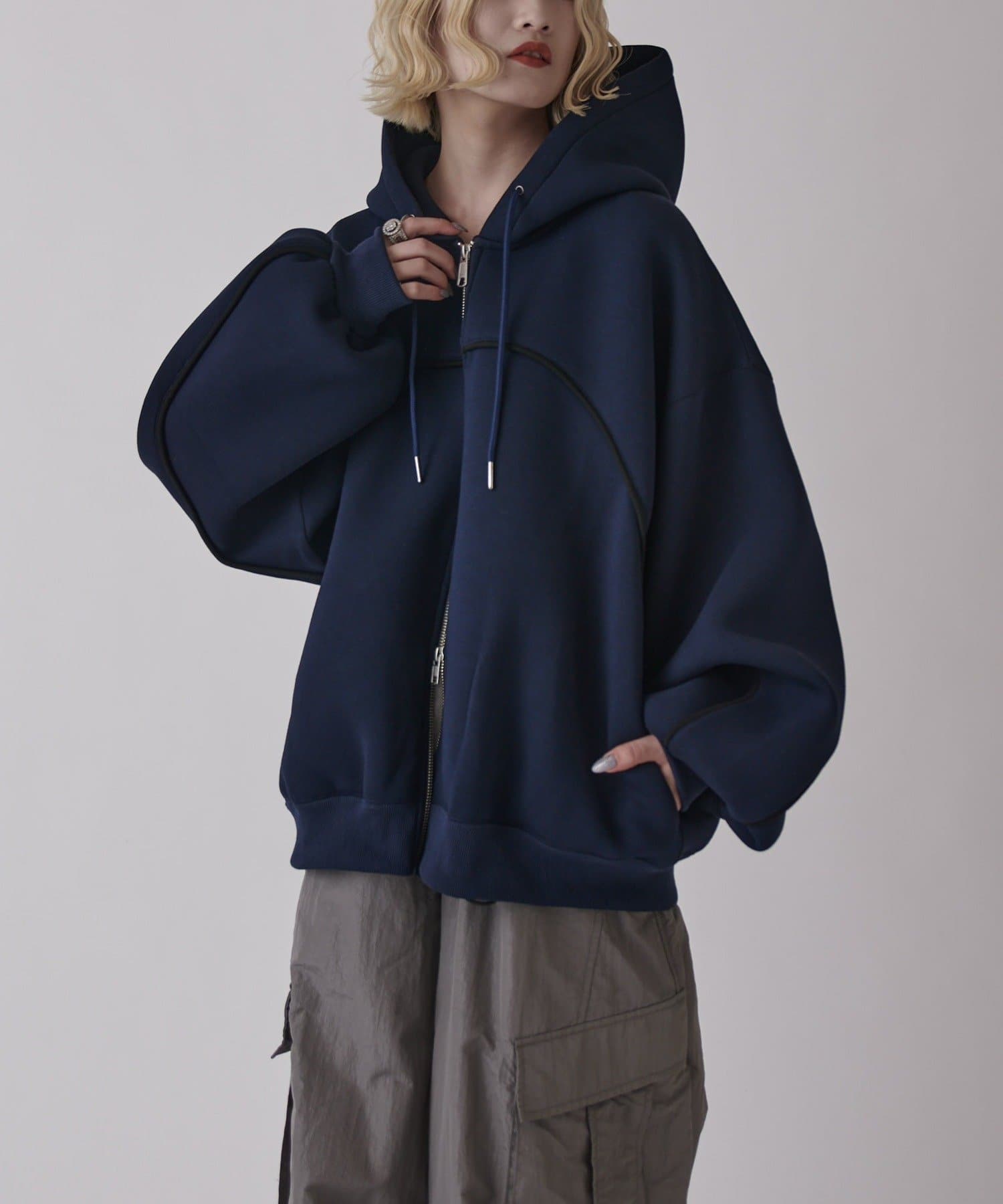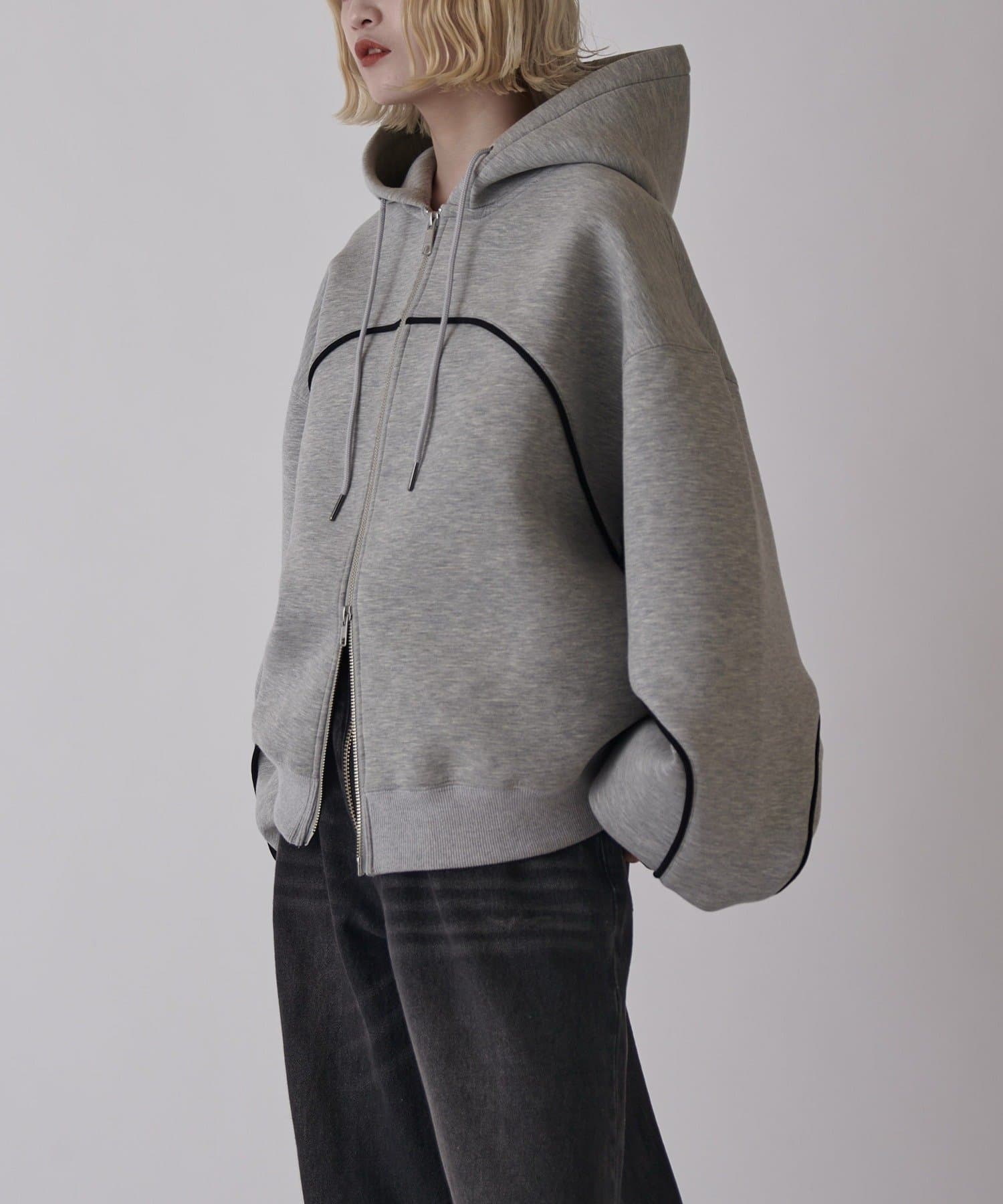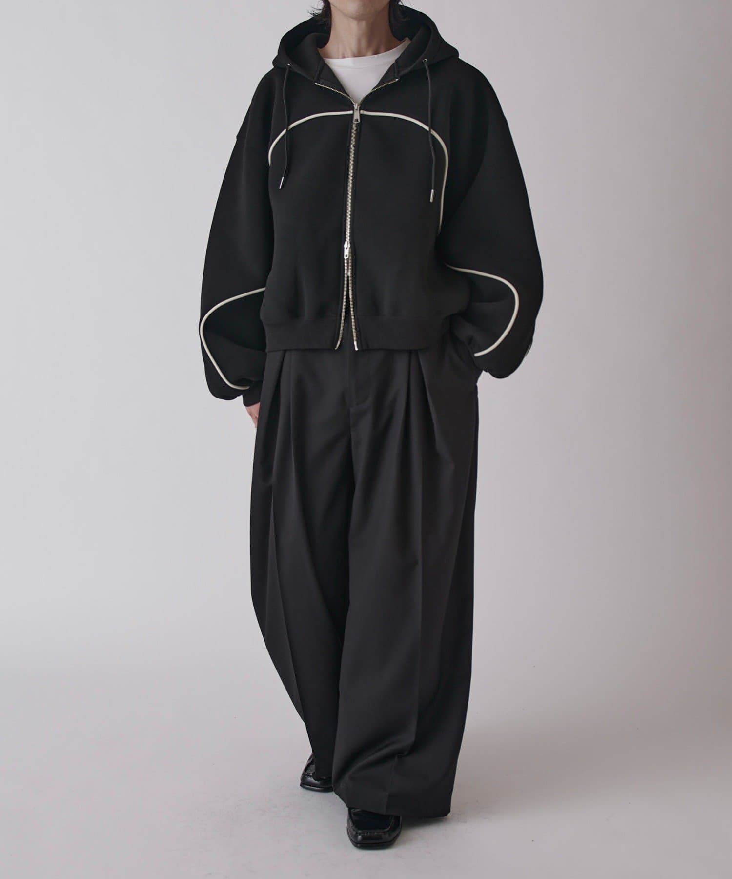 ・シンプルなデザインをベースに、大袈裟なシルエットバランスとパイピングをアクセントに加えたZIPフーディー。