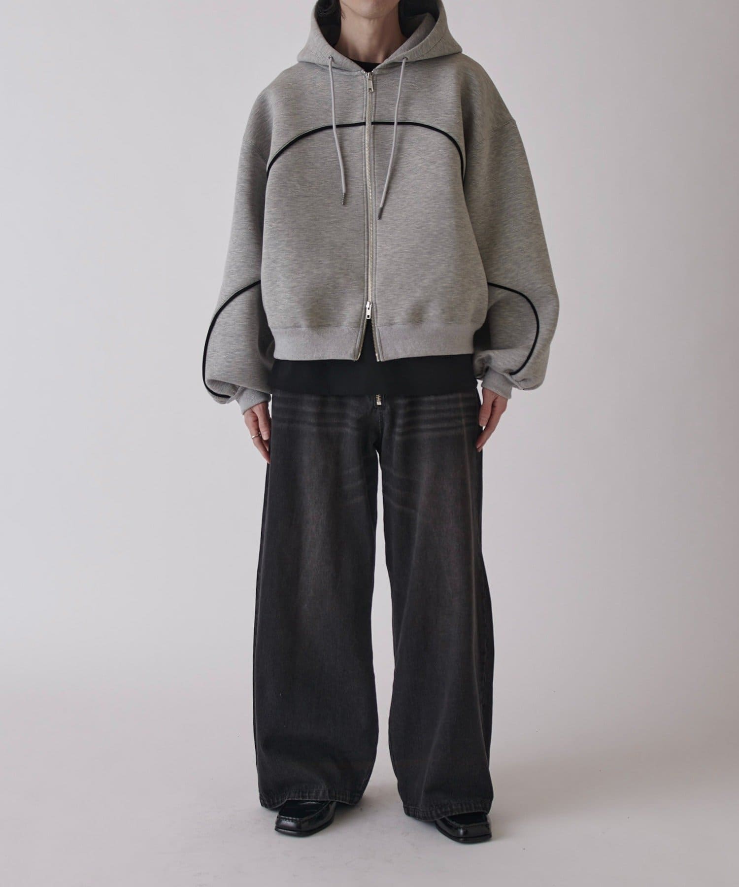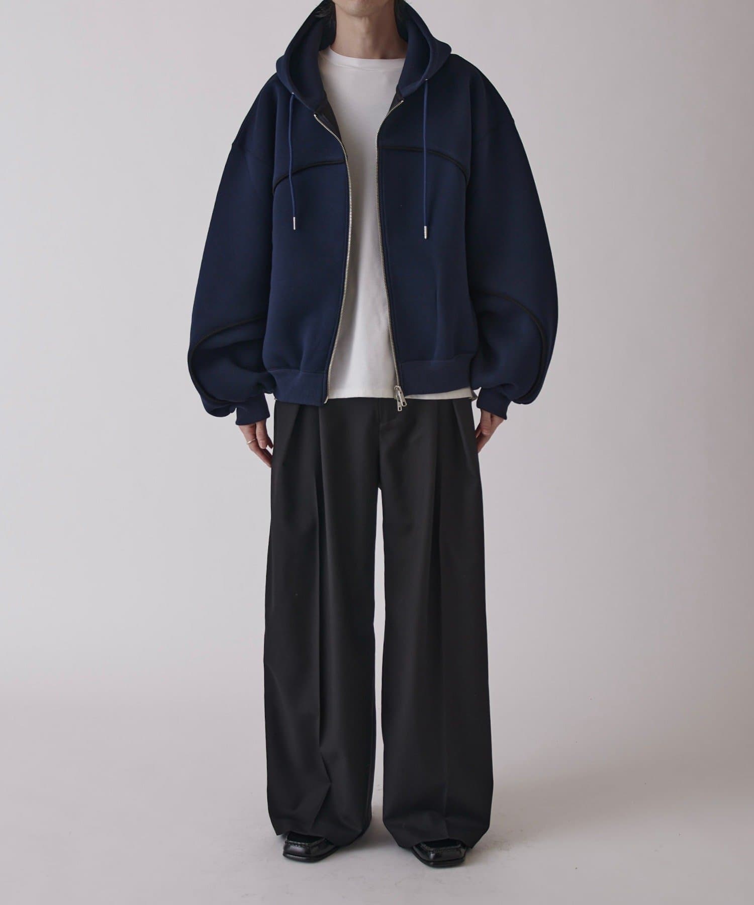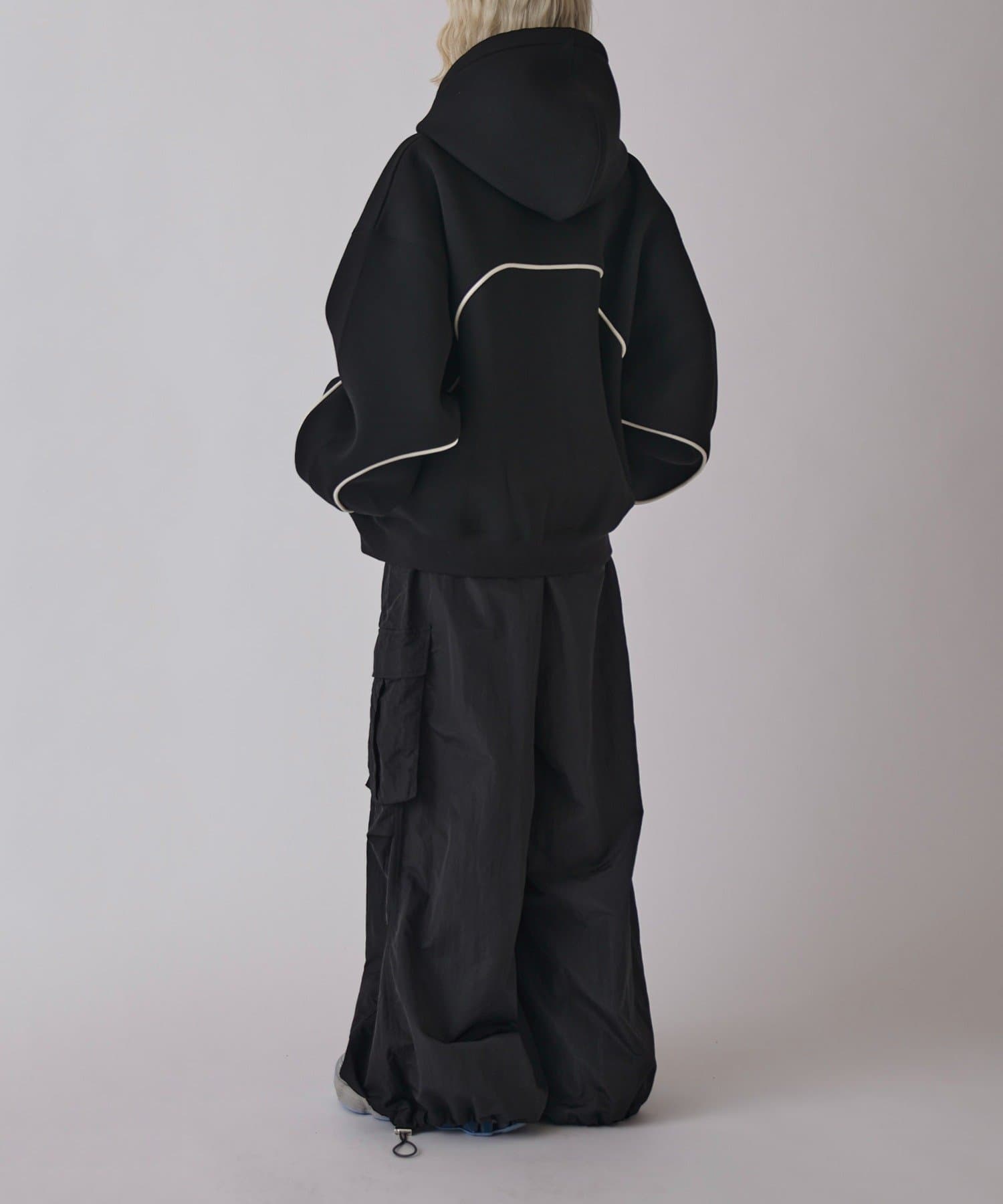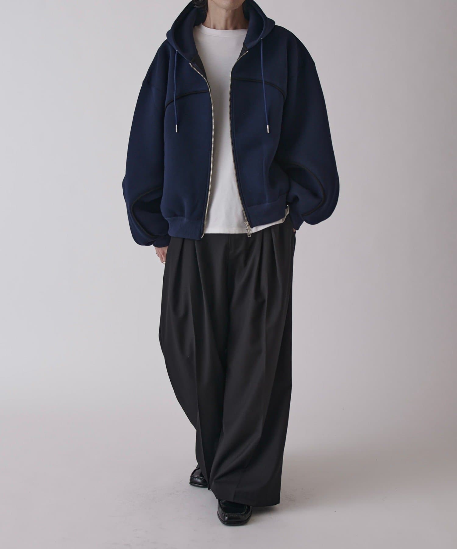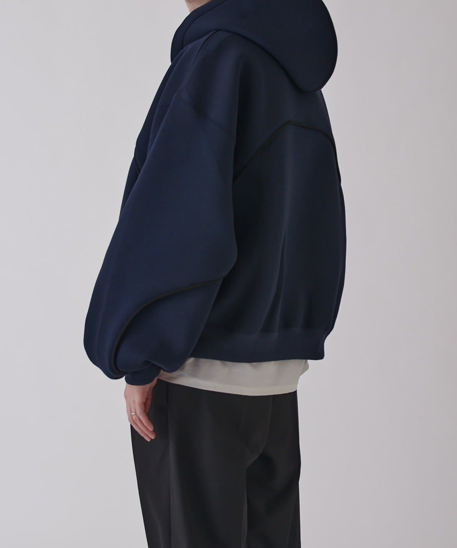 ・シンプルなデザインをベースに、大袈裟なシルエットバランスとパイピングをアクセントに加えたZIPフーディー。