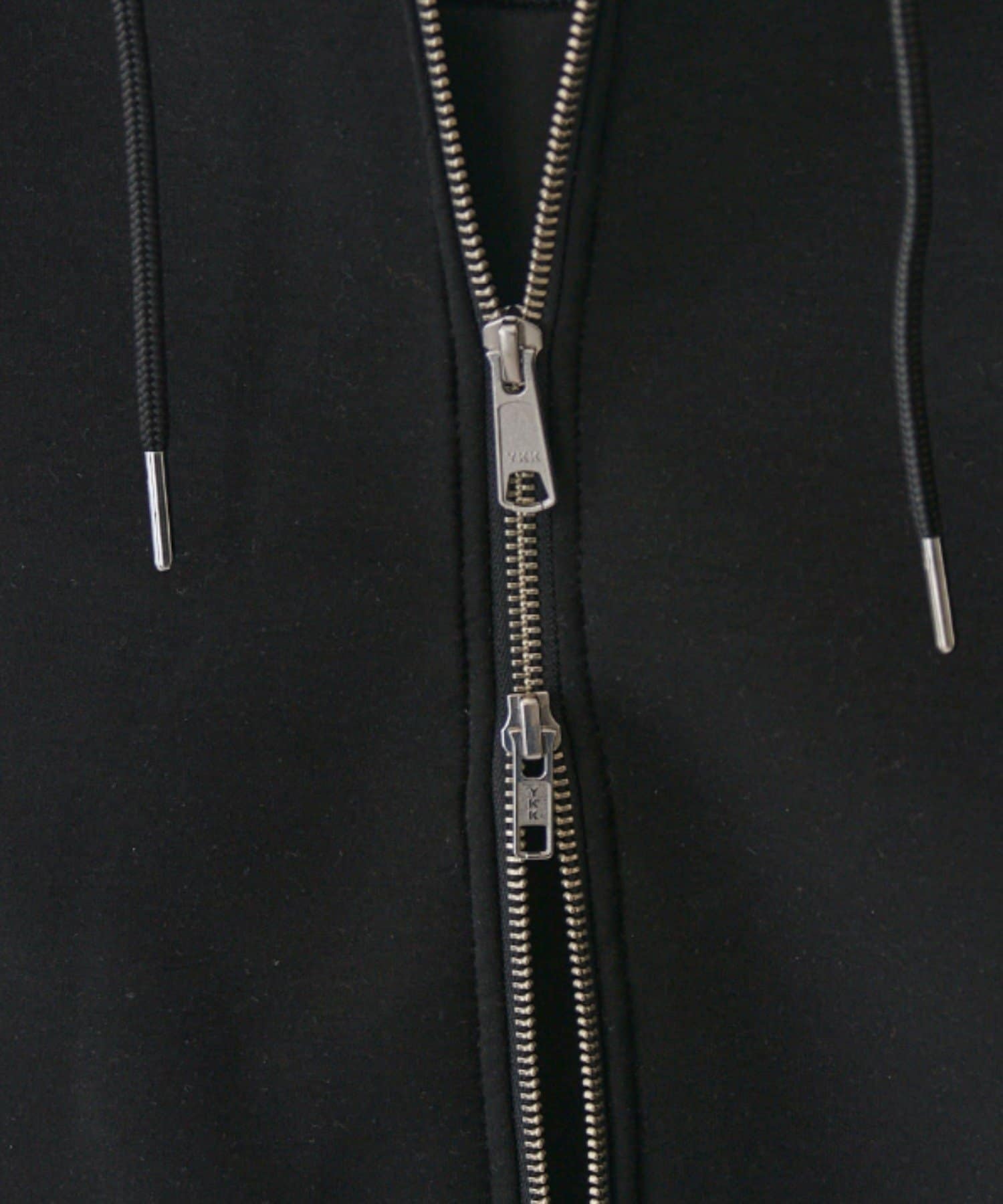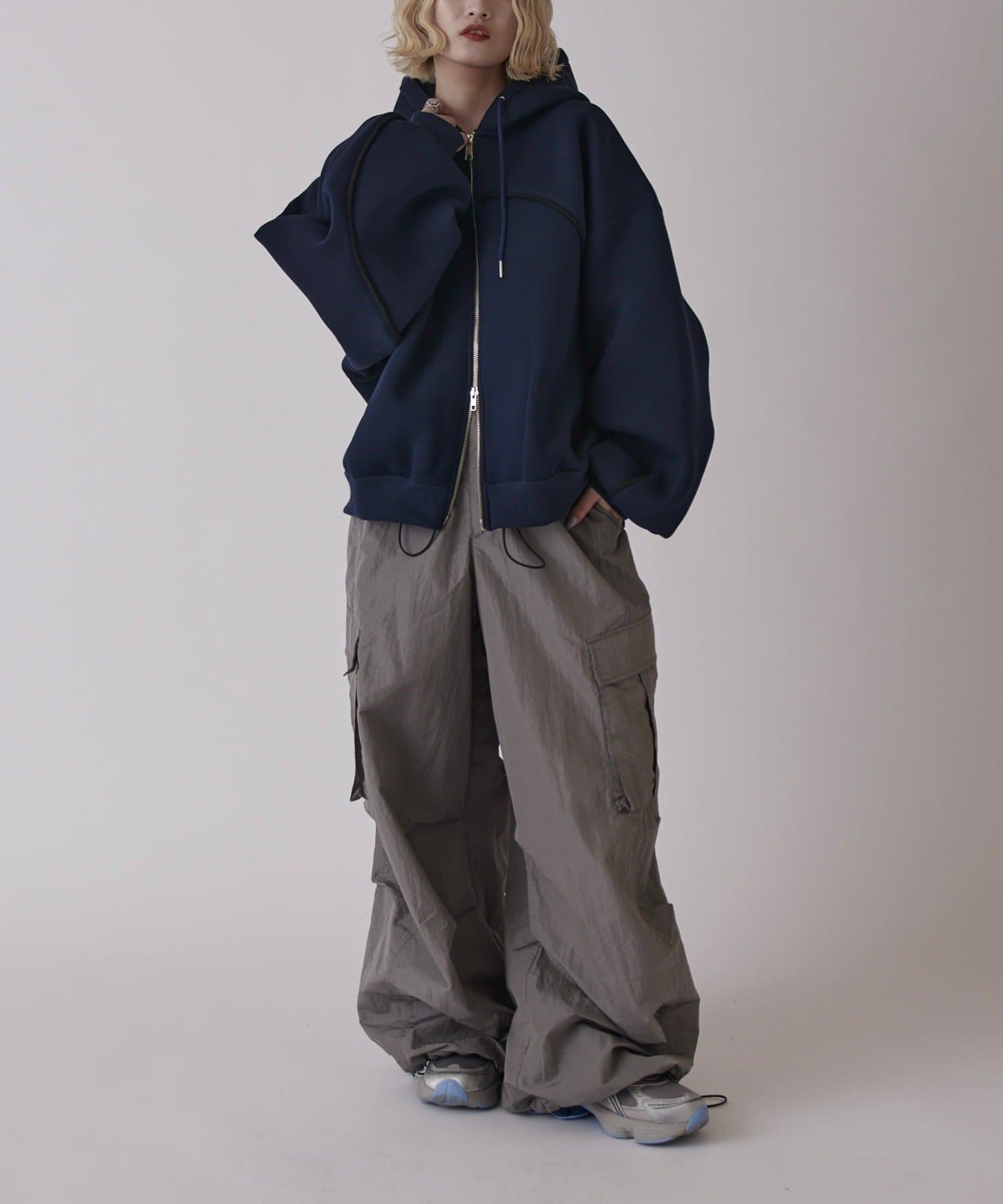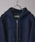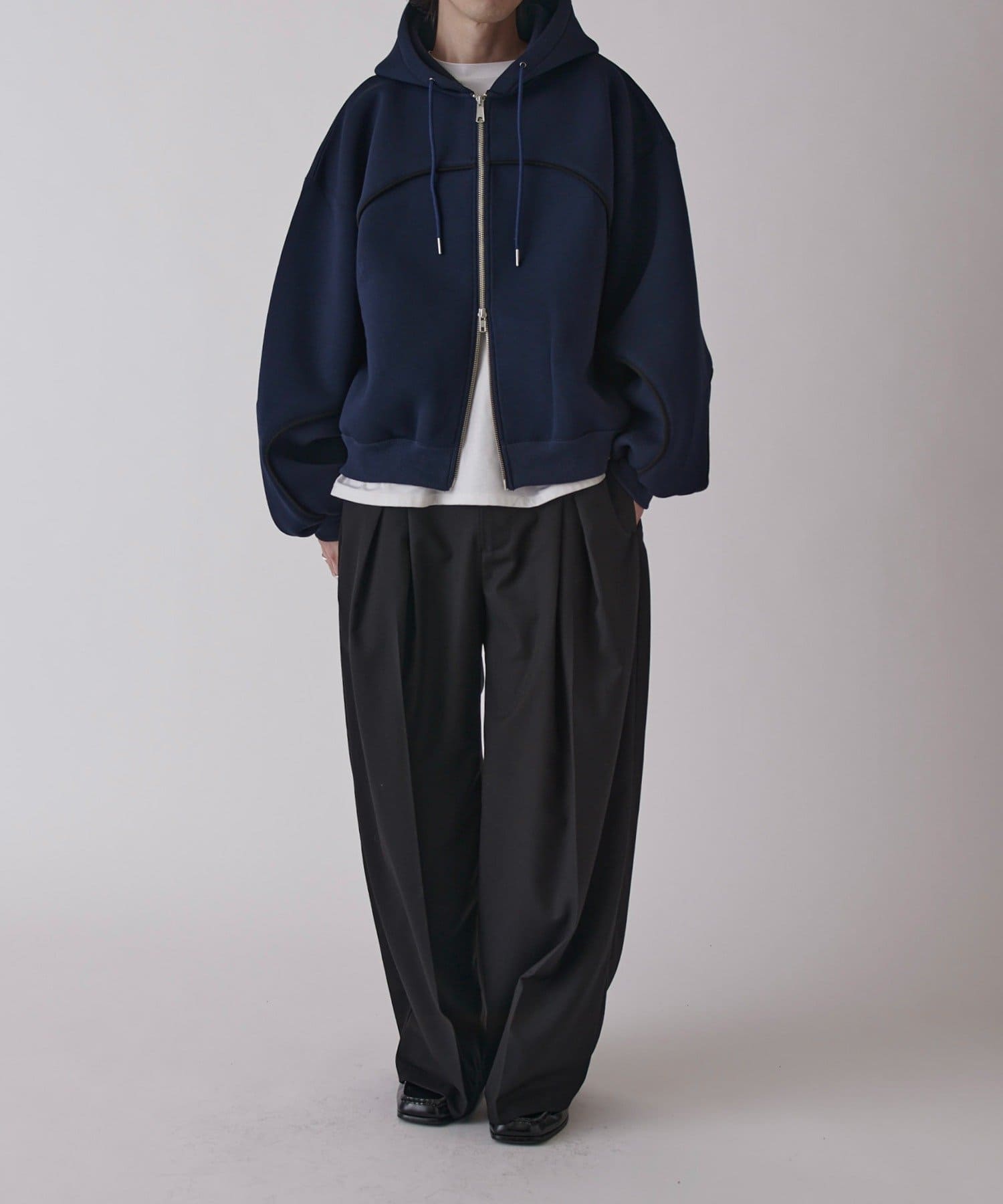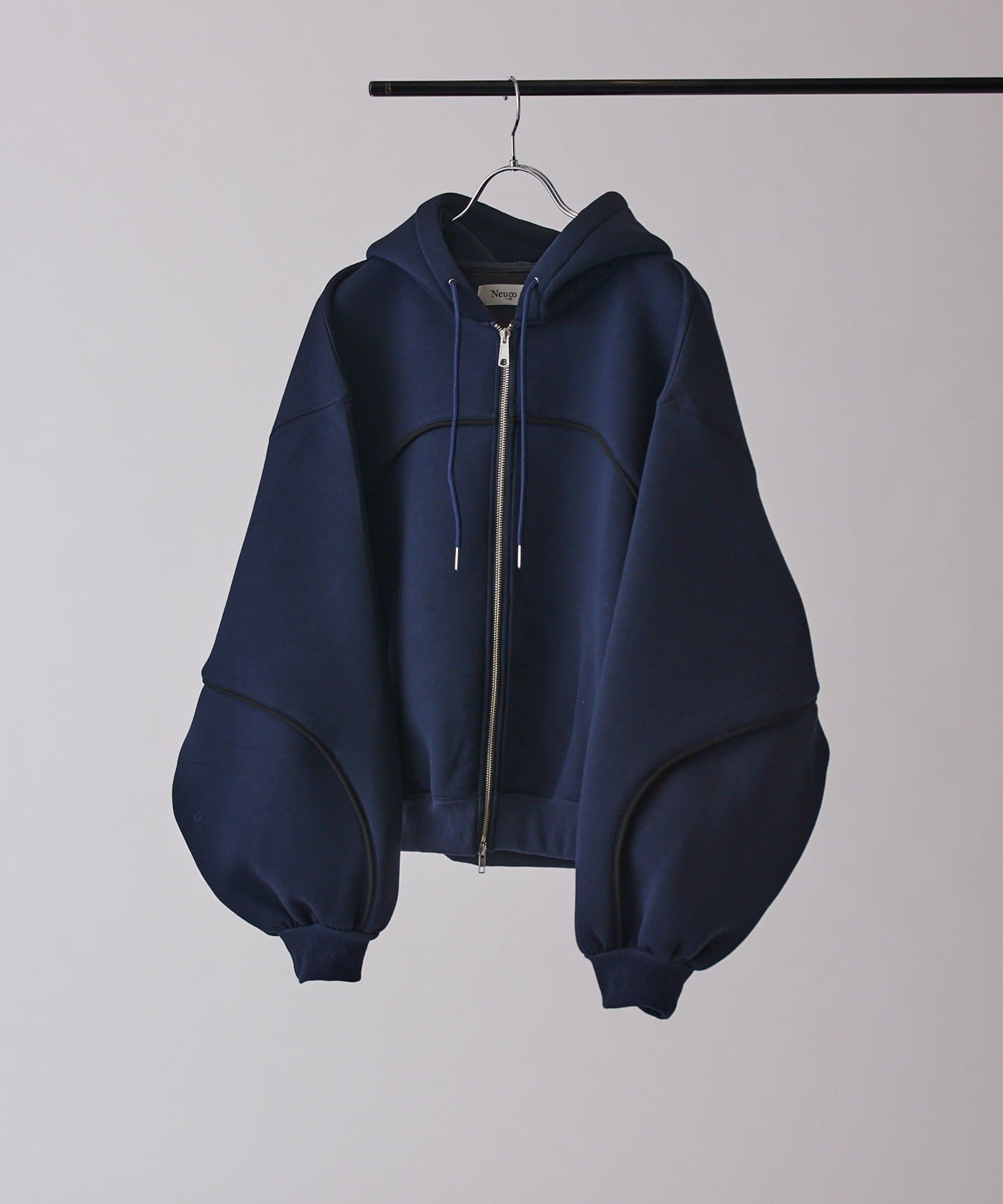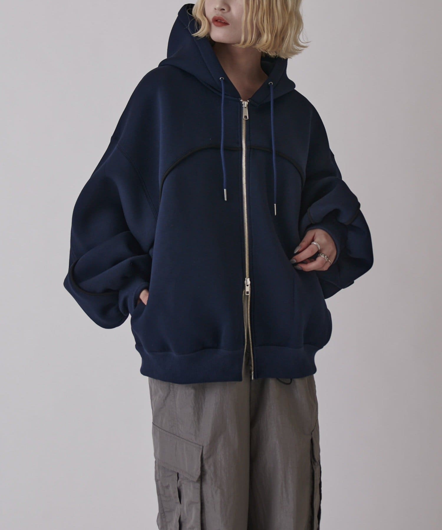 ・シンプルなデザインをベースに、大袈裟なシルエットバランスとパイピングをアクセントに加えたZIPフーディー。
