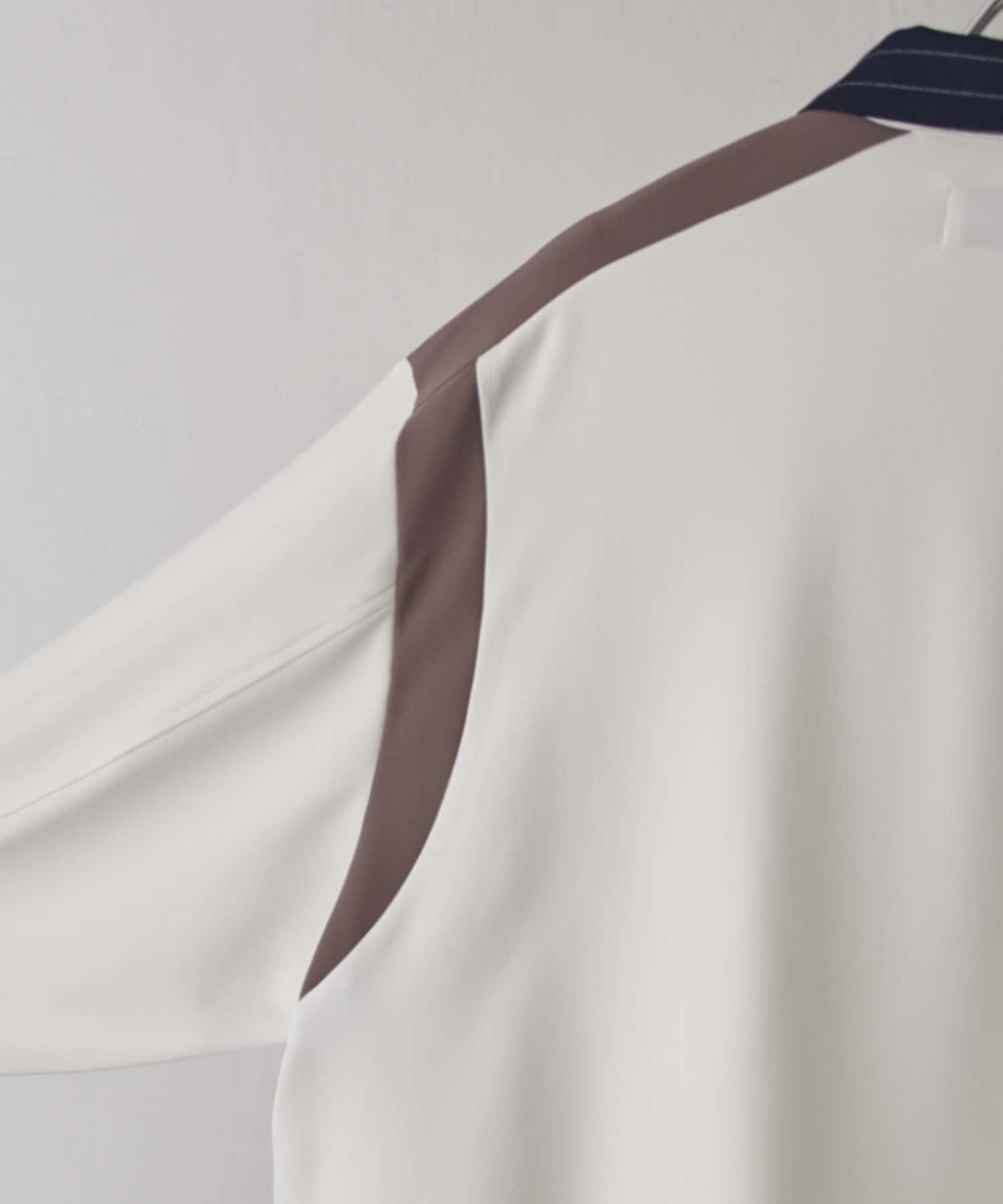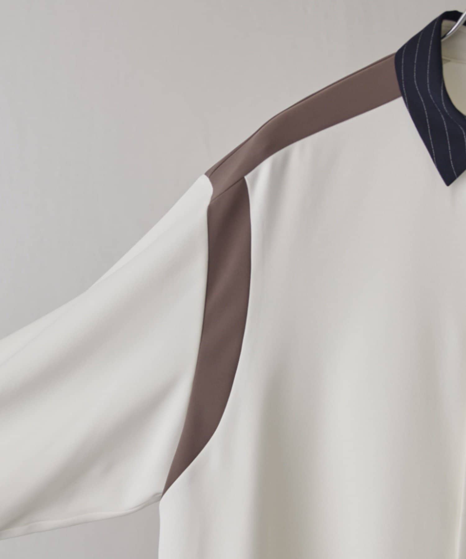 ショルダー部分の切替がポイントのシャツ。襟はストライプ切替になっており、上品で大人な雰囲気を演出しております。