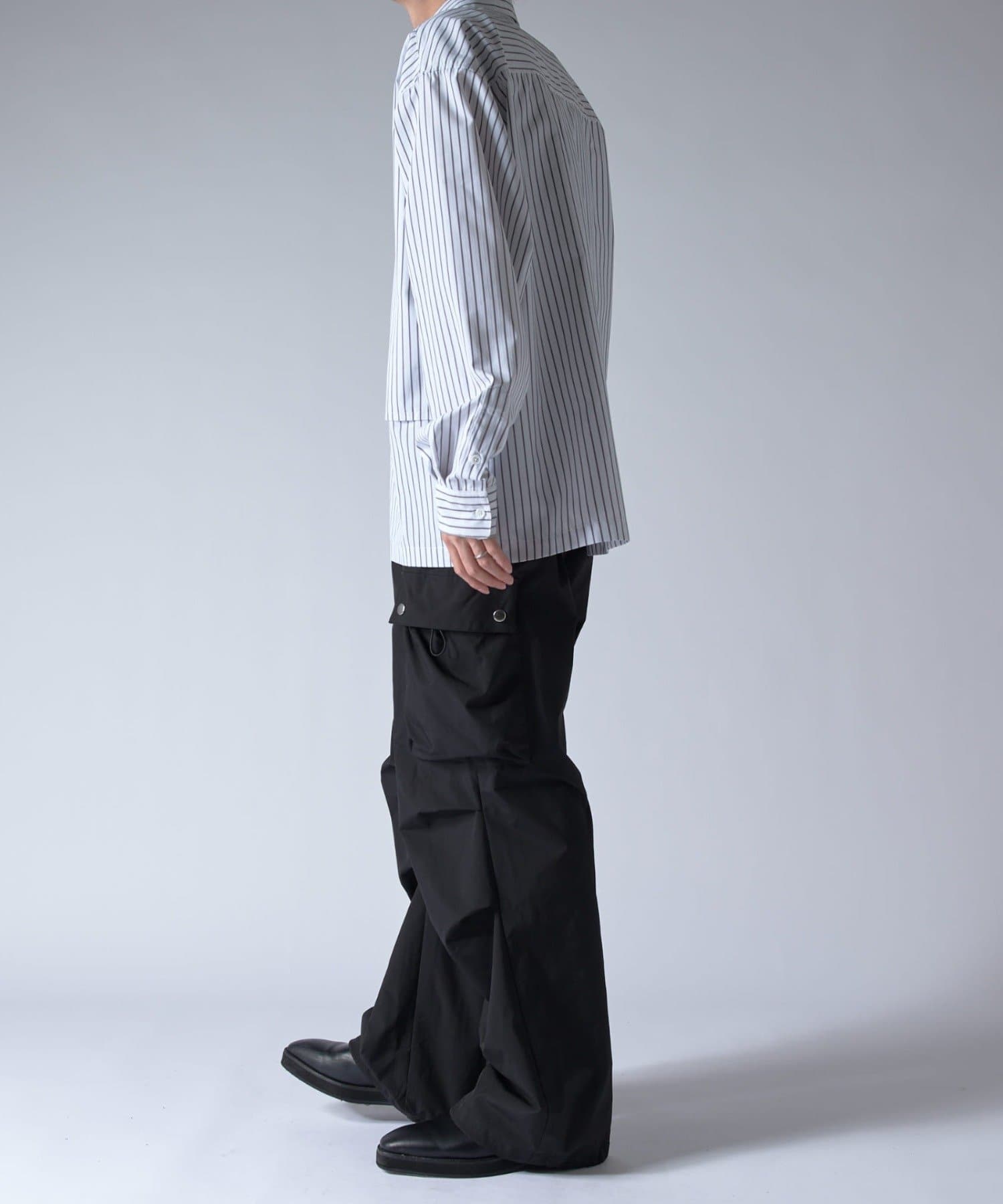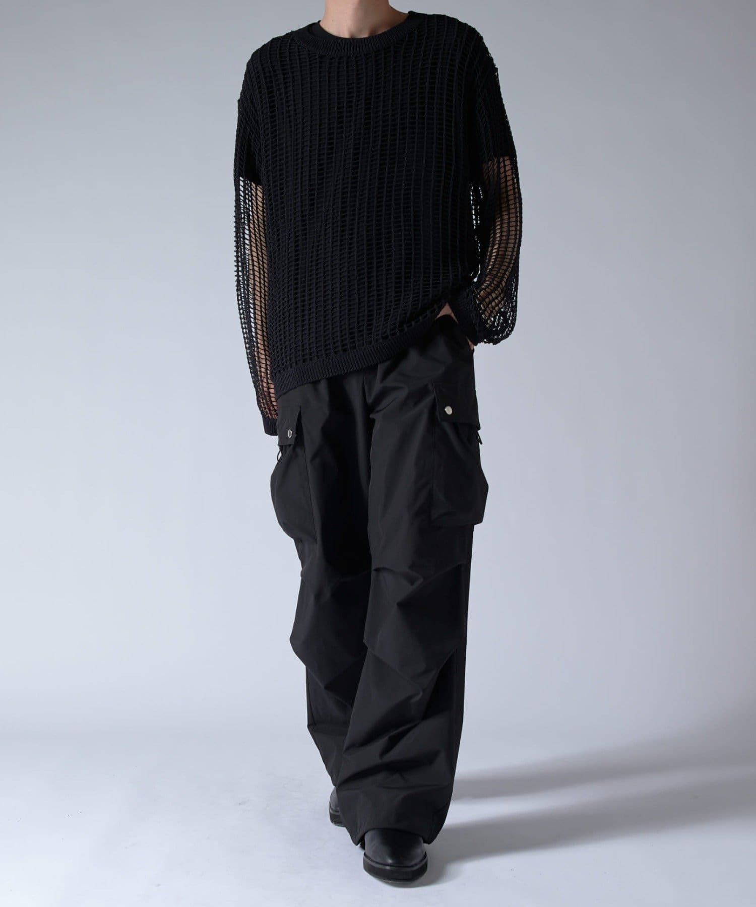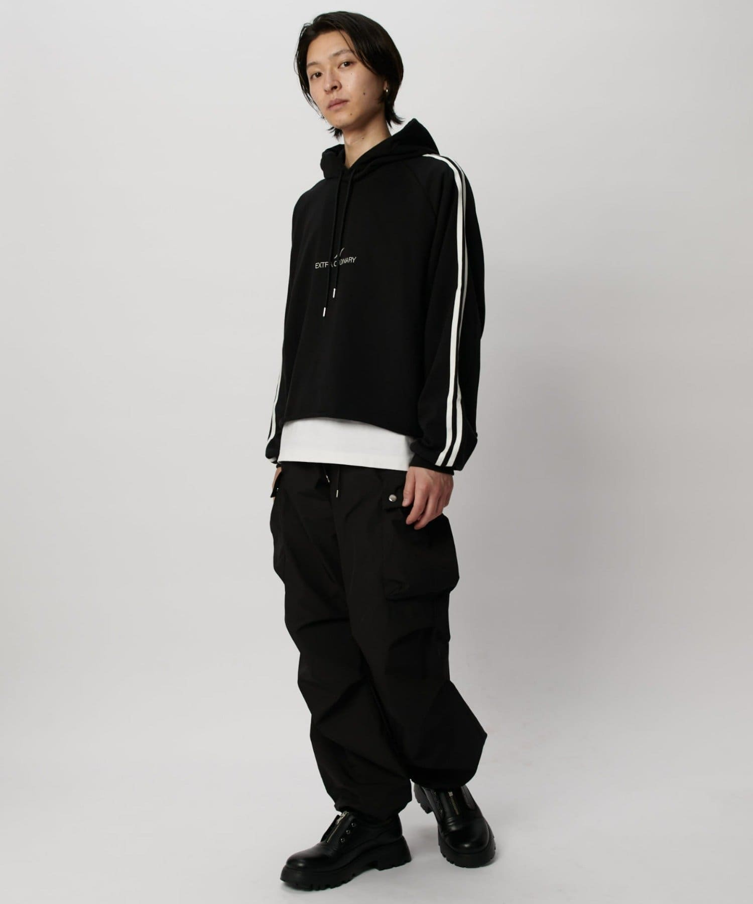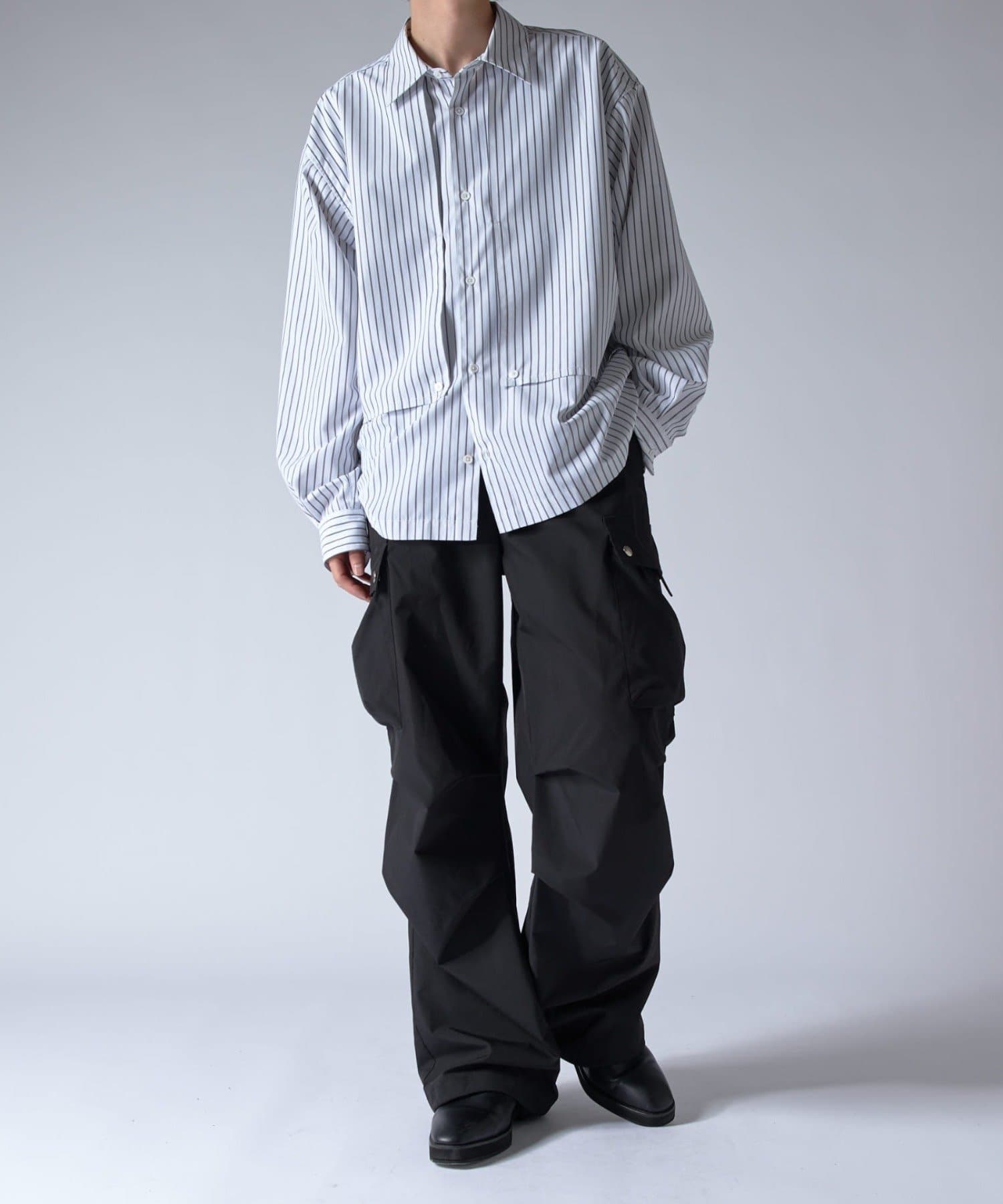 サイドのカーゴポケットは、ドローコードで調節できるユニークなデザインに。裾にもドローコードを通しており、シルエットを調整して頂けます。