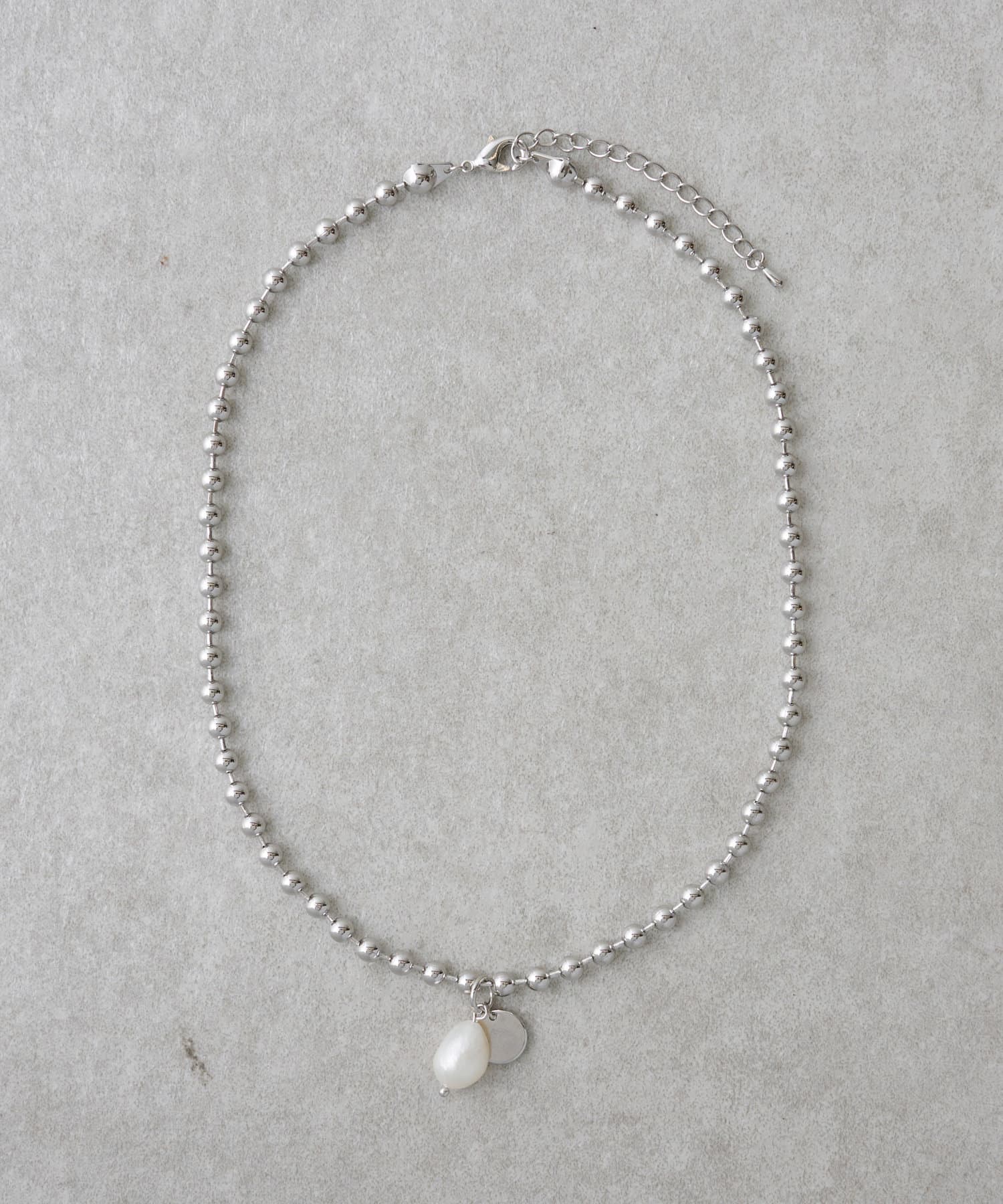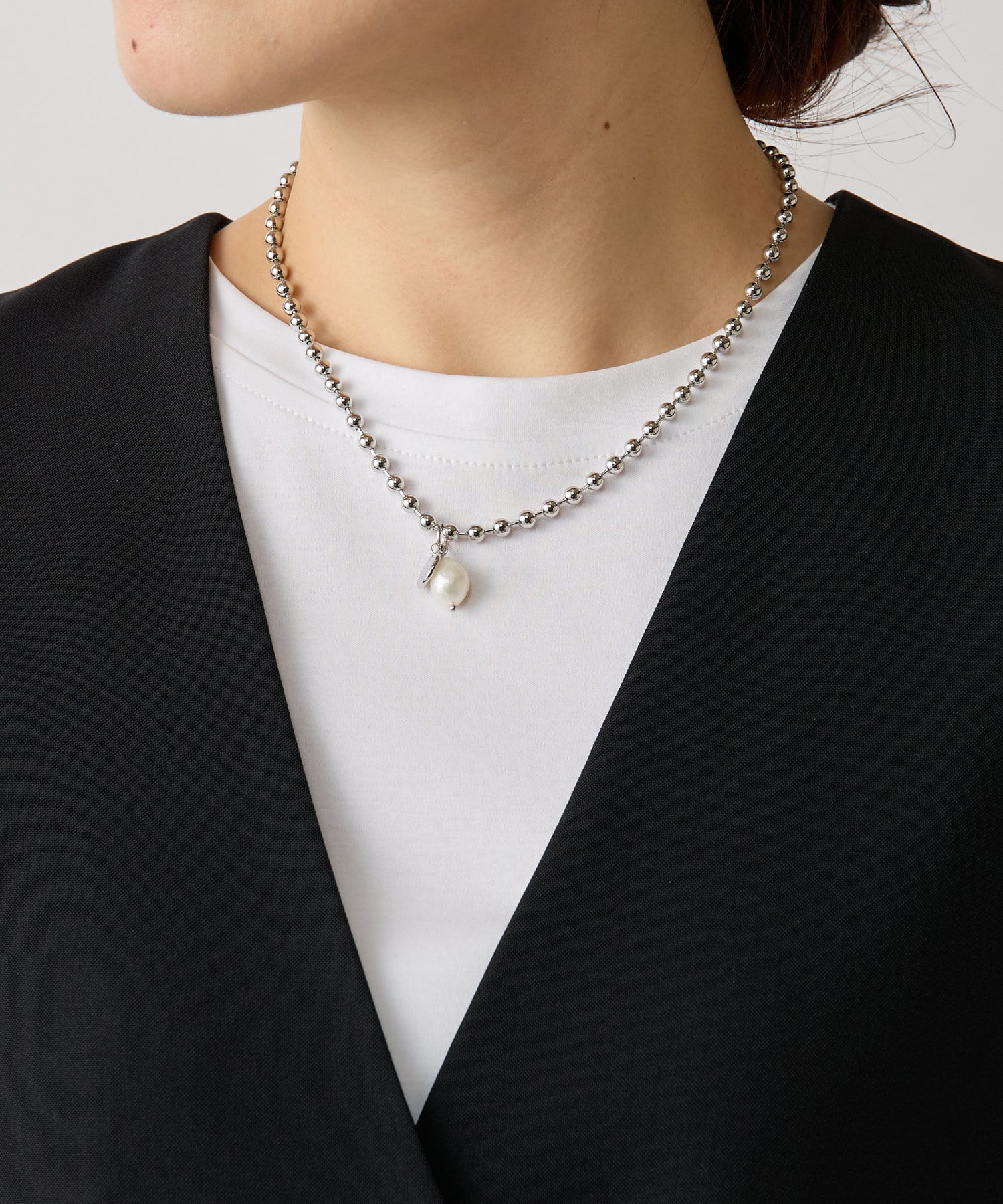 ややボリューム感のあるメタルボールと存在感のある淡水パールとプレートがアクセントのネックレス。