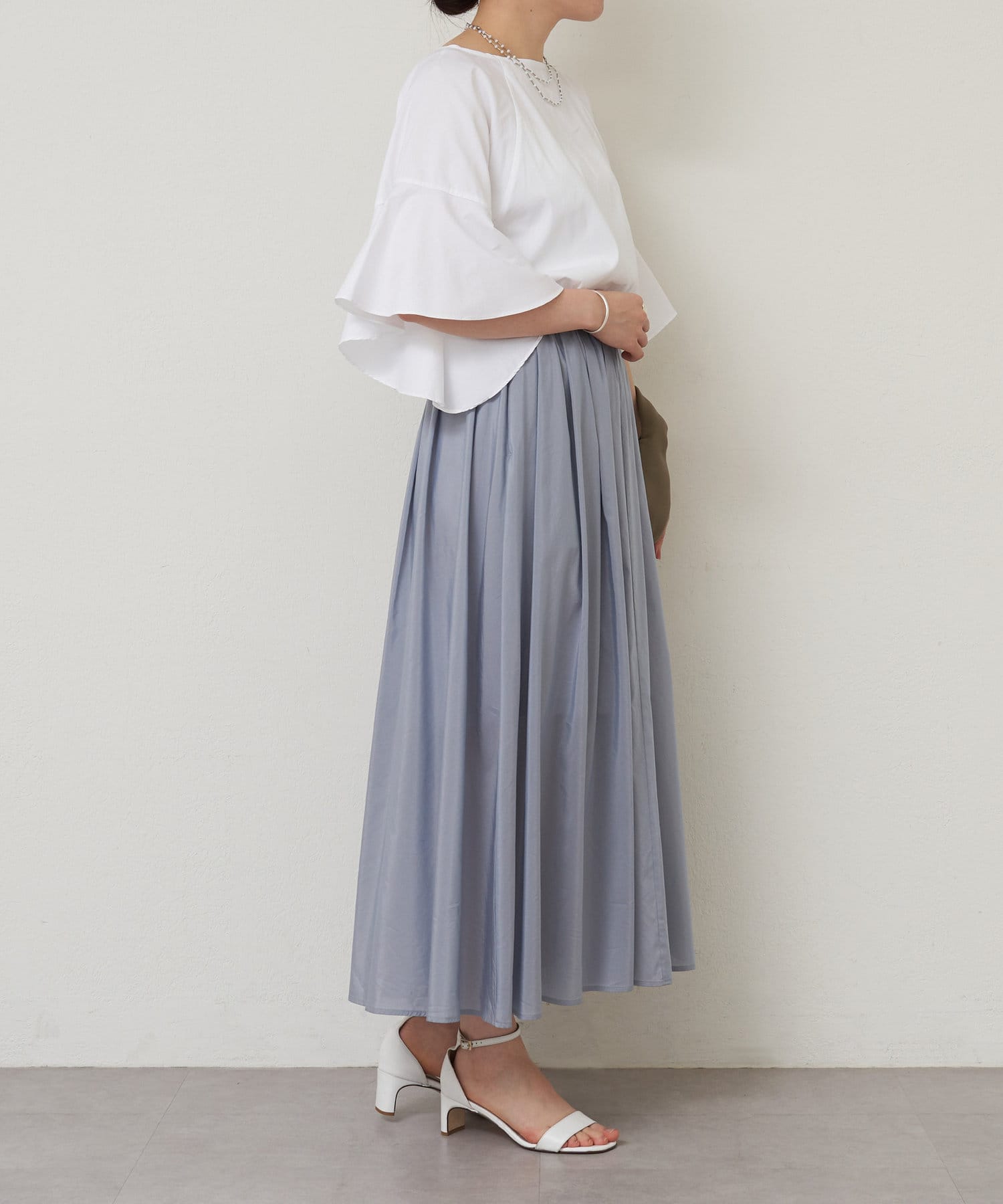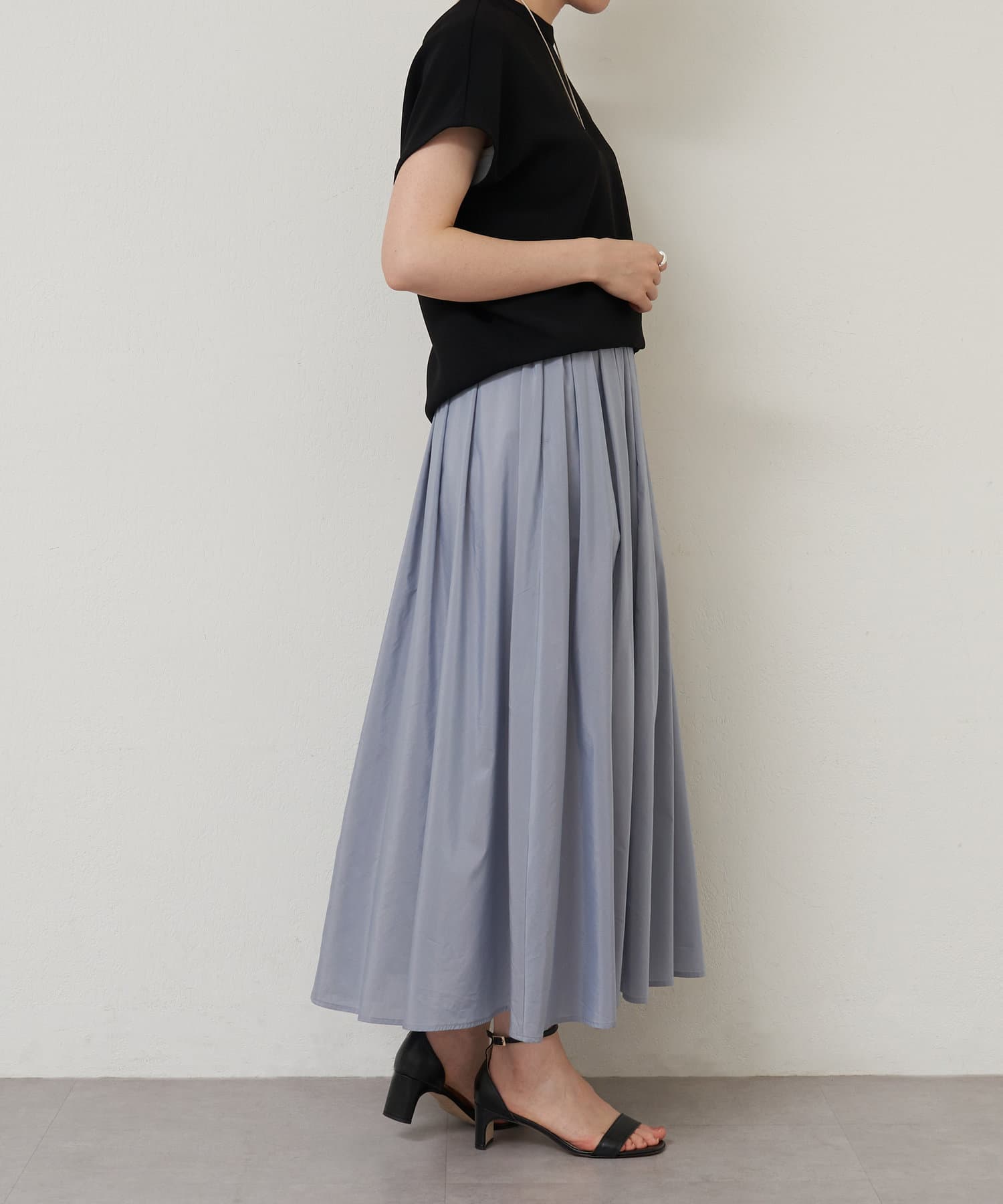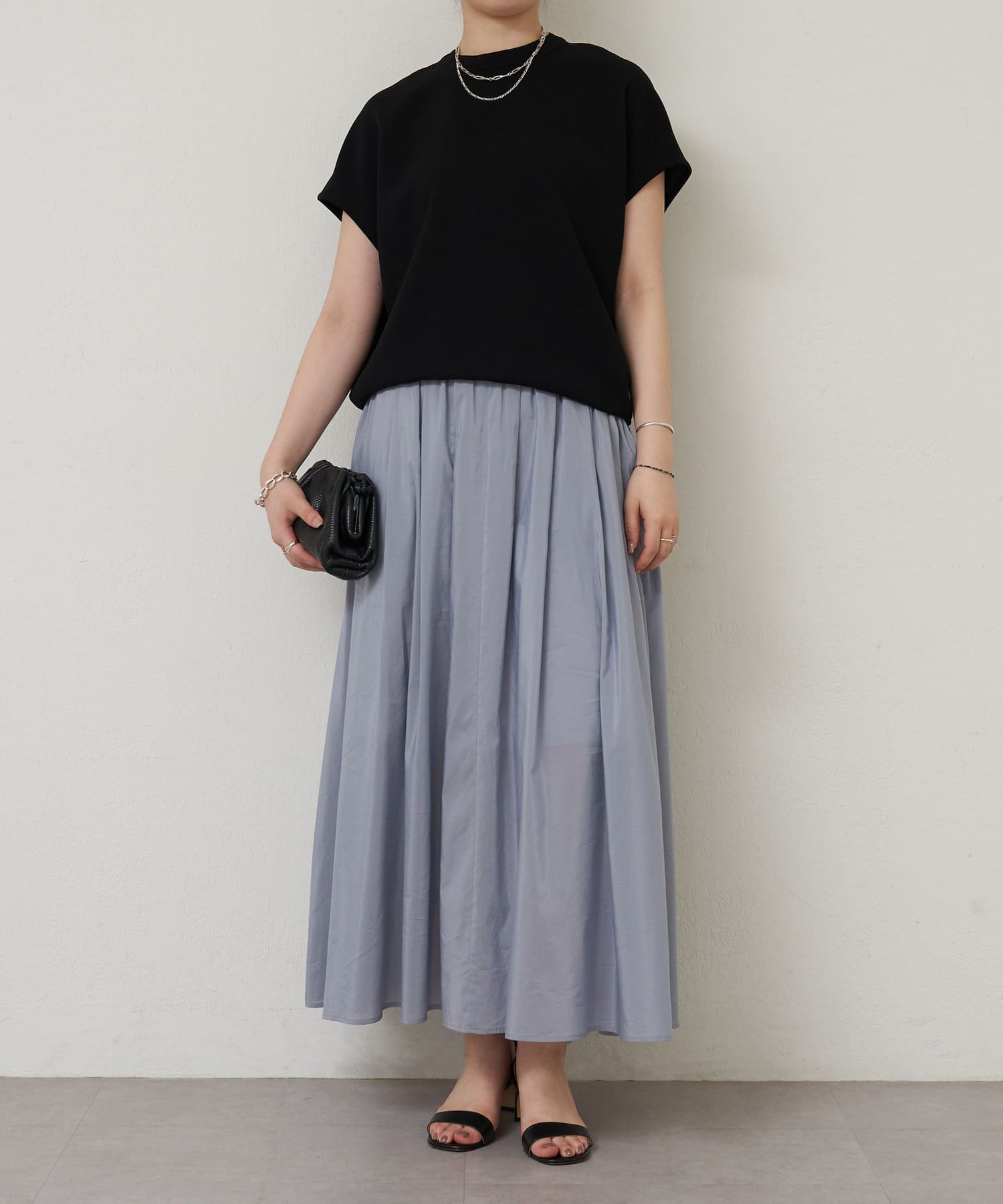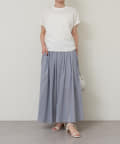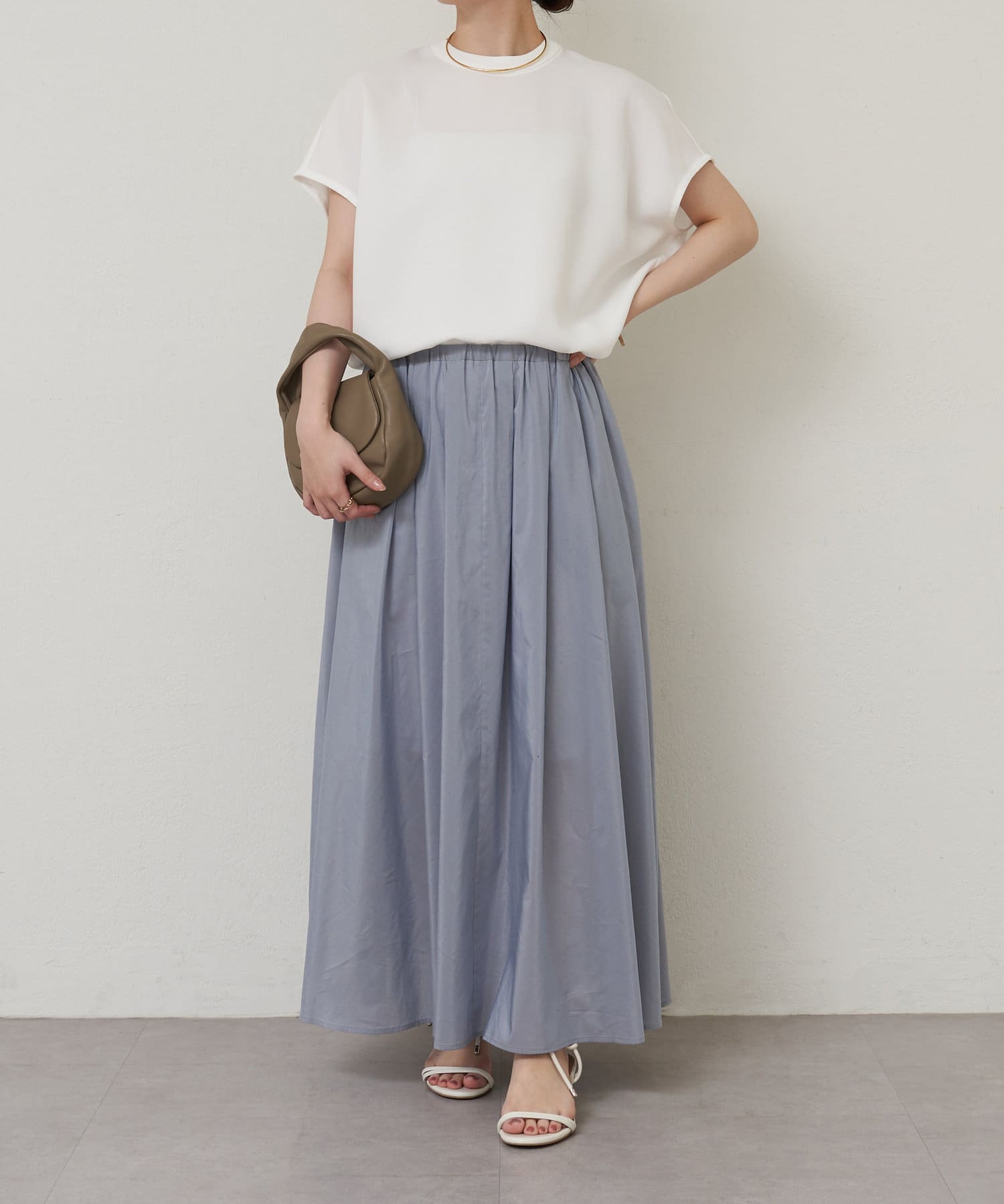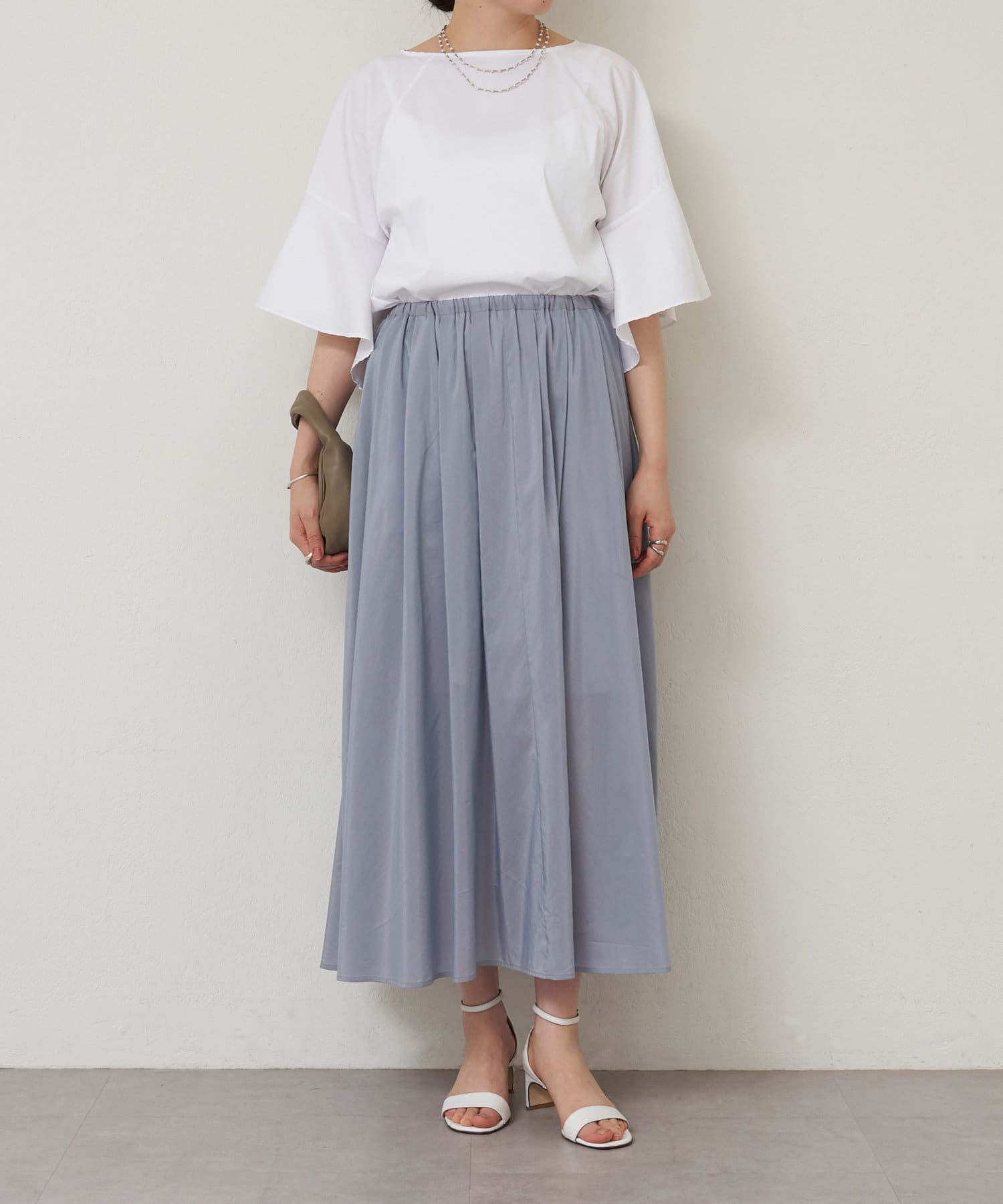シンプルなトップスを合わせるだけでスタイリングが決まるので、ギャザースカートはワードローブにあると便利なアイテム。