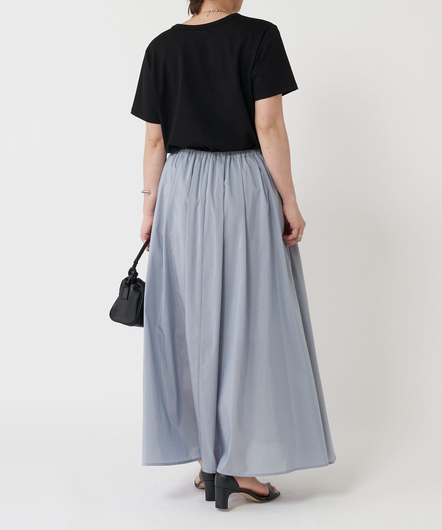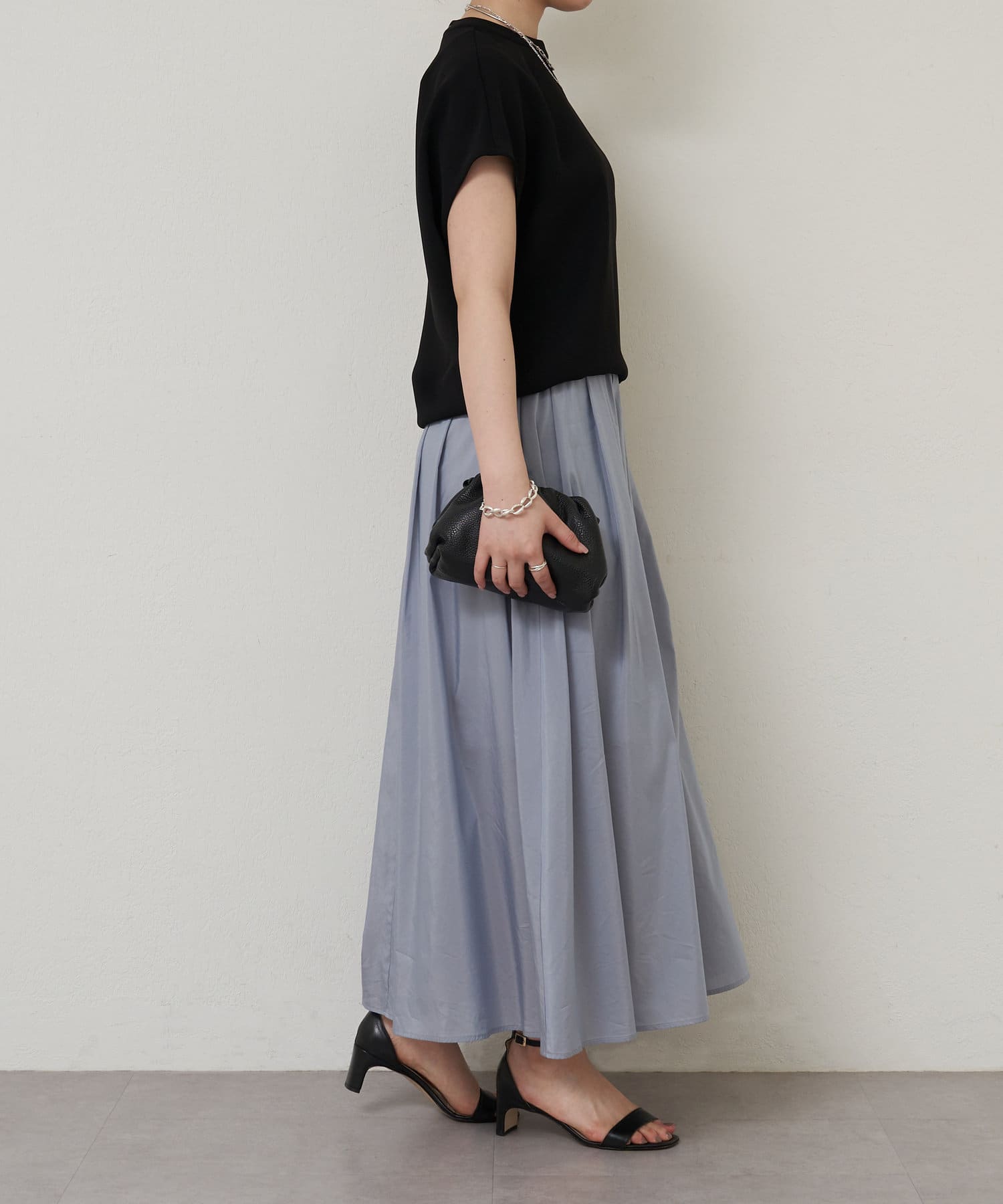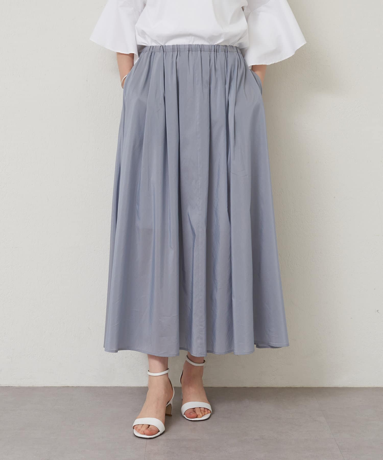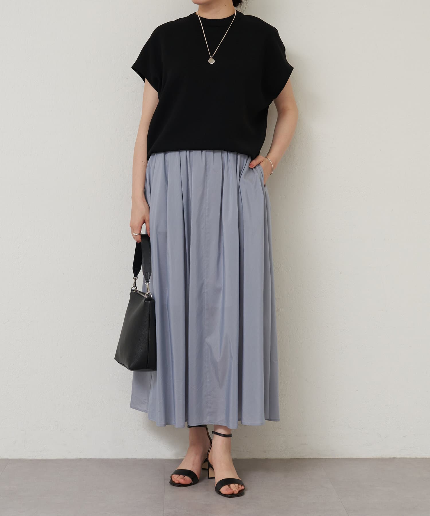 シンプルなトップスを合わせるだけでスタイリングが決まるので、ギャザースカートはワードローブにあると便利なアイテム。