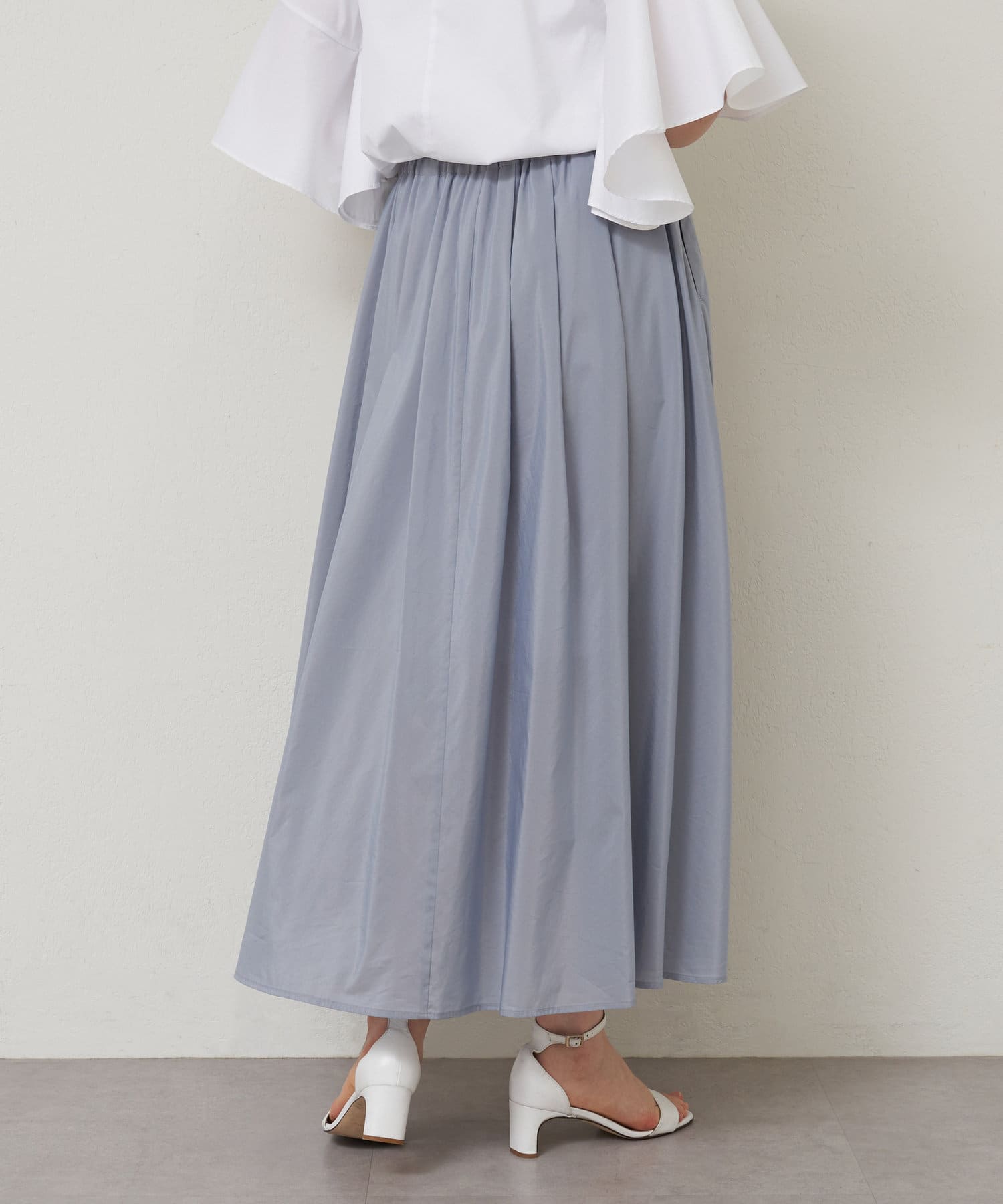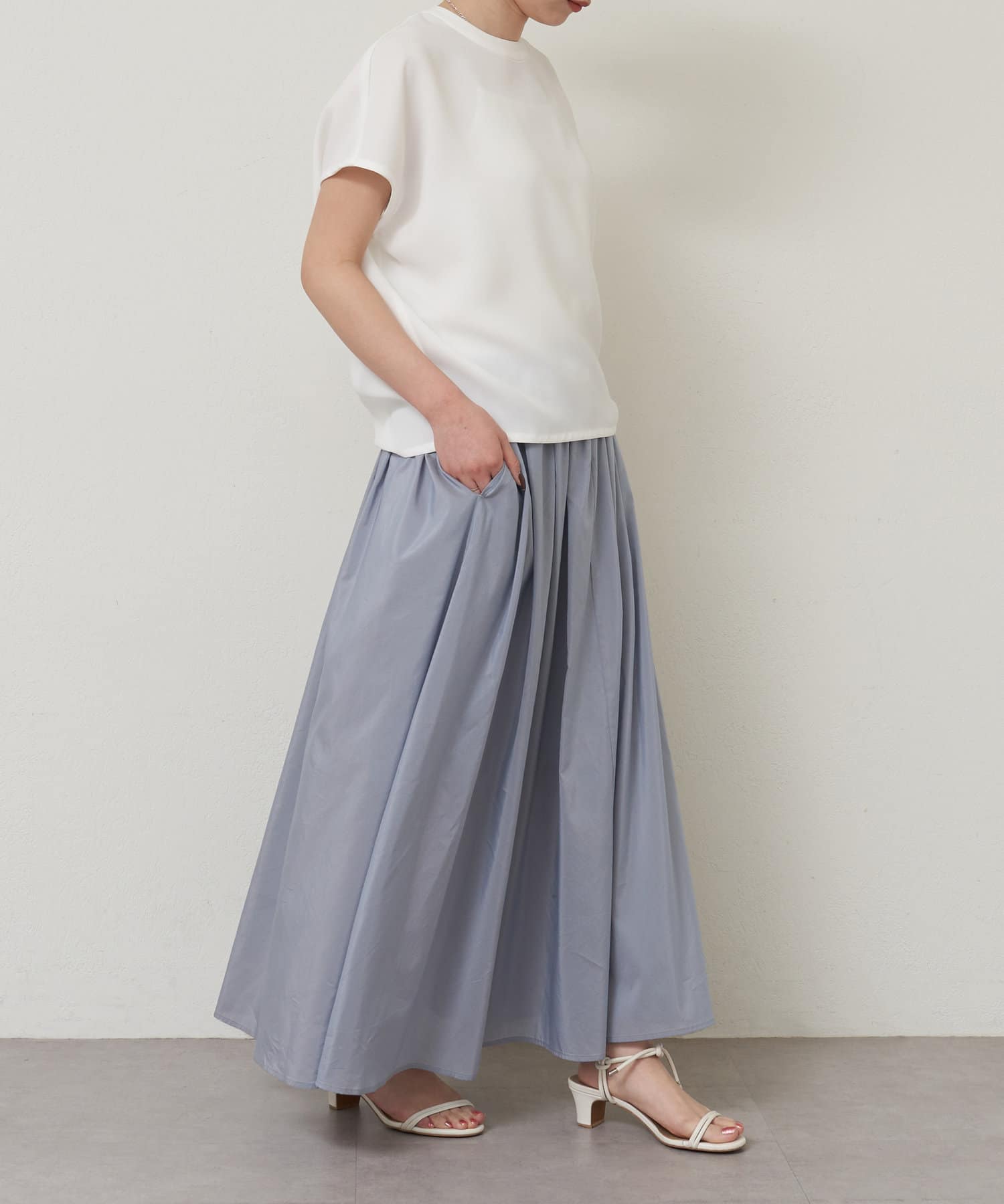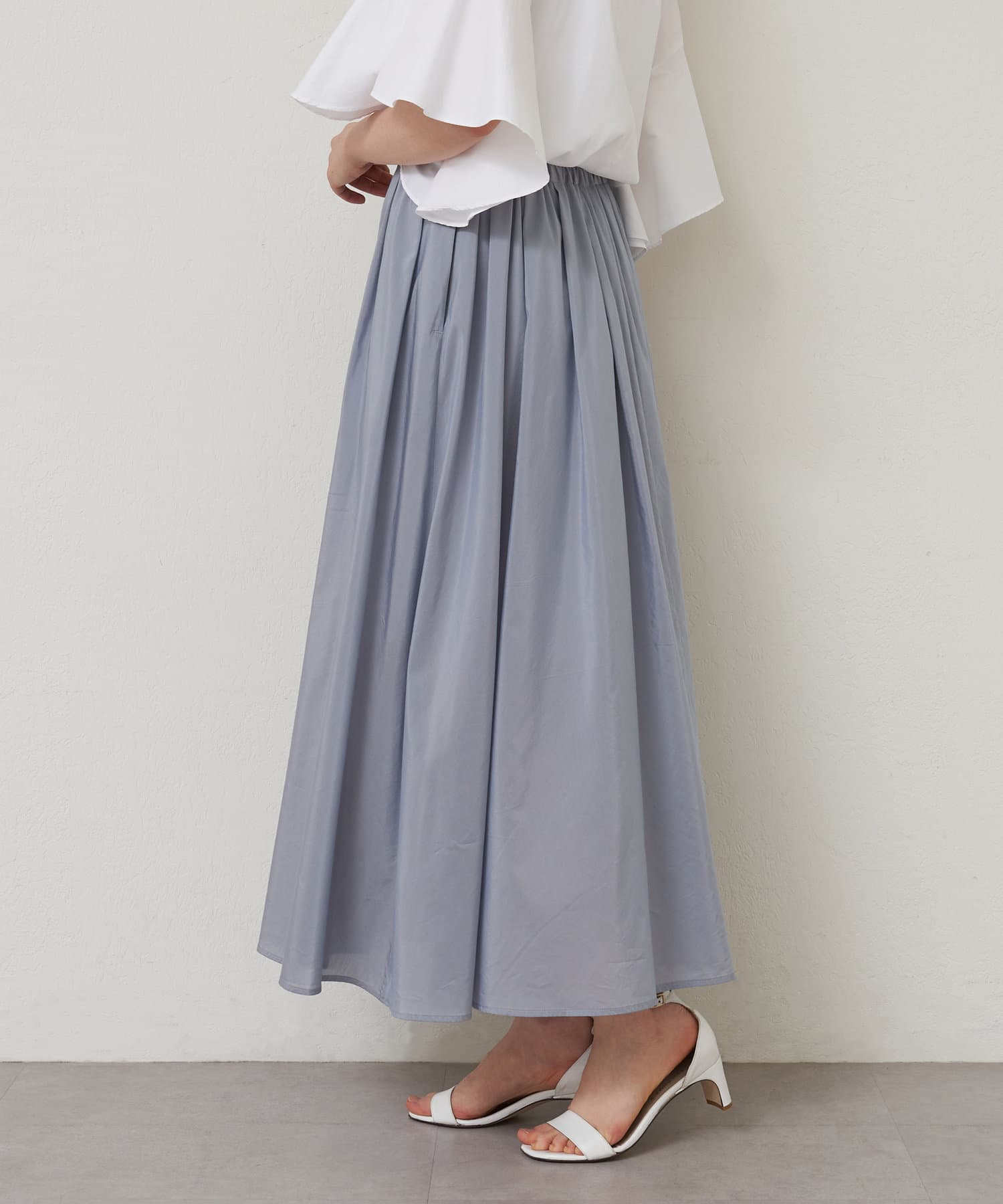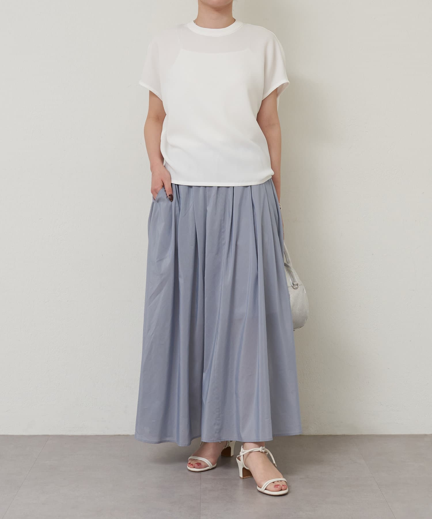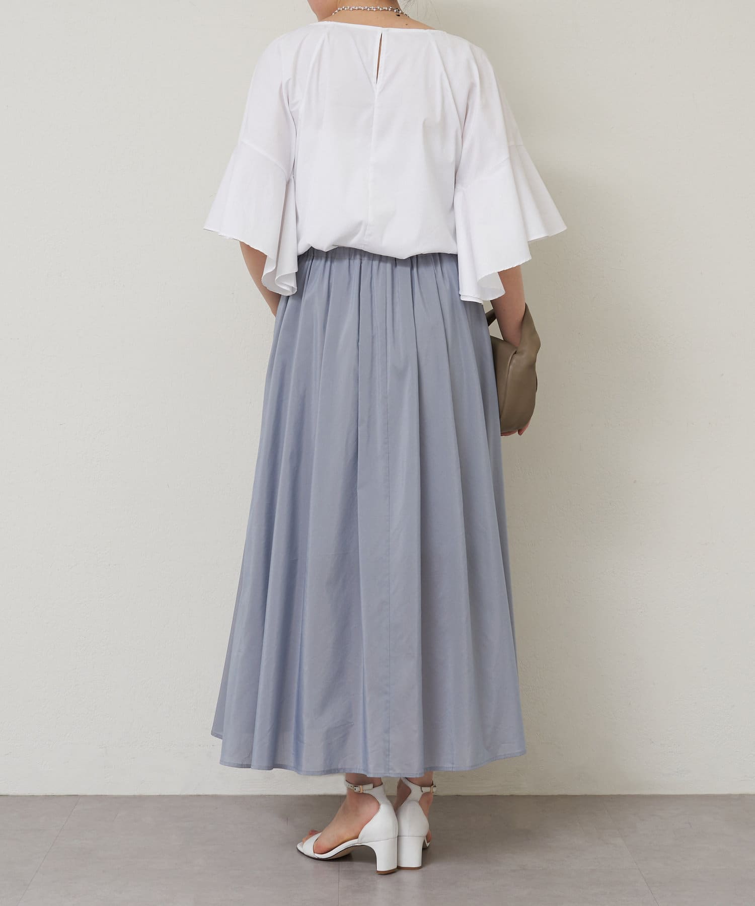 シンプルなトップスを合わせるだけでスタイリングが決まるので、ギャザースカートはワードローブにあると便利なアイテム。