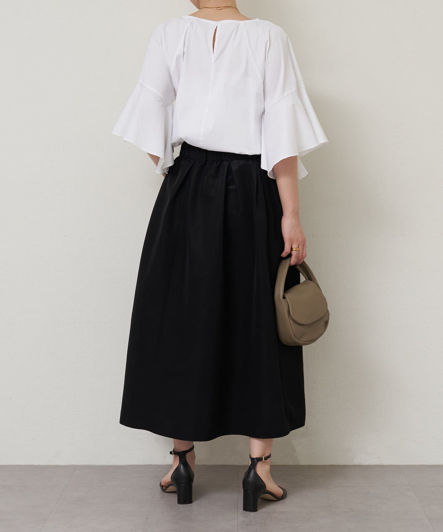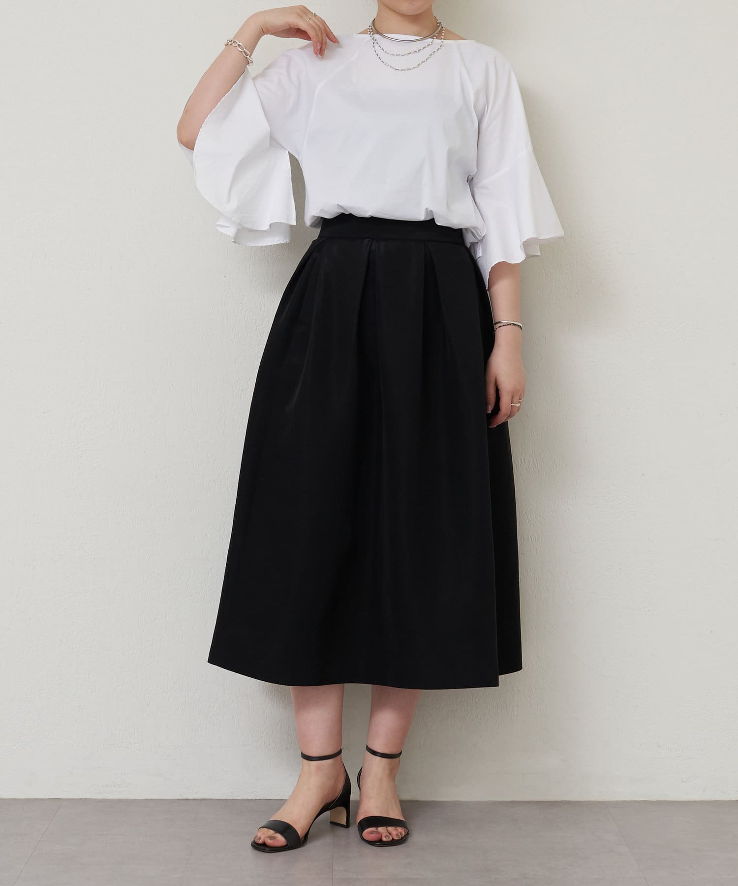 ウエスト部分には甘さを抑えたランダムなタックをふんだんに施すことで程よいボリューム感が楽しめます。